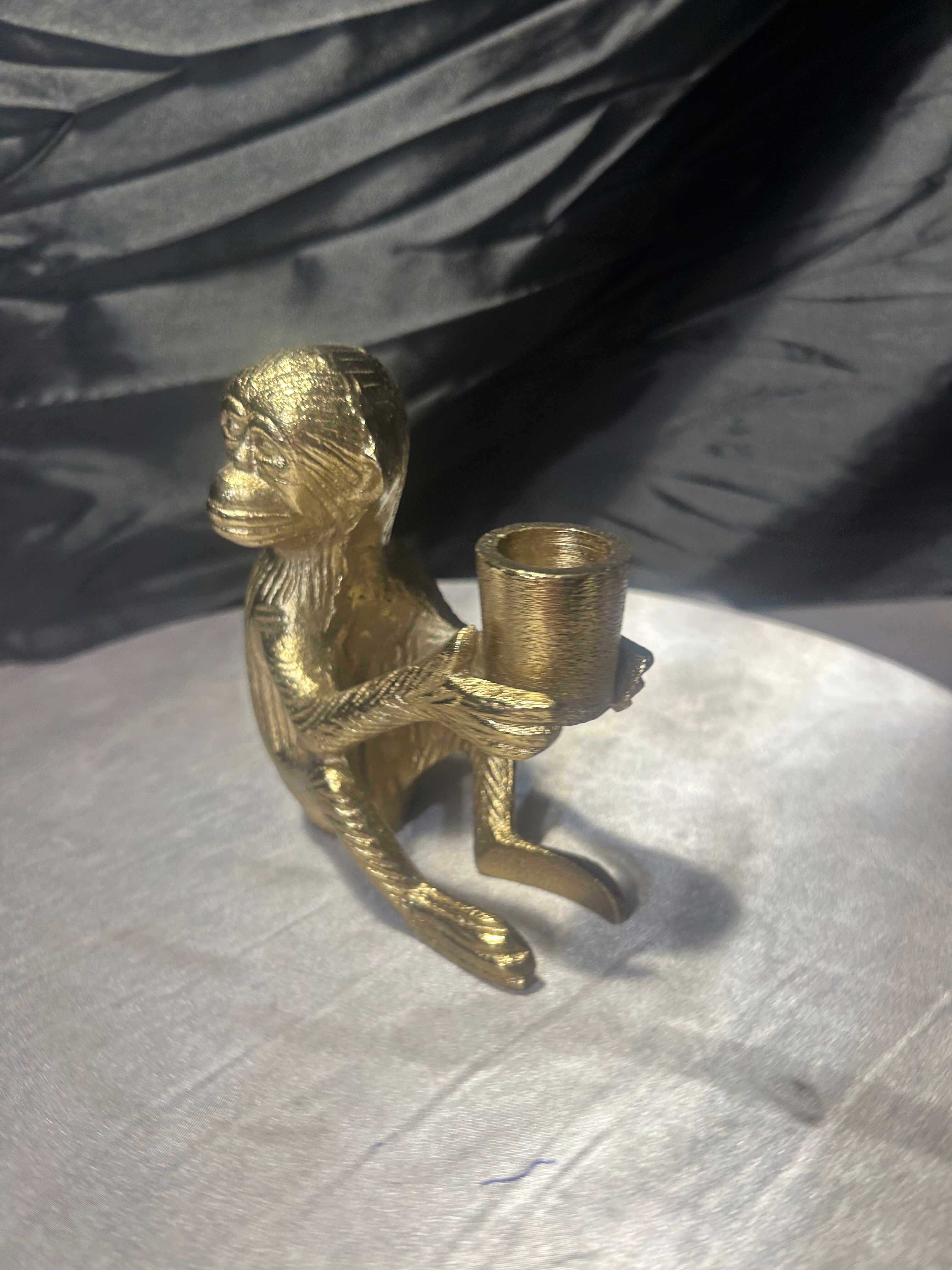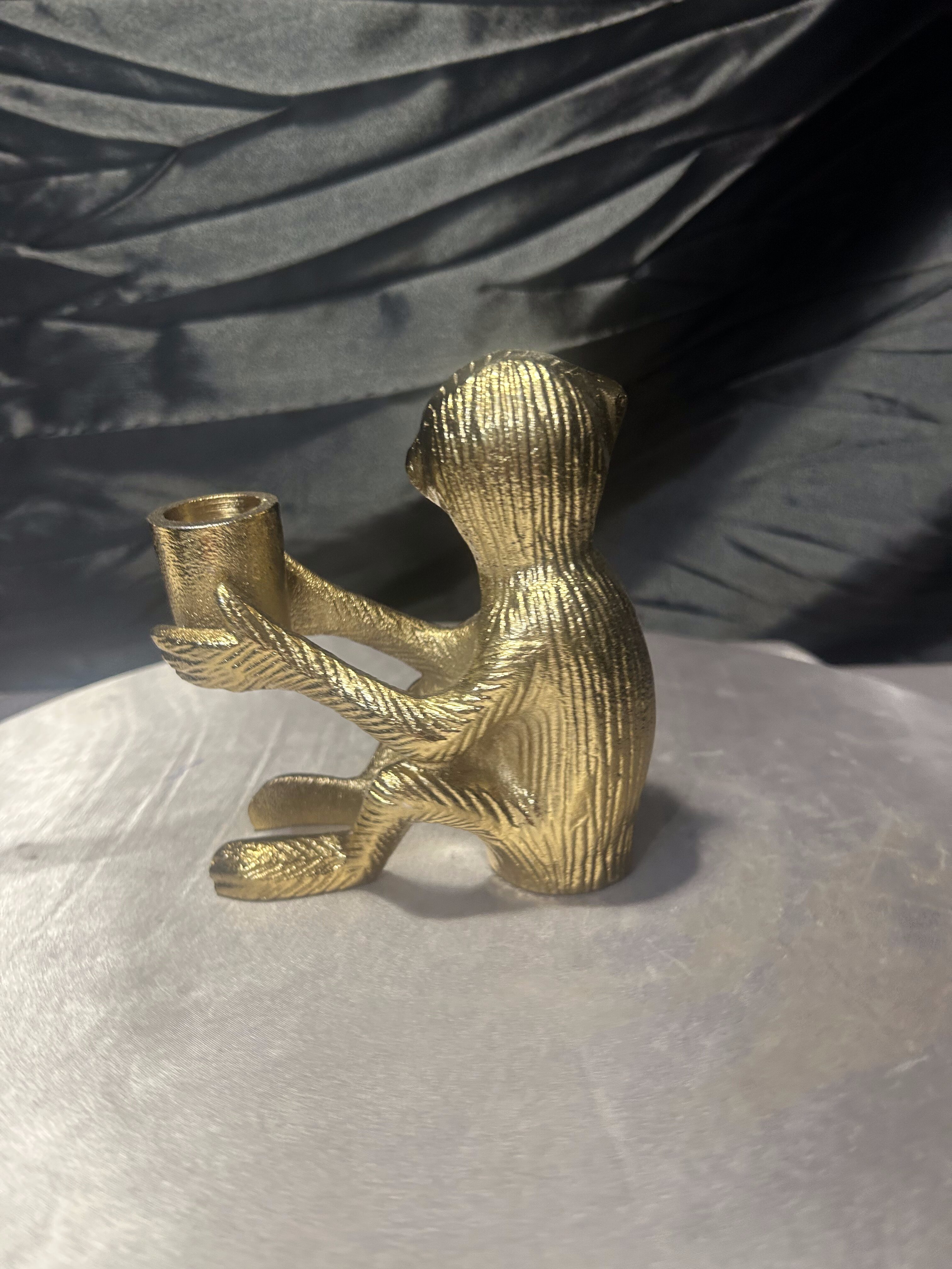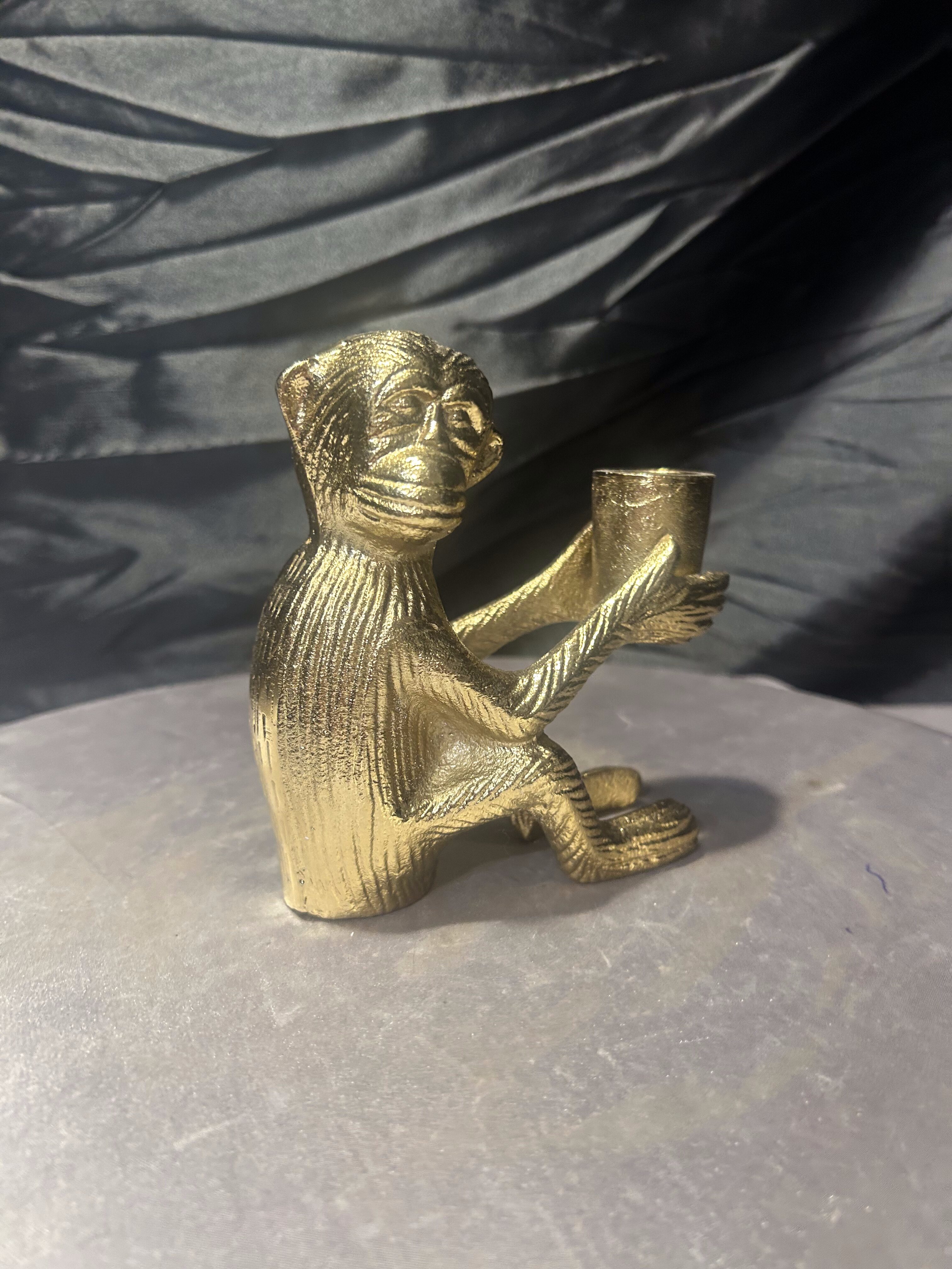 Nietuzinkowy świecznik w formie siedzącej małpki, wykonany z metalu w eleganckim, złotym kolorze. Figurka została zaprojektowana w realistyczny sposób – widoczne są starannie odwzorowane rysy twarzy, struktura futra oraz naturalna poza zwierzęcia. Małpka trzyma w dłoniach niewielkie gniazdo na świecę, co nadaje całości charakteru zarówno dekoracyjnego, jak i funkcjonalnego.