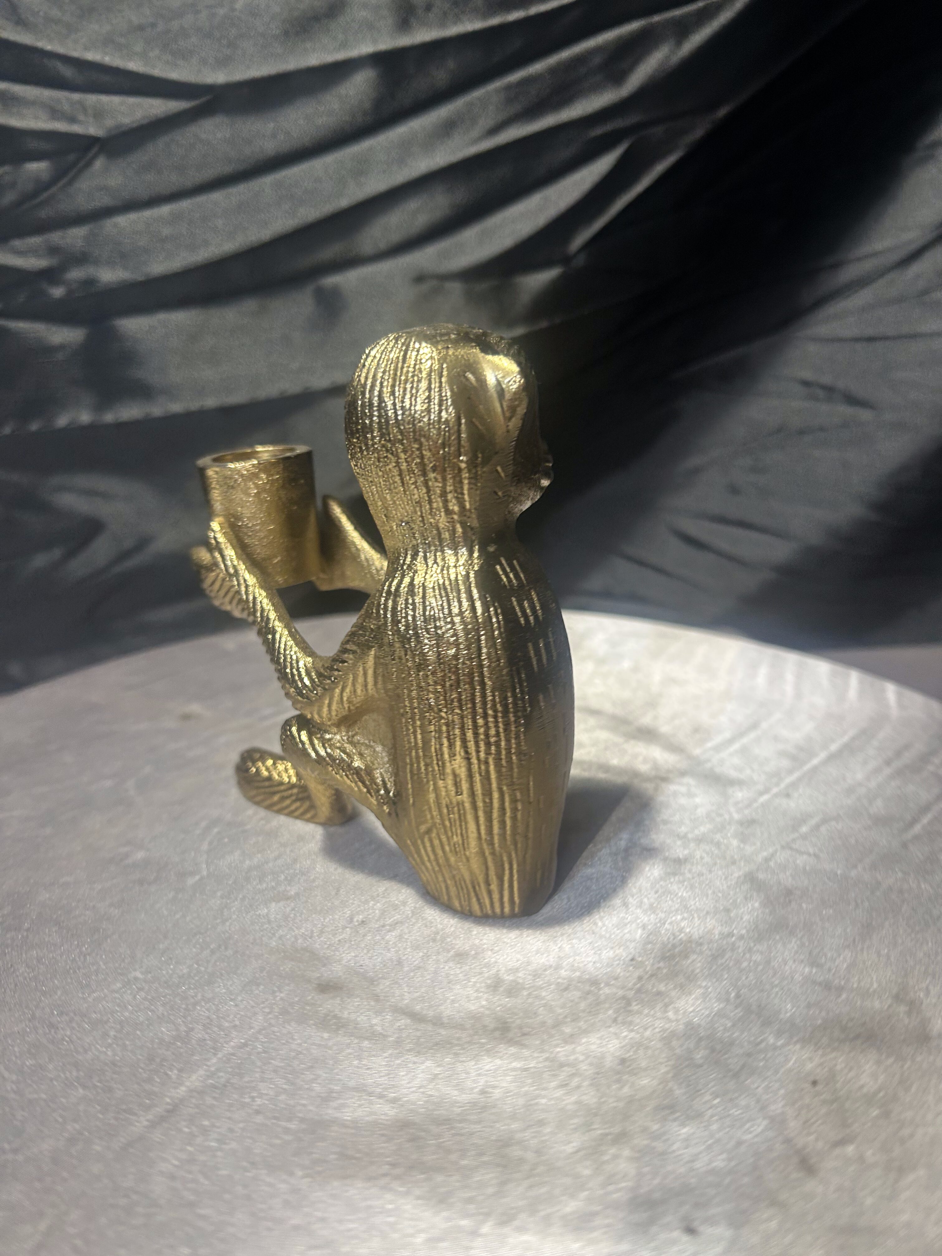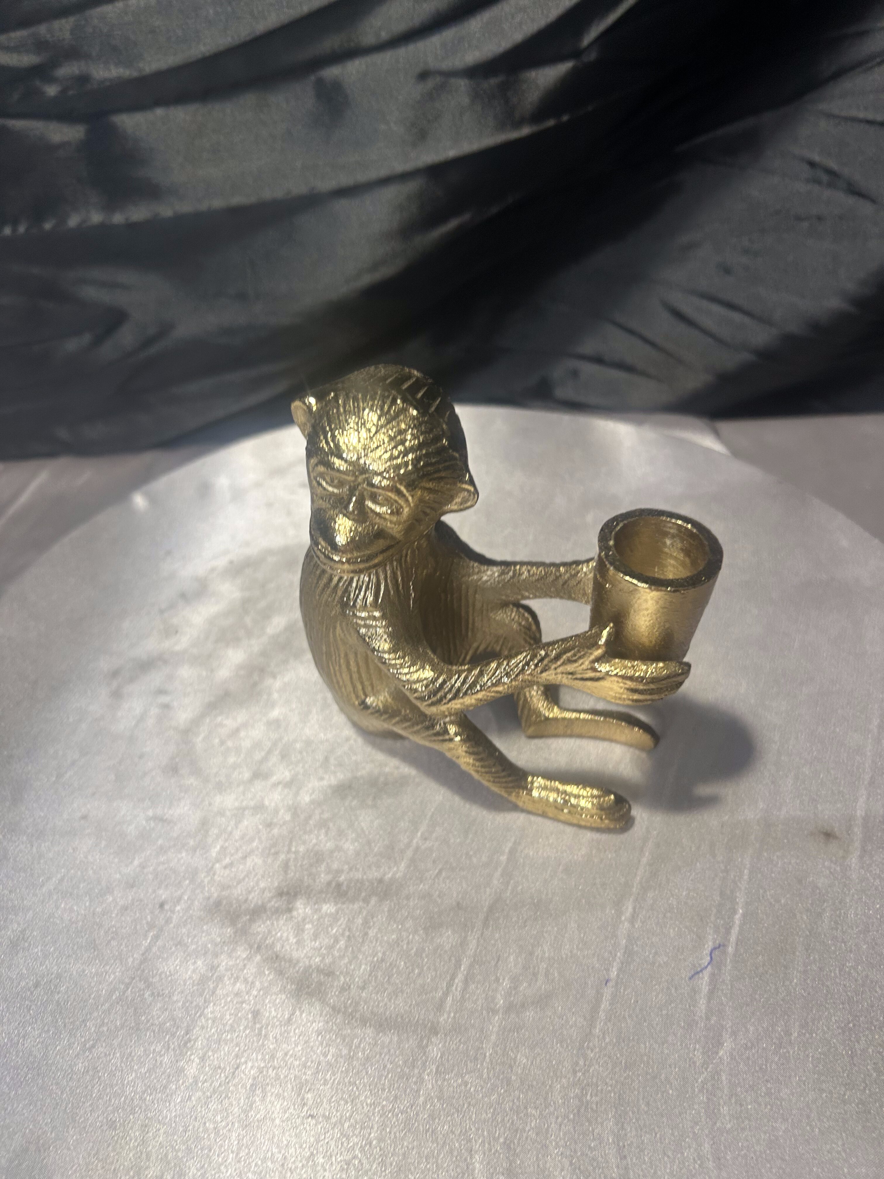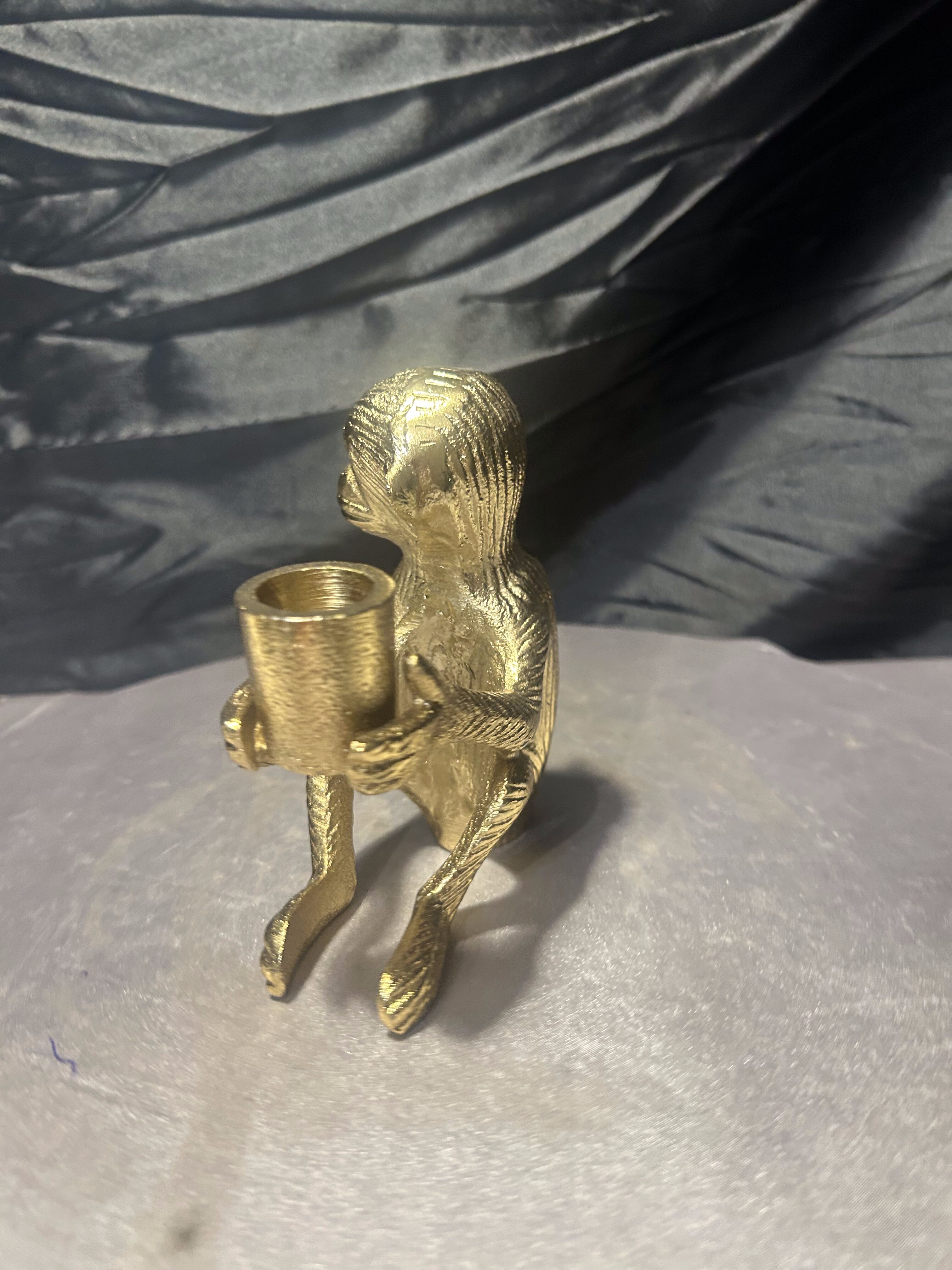 Nietuzinkowy świecznik w formie siedzącej małpki, wykonany z metalu w eleganckim, złotym kolorze. Figurka została zaprojektowana w realistyczny sposób – widoczne są starannie odwzorowane rysy twarzy, struktura futra oraz naturalna poza zwierzęcia. Małpka trzyma w dłoniach niewielkie gniazdo na świecę, co nadaje całości charakteru zarówno dekoracyjnego, jak i funkcjonalnego.