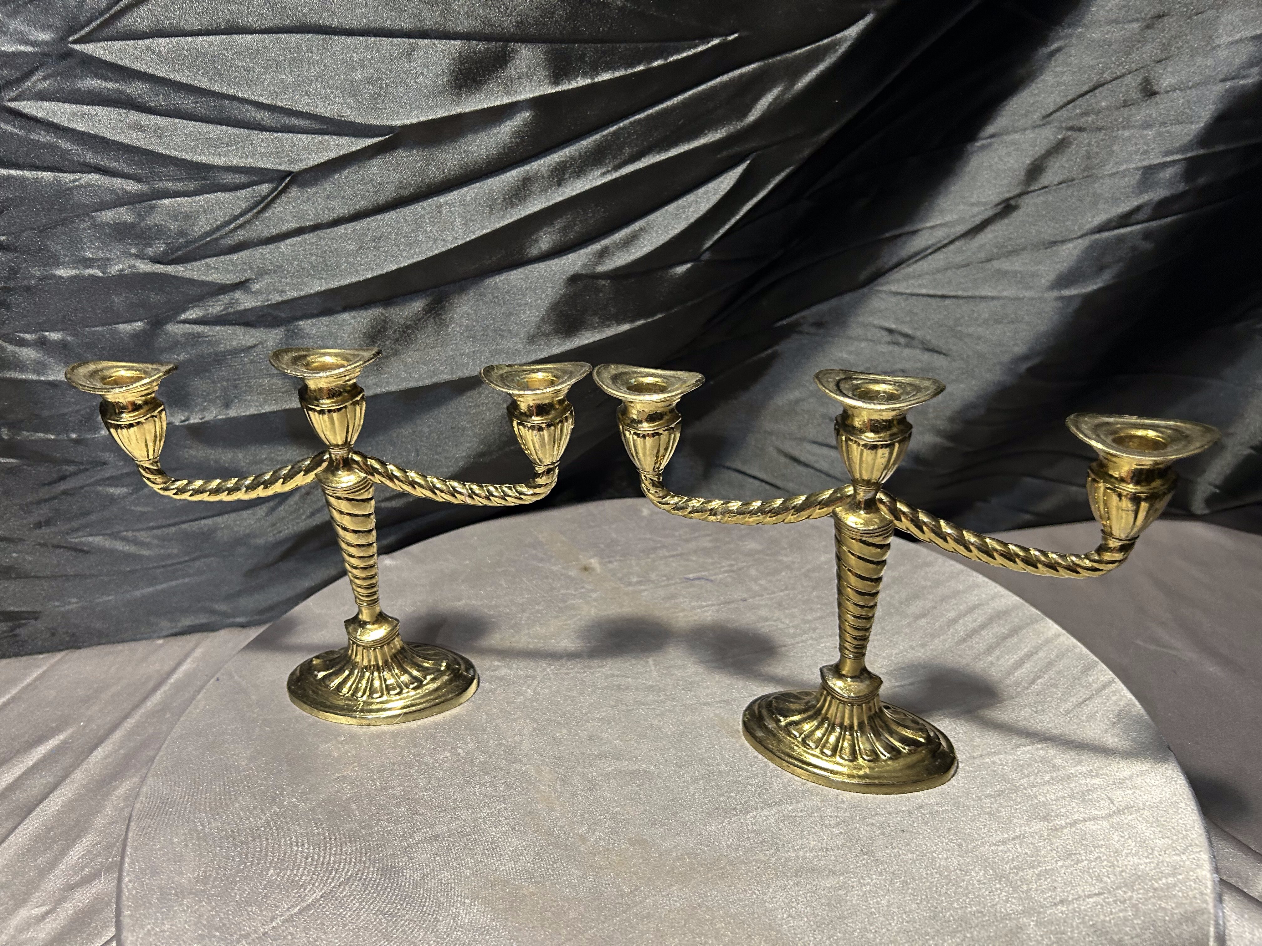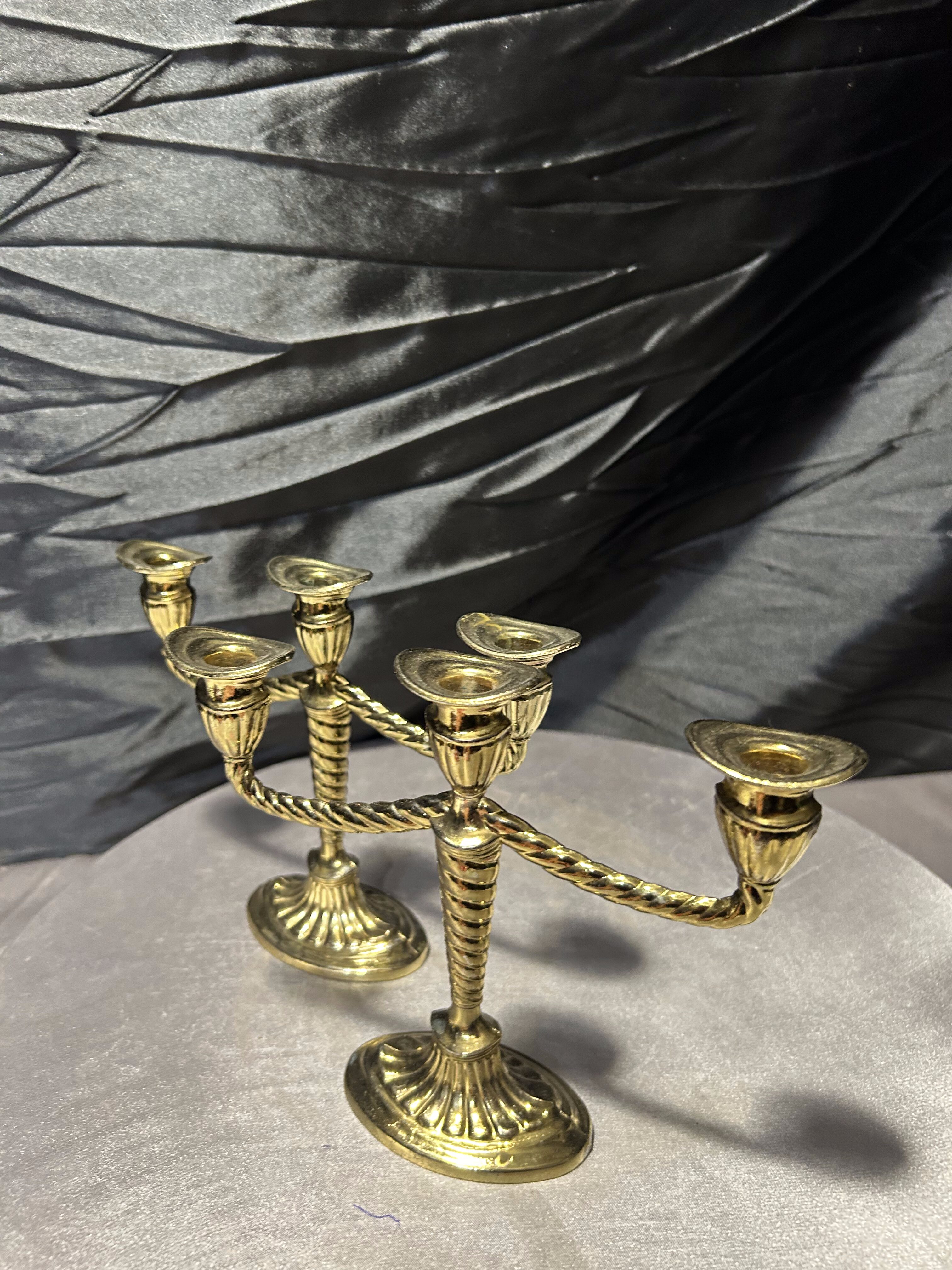 Elegancki komplet dwóch świeczników wykonanych z mosiądzu. Każdy z nich posiada trzy ramiona przeznaczone na świece, tworząc klasyczną formę niewielkiego kandelabru.
