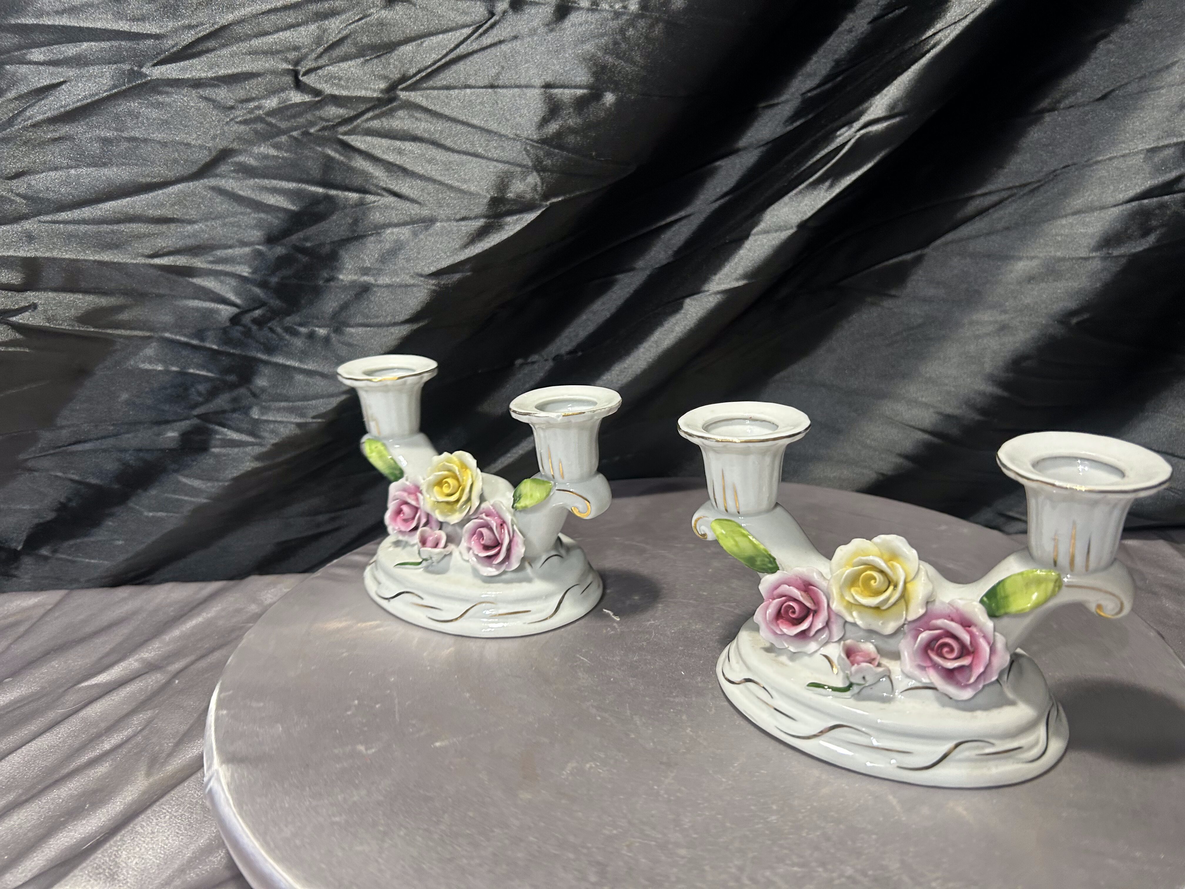 Świeczniki zdobione są ręcznie modelowanymi kwiatami — różami w pastelowych odcieniach różu i żółci — oraz złotymi akcentami charakterystycznymi dla porcelany dekoracyjnej tamtych lat. Delikatna forma, lekko rokokowa linia i staranne dopracowanie detali sprawiają, że zestaw prezentuje się niezwykle wdzięcznie i stanowi piękną ozdobę komody, toaletki czy salonowego stolika.