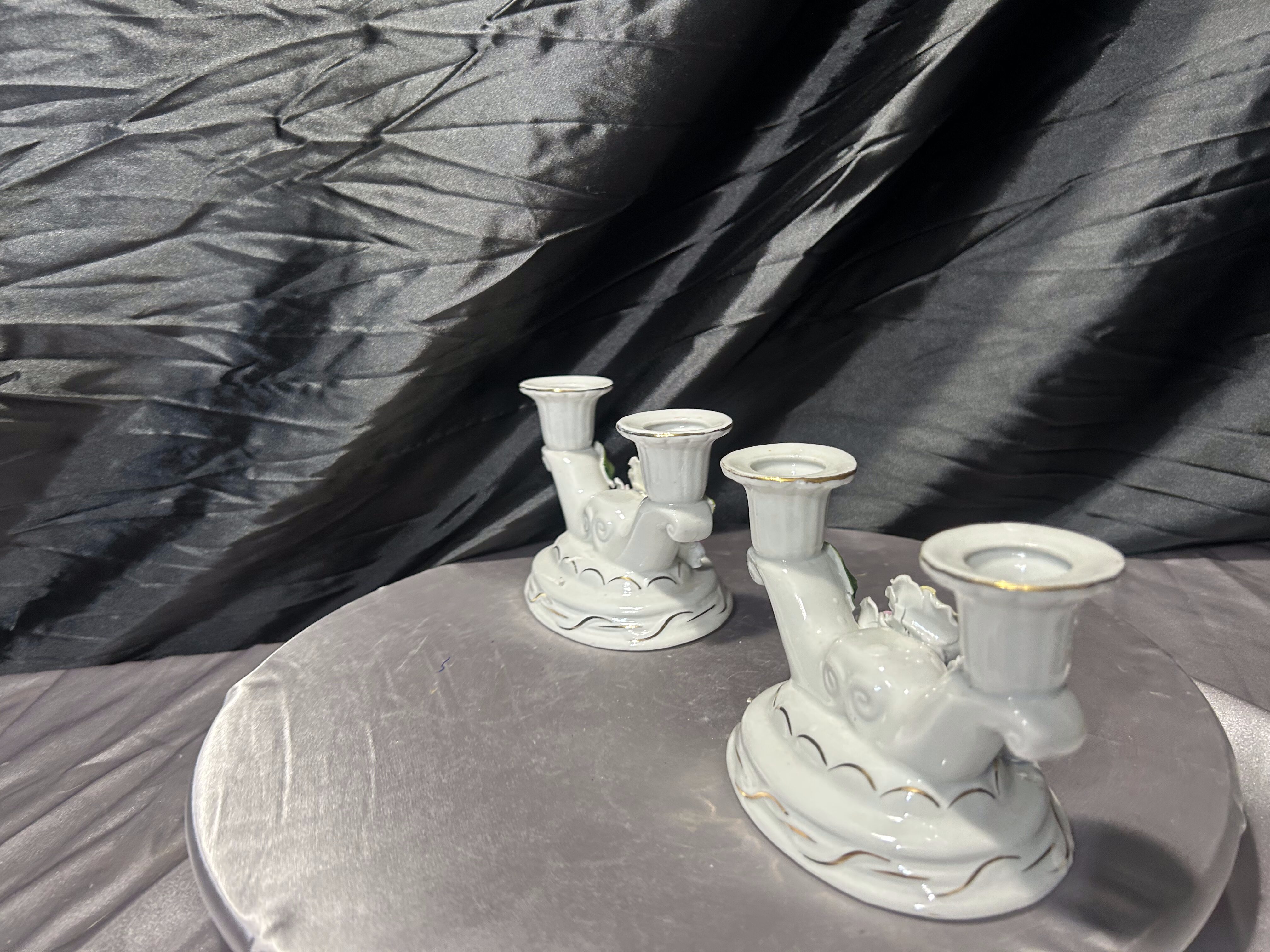 Przedstawiam elegancki komplet dwóch porcelanowych świeczników na dwie świece każdy, wykonanych w Niemczech i sygnowanych znakiem OK & Co Germany z koroną. Sygnatura ta była stosowana przez mniejsze, powojenne niemieckie manufaktury porcelany dekoracyjnej działające głównie w latach 1950–1970, produkujące ręcznie zdobione figurki, kwiatowe dekoracje i elementy wystroju w stylu romantycznym.