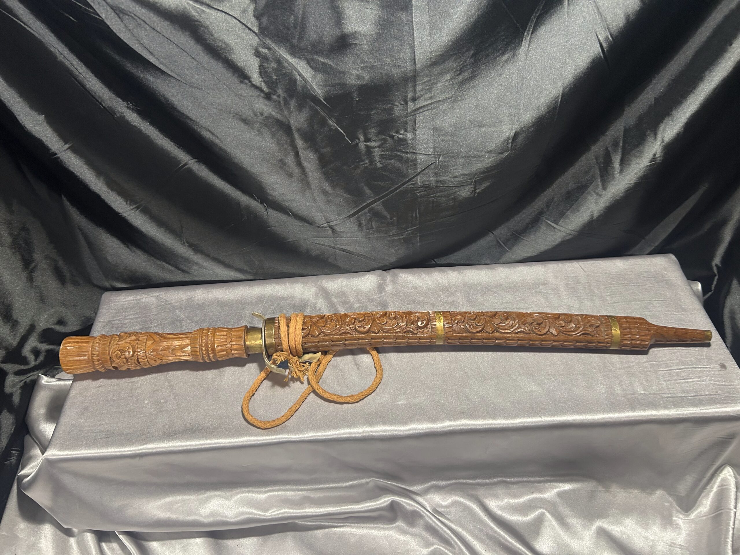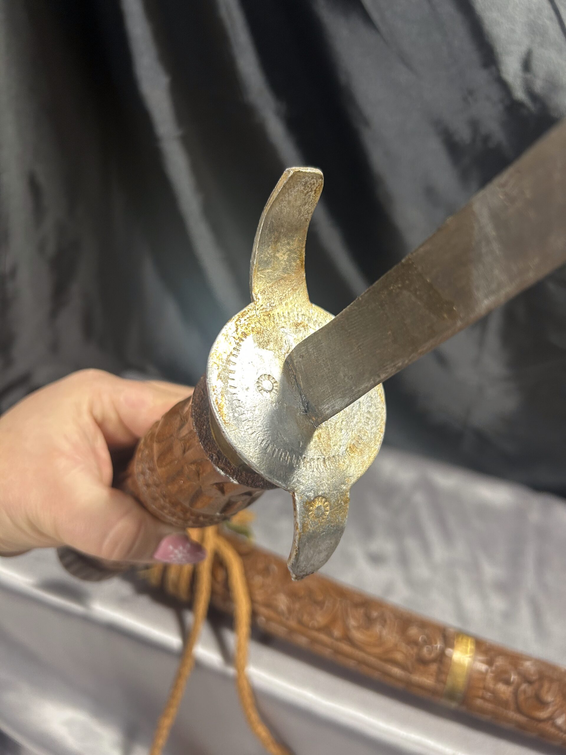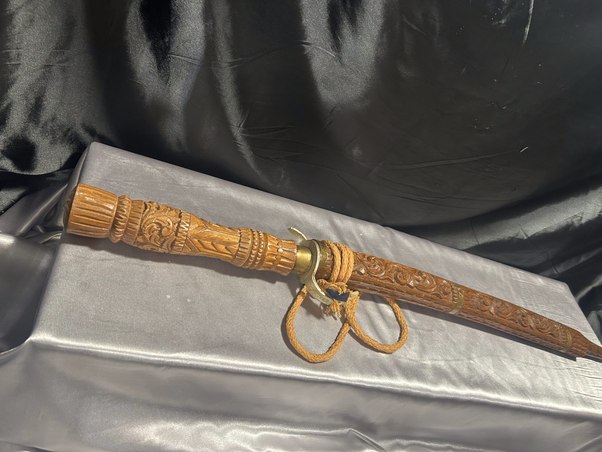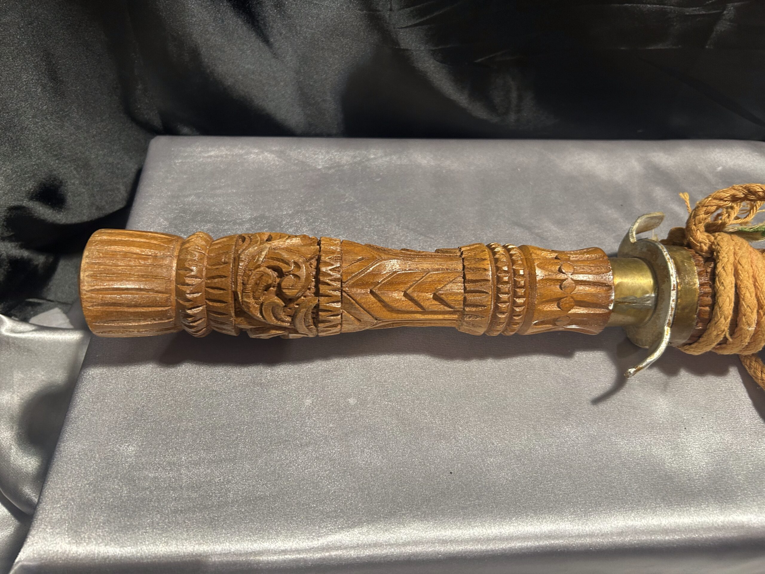 Wyjątkowa szabla o unikatowym kształcie przypominającym długą maczetę, wykonana z jasnego, afrykańskiego drewna. Zarówno rękojeść, jak i pochwa są bogato rzeźbione, co nadaje jej artystycznego i kolekcjonerskiego charakteru. Ostrze posiada charakterystyczne nacięcia, które mogą sugerować symboliczną historię użytkowania.