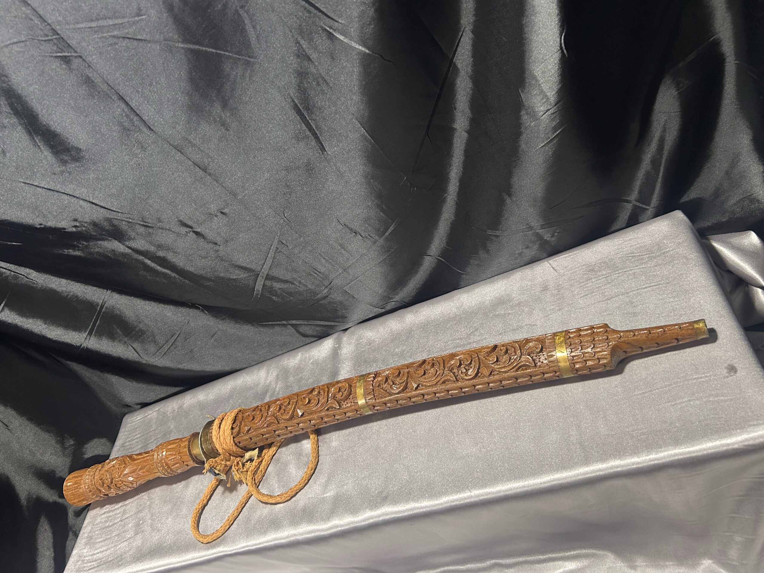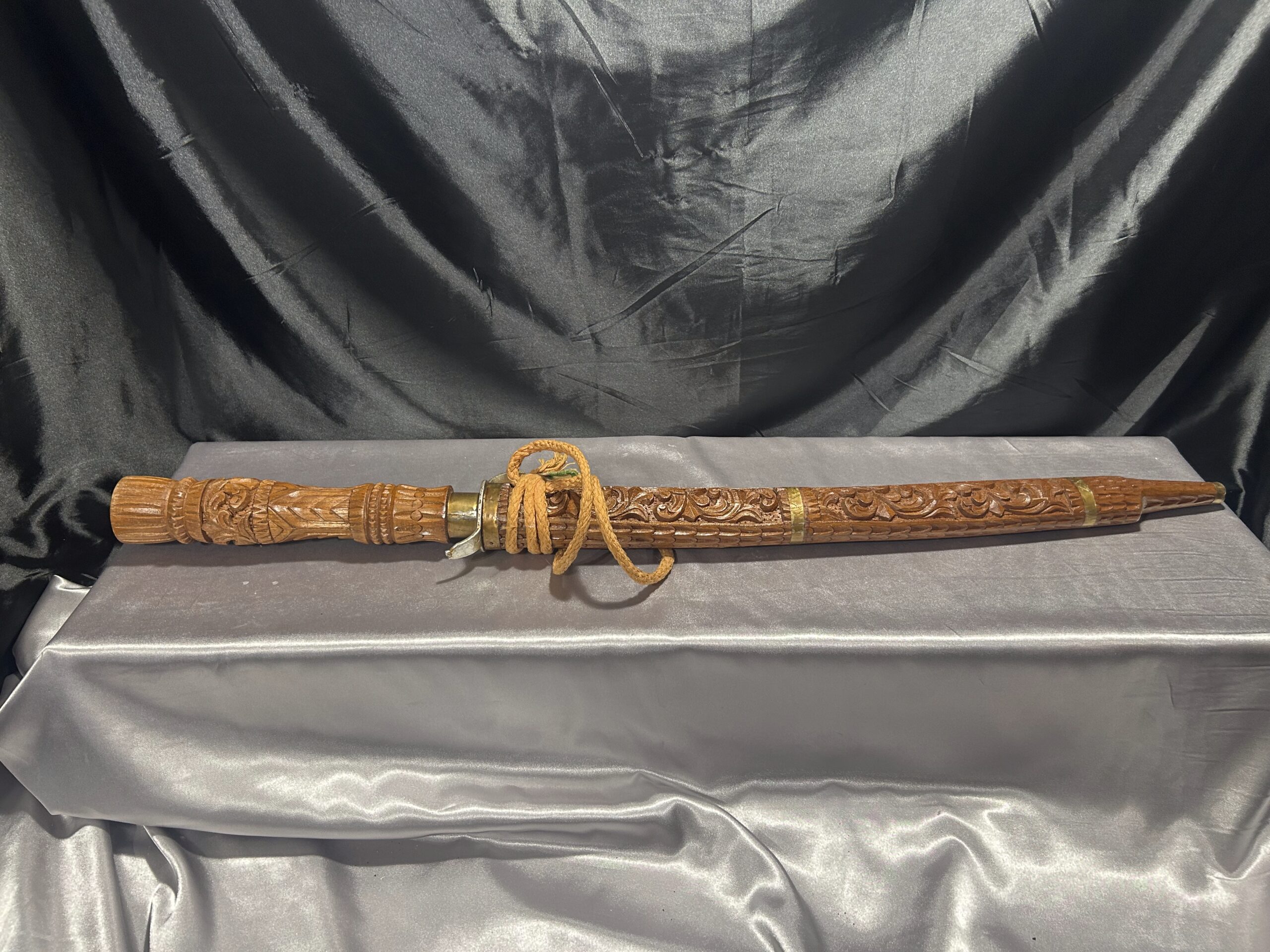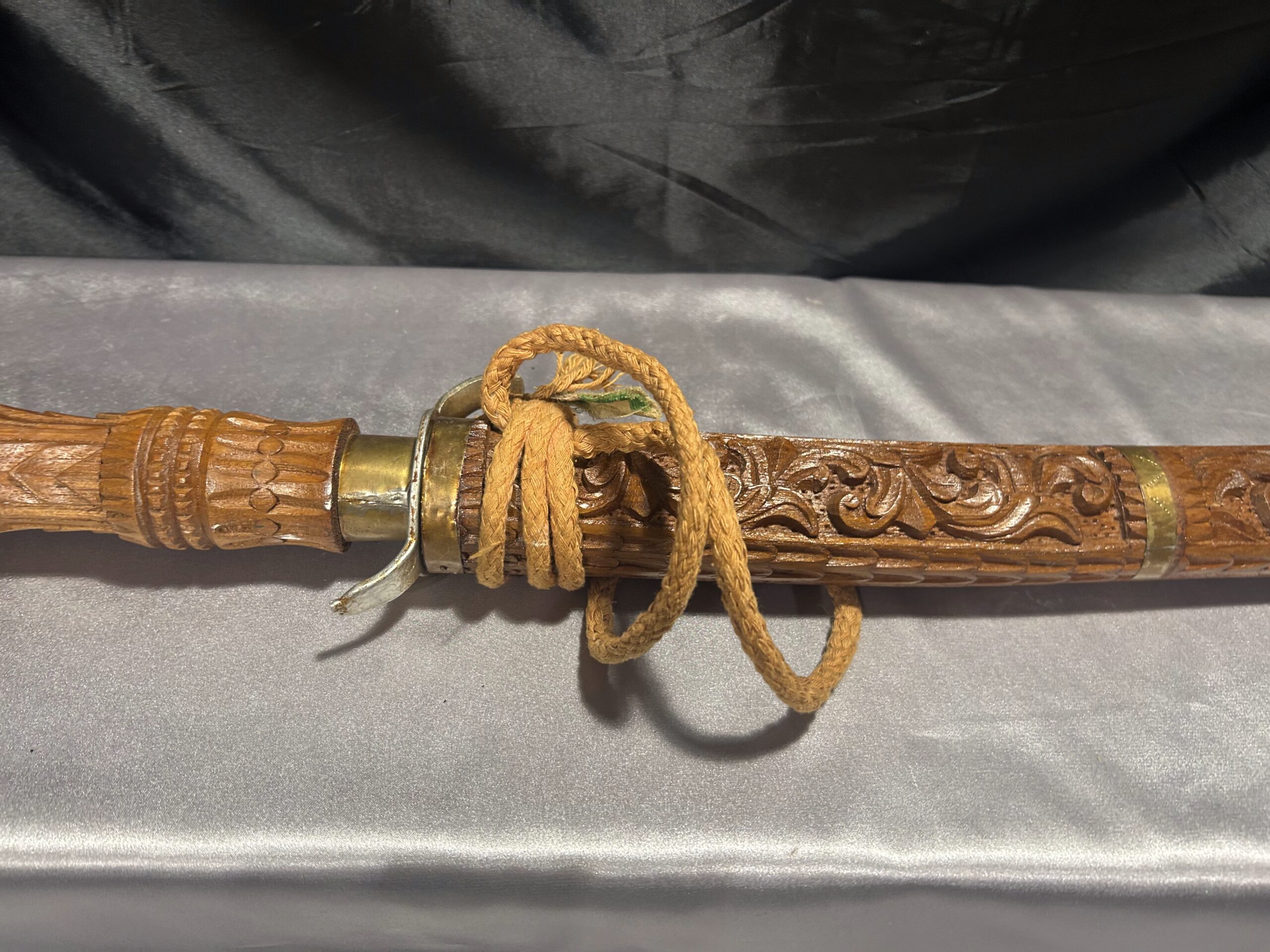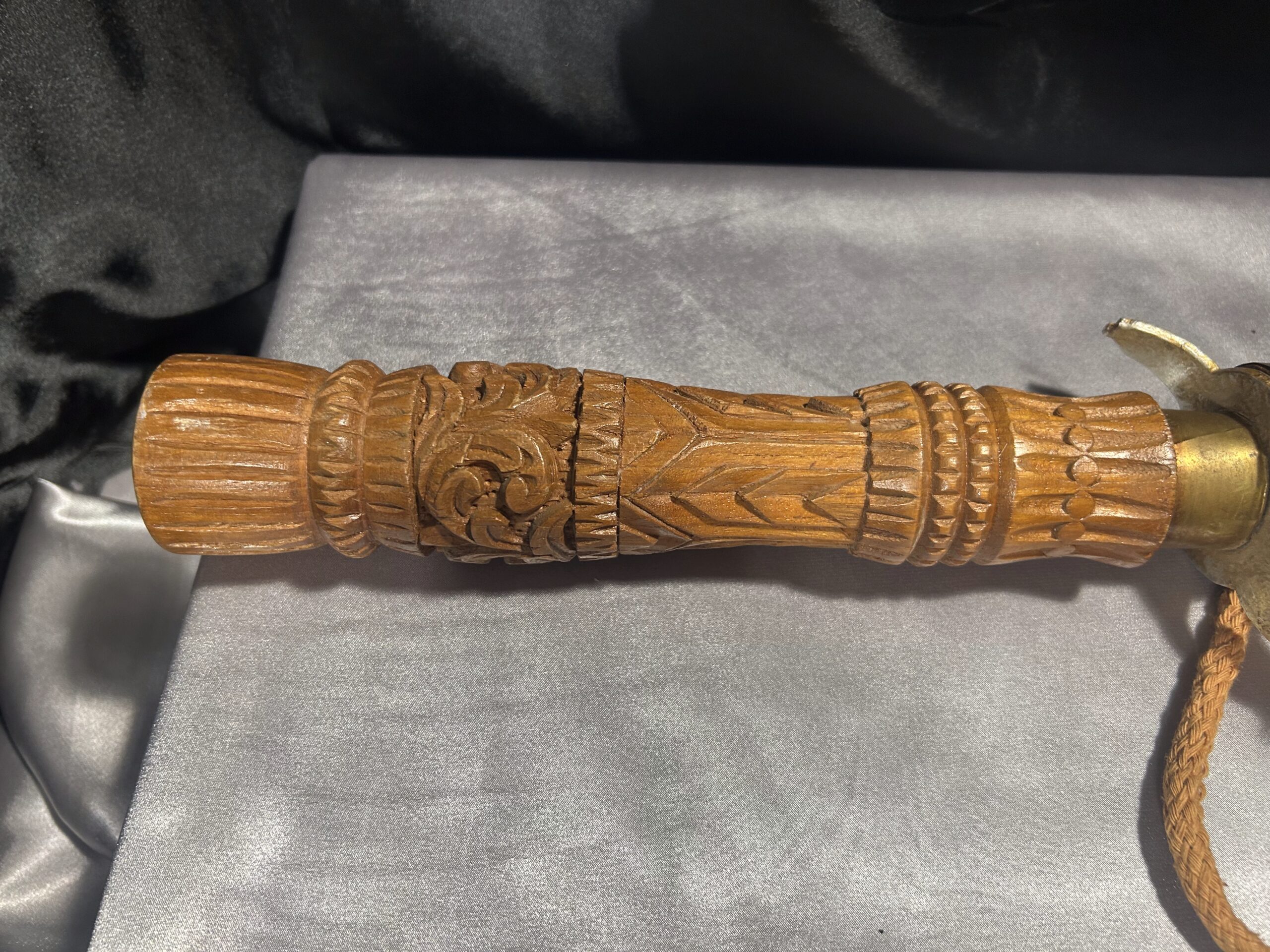 Wyjątkowa szabla o unikatowym kształcie przypominającym długą maczetę, wykonana z jasnego, afrykańskiego drewna. Zarówno rękojeść, jak i pochwa są bogato rzeźbione, co nadaje jej artystycznego i kolekcjonerskiego charakteru. Ostrze posiada charakterystyczne nacięcia, które mogą sugerować symboliczną historię użytkowania.