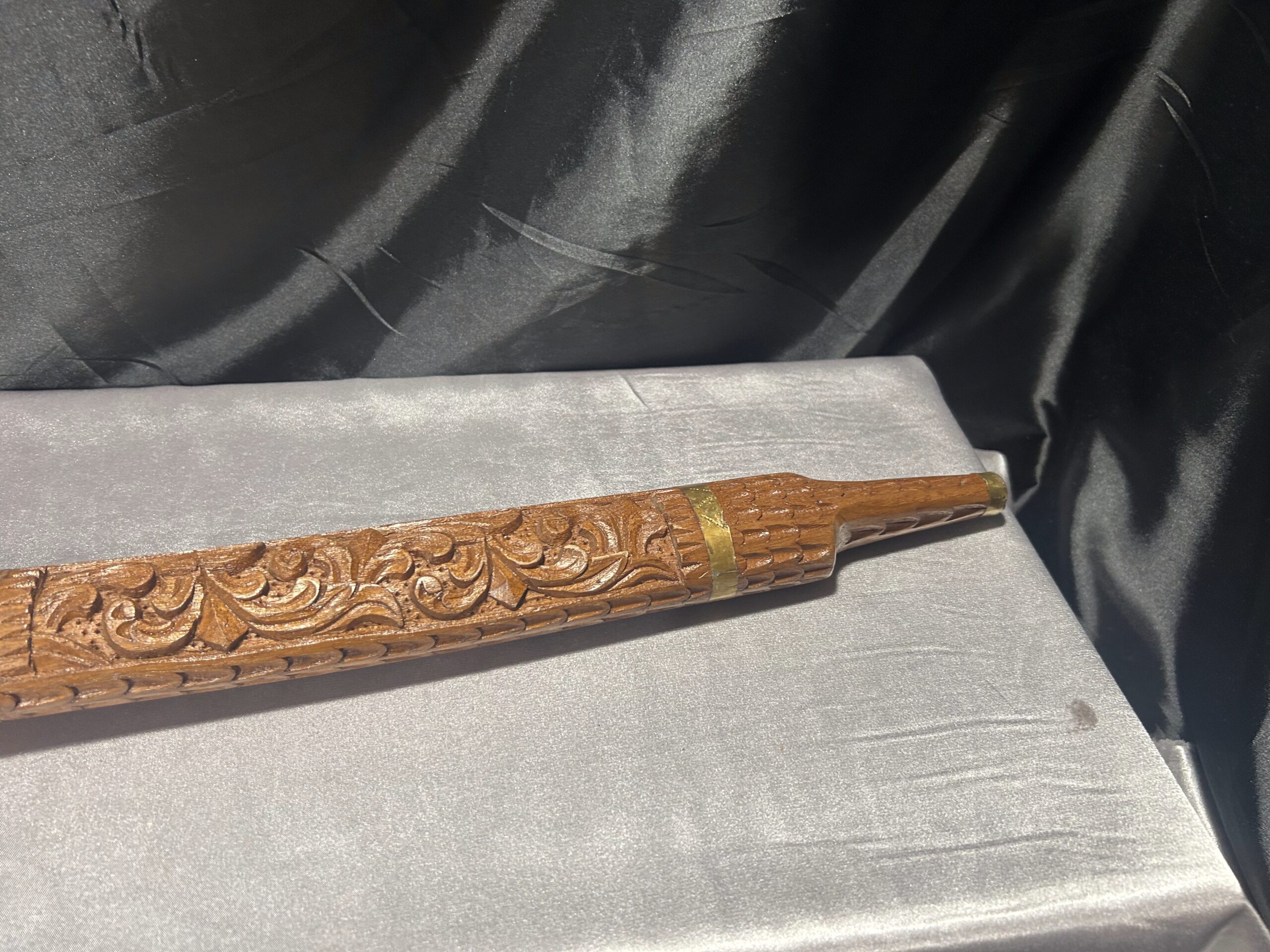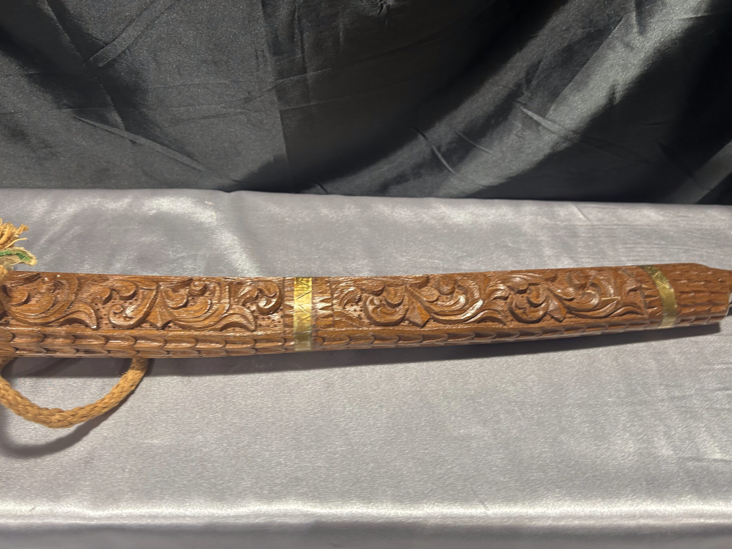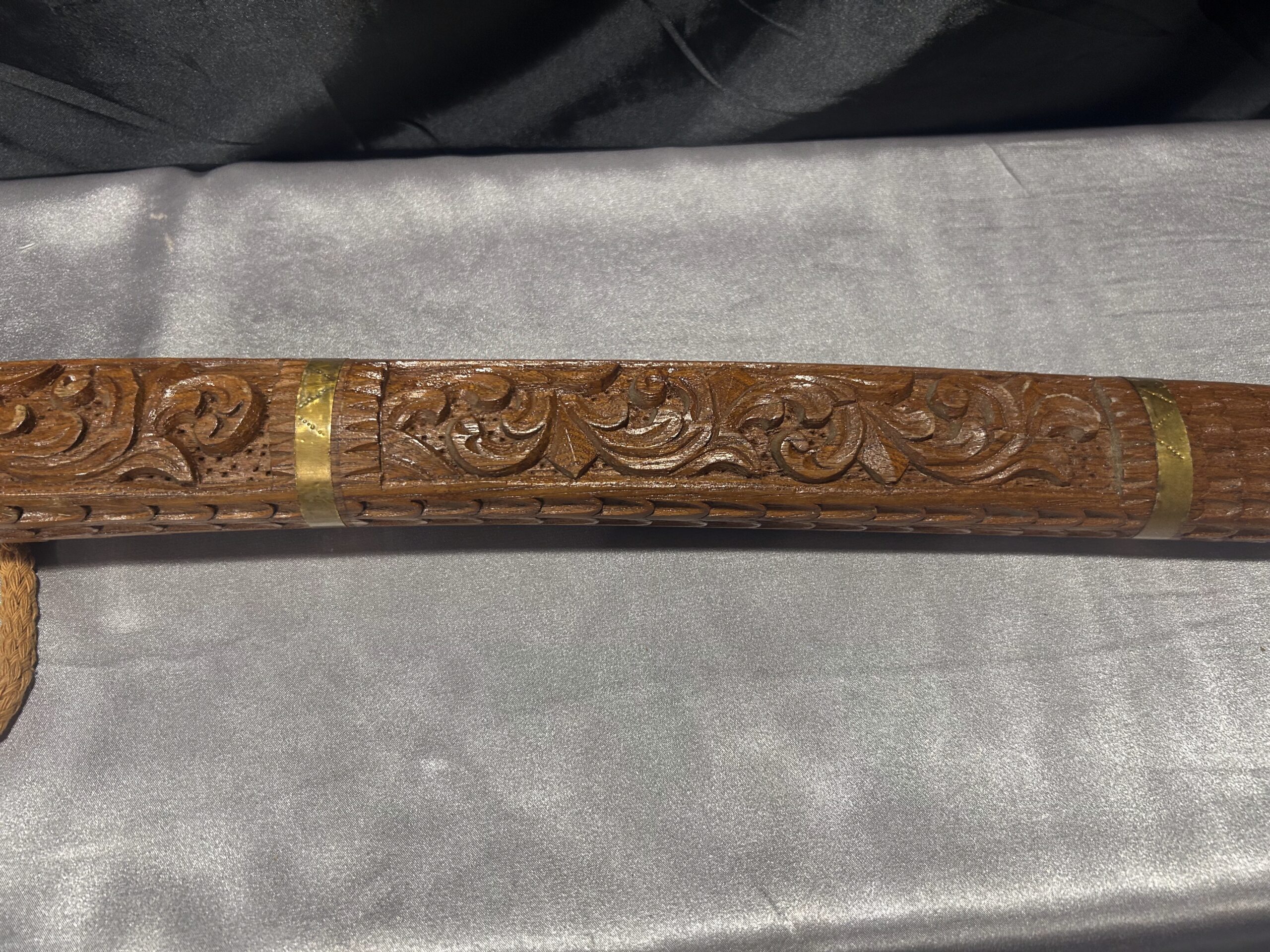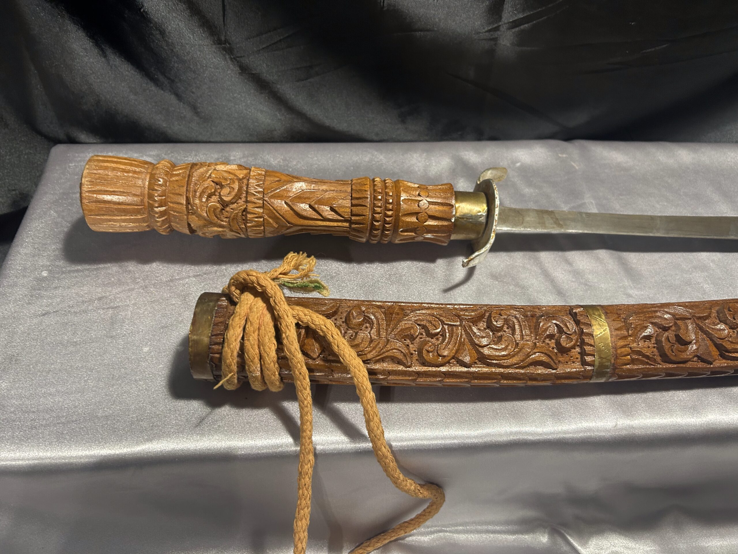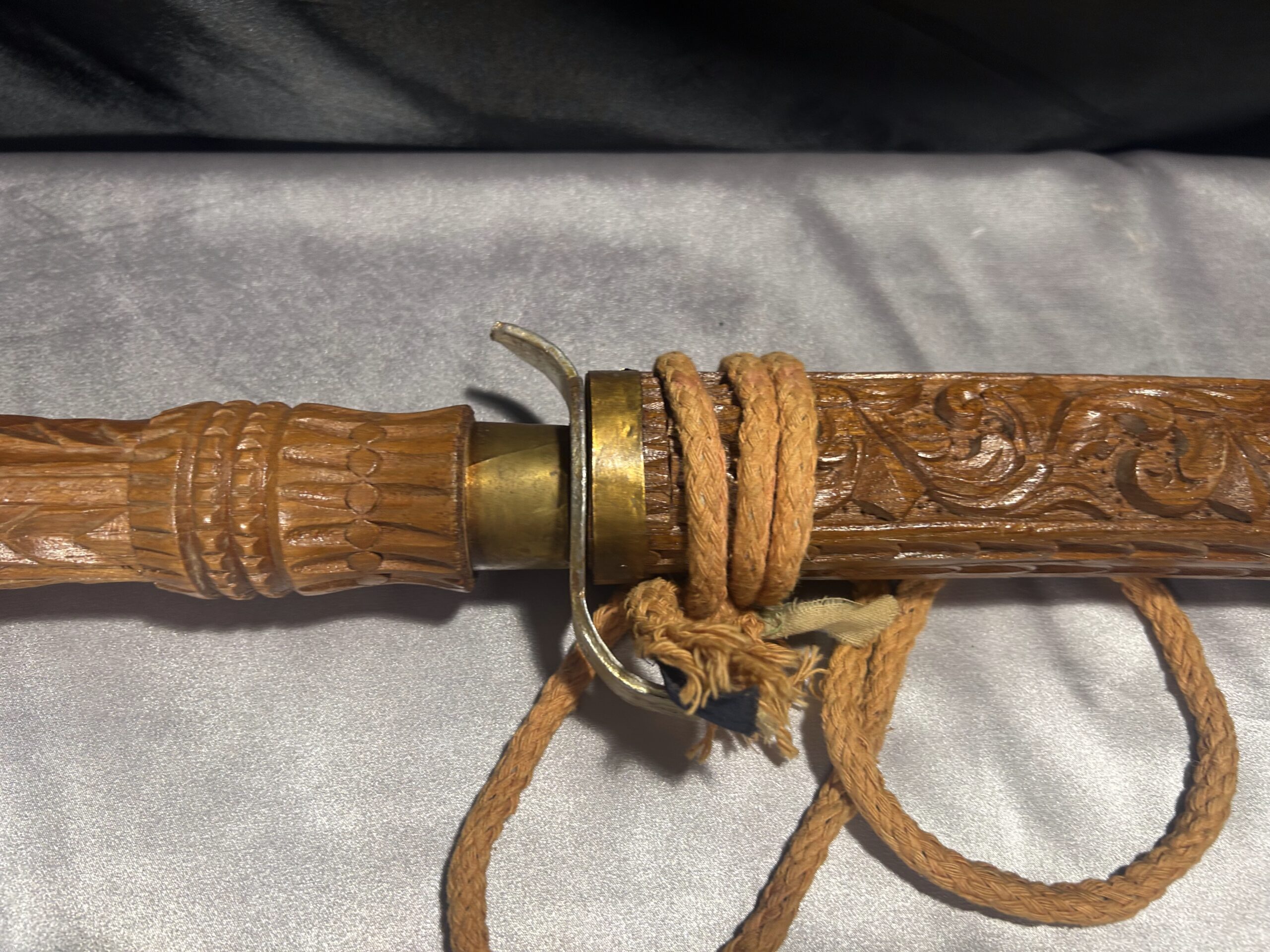 Wyjątkowa szabla o unikatowym kształcie przypominającym długą maczetę, wykonana z jasnego, afrykańskiego drewna. Zarówno rękojeść, jak i pochwa są bogato rzeźbione, co nadaje jej artystycznego i kolekcjonerskiego charakteru. Ostrze posiada charakterystyczne nacięcia, które mogą sugerować symboliczną historię użytkowania.