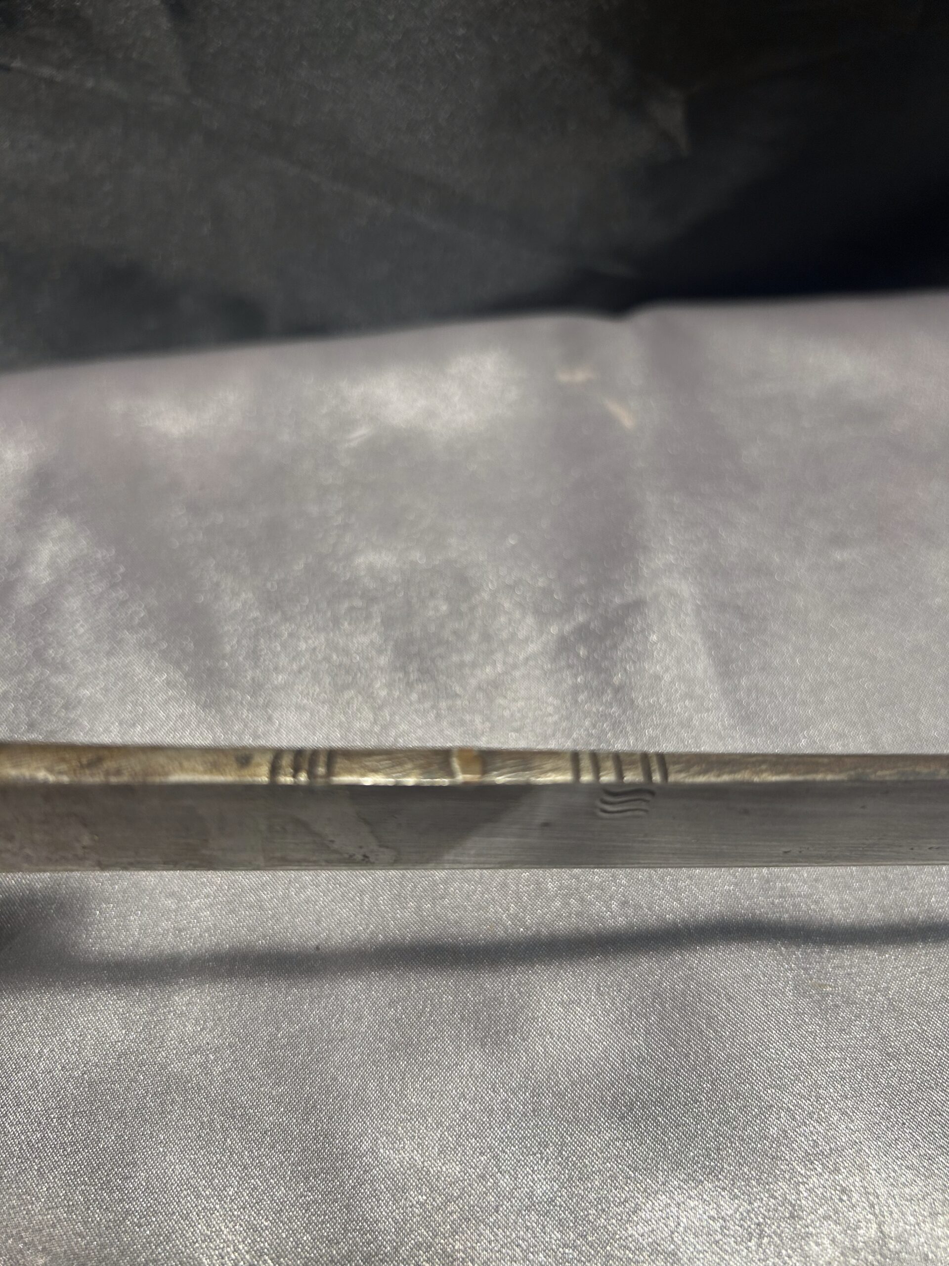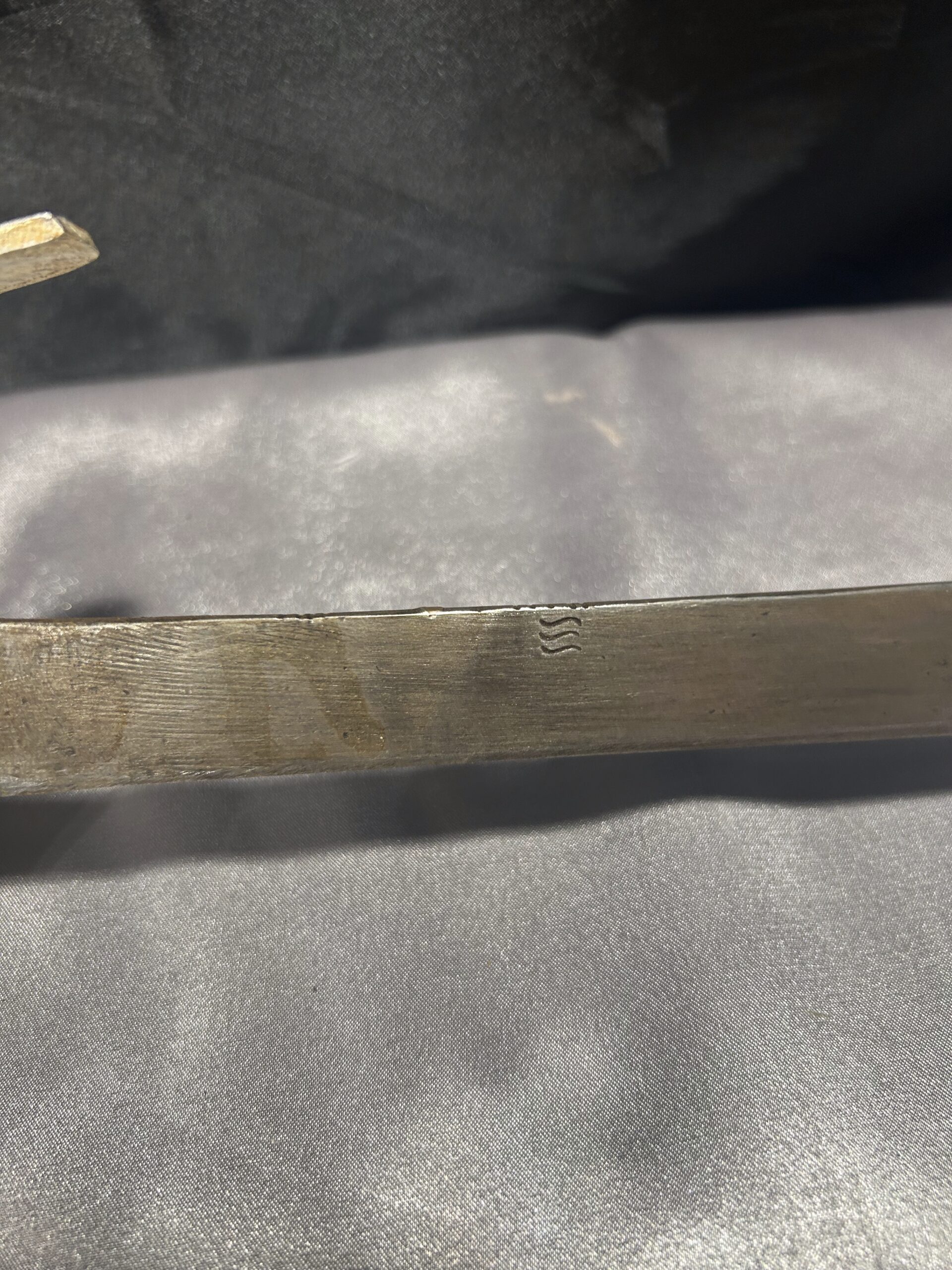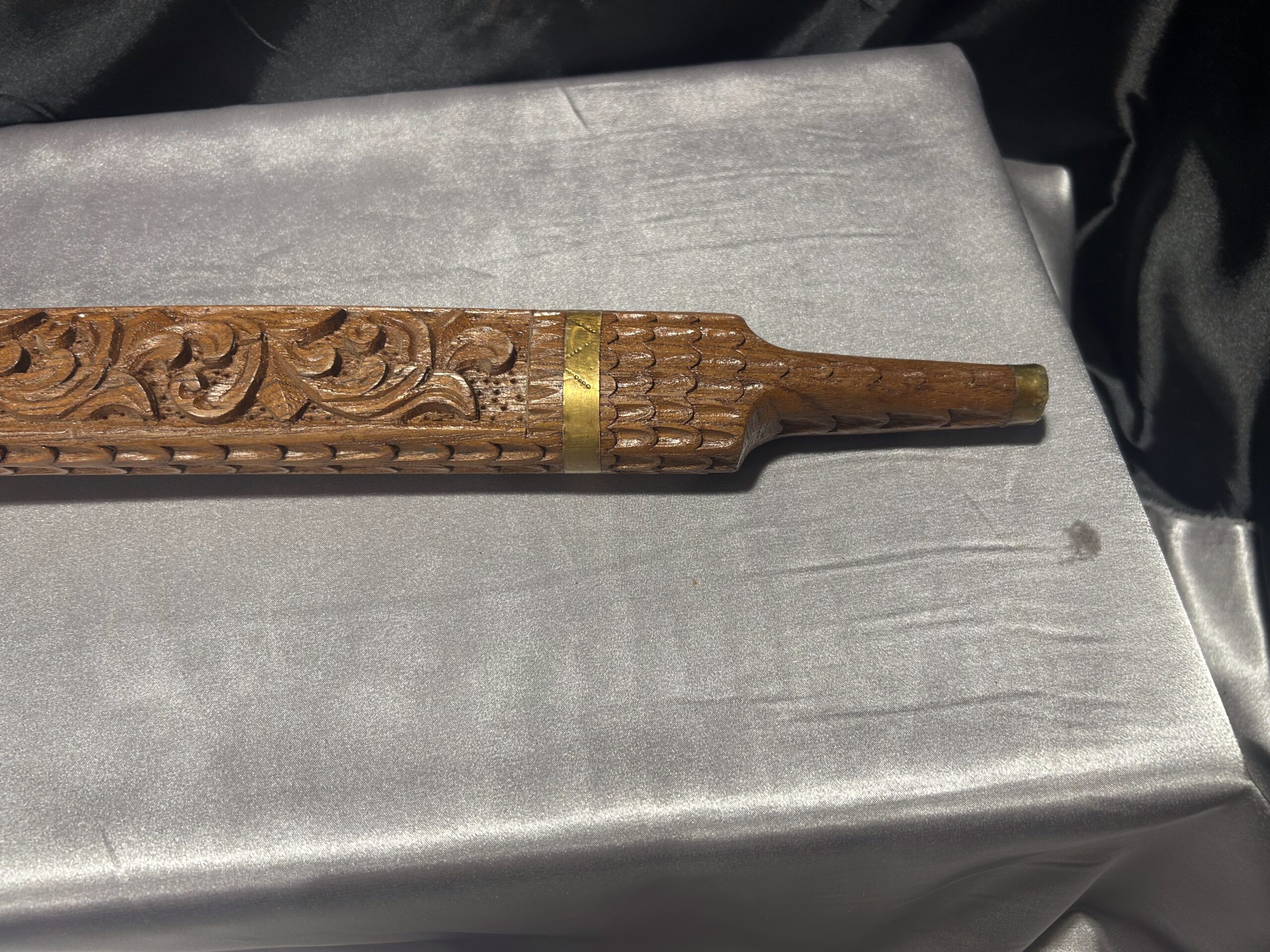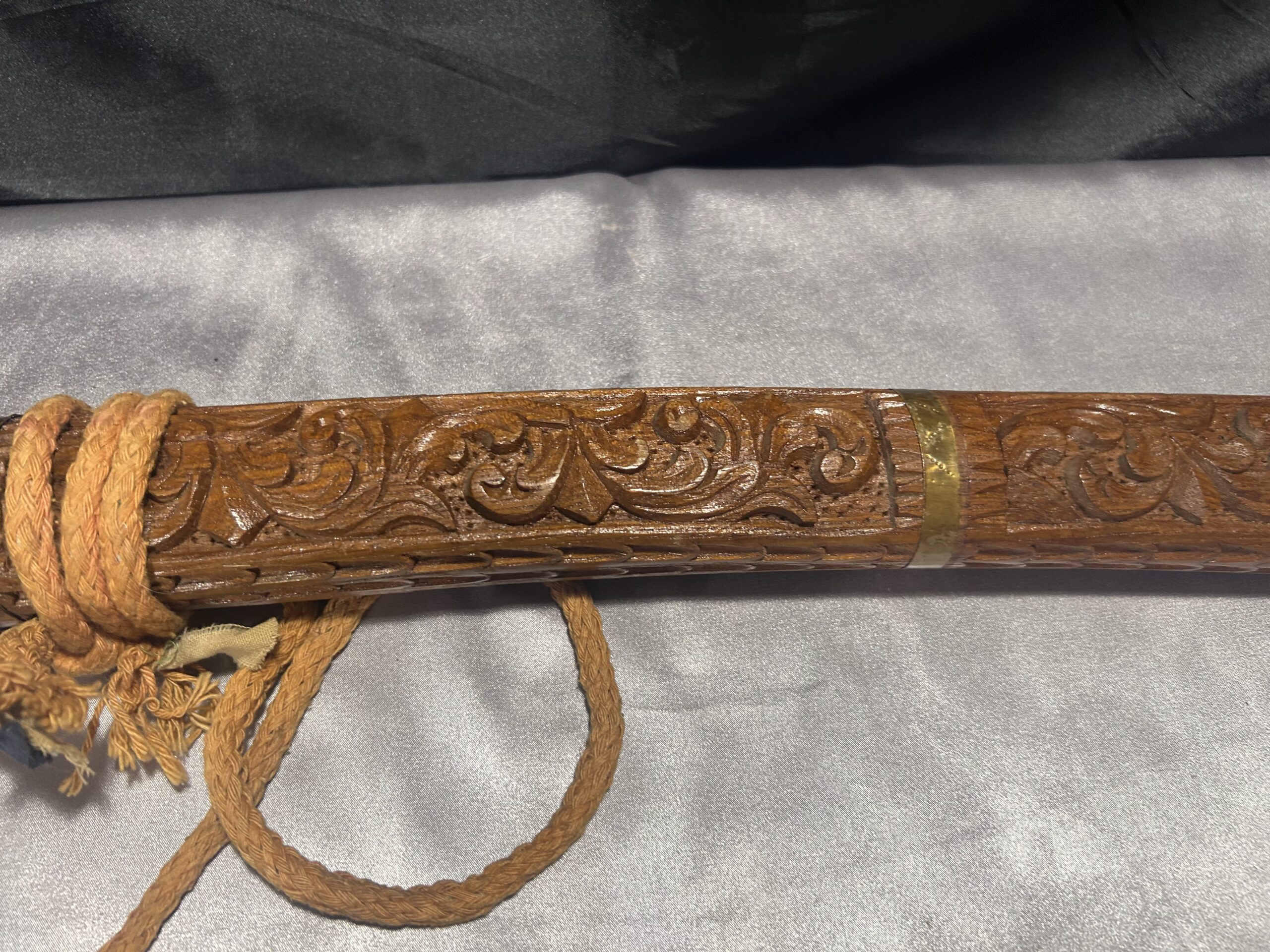 Wyjątkowa szabla o unikatowym kształcie przypominającym długą maczetę, wykonana z jasnego, afrykańskiego drewna. Zarówno rękojeść, jak i pochwa są bogato rzeźbione, co nadaje jej artystycznego i kolekcjonerskiego charakteru. Ostrze posiada charakterystyczne nacięcia, które mogą sugerować symboliczną historię użytkowania.