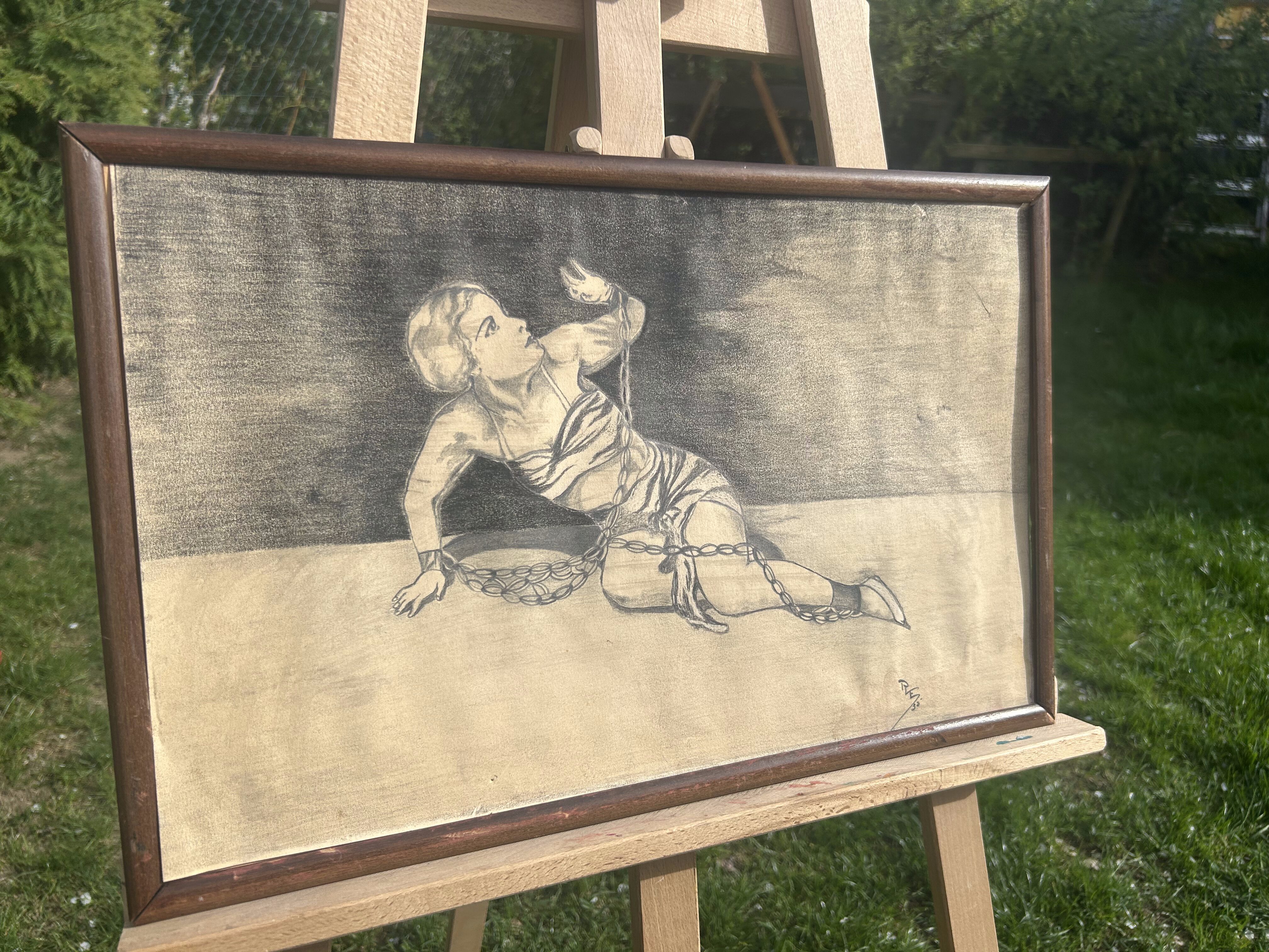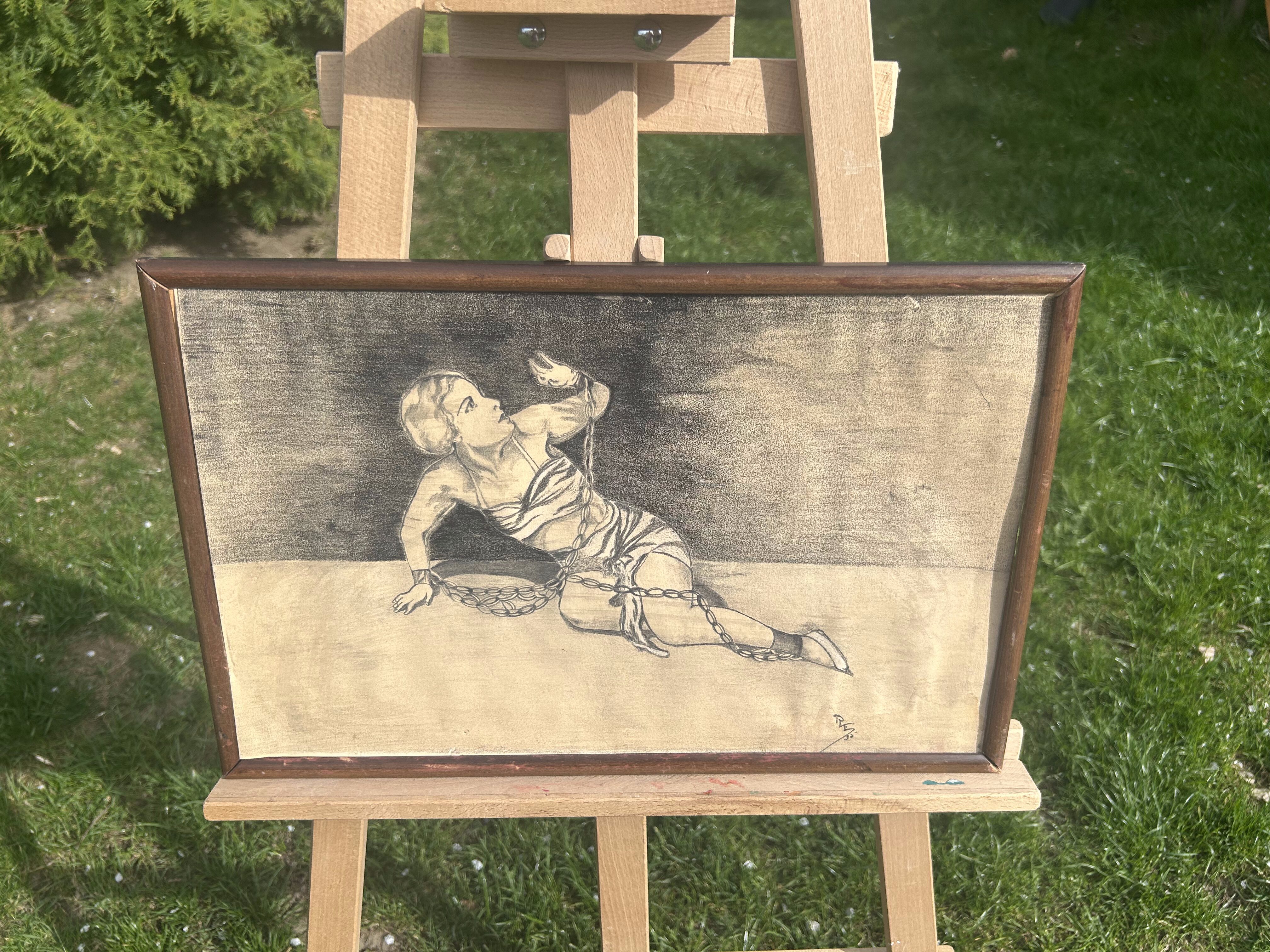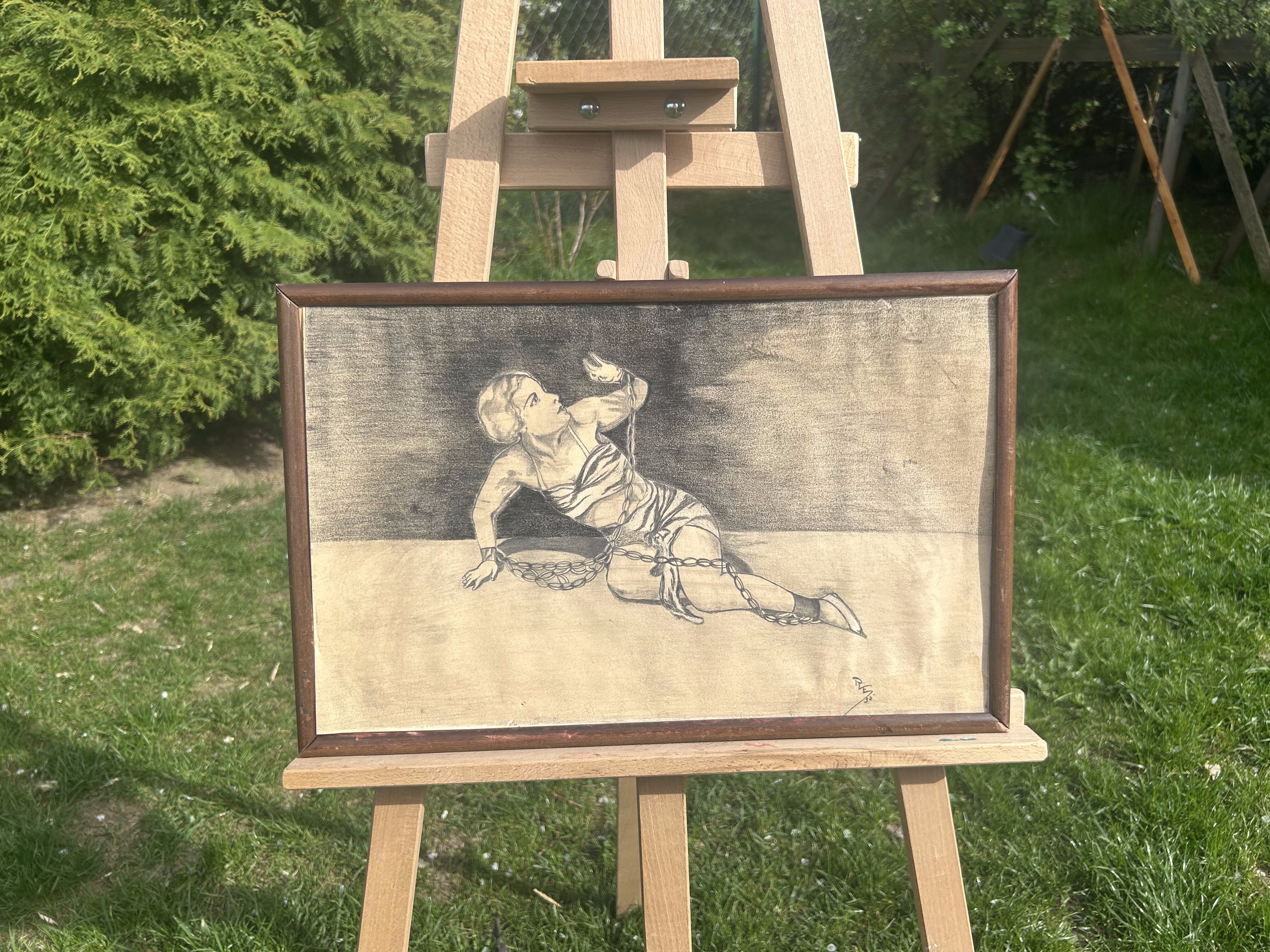 Wyjątkowy szkic z lat 20. ubiegłego wieku, przedstawiający postać zniewolonej kobiety. Rysunek wykonany ołówkiem na papierze, sygnowany inicjałami RS ’35. Kompozycja porusza temat wolności i uwięzienia, wyrażając emocjonalne napięcie oraz dramatyzm sceny. Ciemne tło i kontrast z nagim ciałem kobiety owiniętej łańcuchem tworzą sugestywny i niepokojący nastrój.