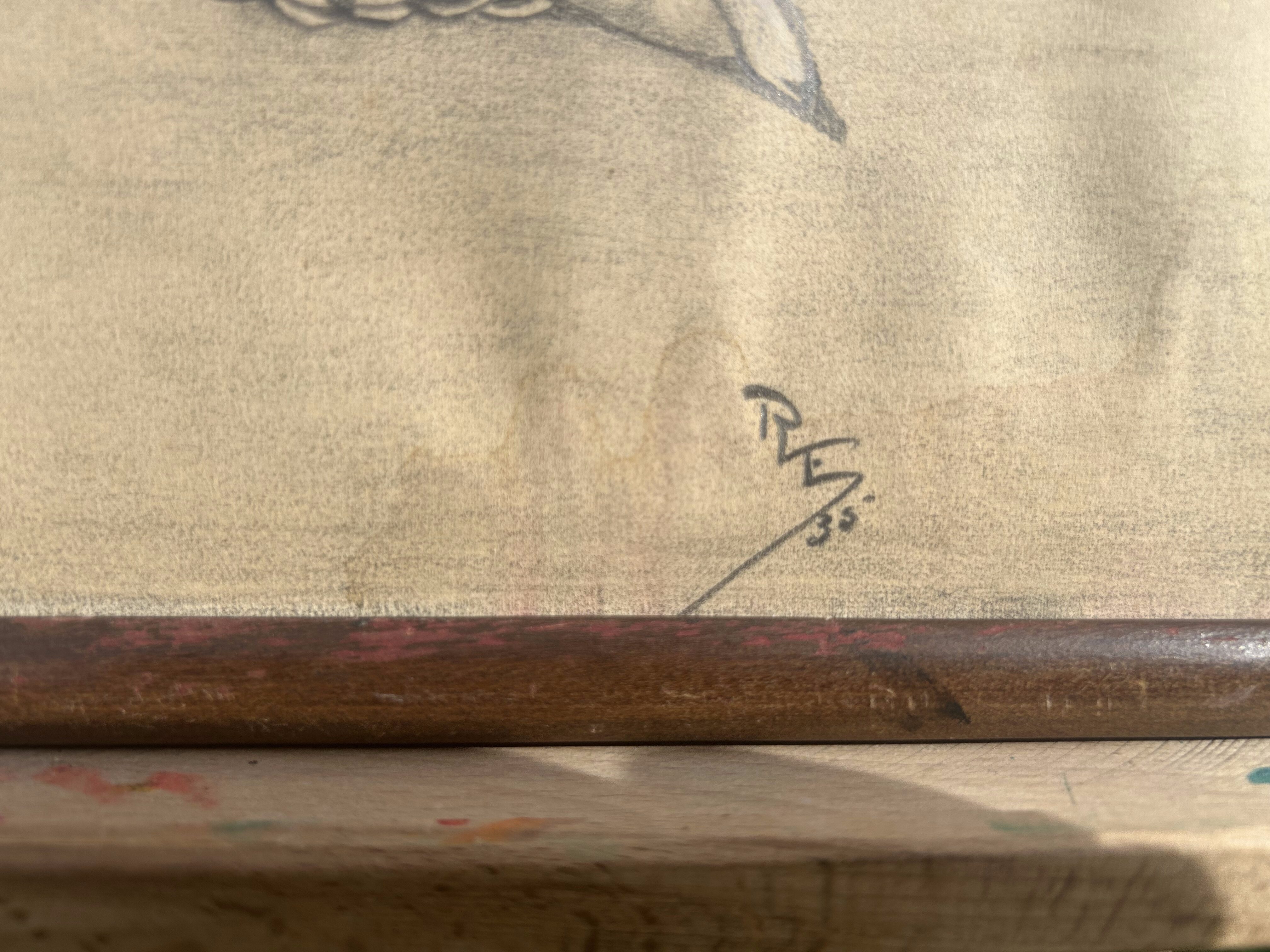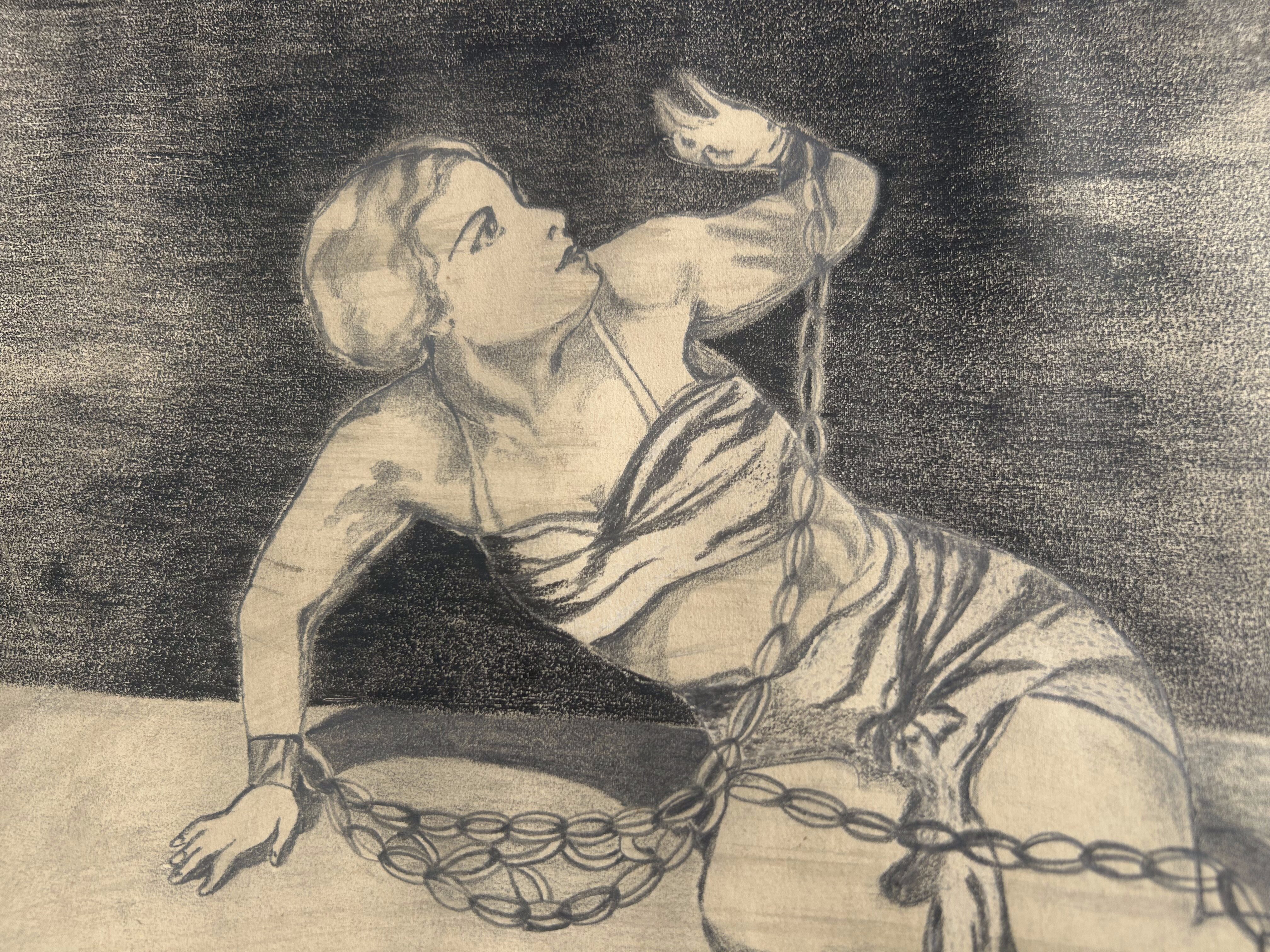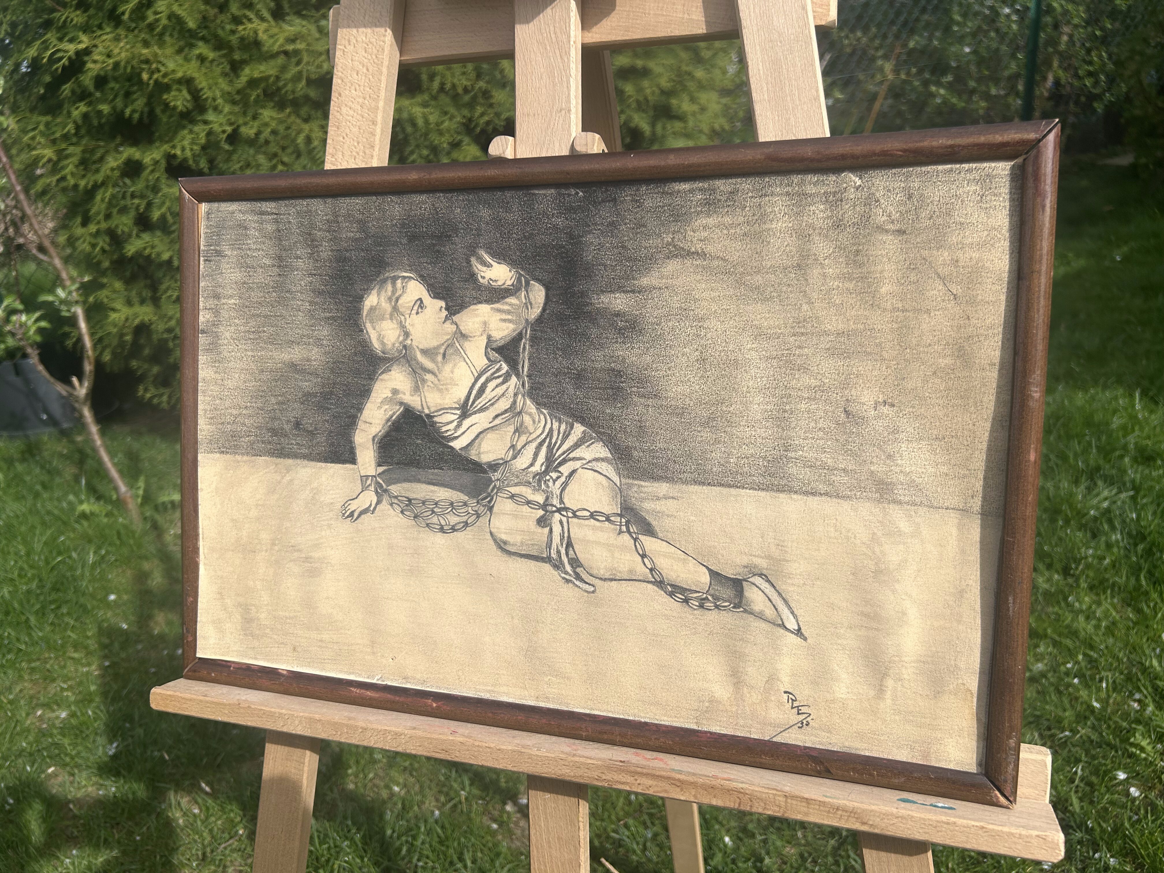 Wyjątkowy szkic z lat 20. ubiegłego wieku, przedstawiający postać zniewolonej kobiety. Rysunek wykonany ołówkiem na papierze, sygnowany inicjałami RS ’35. Kompozycja porusza temat wolności i uwięzienia, wyrażając emocjonalne napięcie oraz dramatyzm sceny. Ciemne tło i kontrast z nagim ciałem kobiety owiniętej łańcuchem tworzą sugestywny i niepokojący nastrój.