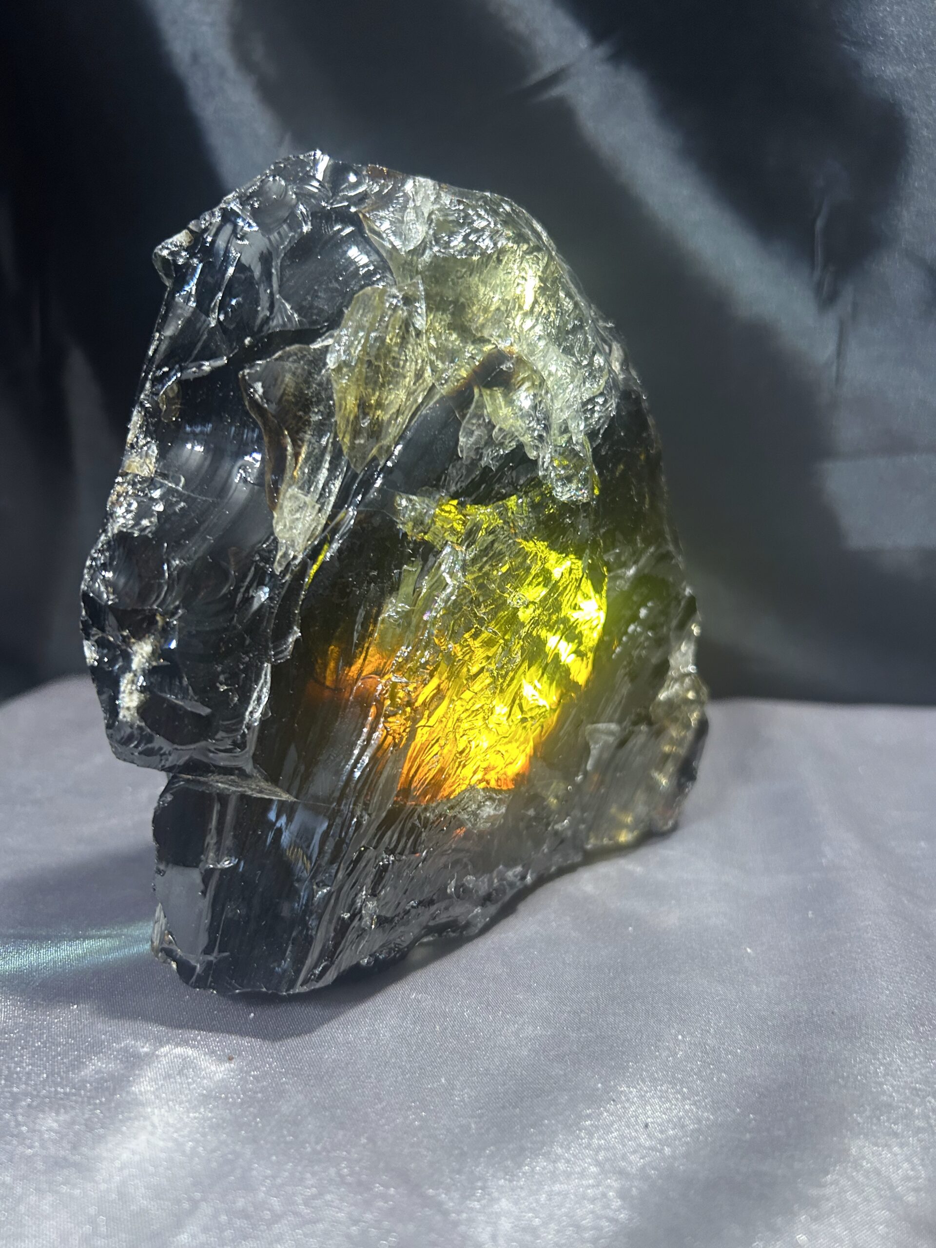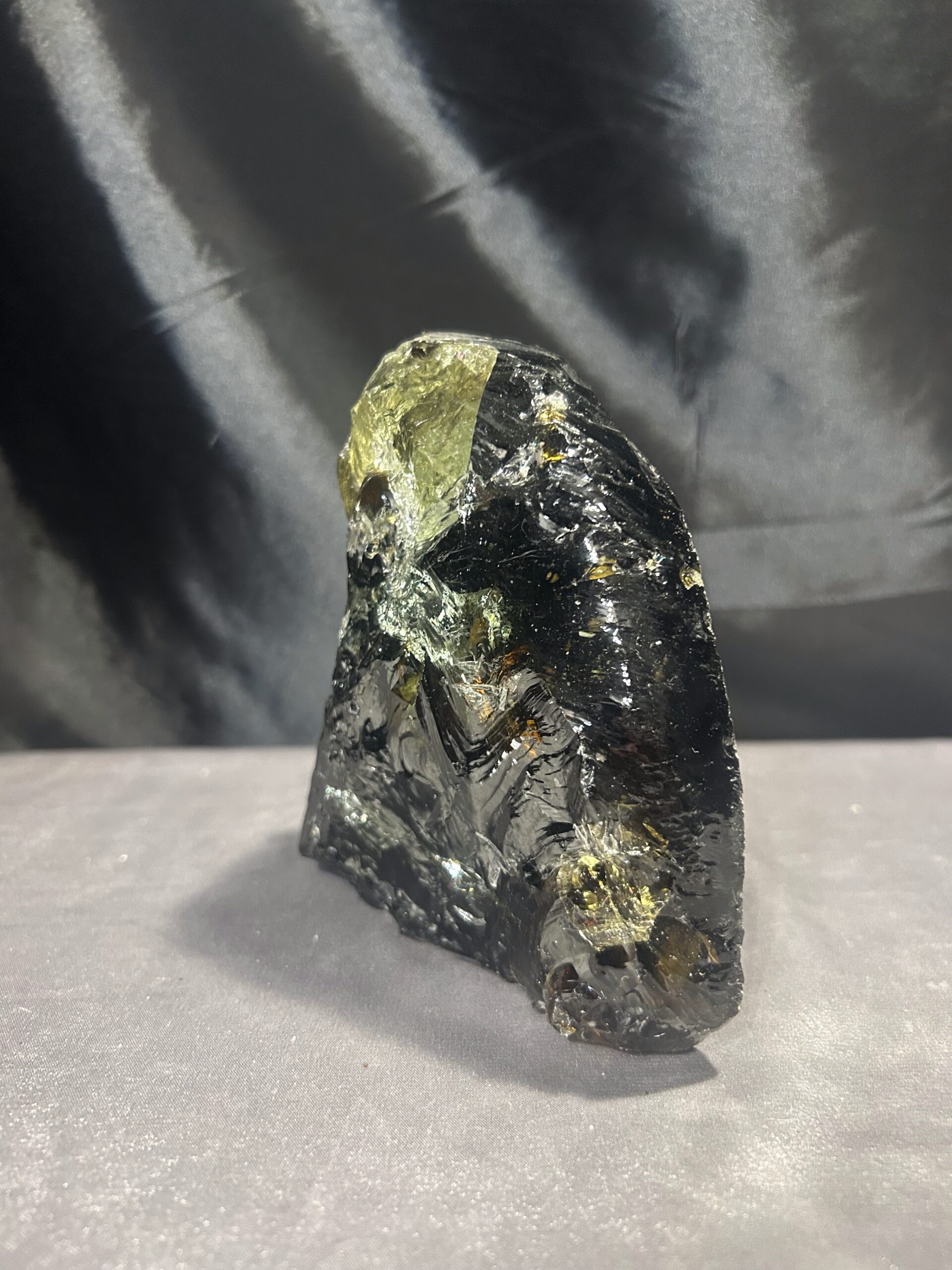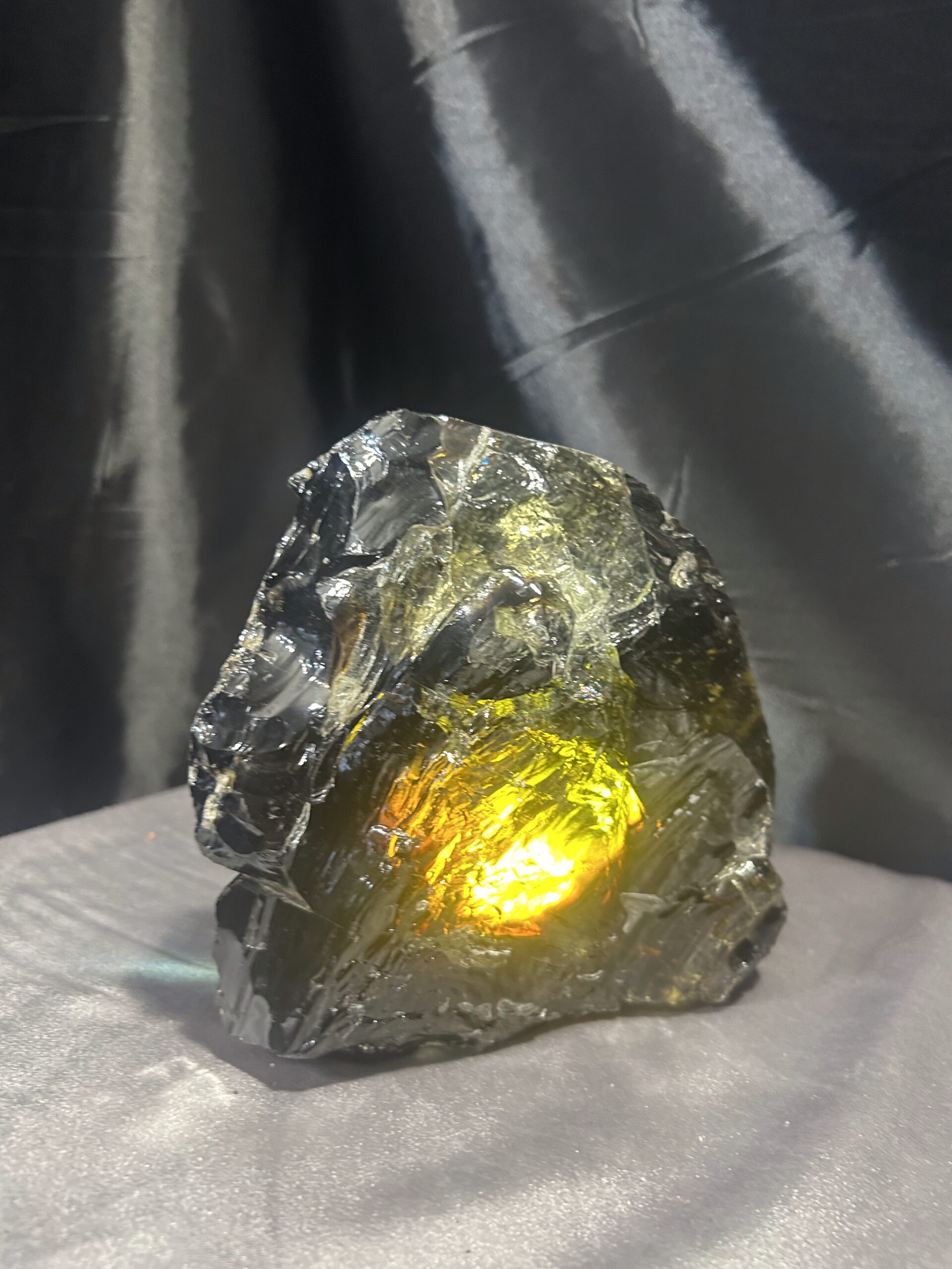 Efektowna bryła szkła, która pełni funkcję przycisku do papieru, a jednocześnie stanowi wyjątkową ozdobę. Jej unikalna kolorystyka – zielono-żółto-czarna – tworzy fascynującą grę barw, która pięknie odbija światło. To nie tylko praktyczny dodatek, ale także elegancki element dekoracyjny.