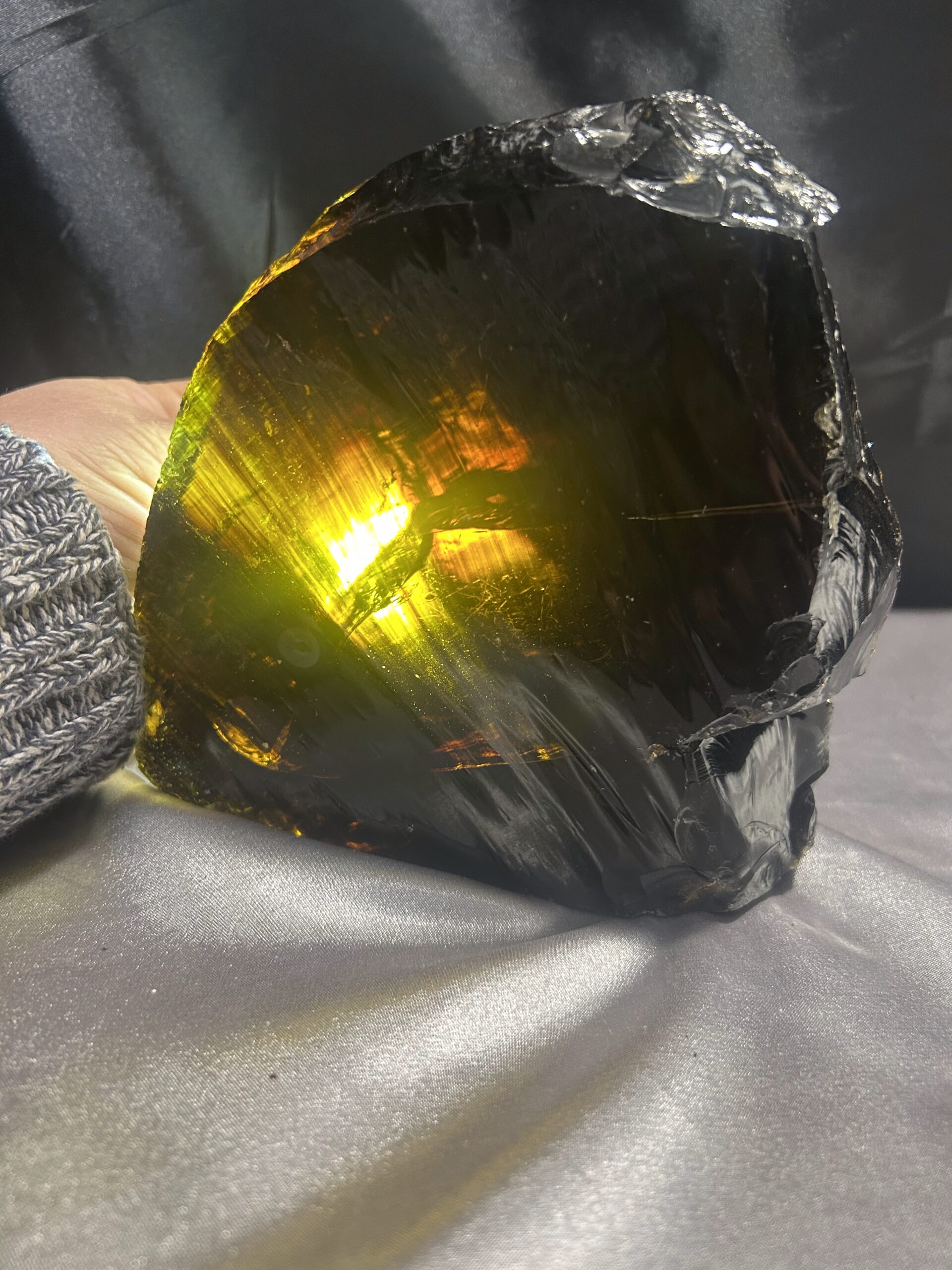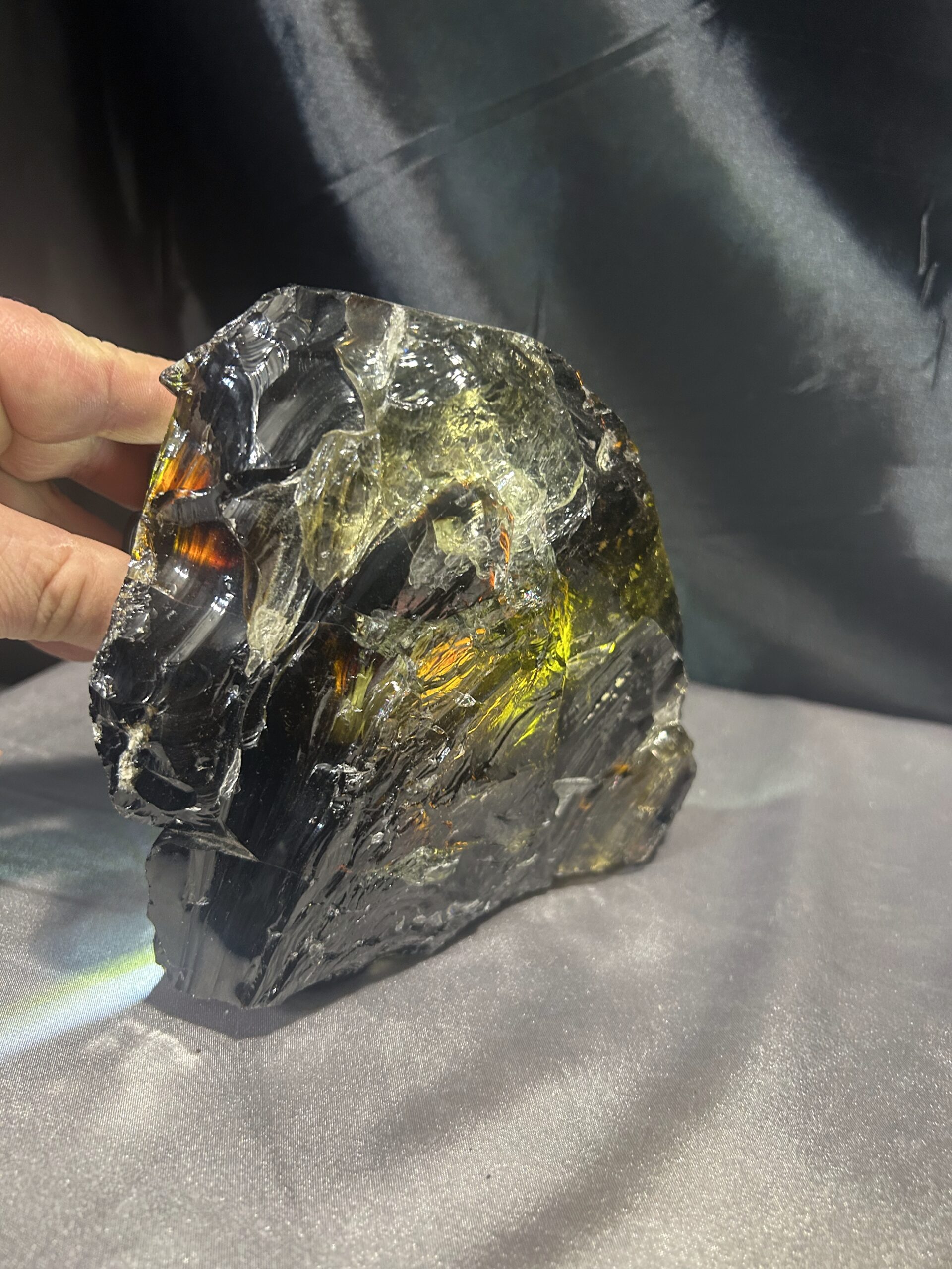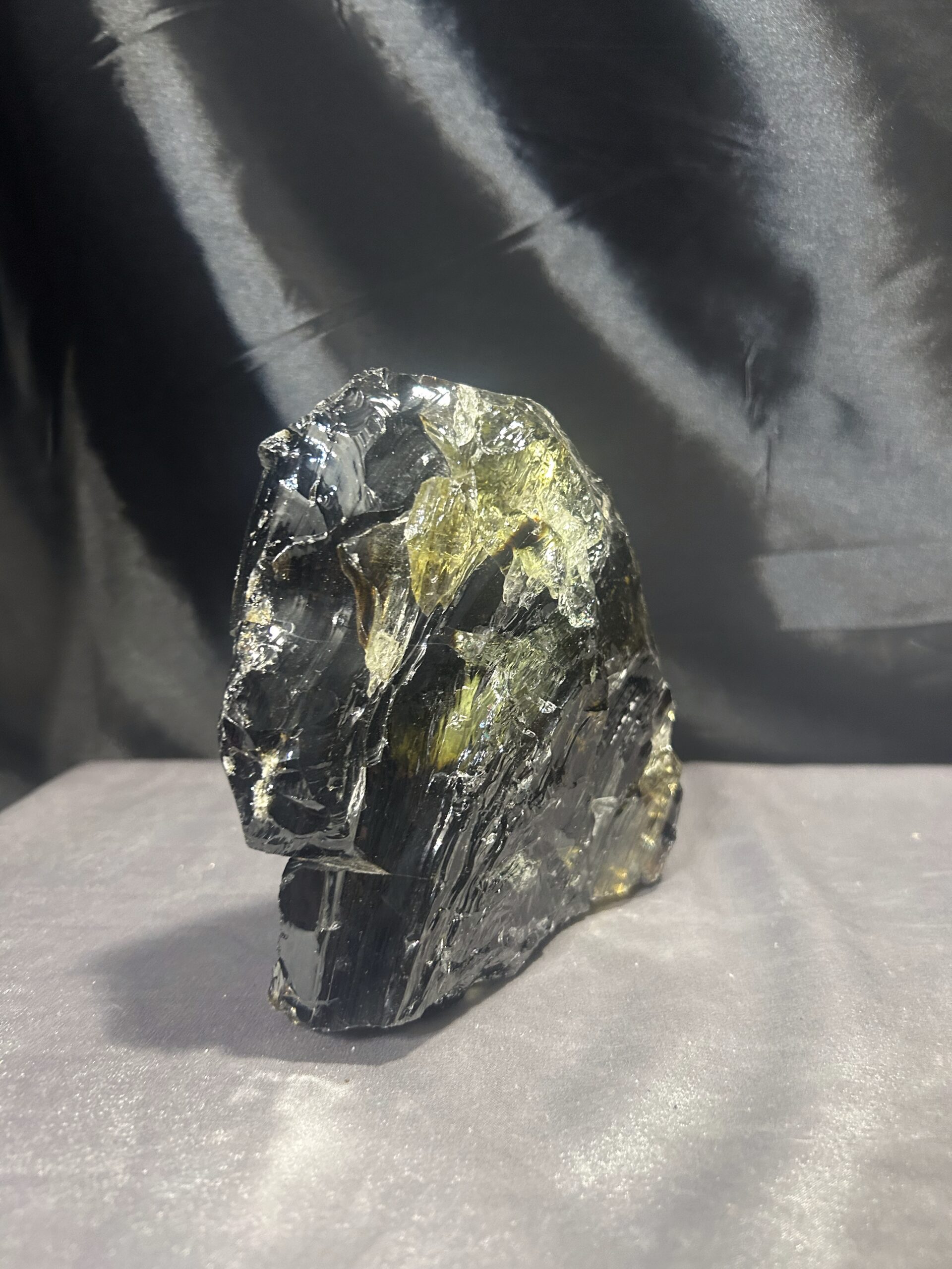 Efektowna bryła szkła, która pełni funkcję przycisku do papieru, a jednocześnie stanowi wyjątkową ozdobę. Jej unikalna kolorystyka – zielono-żółto-czarna – tworzy fascynującą grę barw, która pięknie odbija światło. To nie tylko praktyczny dodatek, ale także elegancki element dekoracyjny.