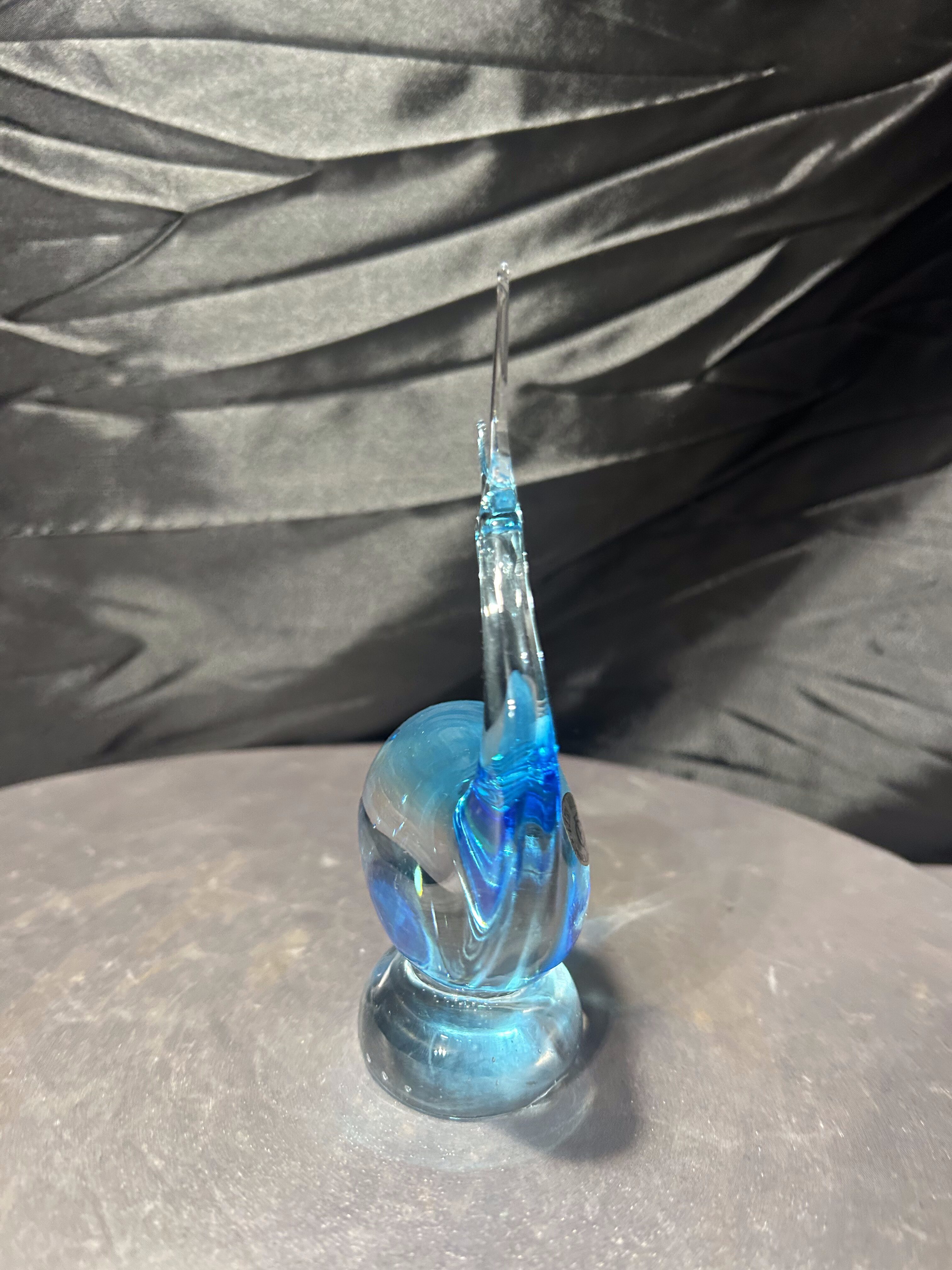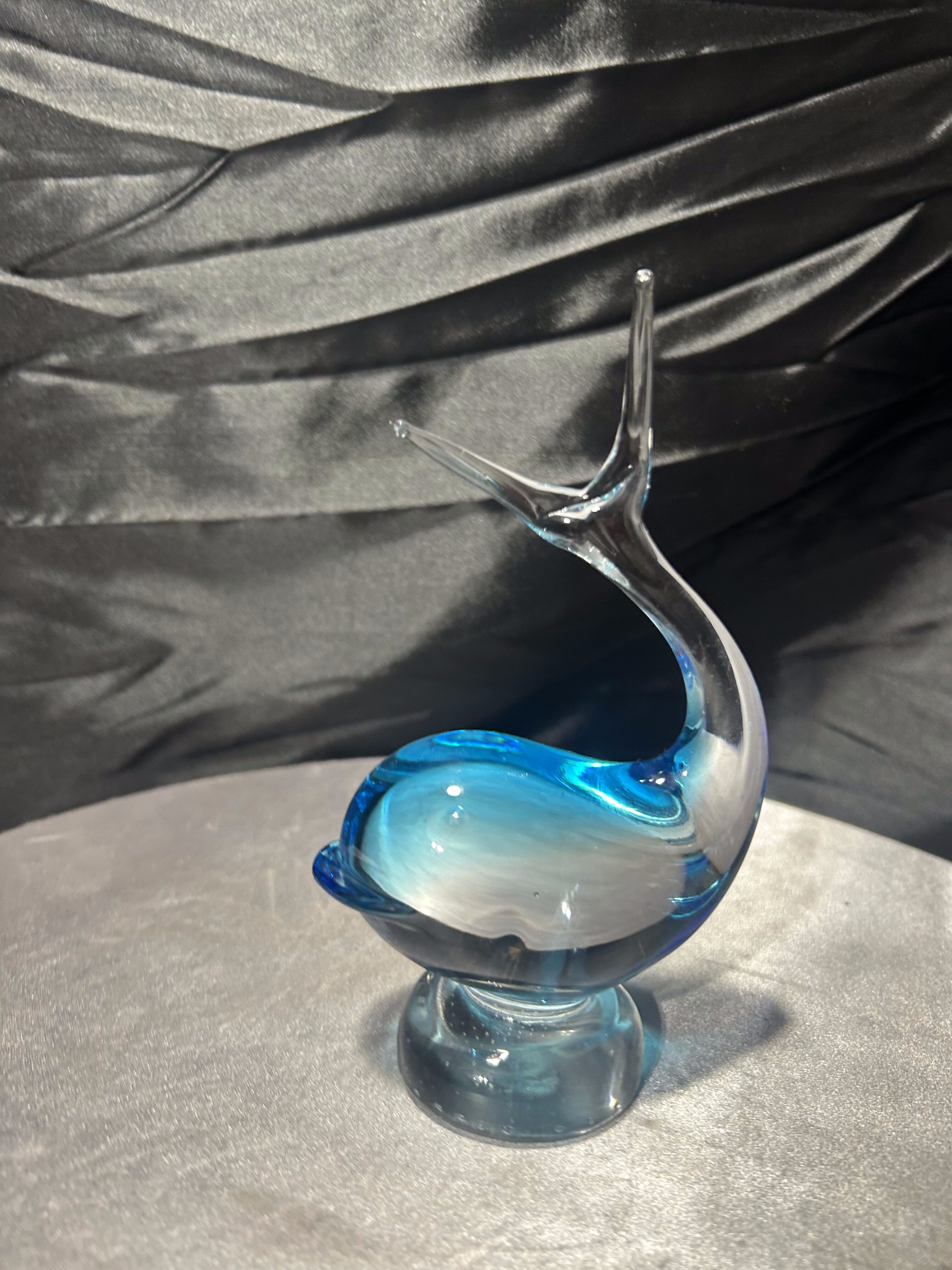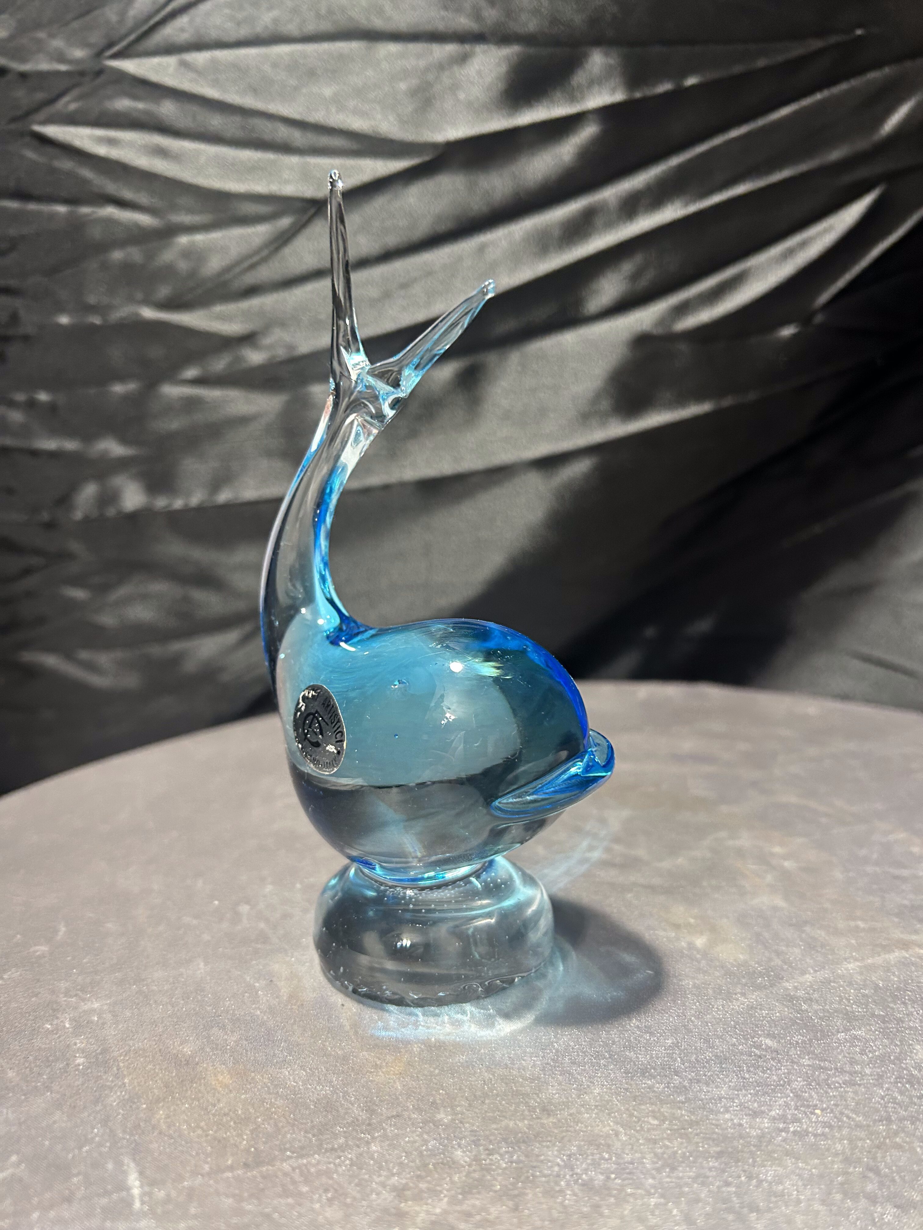 Dekoracyjna figurka ryby wykonana z artystycznego szkła w charakterystycznym błękitnym odcieniu. Dynamiczna, płynna forma z uniesionym ogonem i miękką linią korpusu nawiązuje do tradycyjnych wyrobów inspirowanych stylistyką Murano. Szkło o pięknej głębi barwy i subtelnych przejściach kolorystycznych efektownie pracuje ze światłem, podkreślając rzeźbiarski charakter przedmiotu.