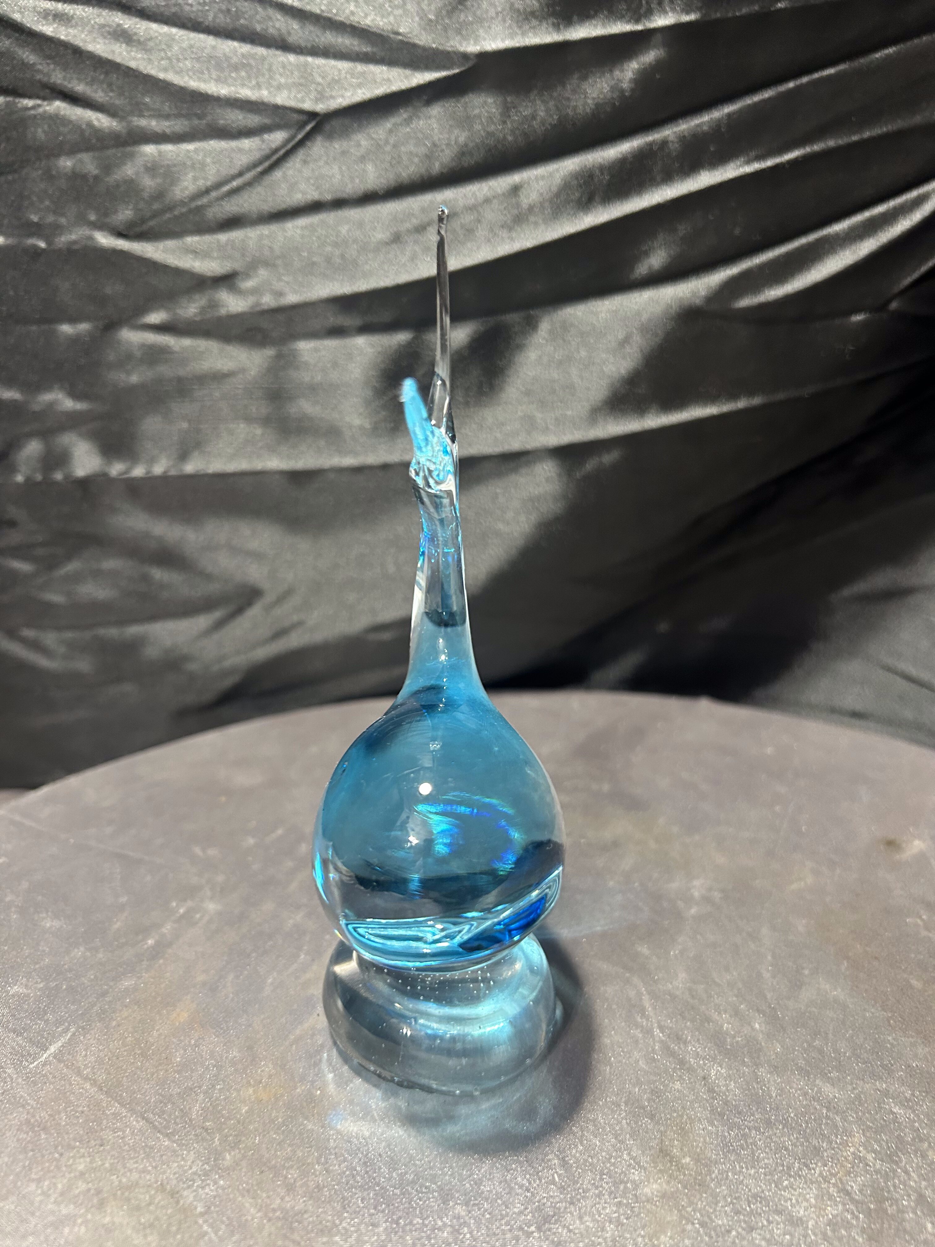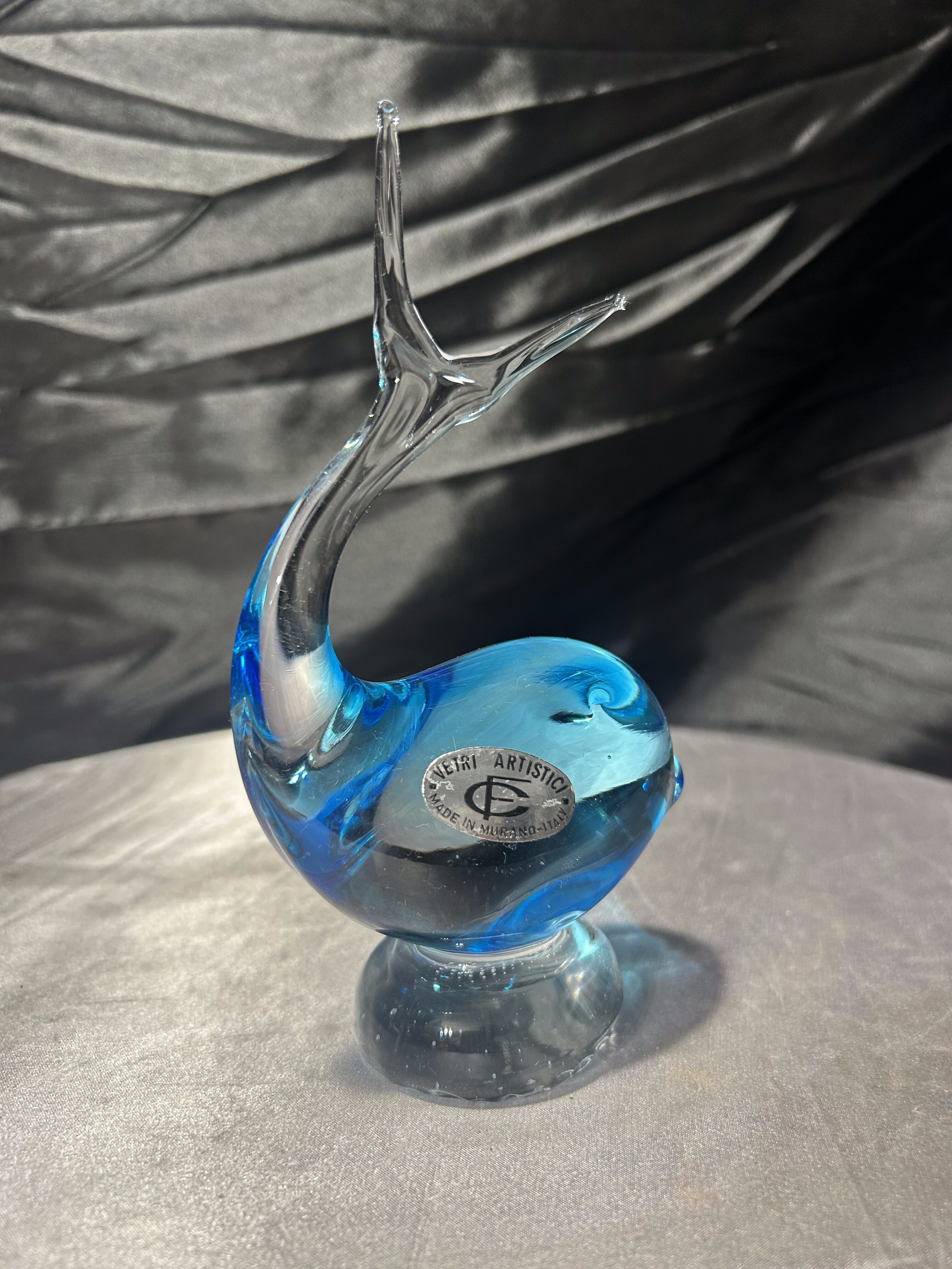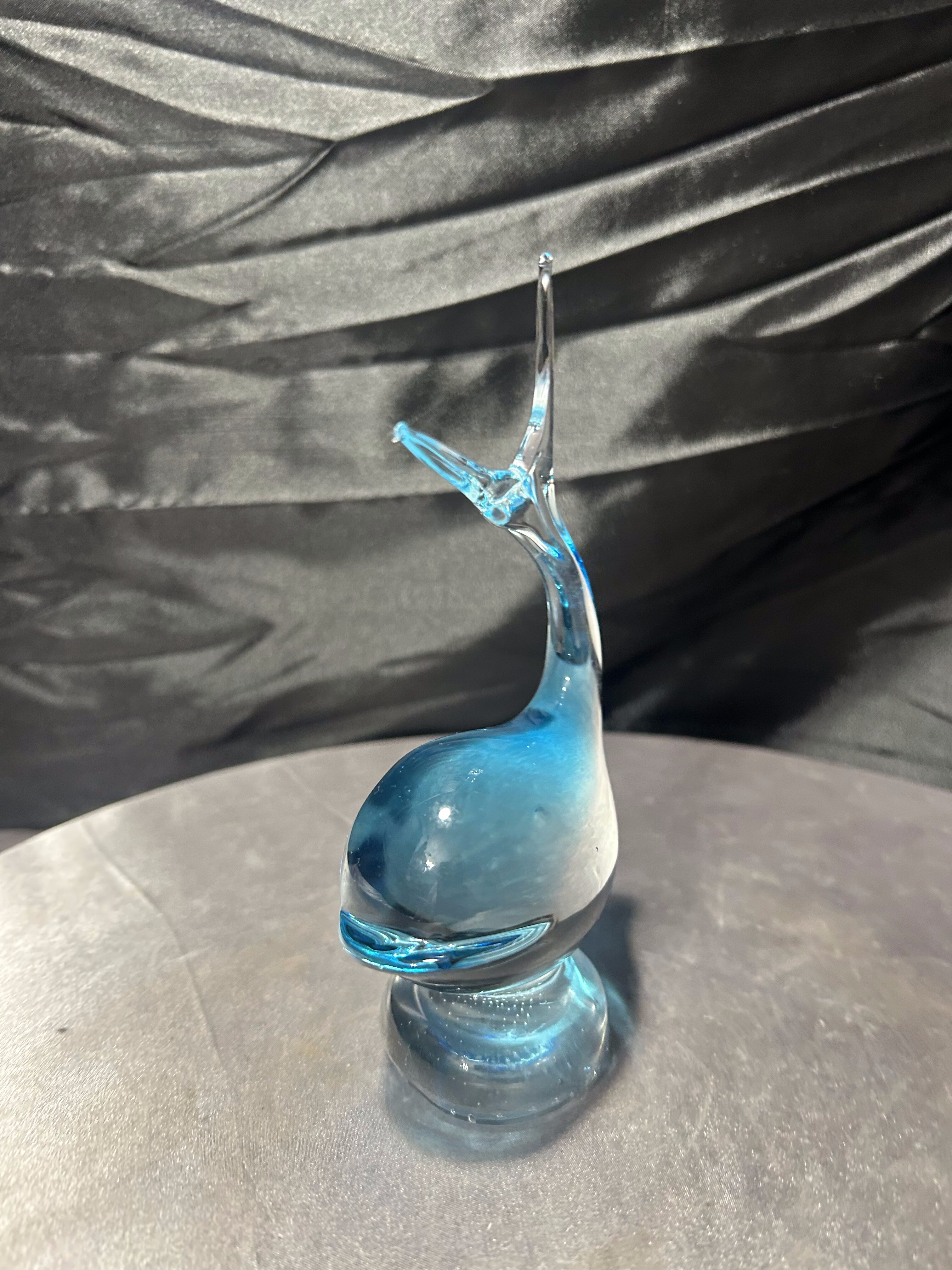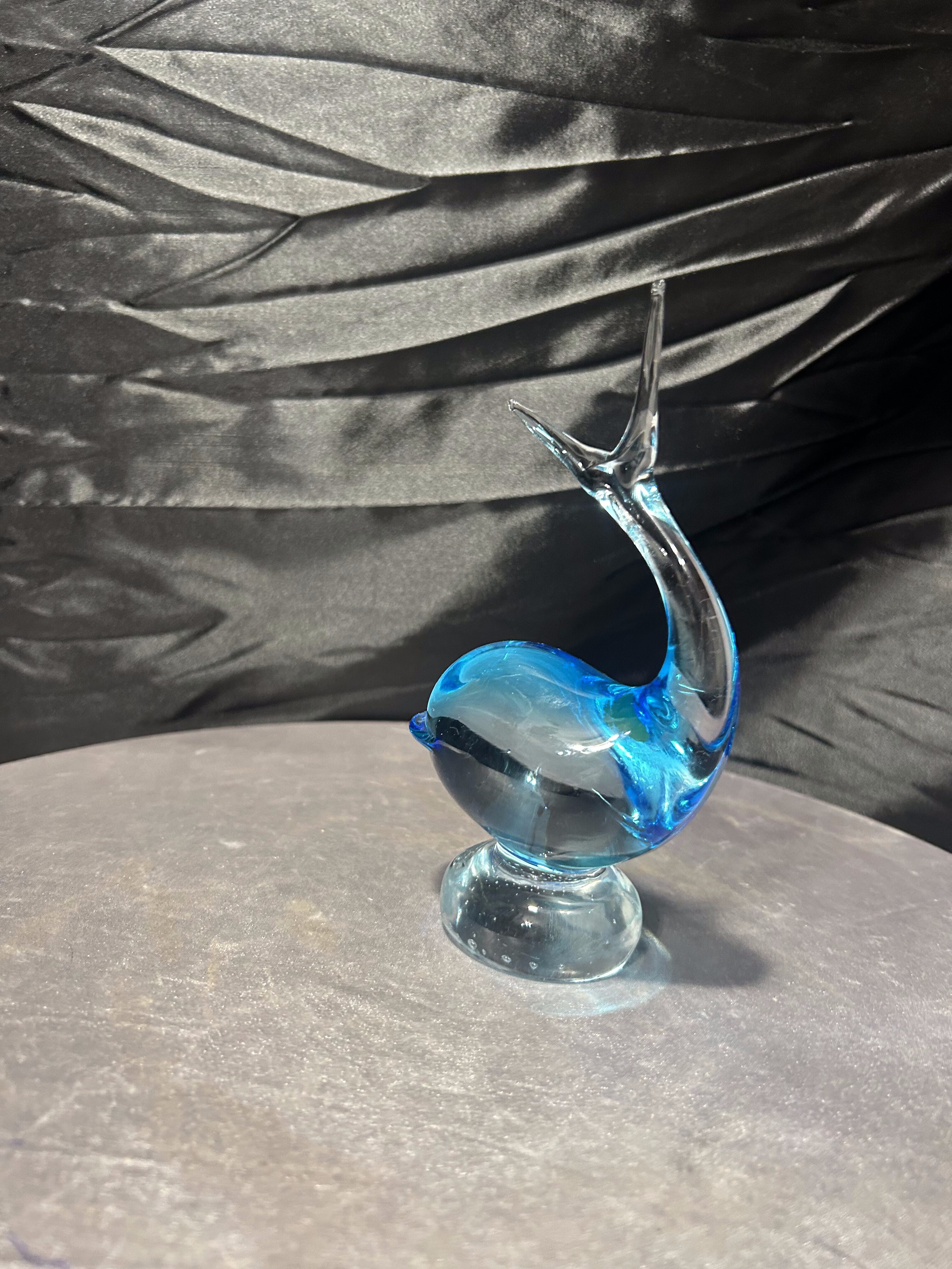 Dekoracyjna figurka ryby wykonana z artystycznego szkła w charakterystycznym błękitnym odcieniu. Dynamiczna, płynna forma z uniesionym ogonem i miękką linią korpusu nawiązuje do tradycyjnych wyrobów inspirowanych stylistyką Murano. Szkło o pięknej głębi barwy i subtelnych przejściach kolorystycznych efektownie pracuje ze światłem, podkreślając rzeźbiarski charakter przedmiotu.