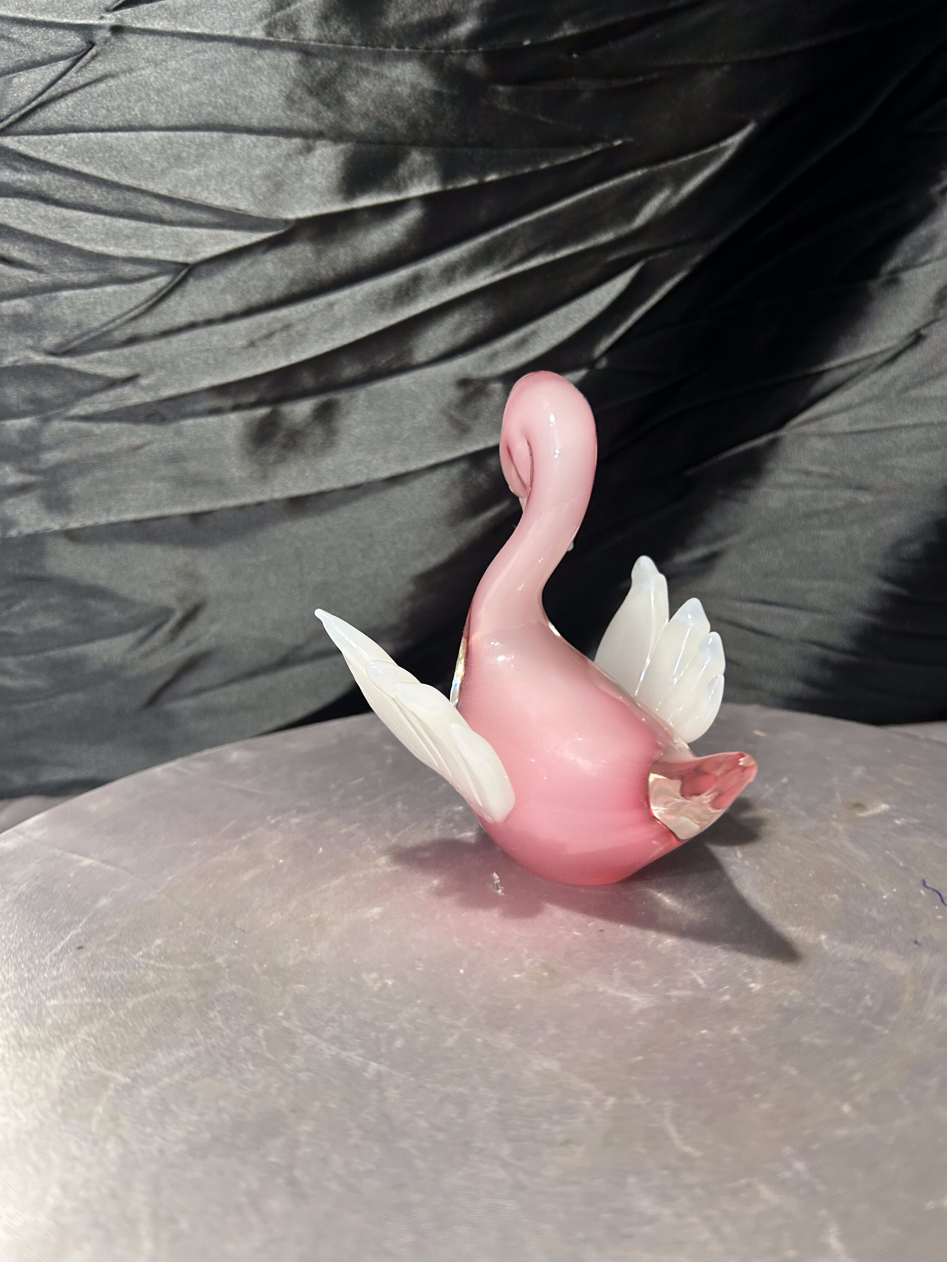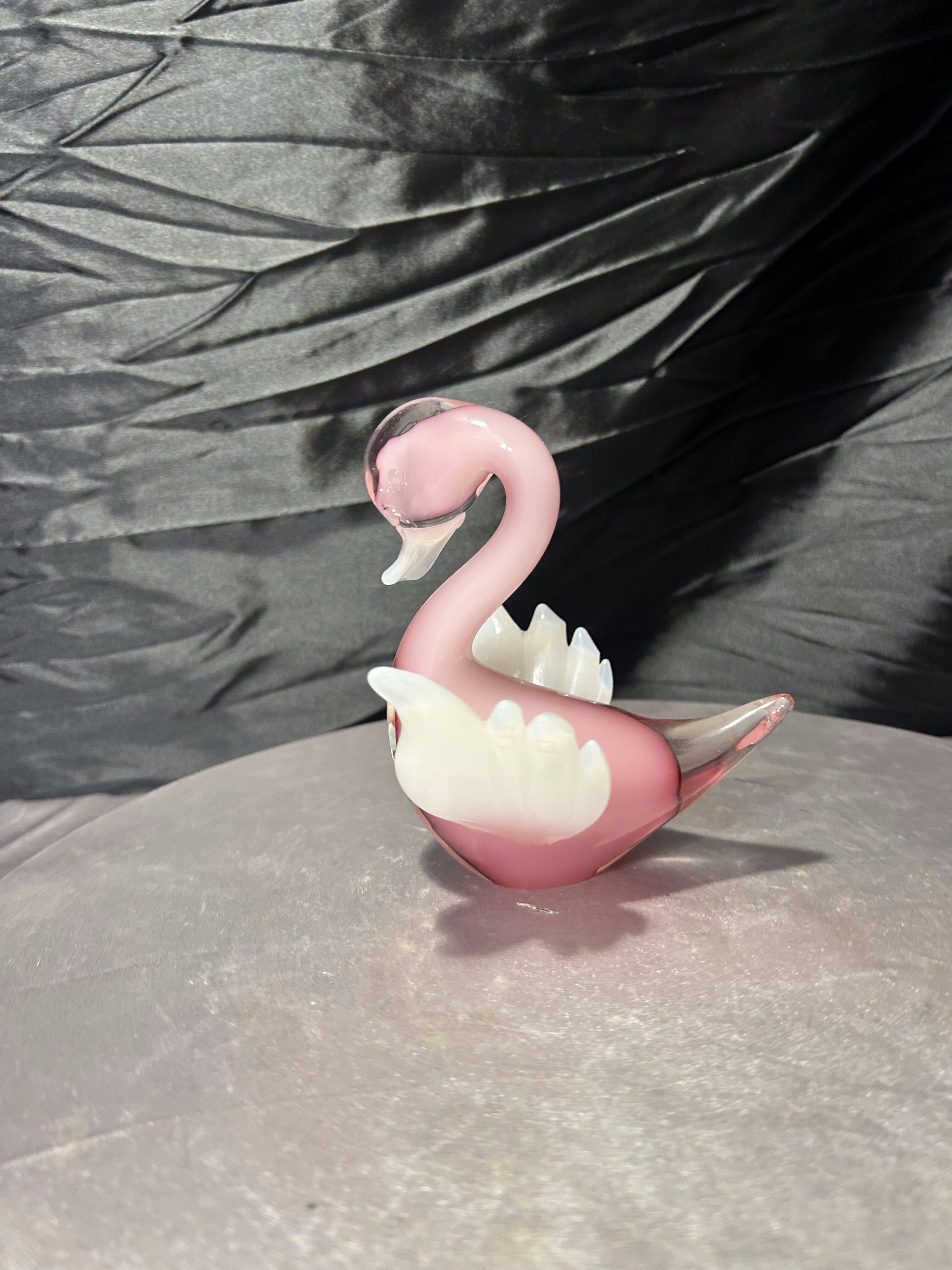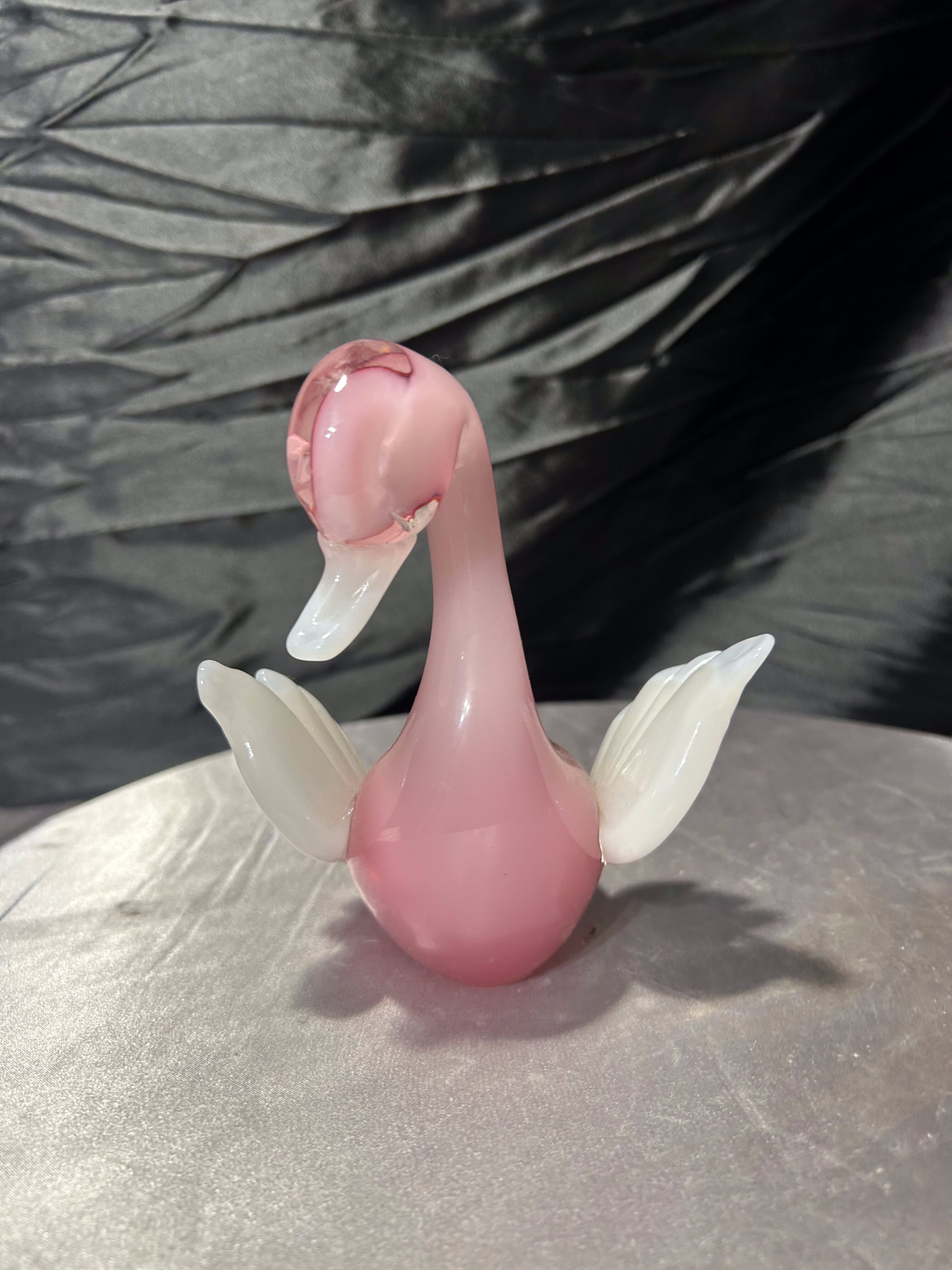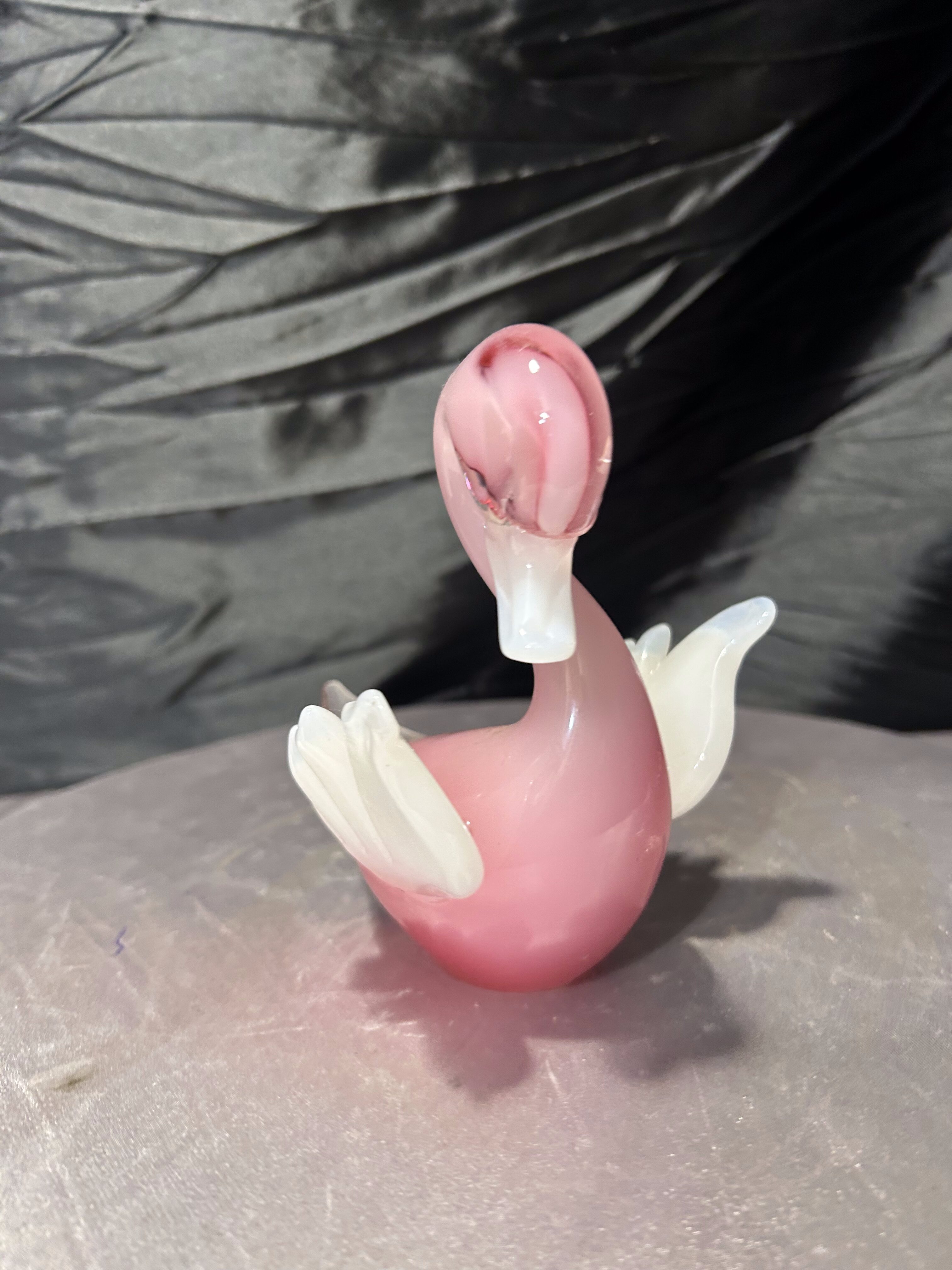 Dekoracyjna figurka szklana przedstawiająca kaczuszkę, wykonana z artystycznego szkła w subtelnym, różowym odcieniu. Forma częściowo transparentna, z kontrastującymi białymi skrzydełkami, nadaje całości lekkości i elegancji. Charakterystyczna linia oraz sposób formowania na gorąco nawiązują do szkła artystycznego w stylu Murano.