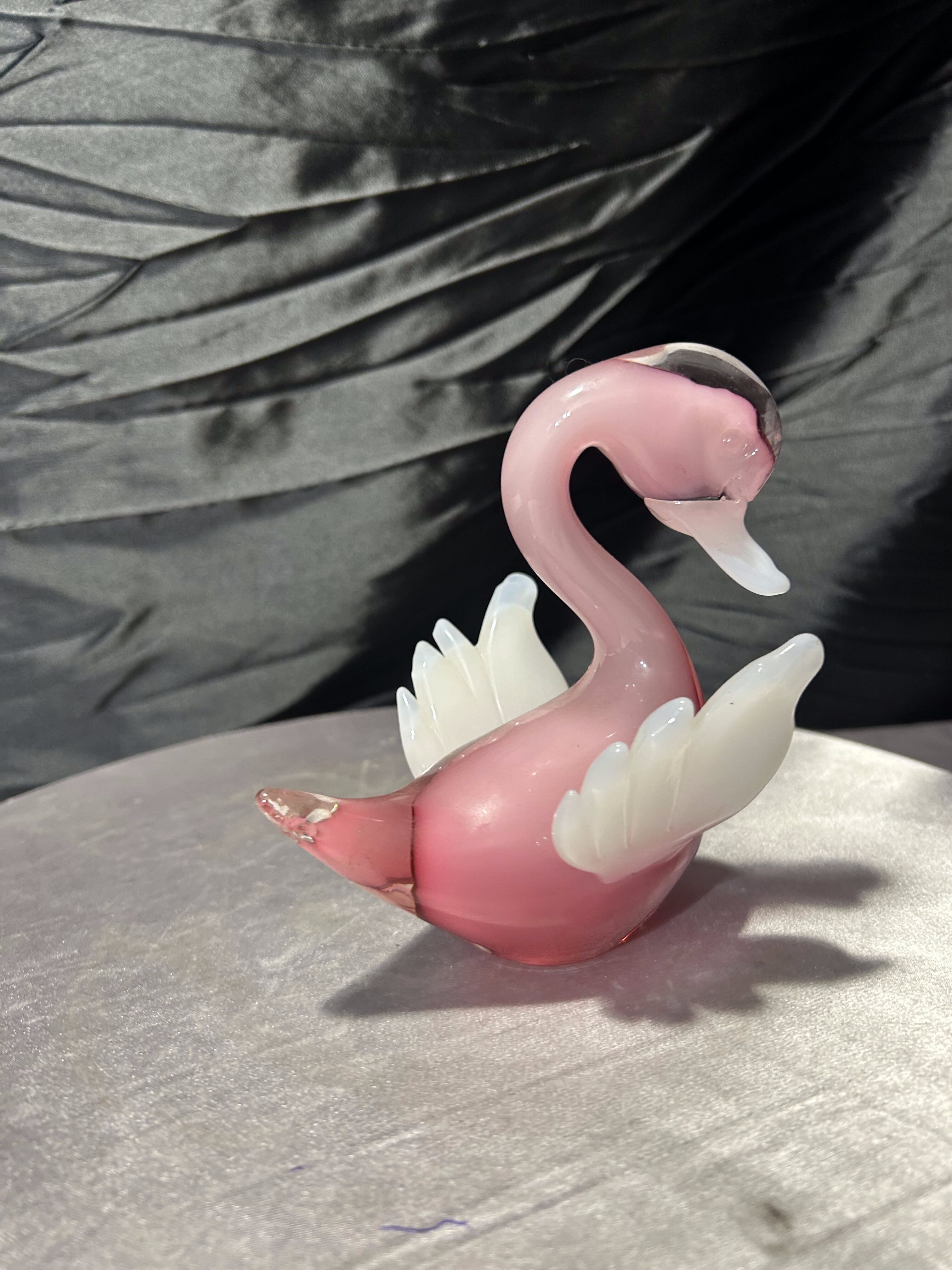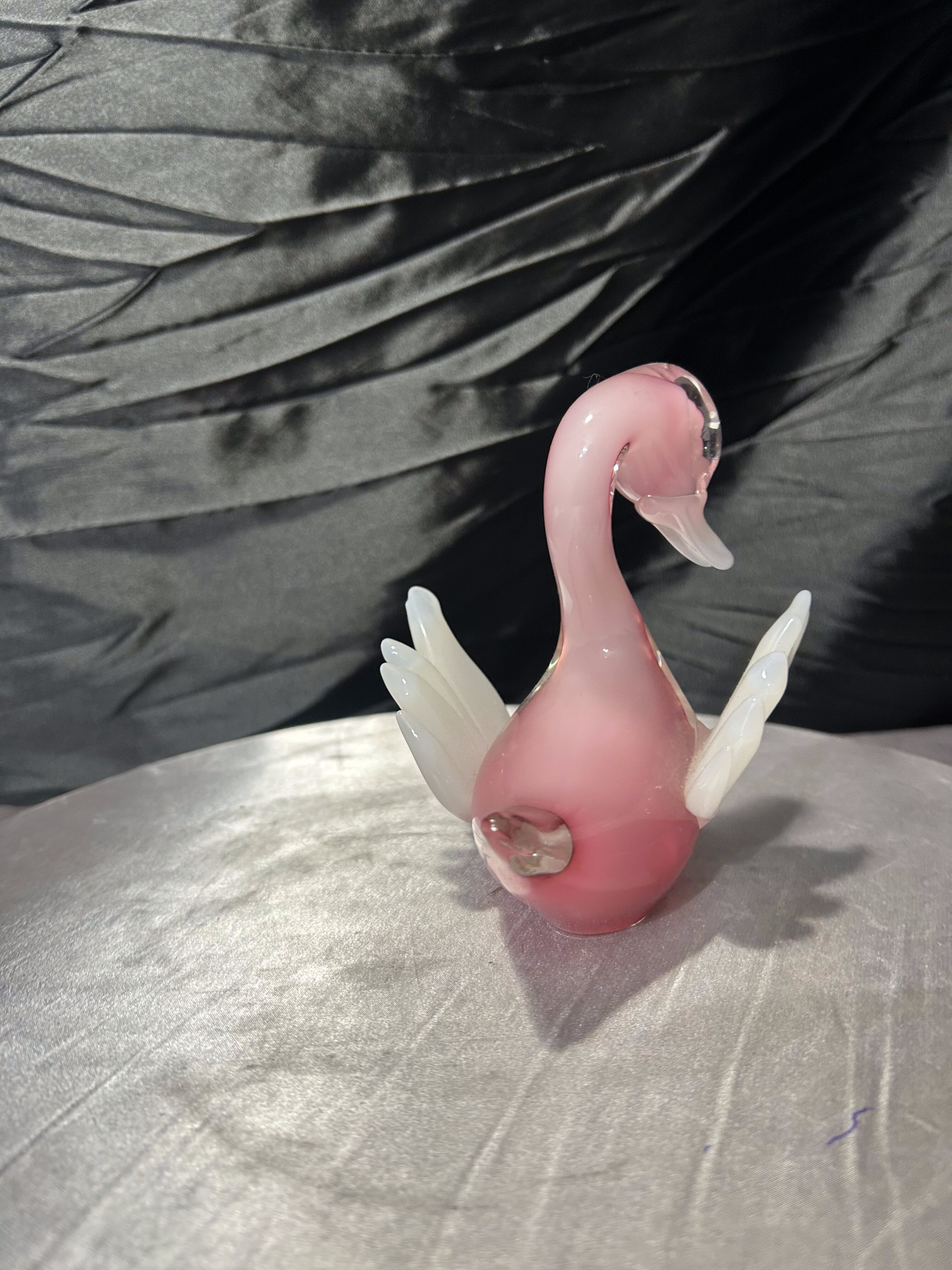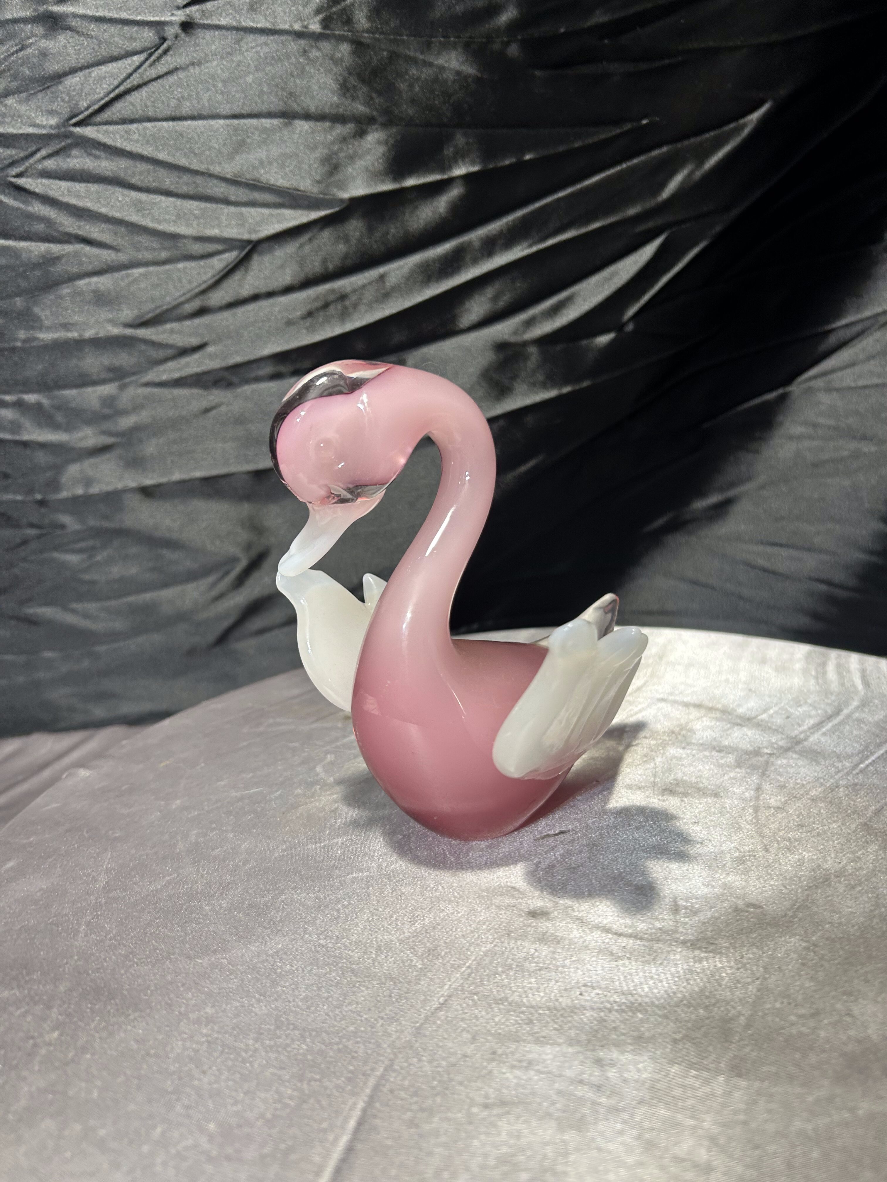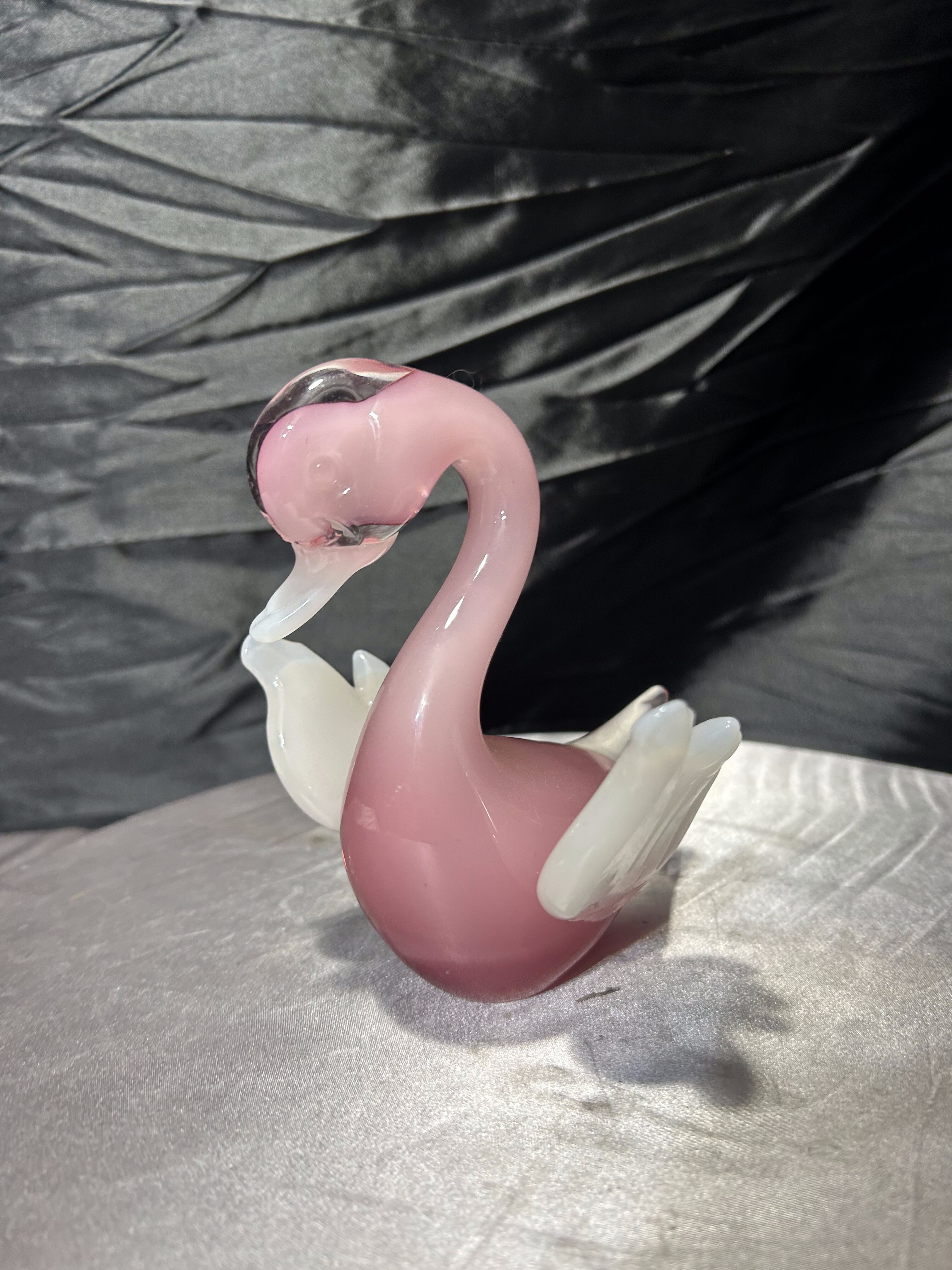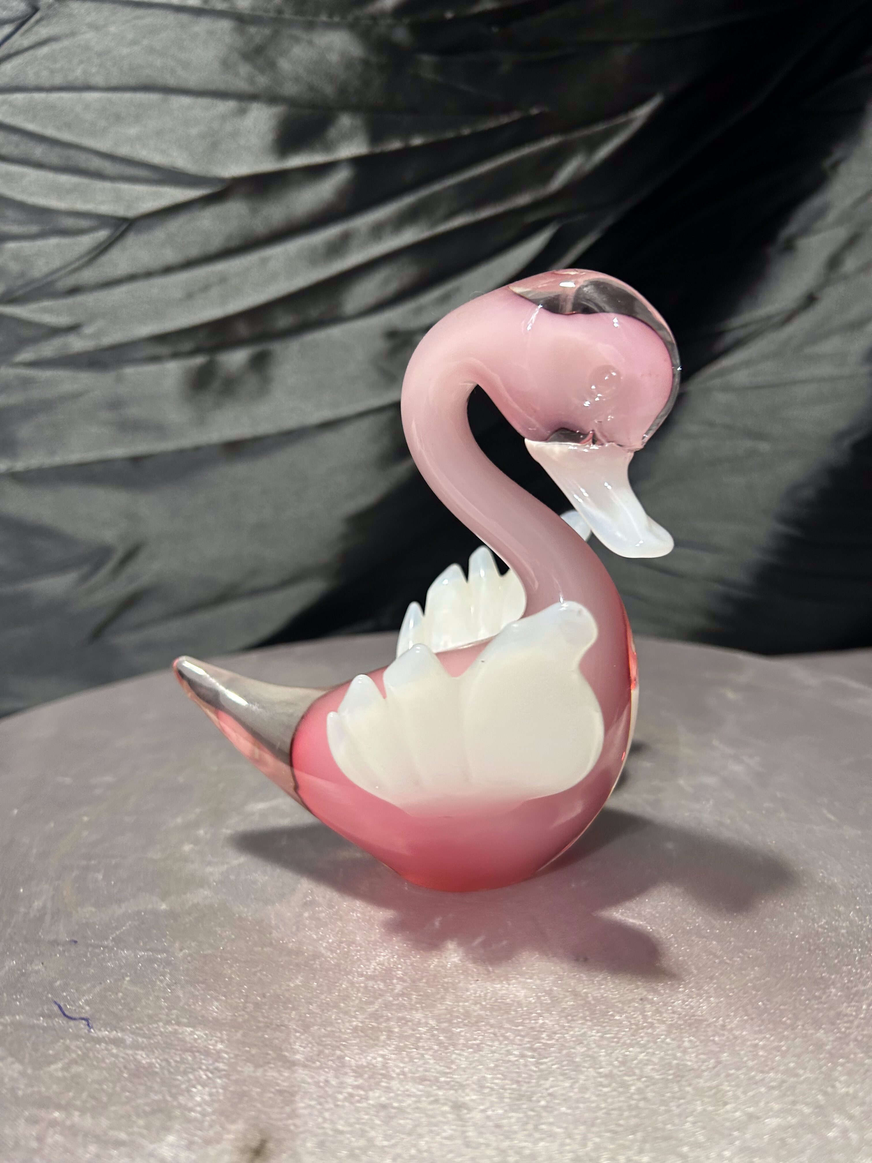 Dekoracyjna figurka szklana przedstawiająca kaczuszkę, wykonana z artystycznego szkła w subtelnym, różowym odcieniu. Forma częściowo transparentna, z kontrastującymi białymi skrzydełkami, nadaje całości lekkości i elegancji. Charakterystyczna linia oraz sposób formowania na gorąco nawiązują do szkła artystycznego w stylu Murano.