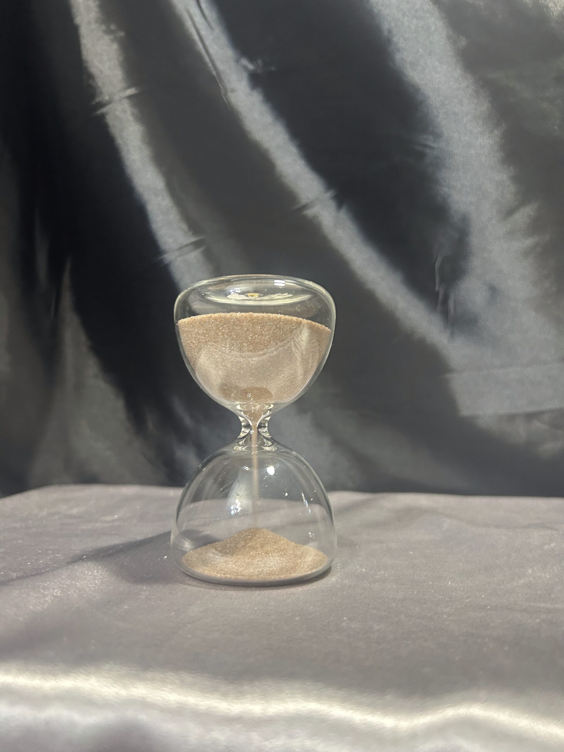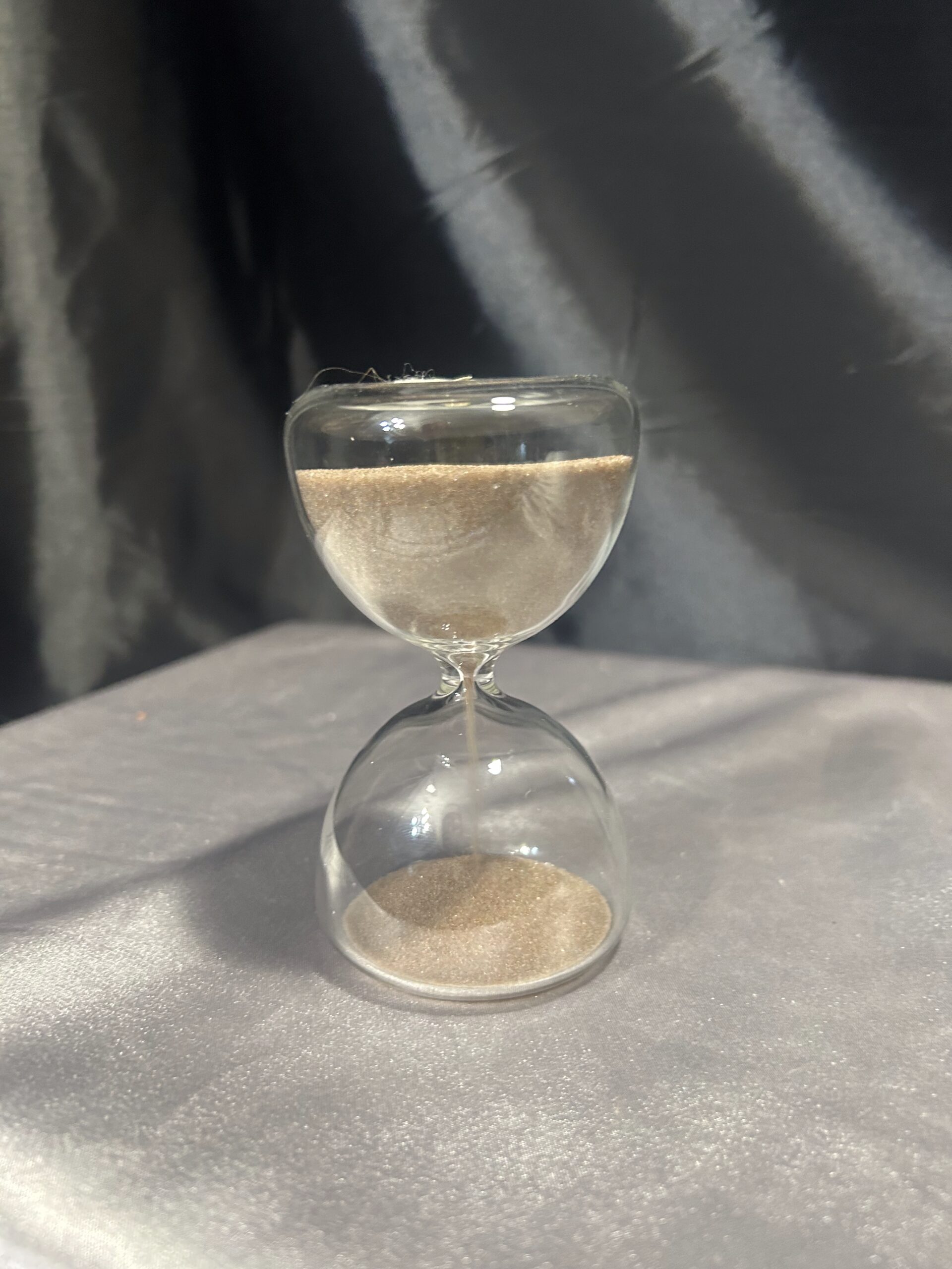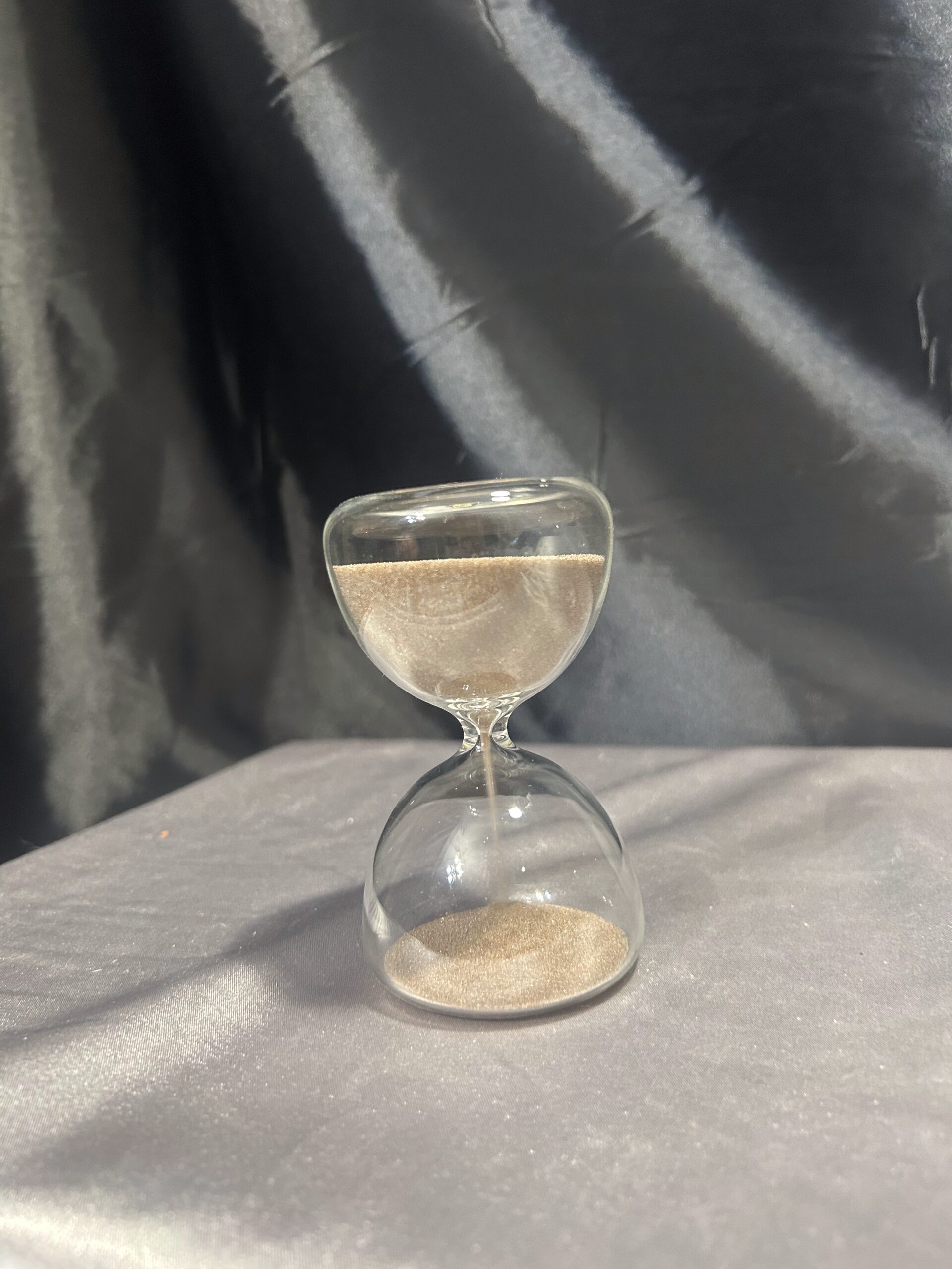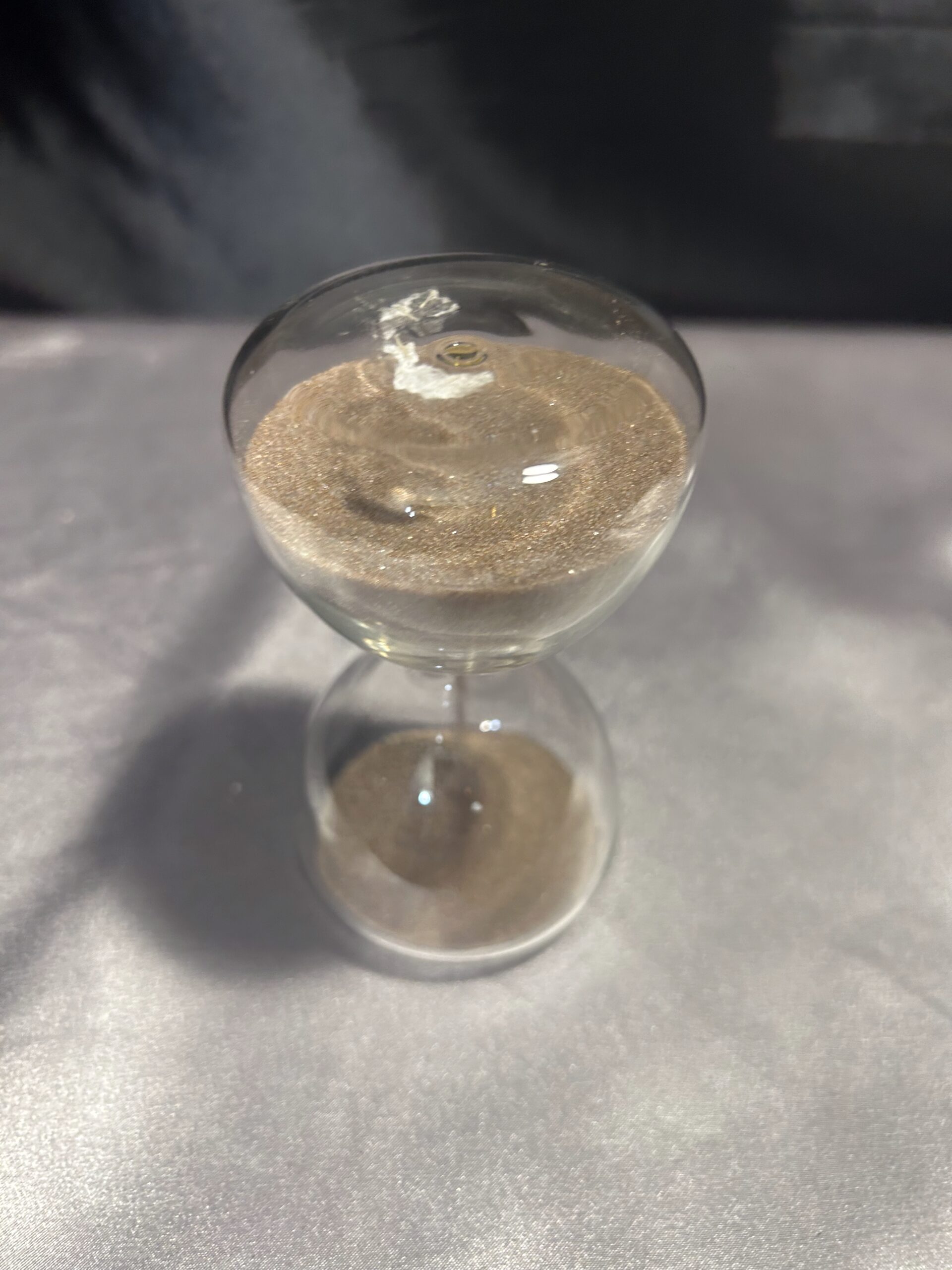 Elegancka szklana klepsydra, wypełniona mieniącym się piaskiem, który pięknie przesypuje się między komorami, tworząc hipnotyzujący efekt. Doskonała jako dekoracja biurka, salonu czy biblioteczki, a także praktyczny gadżet do odmierzania krótkiego czasu.