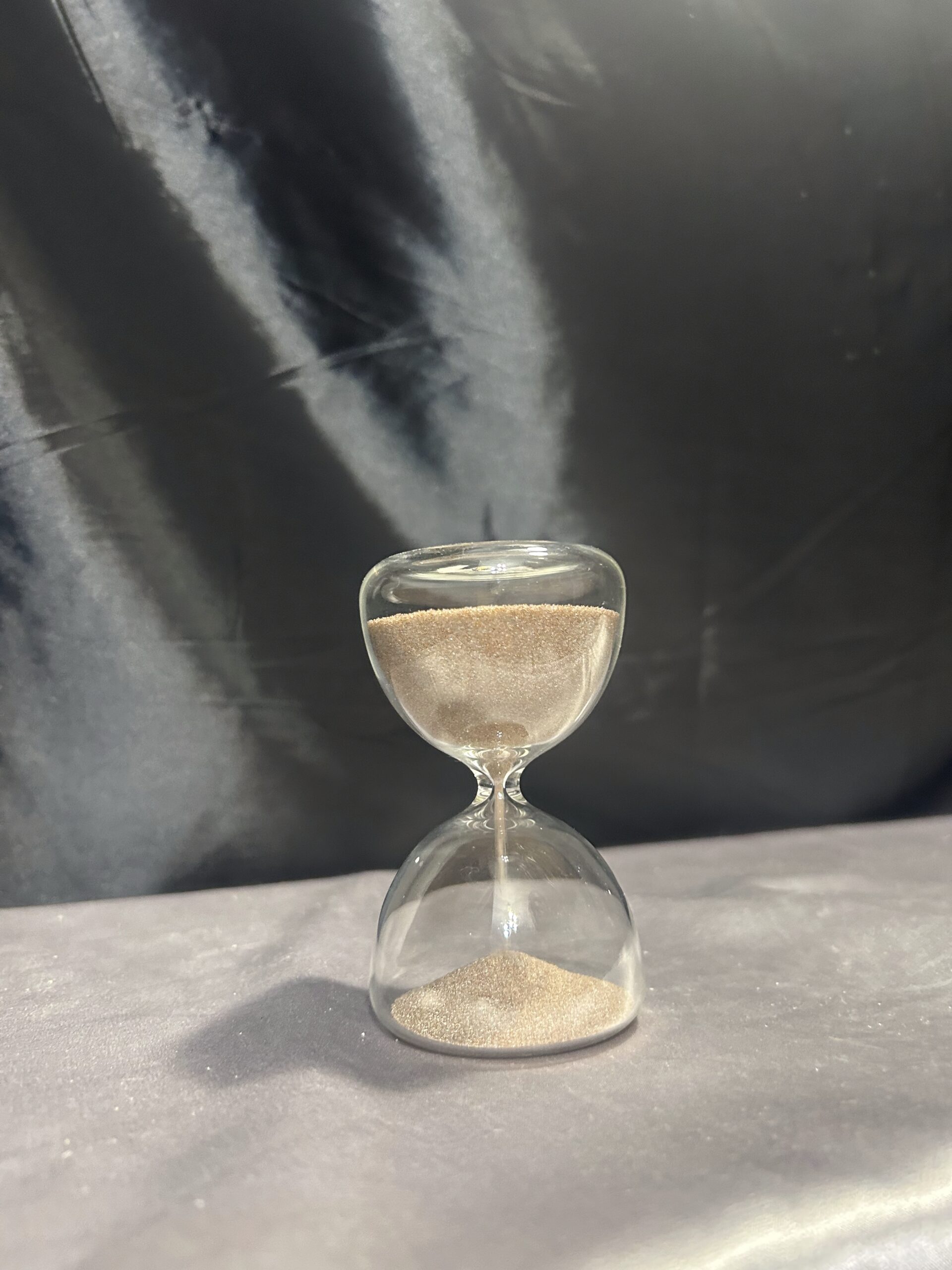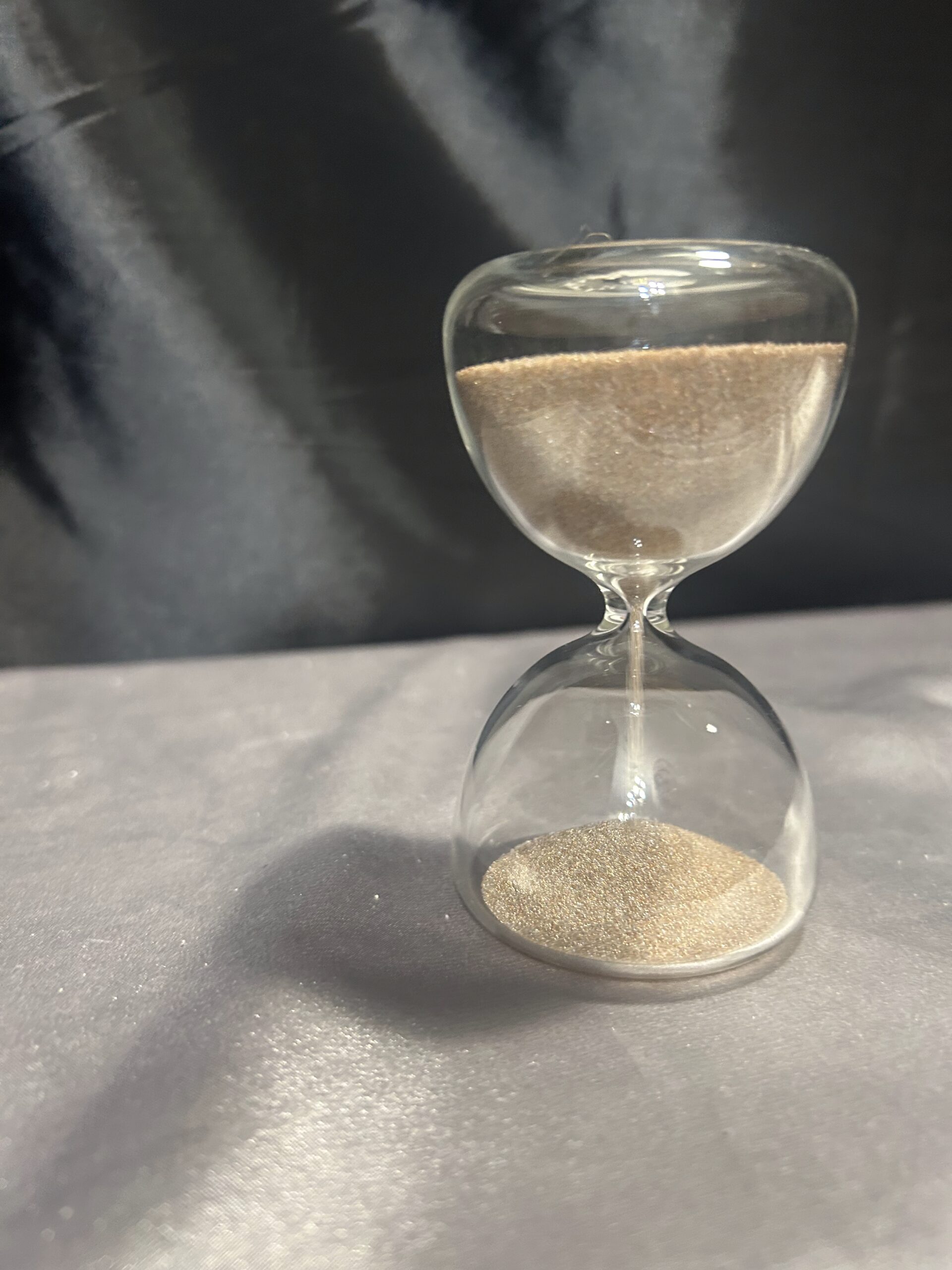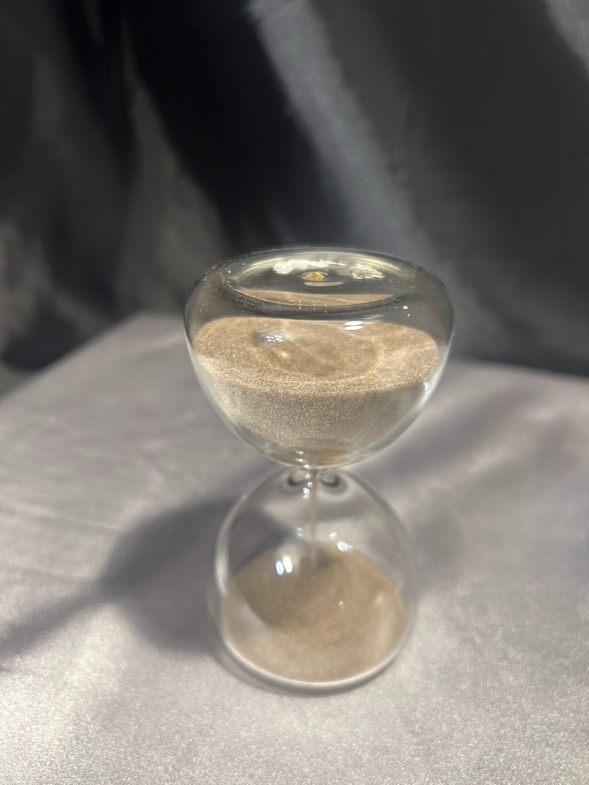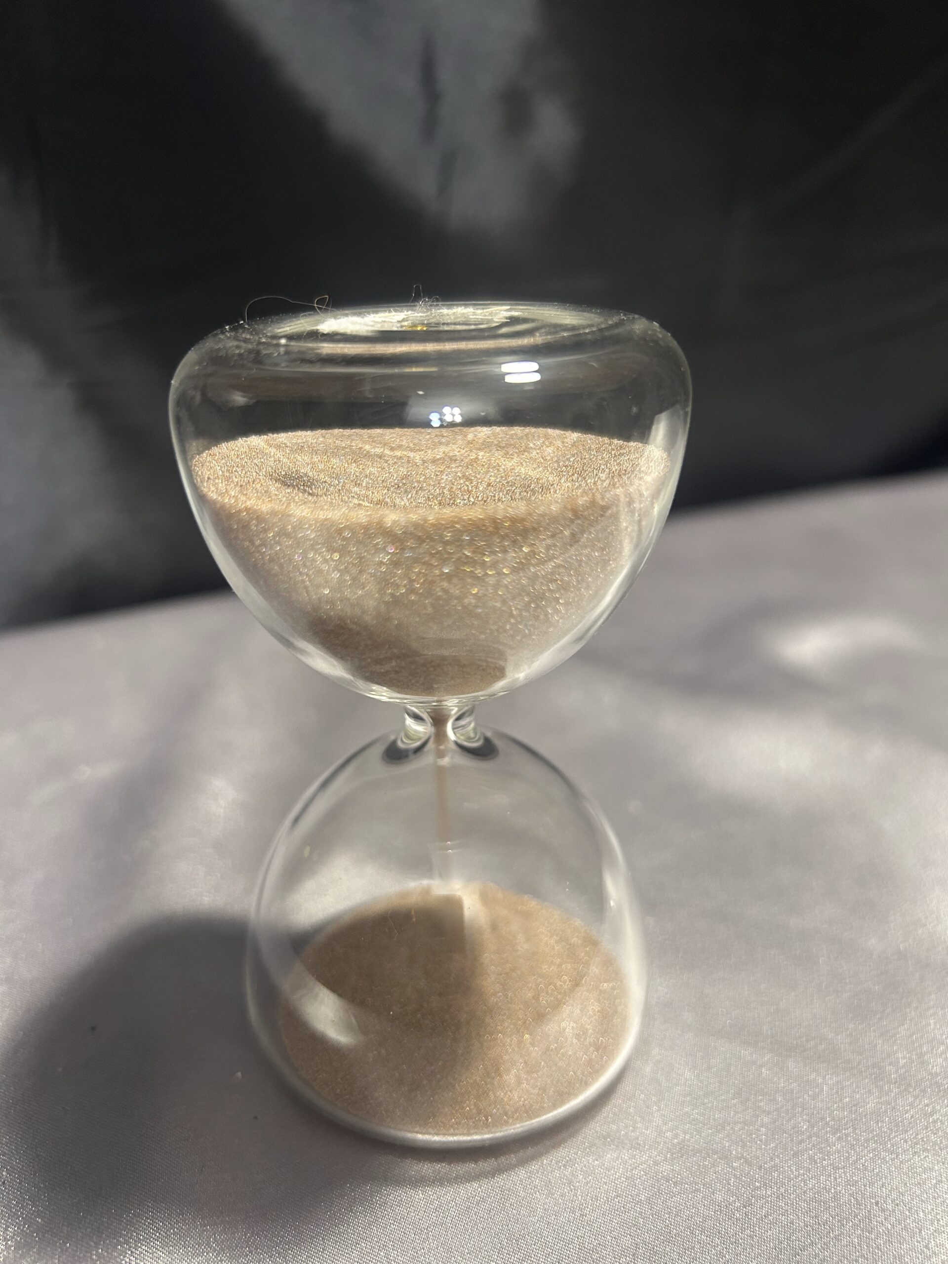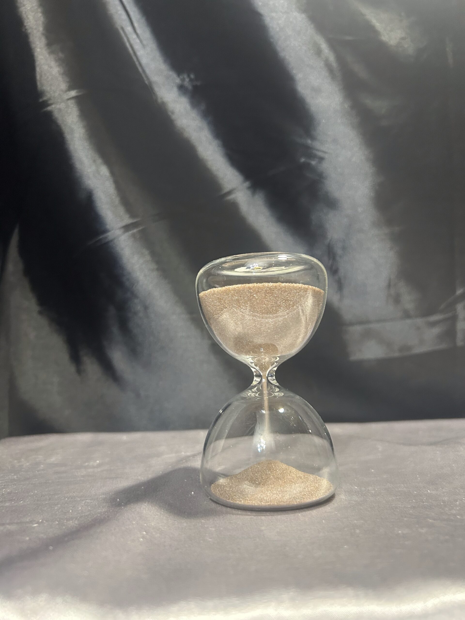 Elegancka szklana klepsydra, wypełniona mieniącym się piaskiem, który pięknie przesypuje się między komorami, tworząc hipnotyzujący efekt. Doskonała jako dekoracja biurka, salonu czy biblioteczki, a także praktyczny gadżet do odmierzania krótkiego czasu.