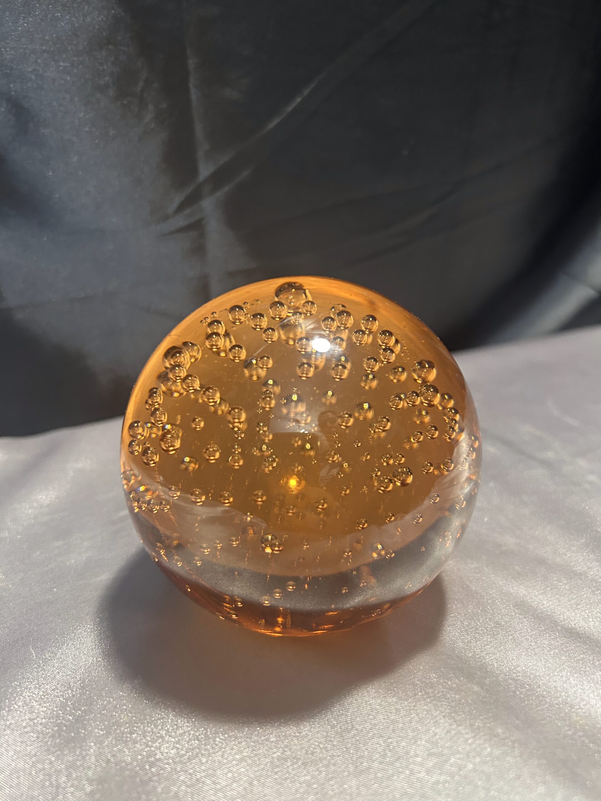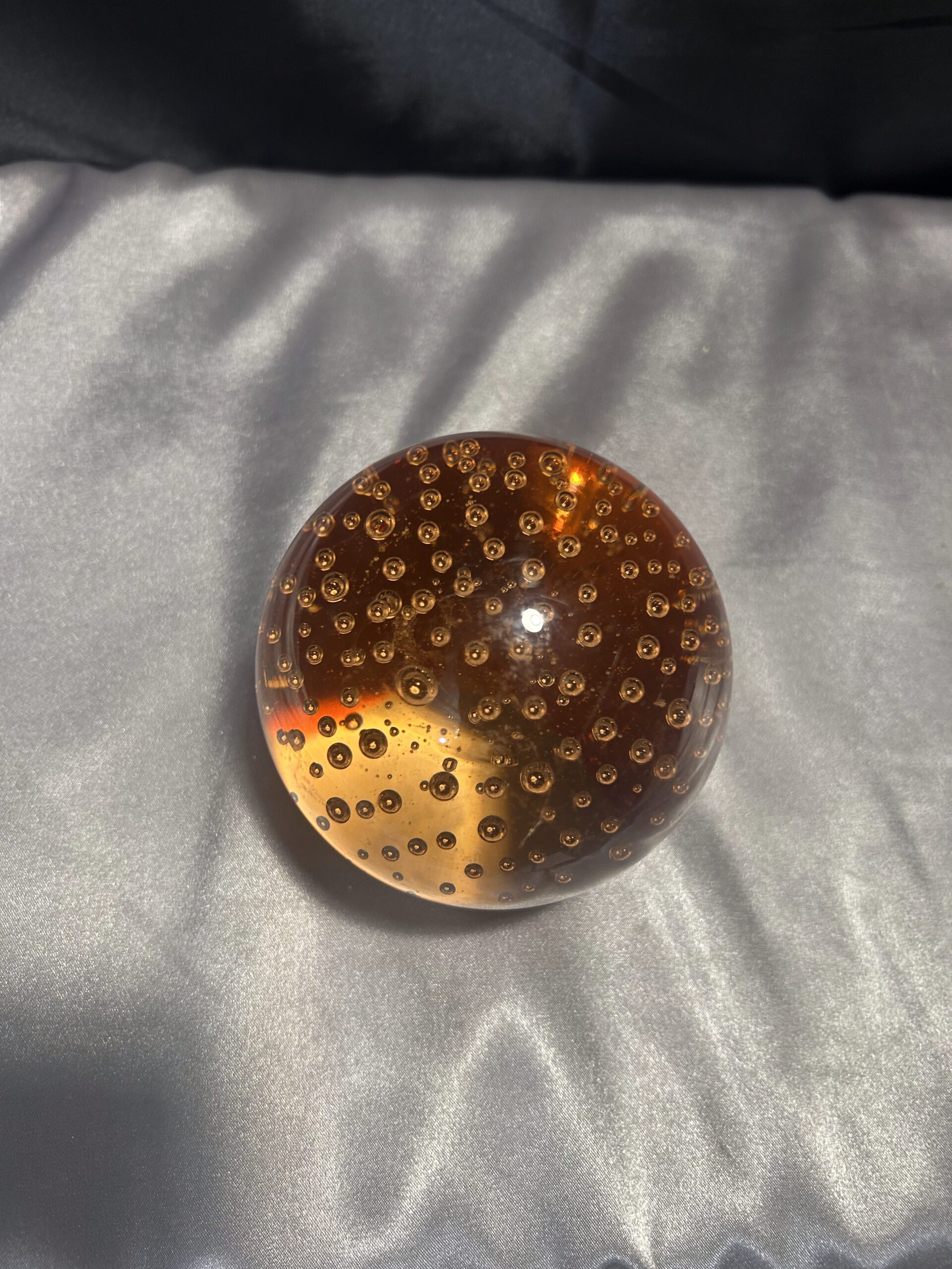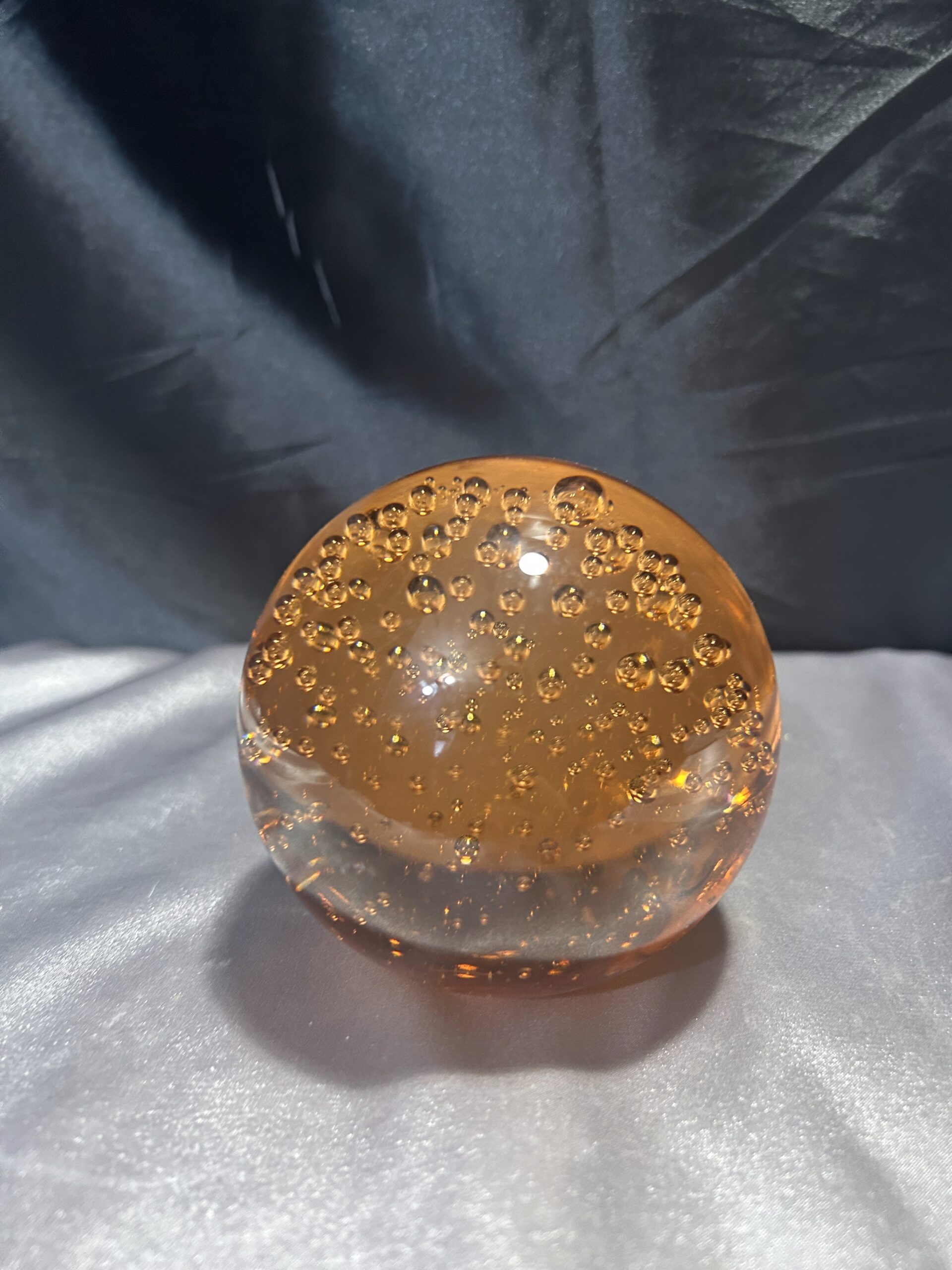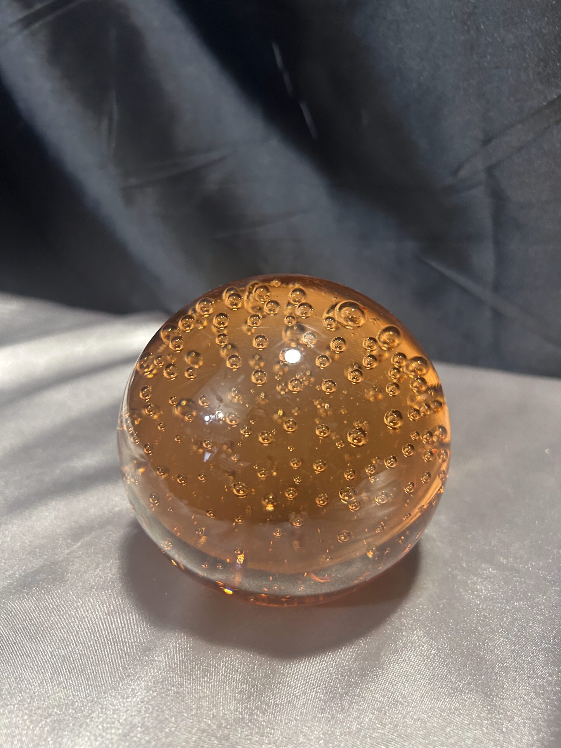 Prezentujemy elegancki i unikalny szklany przycisk do papieru, który zachwyca swoim miodowym odcieniem i niezwykłym trójwymiarowym efektem. Wewnątrz kuli zostały zatopione pęcherzyki powietrza, tworząc fascynującą i hipnotyzującą strukturę. Dzięki perfekcyjnie gładkiej powierzchni i wysokiej jakości szkła, przedmiot ten doskonale odbija światło, nadając wnętrzu subtelnej elegancji.
