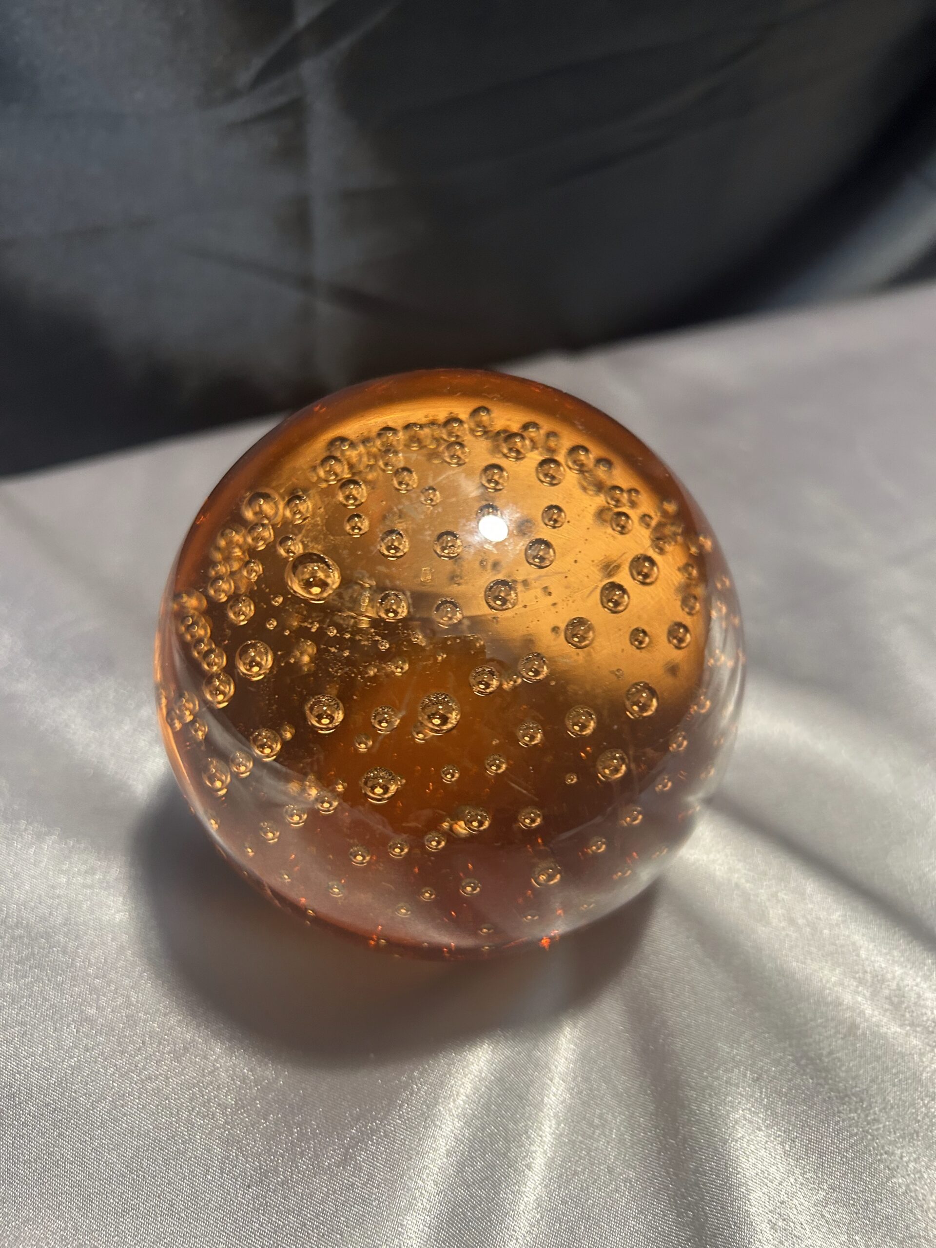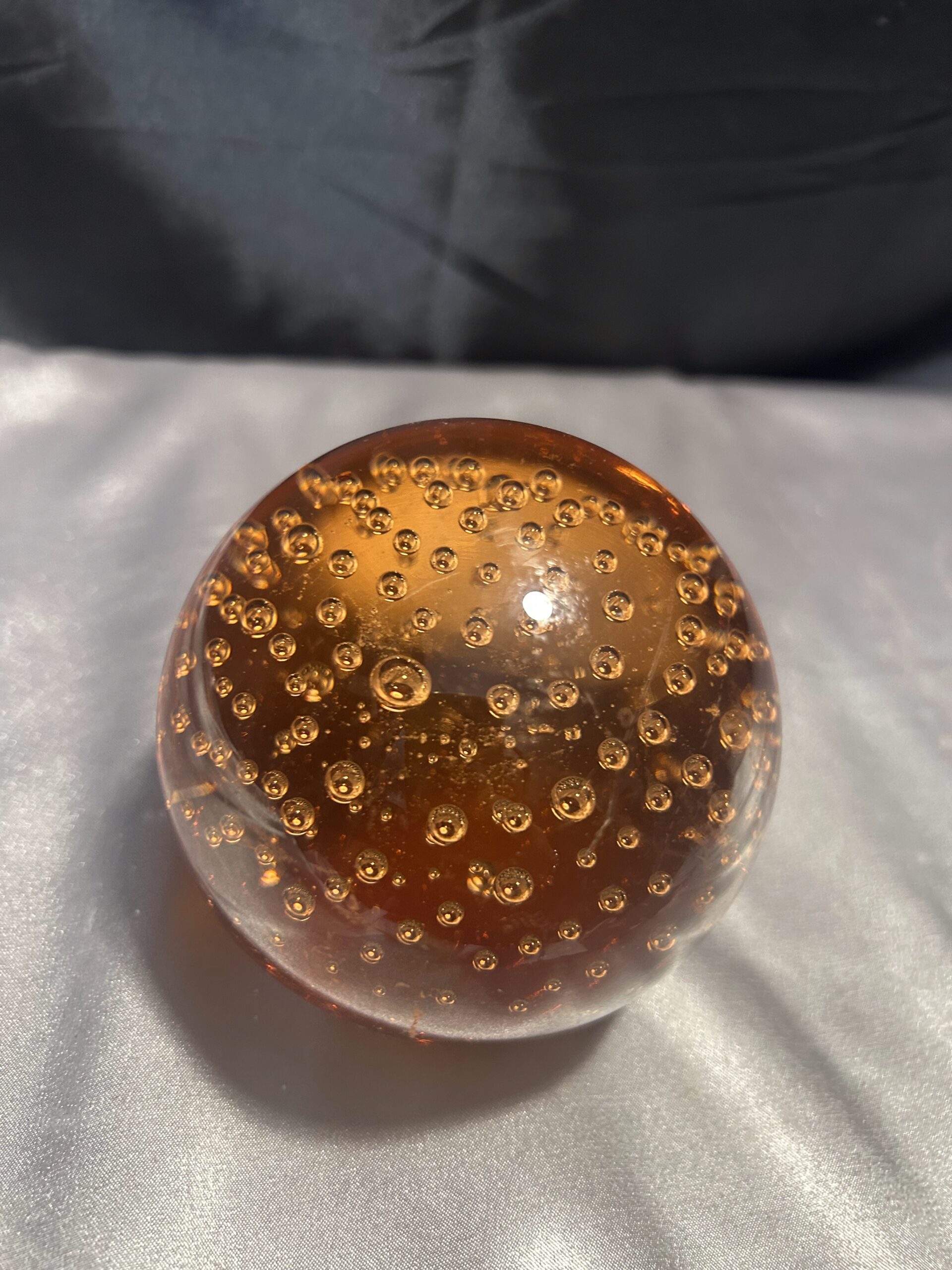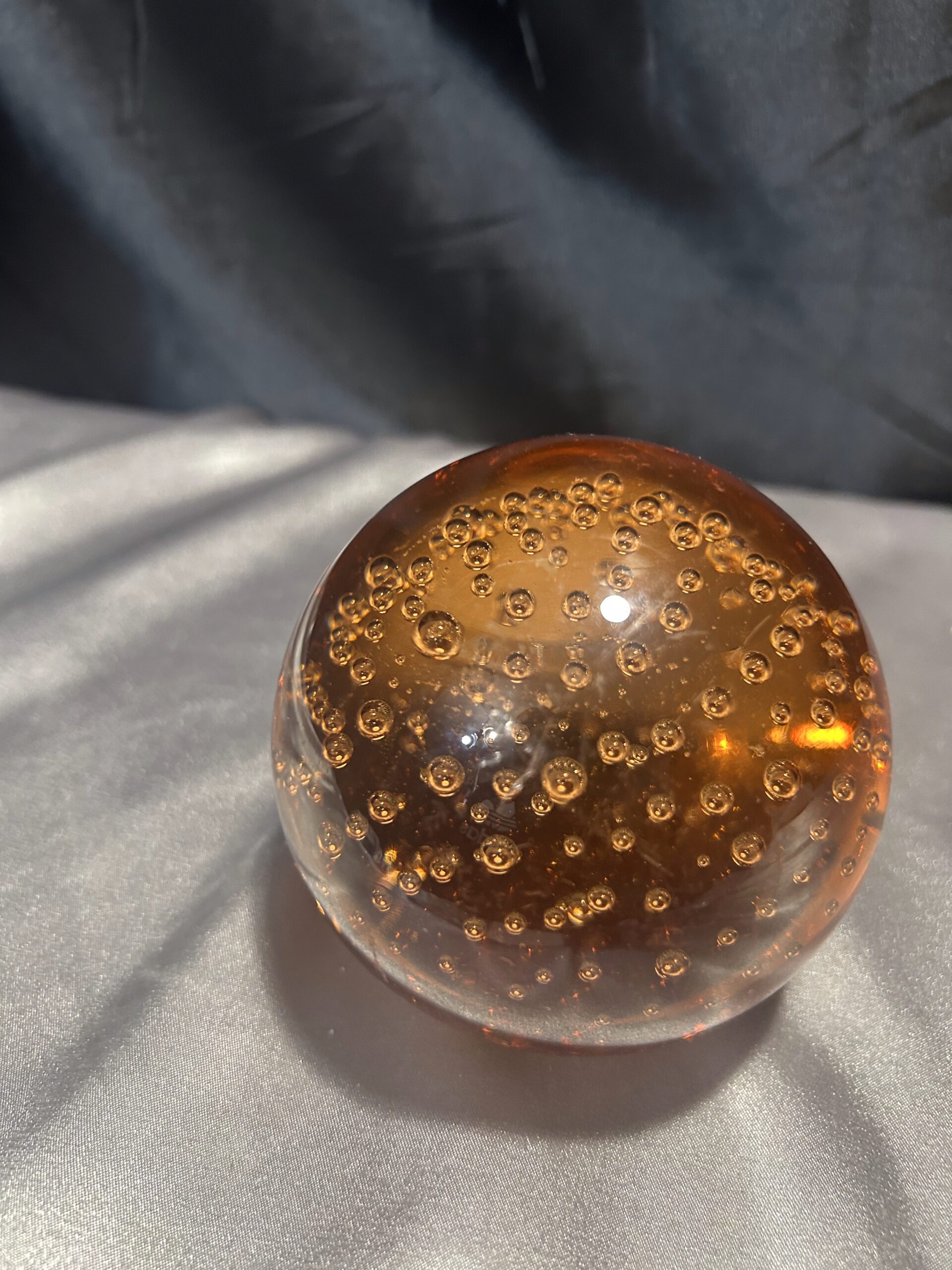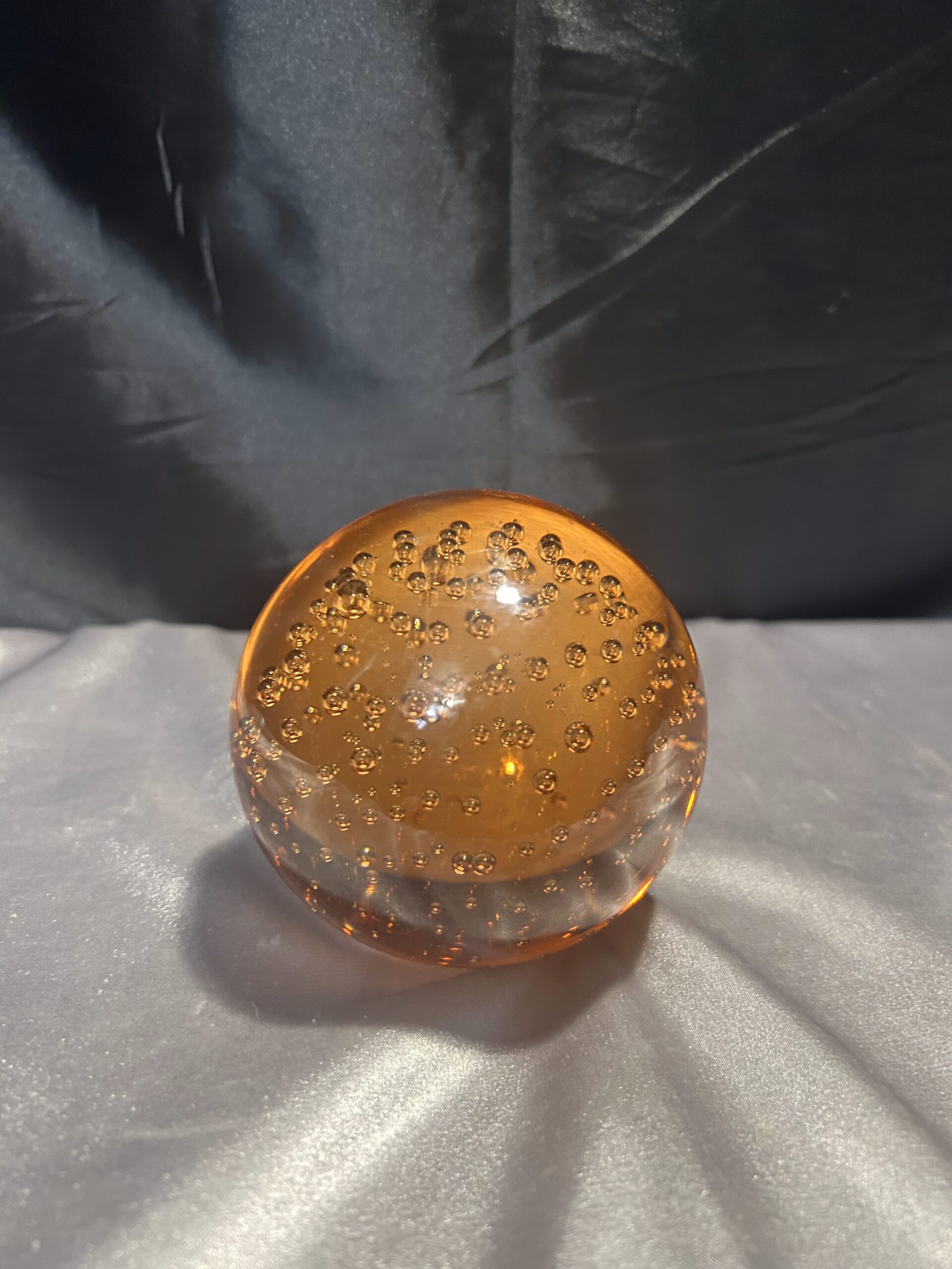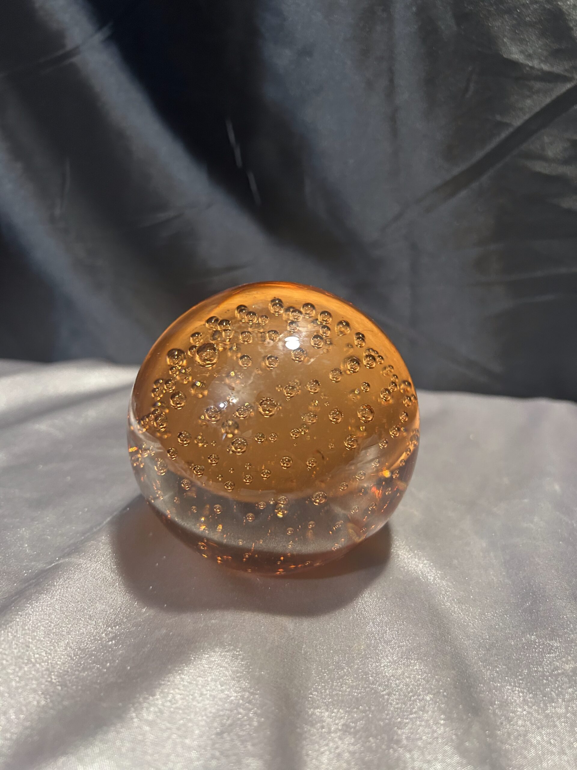 Prezentujemy elegancki i unikalny szklany przycisk do papieru, który zachwyca swoim miodowym odcieniem i niezwykłym trójwymiarowym efektem. Wewnątrz kuli zostały zatopione pęcherzyki powietrza, tworząc fascynującą i hipnotyzującą strukturę. Dzięki perfekcyjnie gładkiej powierzchni i wysokiej jakości szkła, przedmiot ten doskonale odbija światło, nadając wnętrzu subtelnej elegancji.