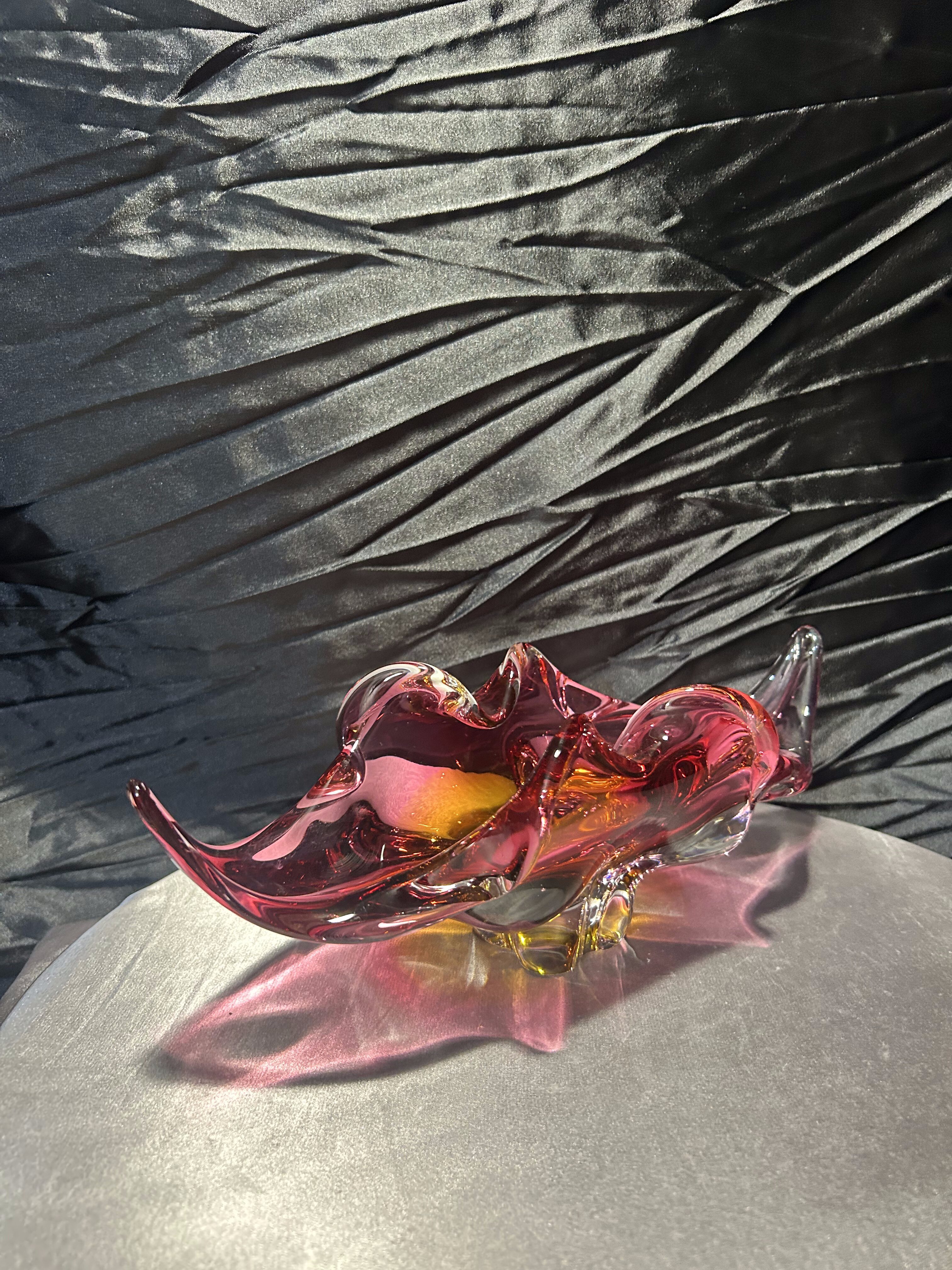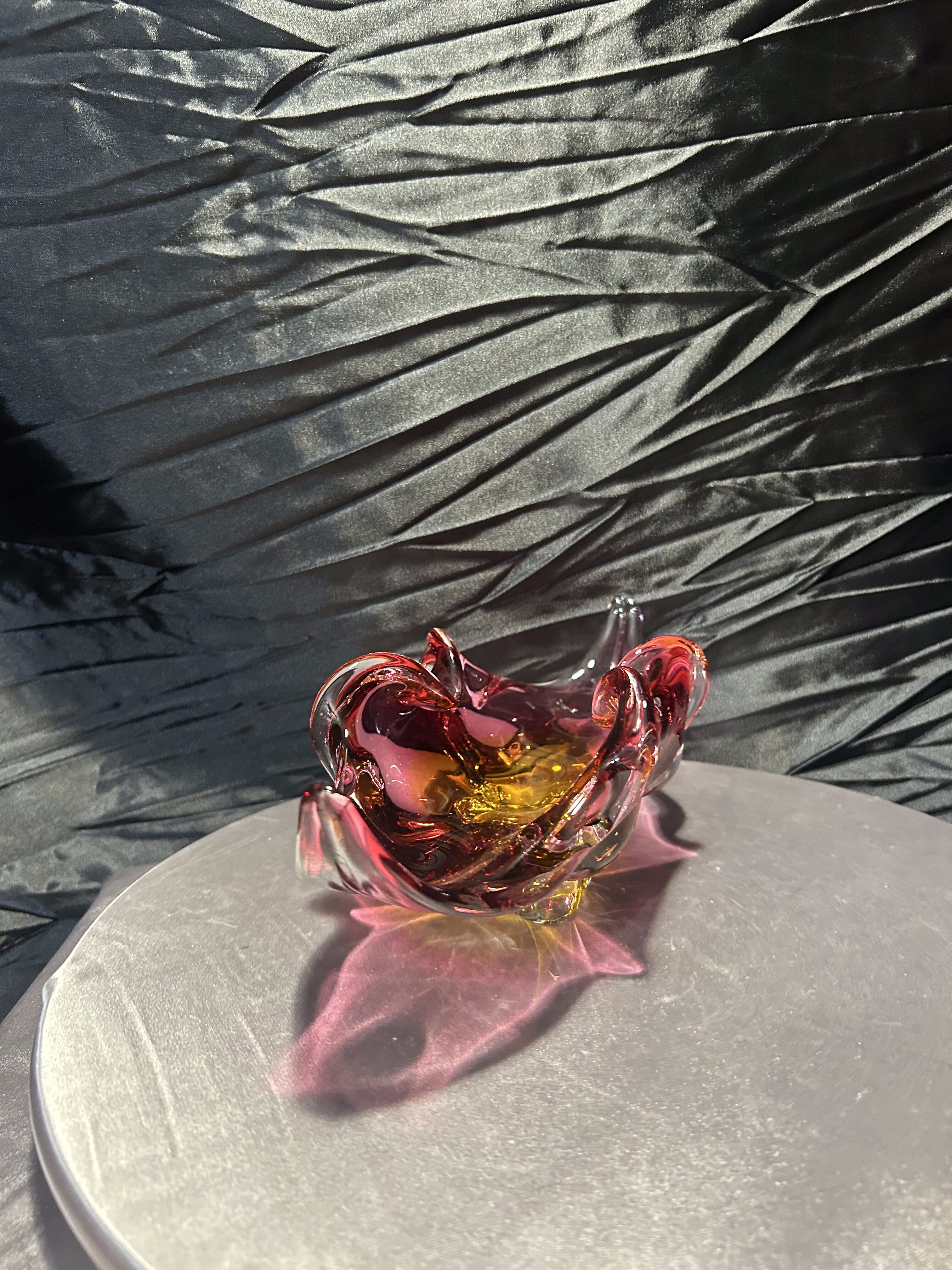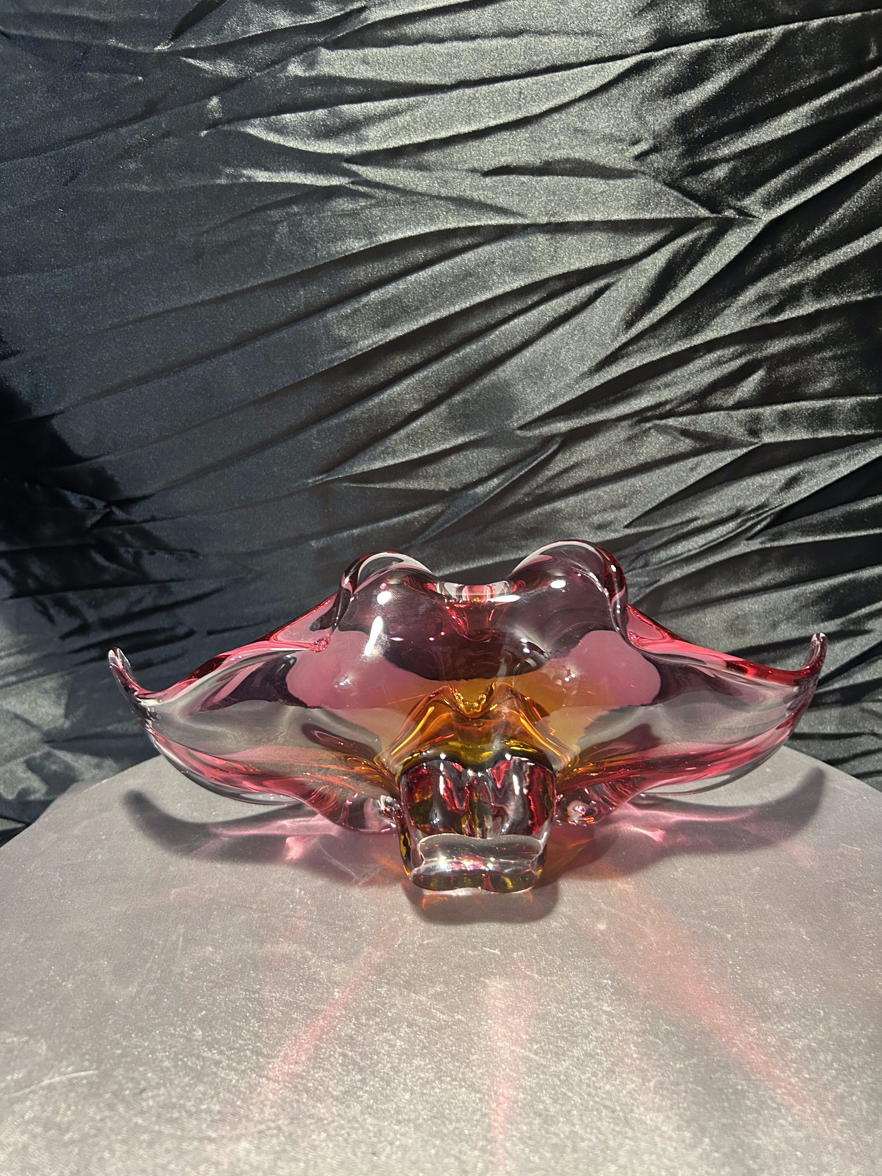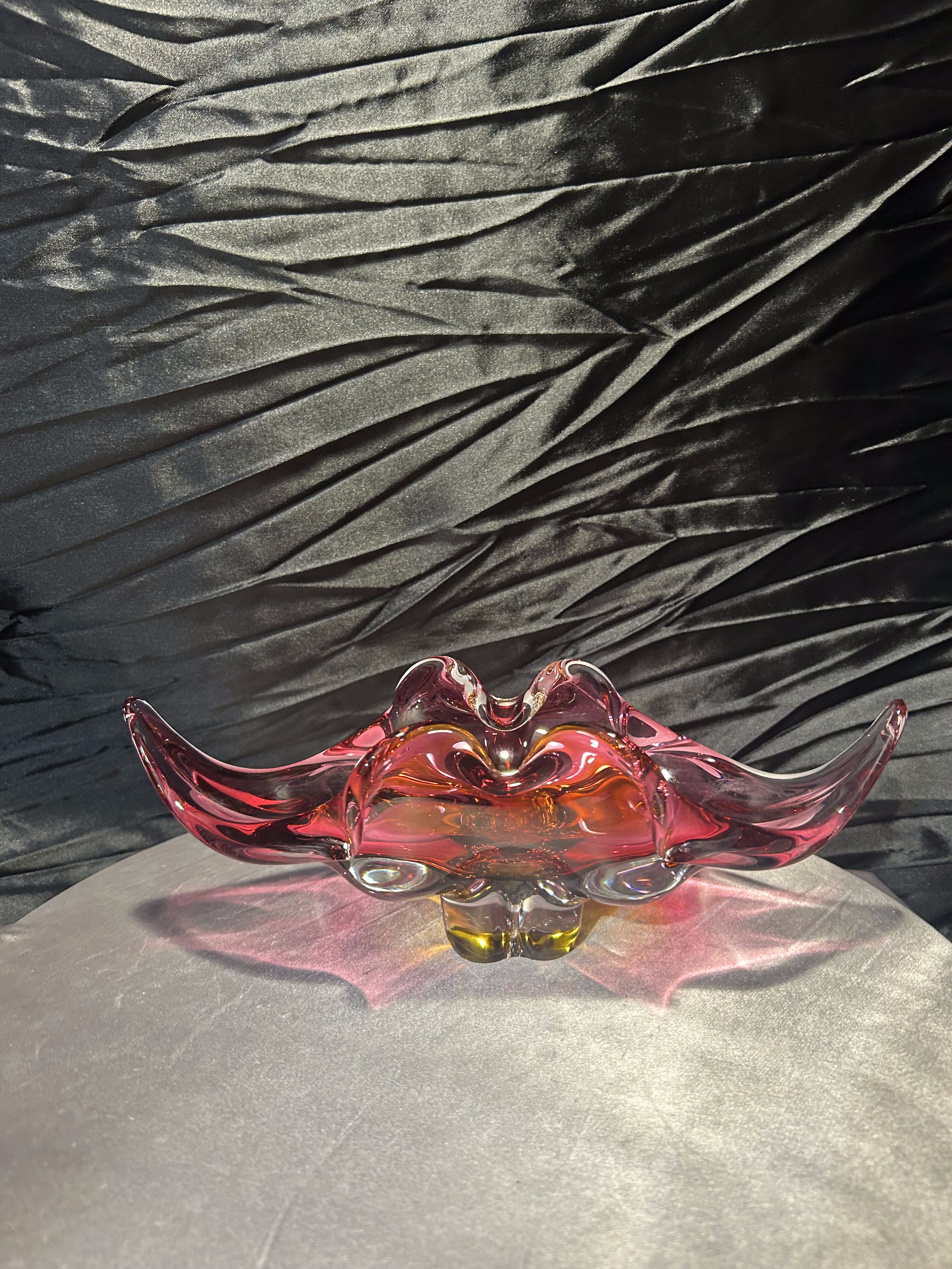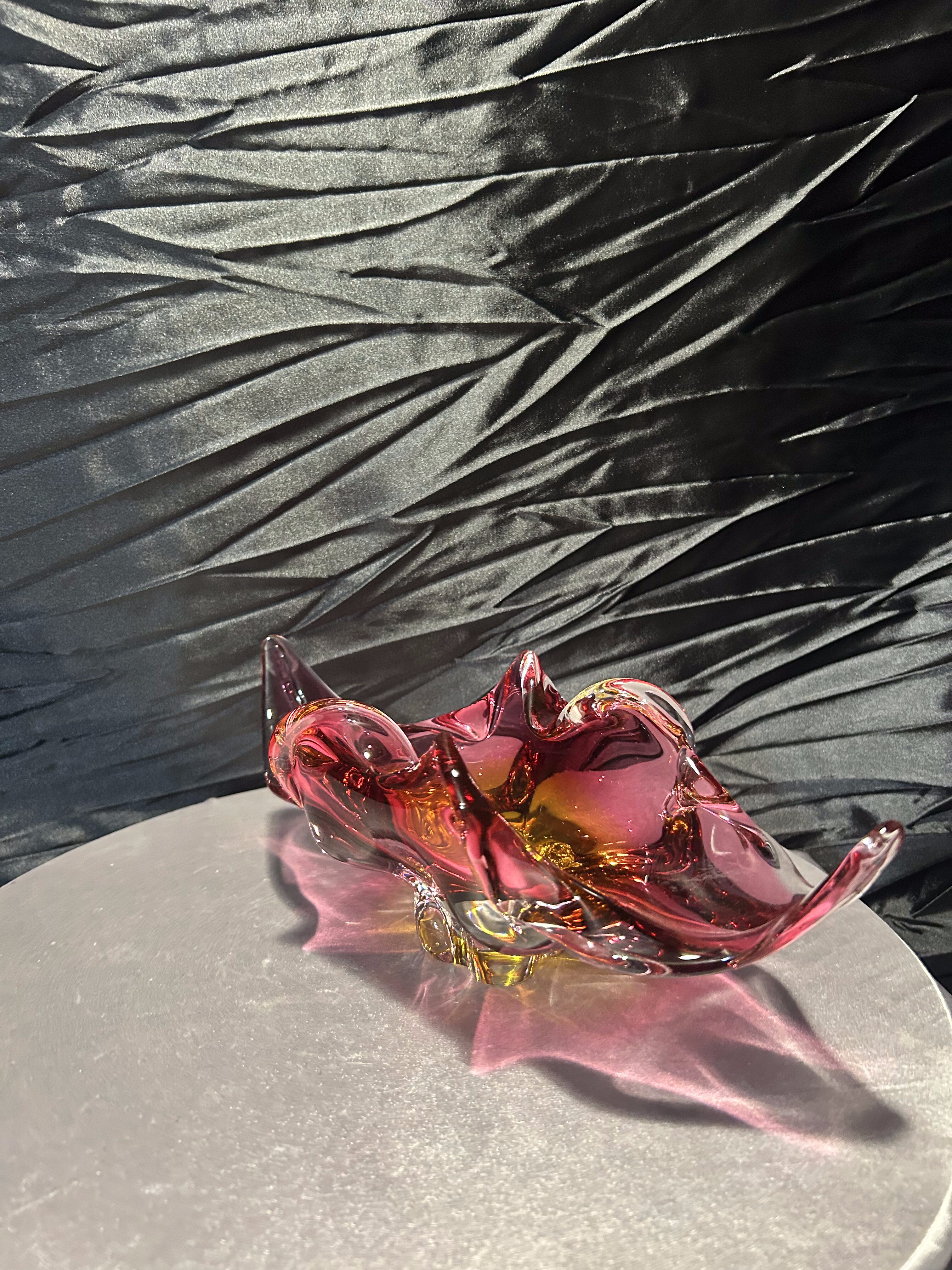 Wyjątkowa szklana misa artystyczna z czeskiej huty szkła Bohemia, zaprojektowana przez uznanego projektanta Josefa Hospodkę – jednego z czołowych twórców szkła artystycznego w latach 50. i 60. XX wieku. Misa wykonana jest w technice szkła dwukolorowego, łączącego barwy czerwieni i bursztynu, co w połączeniu z falującą formą nadaje jej niezwykłą lekkość i dynamikę. Przykład sztuki użytkowej w najlepszym wydaniu, stanowiący esencję stylu charakterystycznego dla czechosłowackiej szkoły szkła artystycznego. Idealna zarówno jako element dekoracyjny, jak i kolekcjonerski.