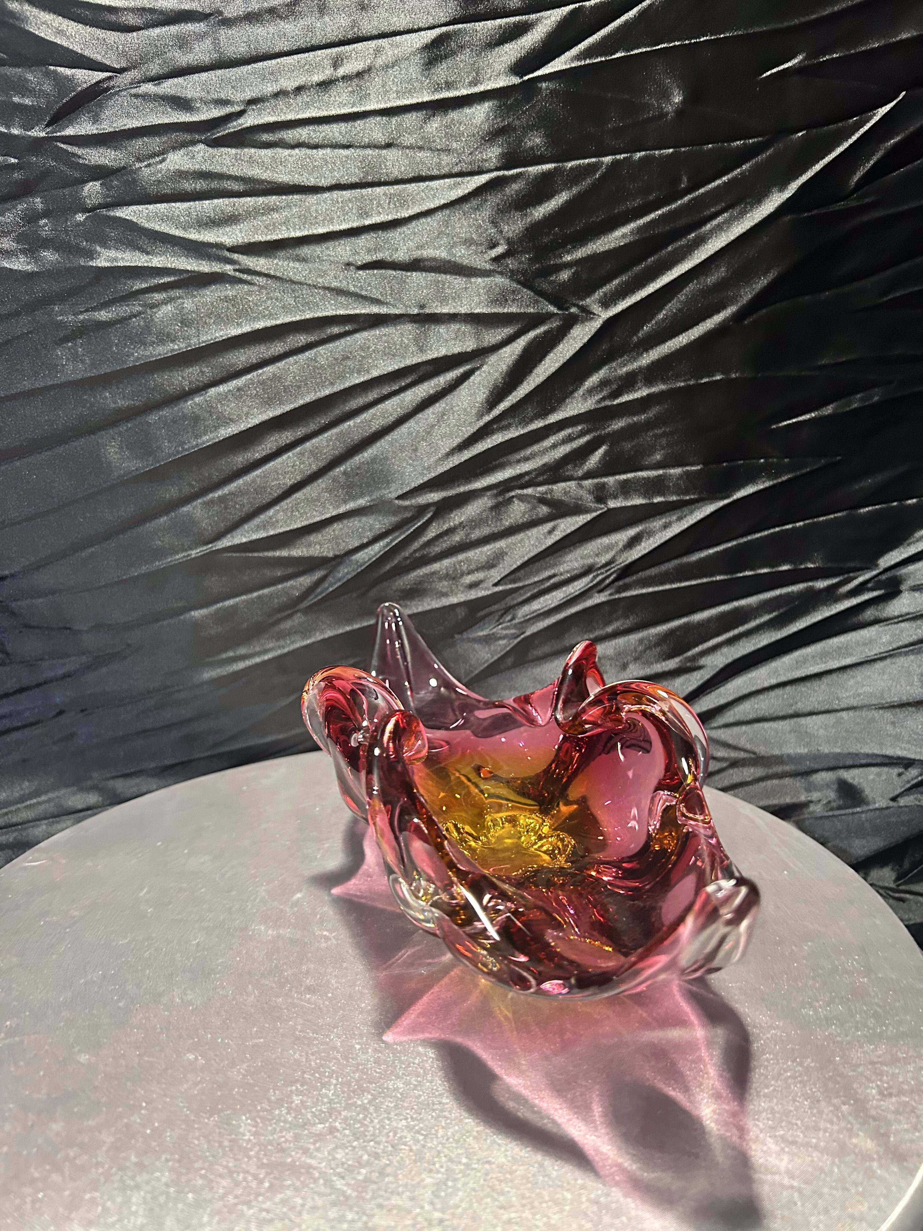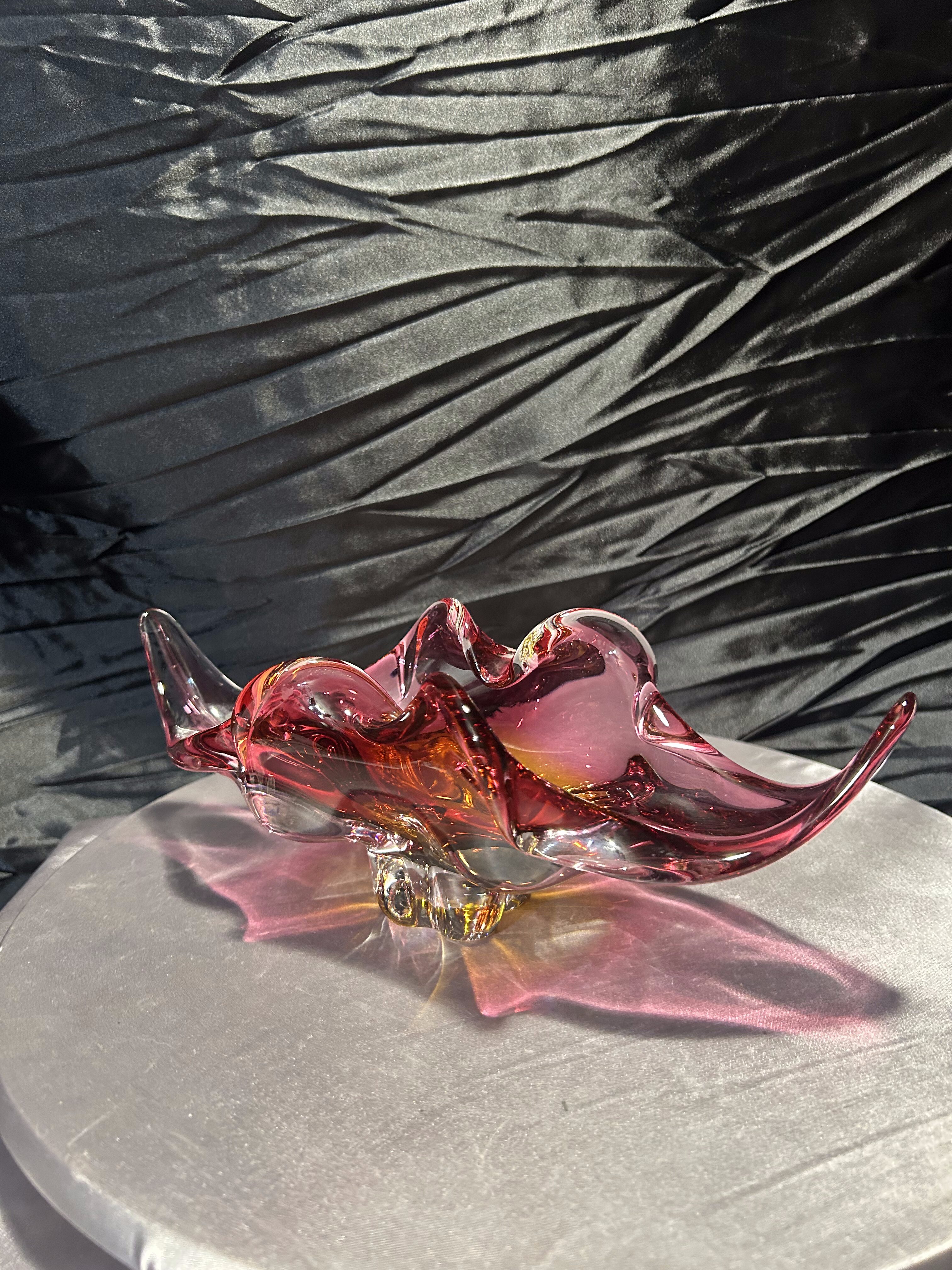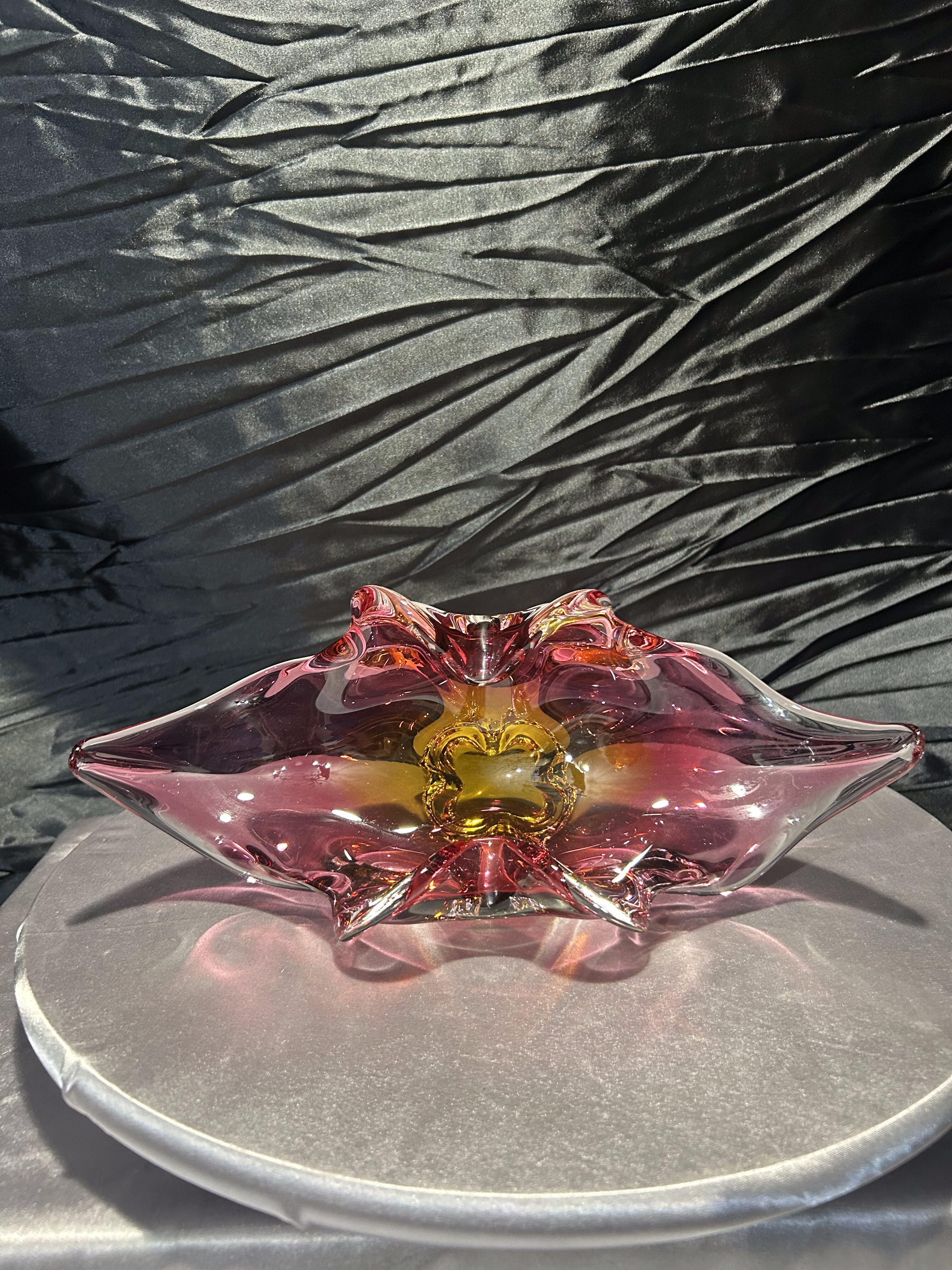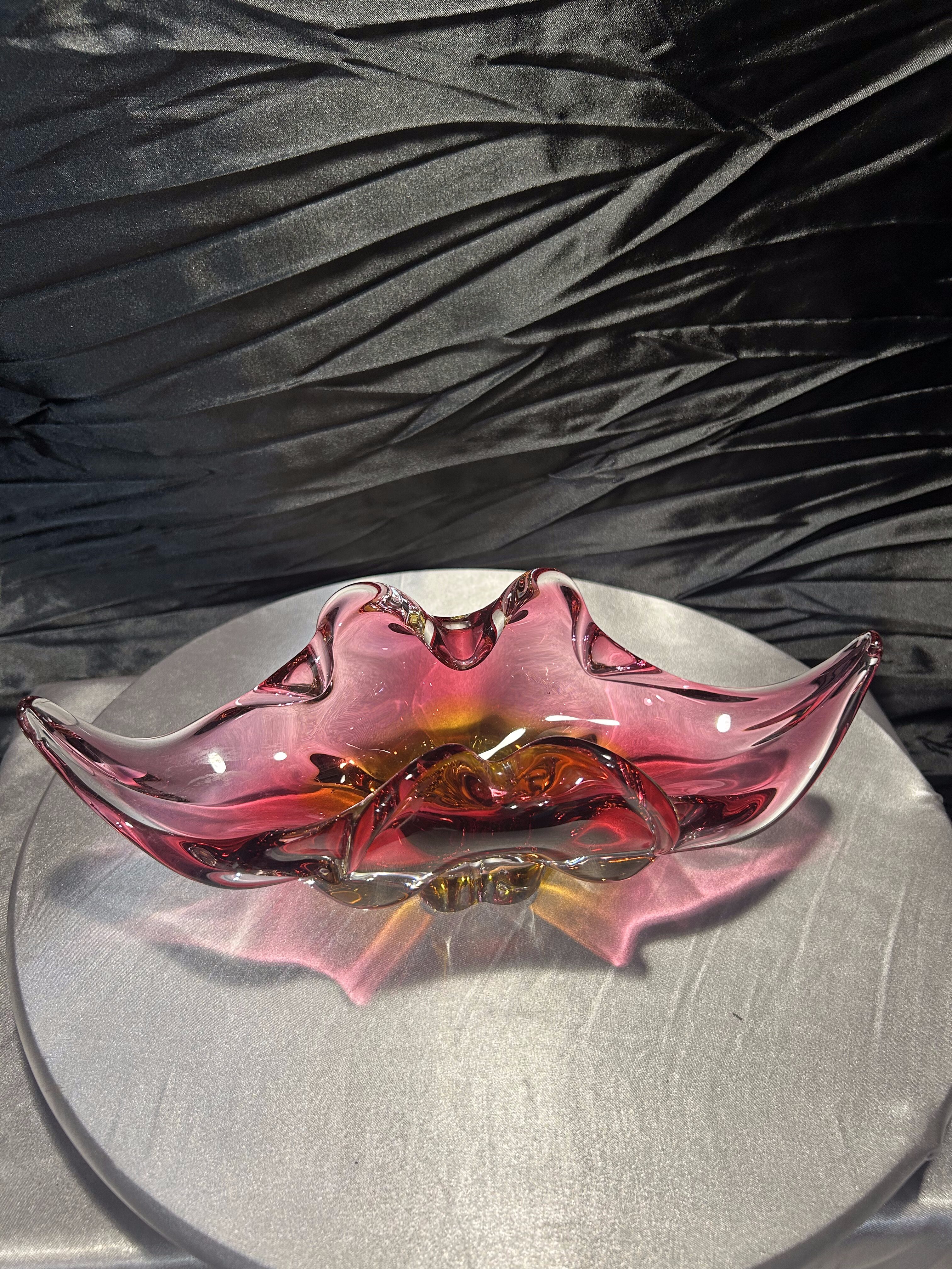 Wyjątkowa szklana misa artystyczna z czeskiej huty szkła Bohemia, zaprojektowana przez uznanego projektanta Josefa Hospodkę – jednego z czołowych twórców szkła artystycznego w latach 50. i 60. XX wieku. Misa wykonana jest w technice szkła dwukolorowego, łączącego barwy czerwieni i bursztynu, co w połączeniu z falującą formą nadaje jej niezwykłą lekkość i dynamikę. Przykład sztuki użytkowej w najlepszym wydaniu, stanowiący esencję stylu charakterystycznego dla czechosłowackiej szkoły szkła artystycznego. Idealna zarówno jako element dekoracyjny, jak i kolekcjonerski.