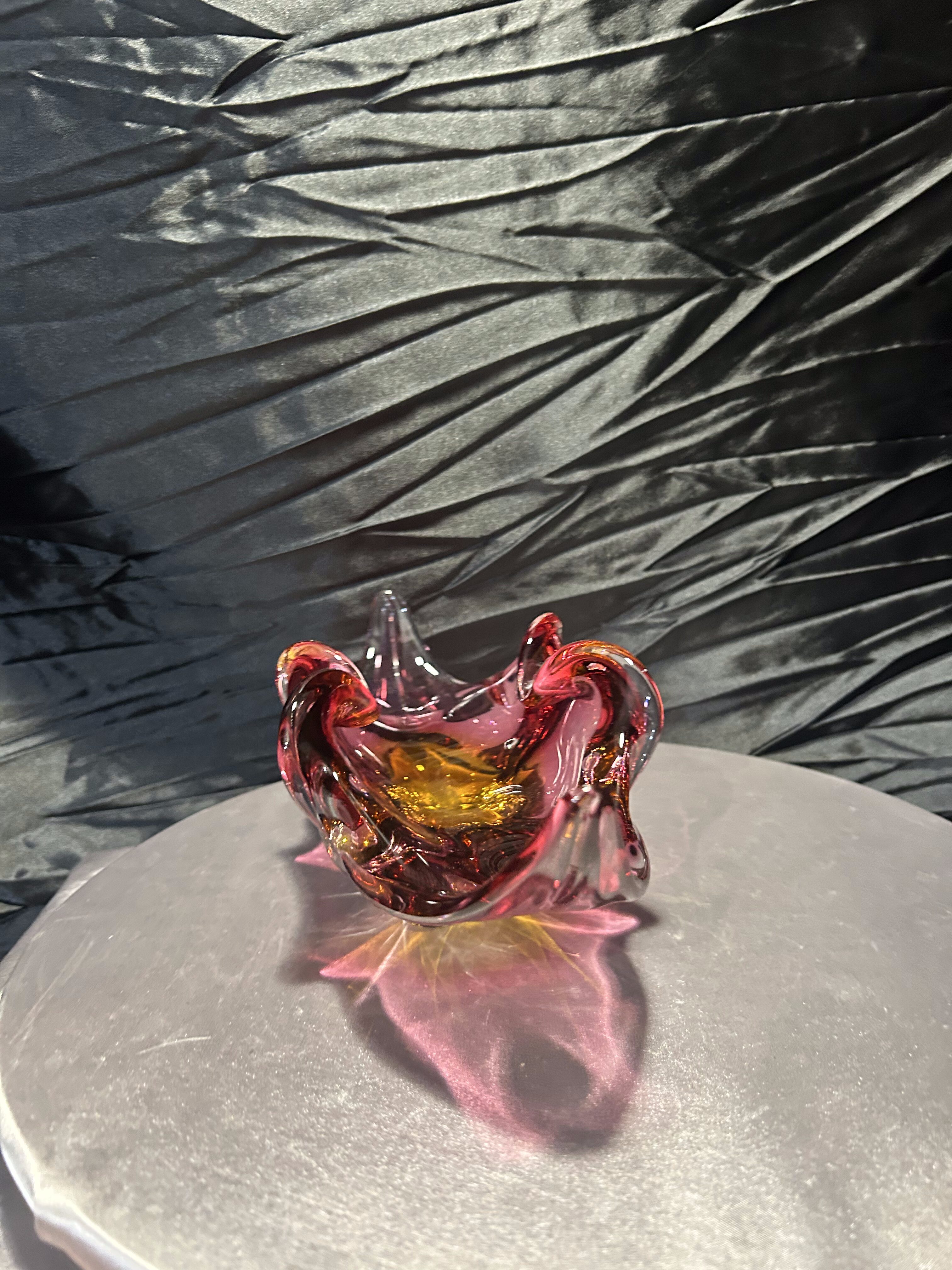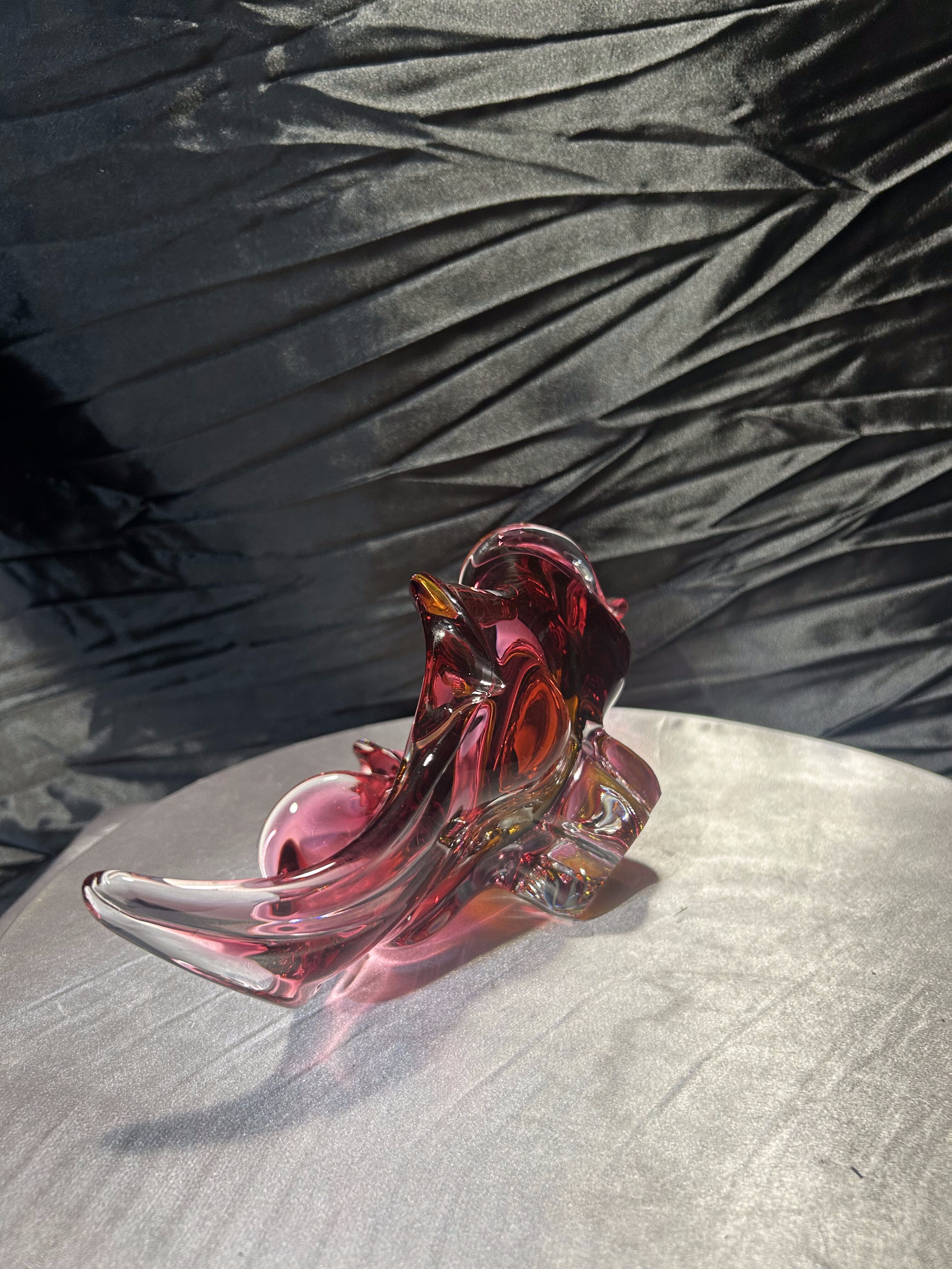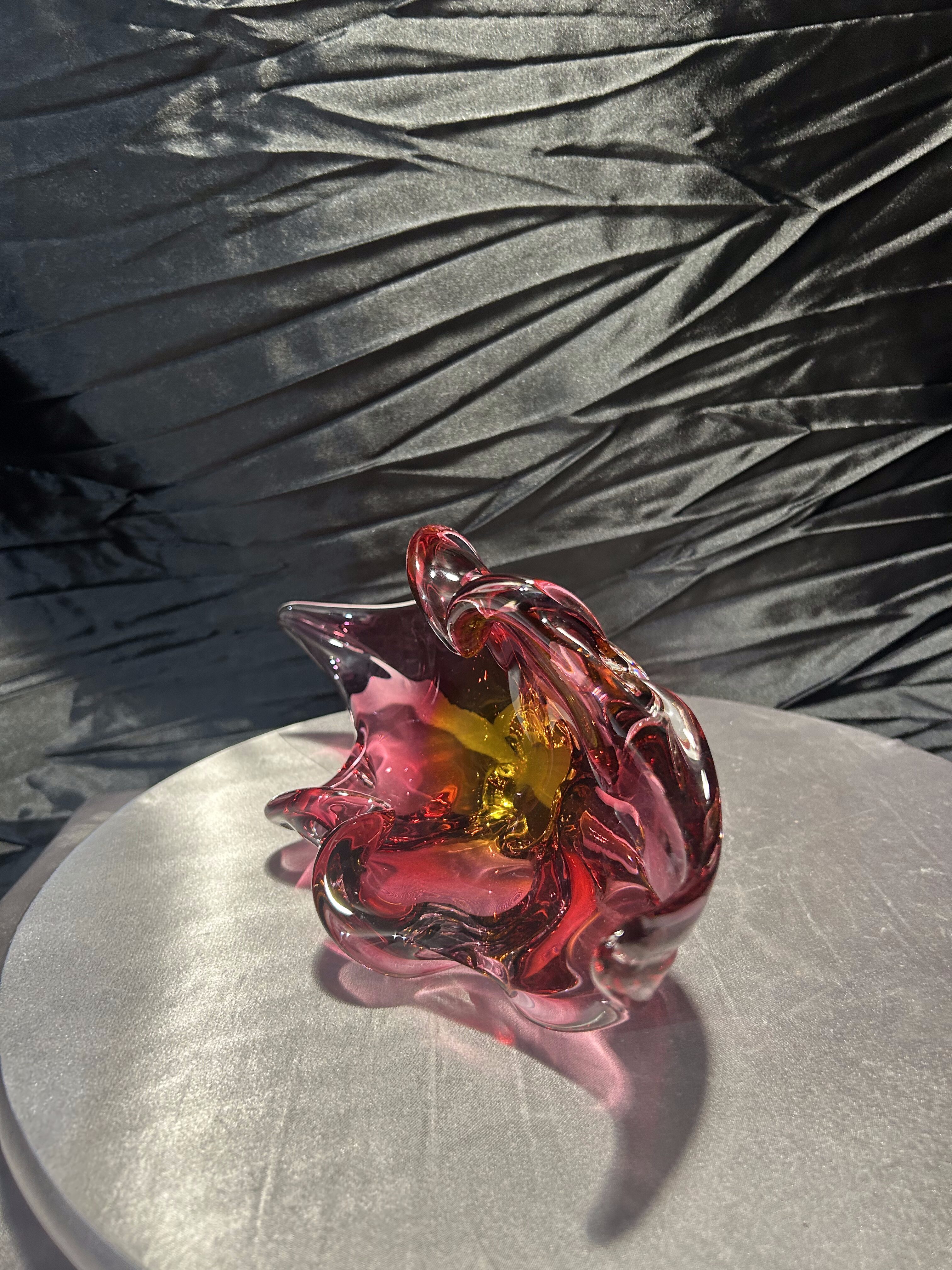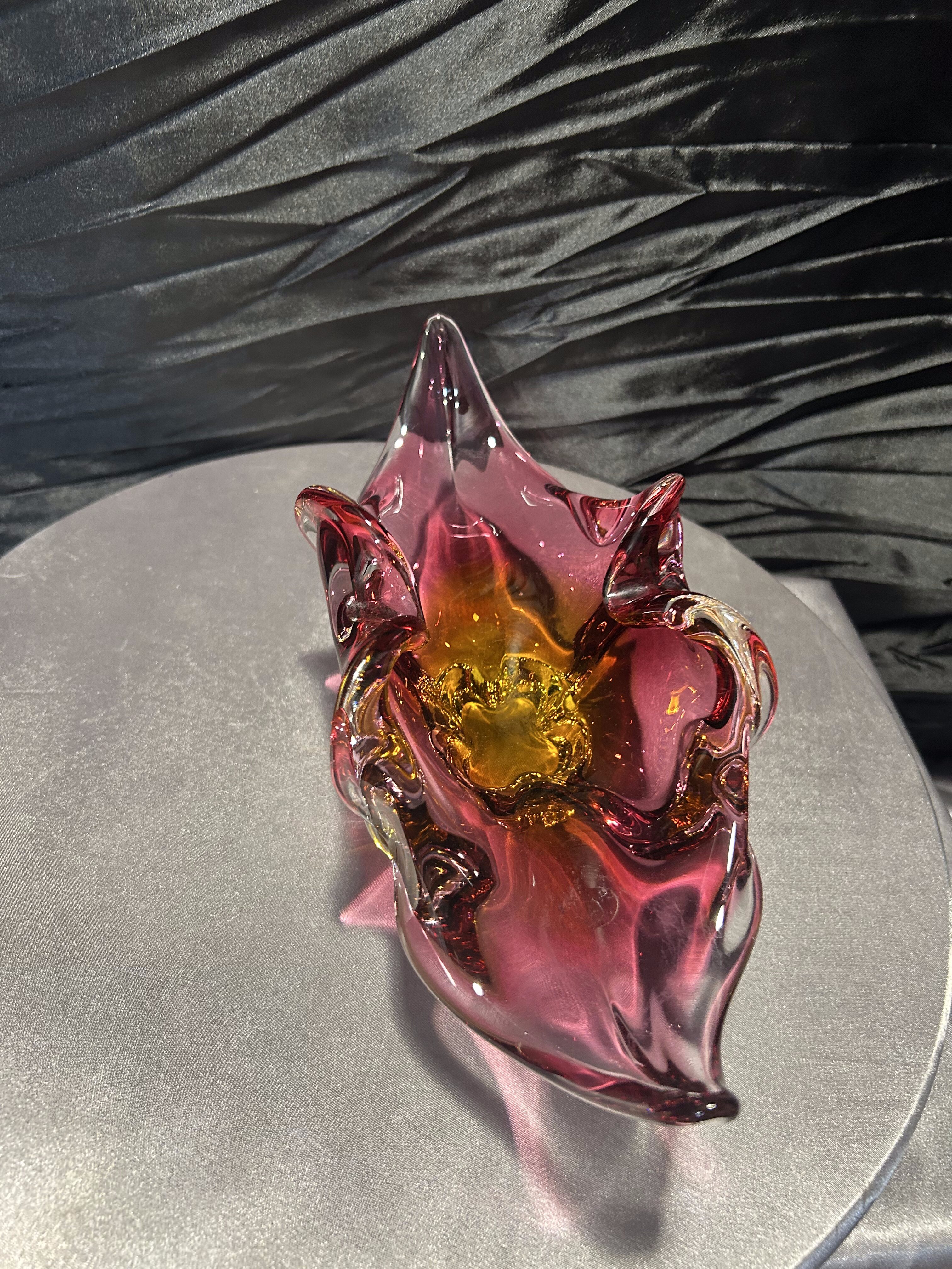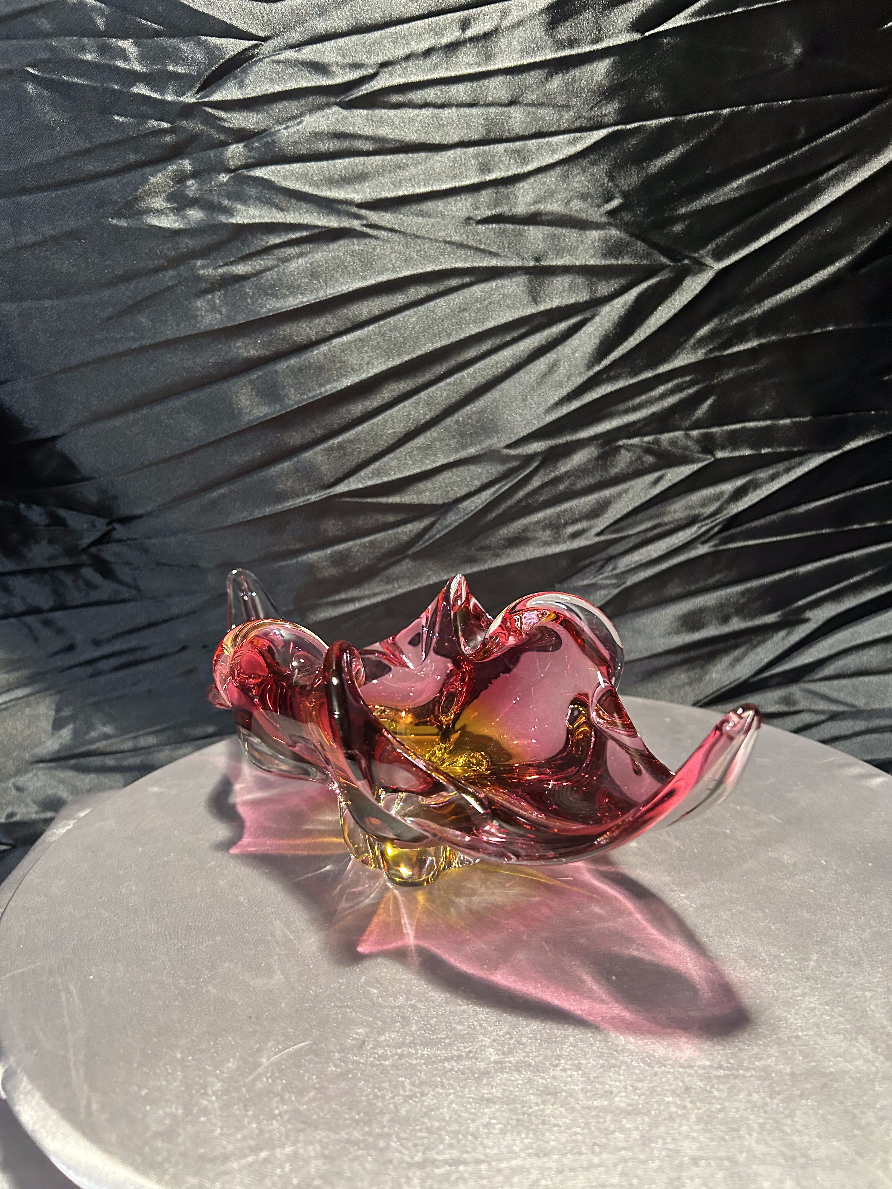 Wyjątkowa szklana misa artystyczna z czeskiej huty szkła Bohemia, zaprojektowana przez uznanego projektanta Josefa Hospodkę – jednego z czołowych twórców szkła artystycznego w latach 50. i 60. XX wieku. Misa wykonana jest w technice szkła dwukolorowego, łączącego barwy czerwieni i bursztynu, co w połączeniu z falującą formą nadaje jej niezwykłą lekkość i dynamikę. Przykład sztuki użytkowej w najlepszym wydaniu, stanowiący esencję stylu charakterystycznego dla czechosłowackiej szkoły szkła artystycznego. Idealna zarówno jako element dekoracyjny, jak i kolekcjonerski.
