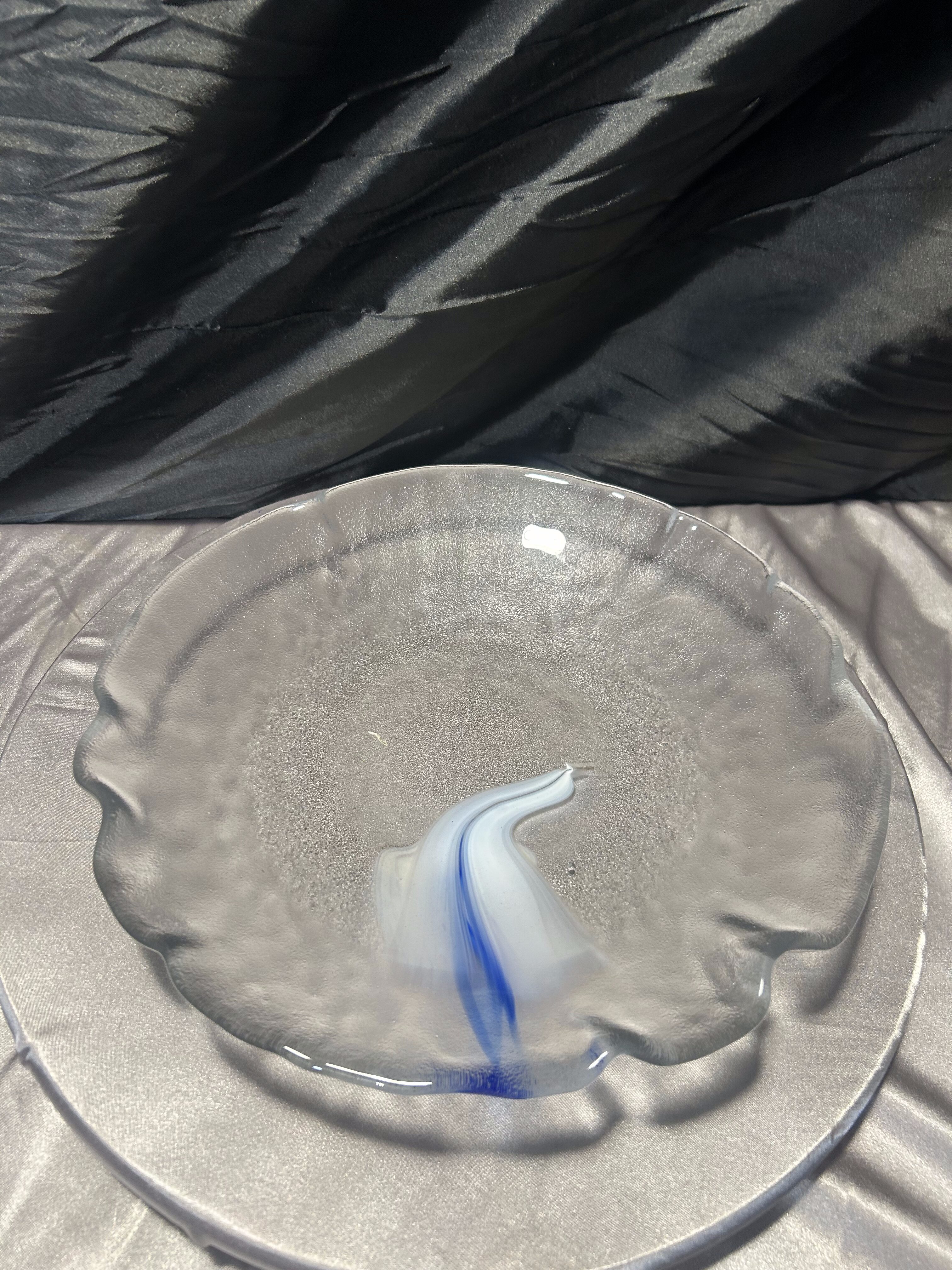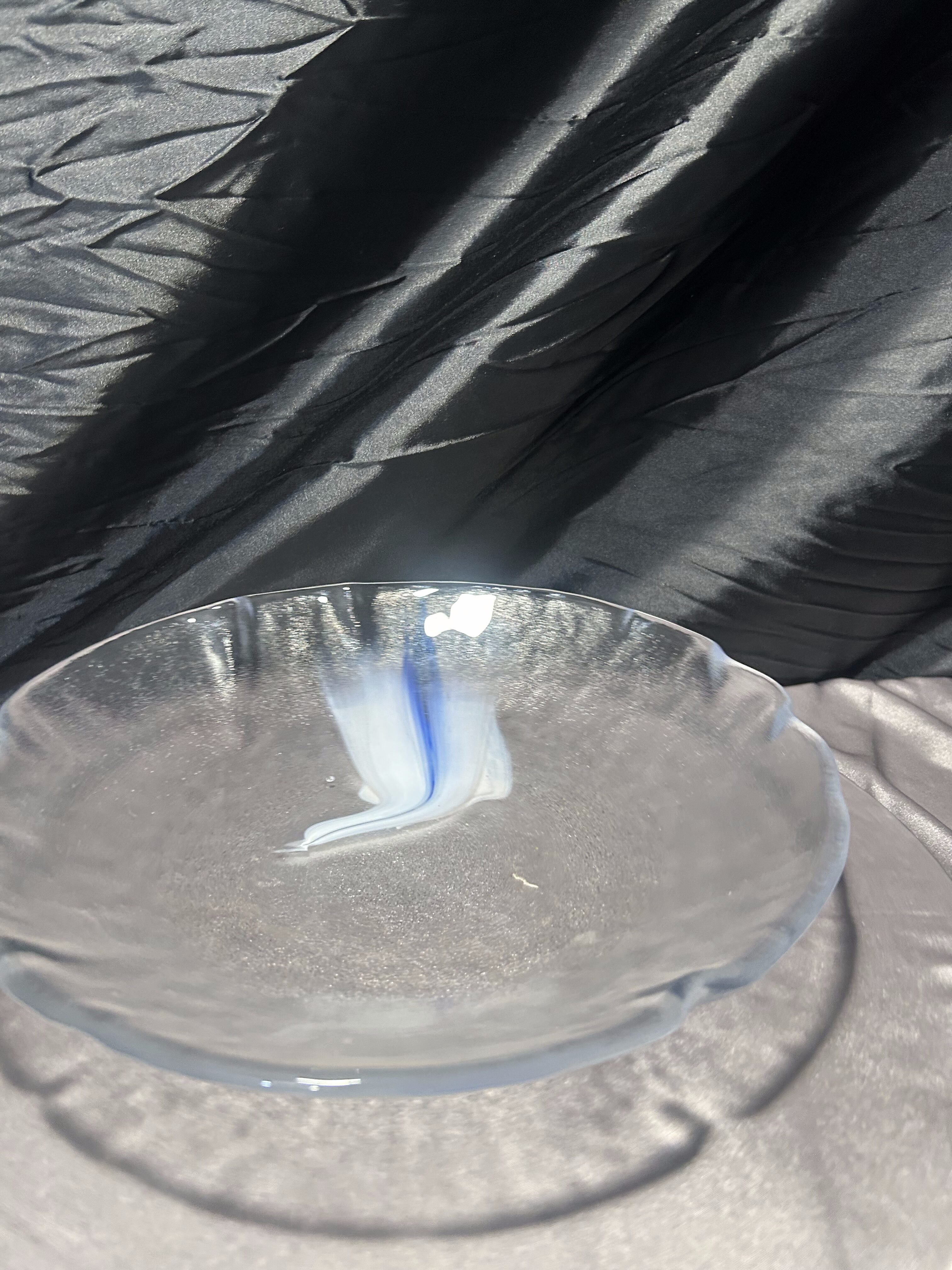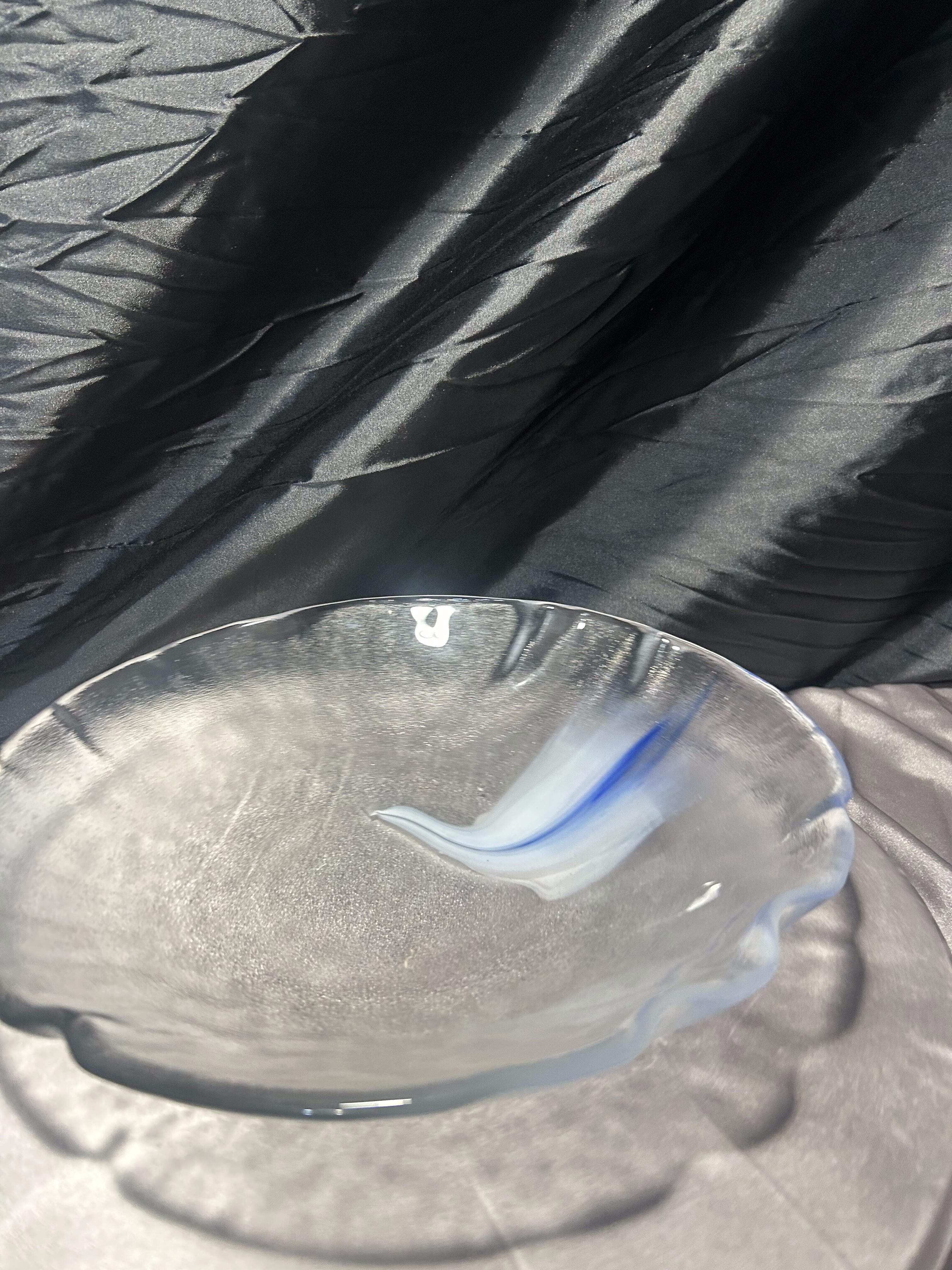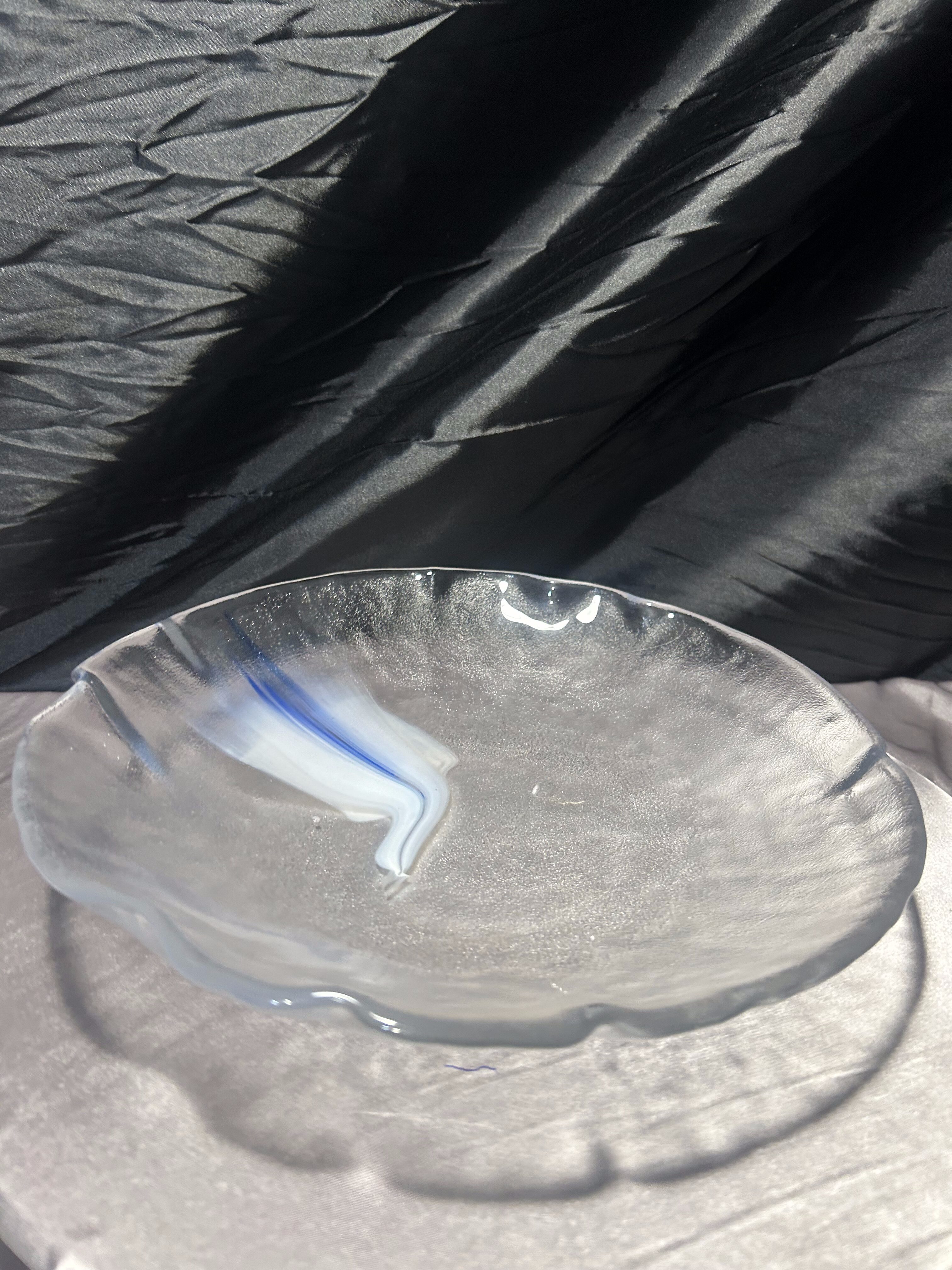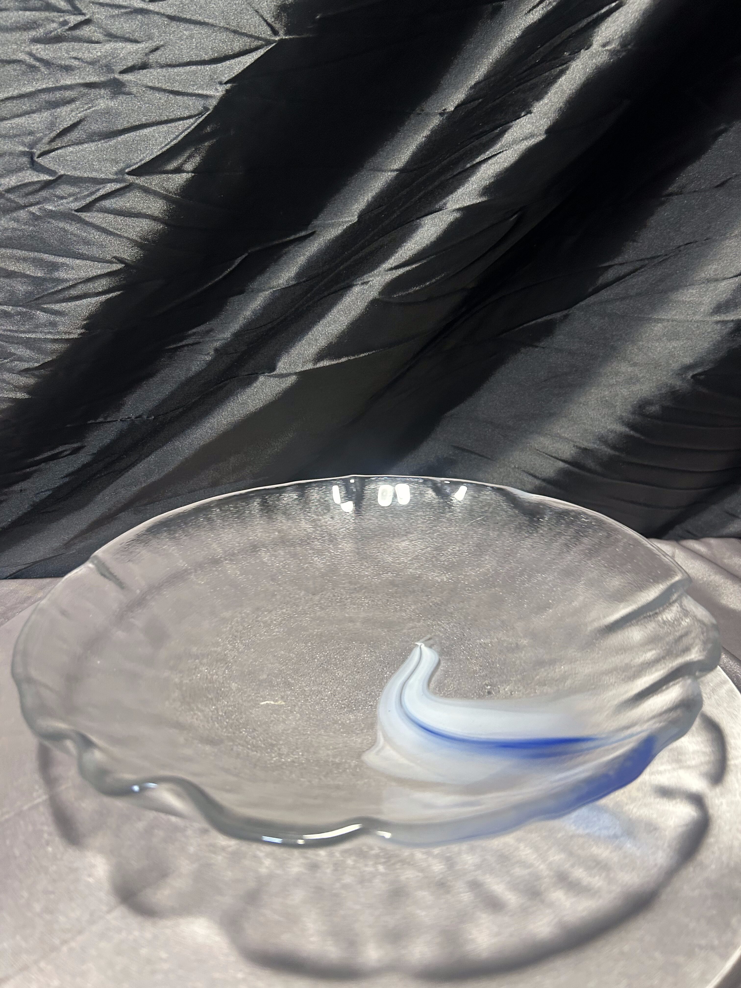 Efektowna, ręcznie formowana szklana misa o lekko falowanym brzegu i subtelnej, artystycznej strukturze powierzchni. Jej charakter podkreśla dynamiczny akcent kolorystyczny – wtopiona w szkło smuga w odcieniach błękitu i bieli, która nadaje całości elegancji oraz nowoczesnego wyrazu. Misa zachwyca prostotą i lekkością, a jednocześnie posiada wyrazistą osobowość typową dla szkła artystycznego.