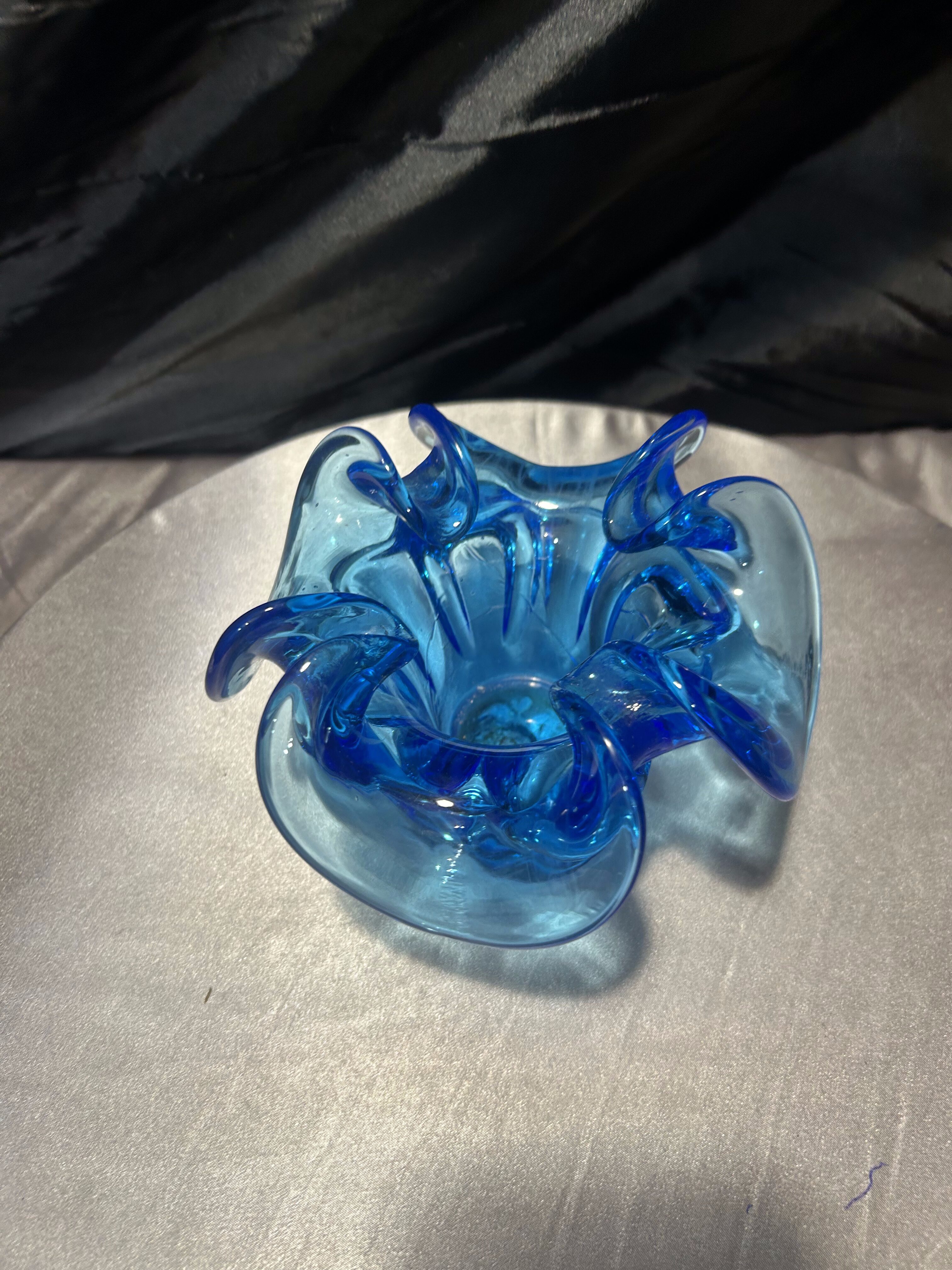 Piękna, ręcznie formowana misa ze szkła artystycznego w głębokim, nasyconym odcieniu niebieskiego. Jej dynamiczna, falowana forma przywodzi na myśl morskie nurty lub rozwijający się kwiat – to przedmiot, który przyciąga uwagę zarówno kolorem, jak i rzeźbiarskim kształtem. Grube szkło tworzy eleganckie refleksy, a nieregularnie wygięte krawędzie dodają całości ekspresji i lekkości.