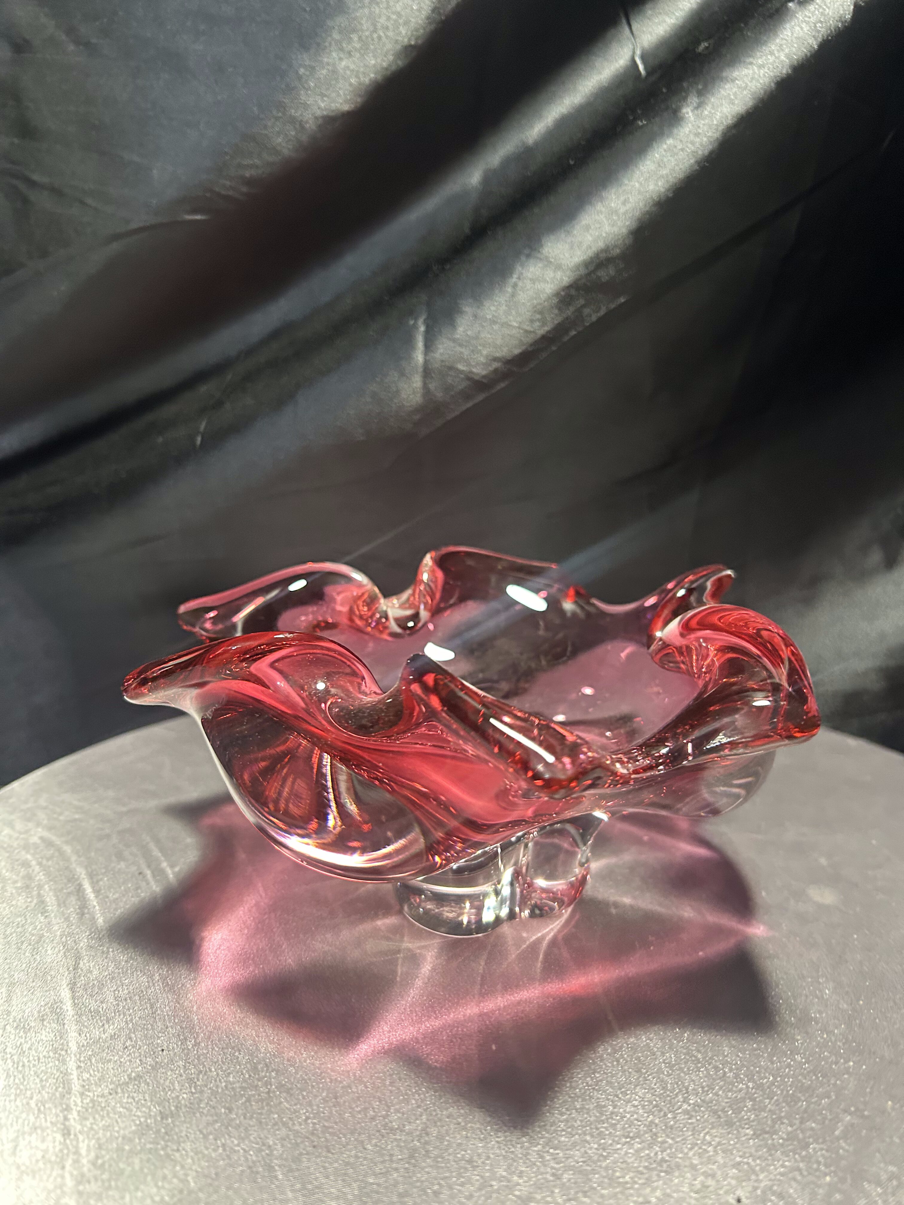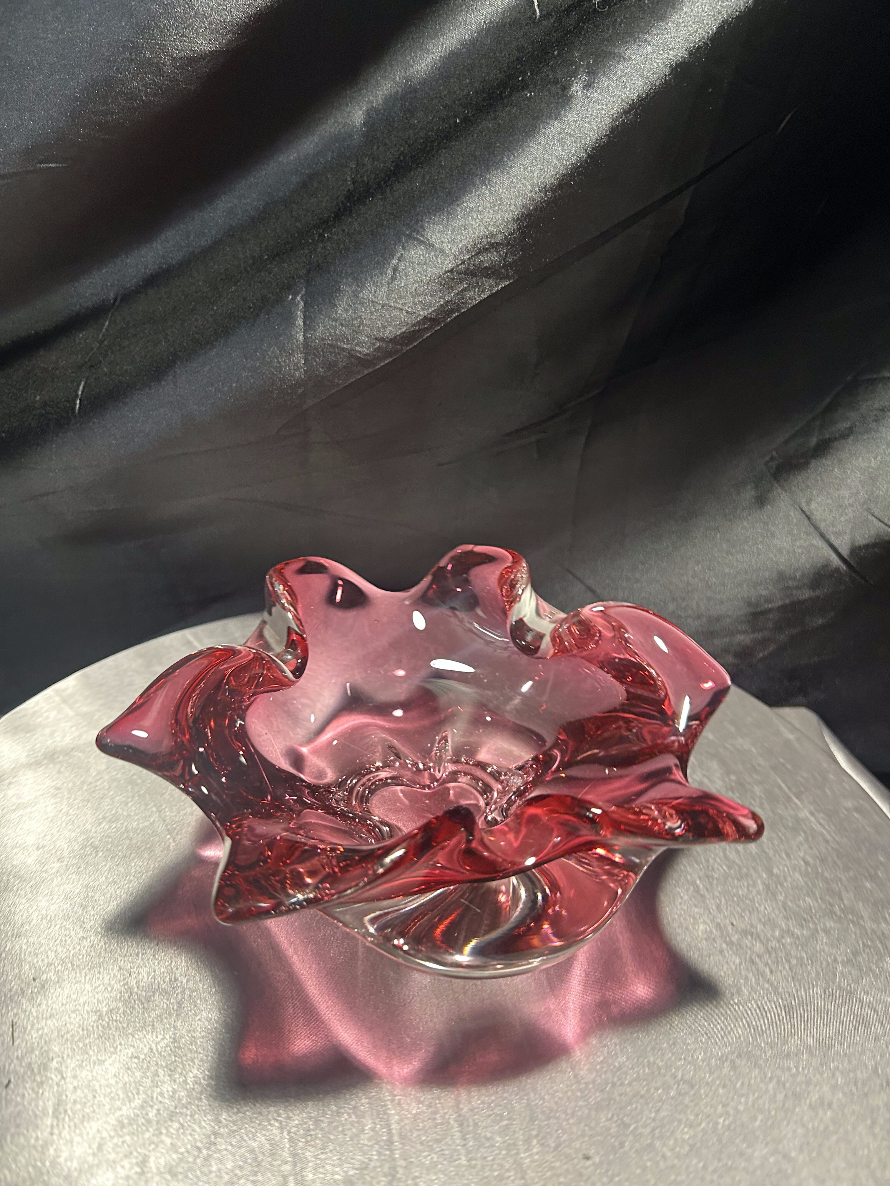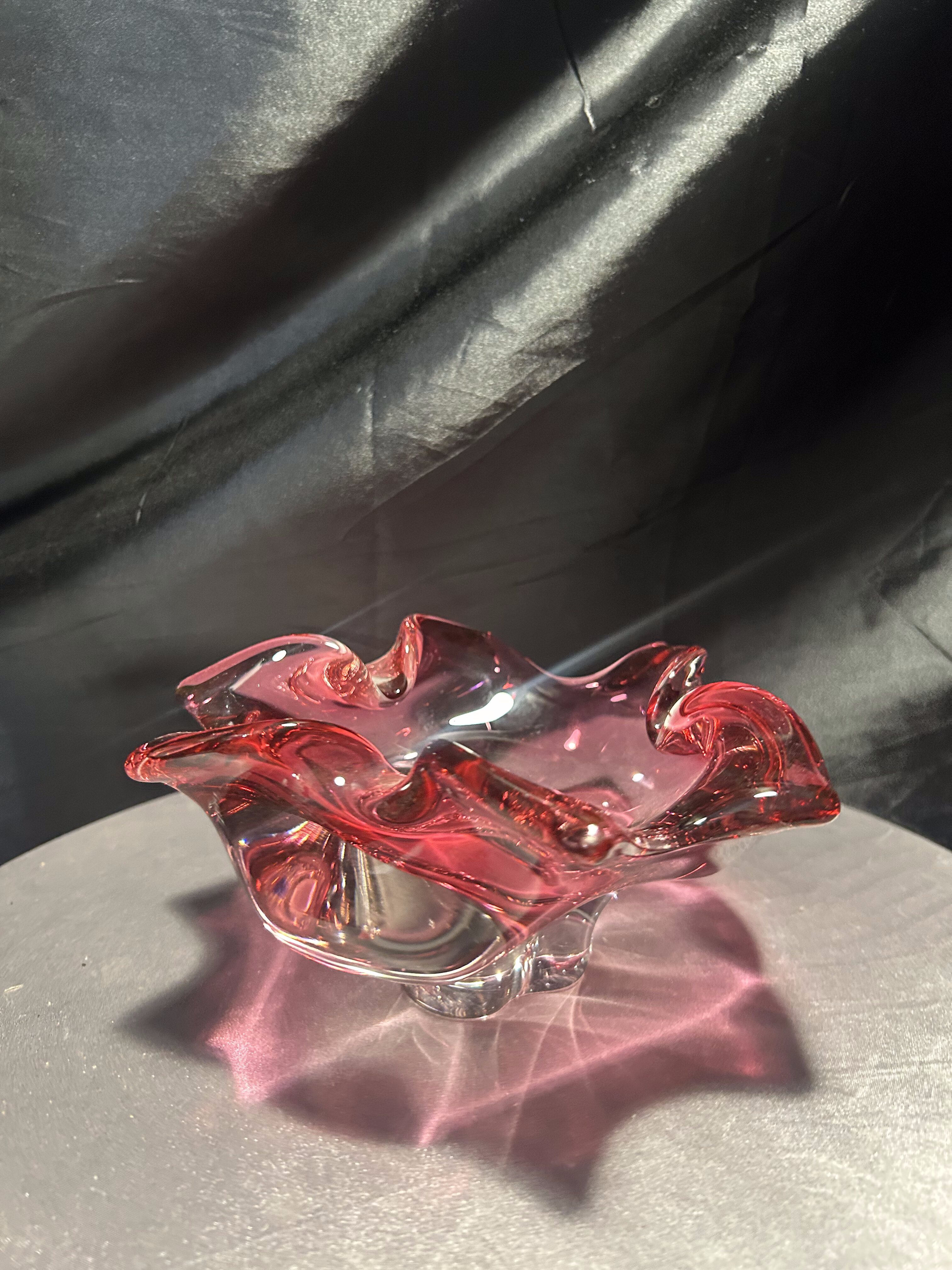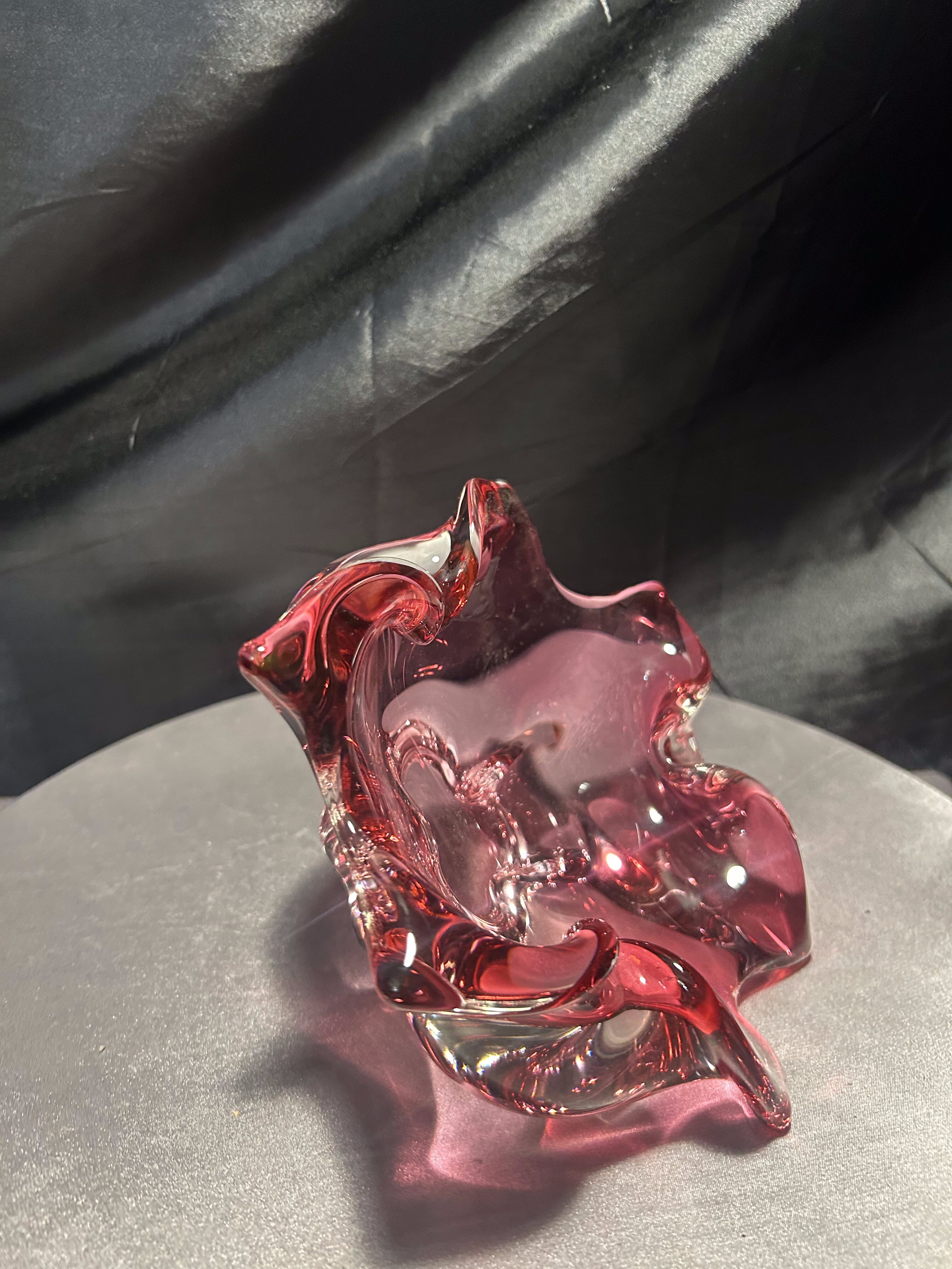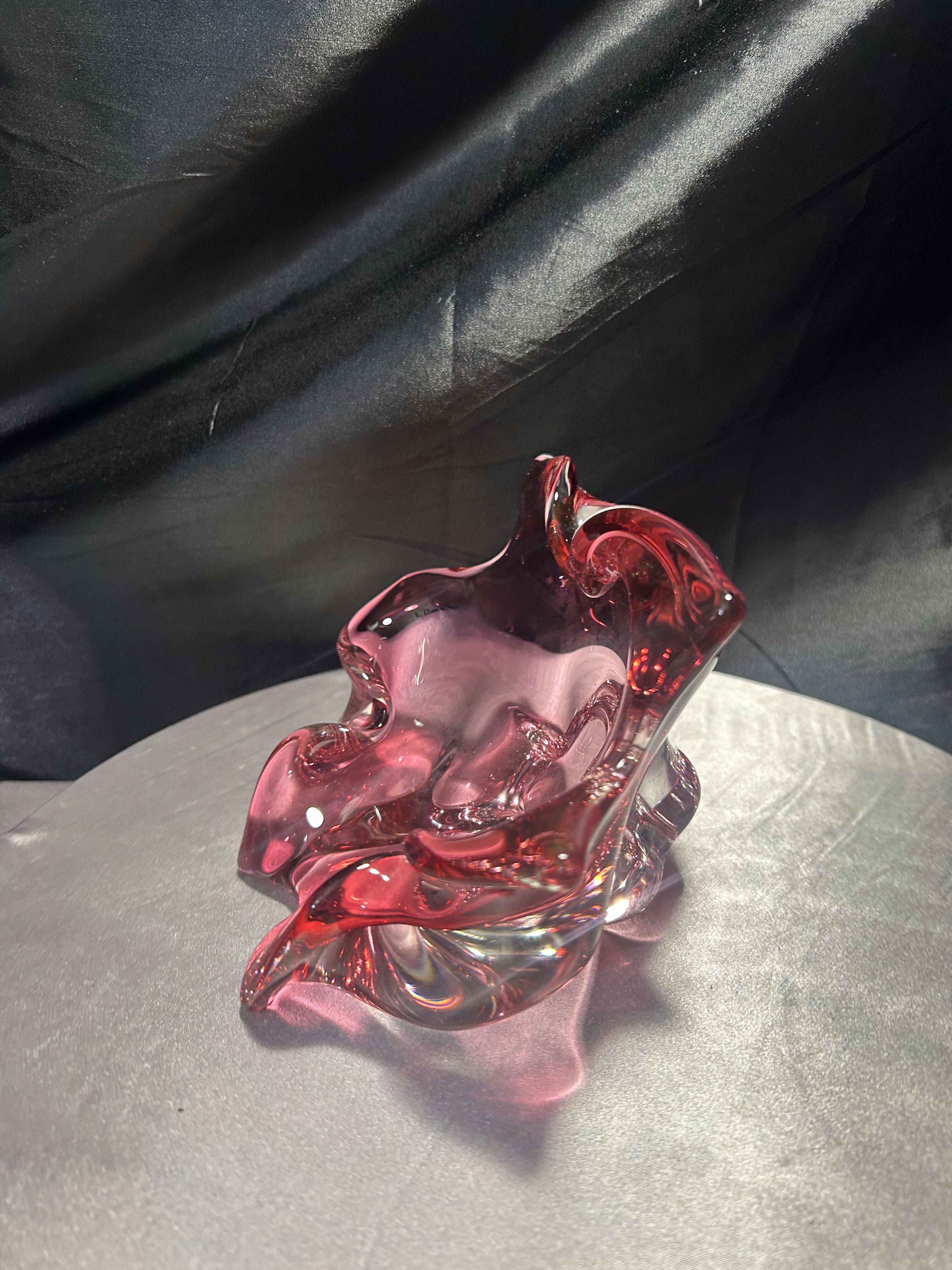 Imponująca misa wykonana ze szkła artystycznego o rzeźbiarskiej, falującej formie i urzekającym różowym kolorze z transparentnym przejściem do bezbarwnego szkła. Projekt przypisywany jest wybitnemu czeskiemu designerowi Józefowi Hospodce, którego twórczość w połowie XX wieku na trwałe wpisała się w kanon europejskiego szkła użytkowego.