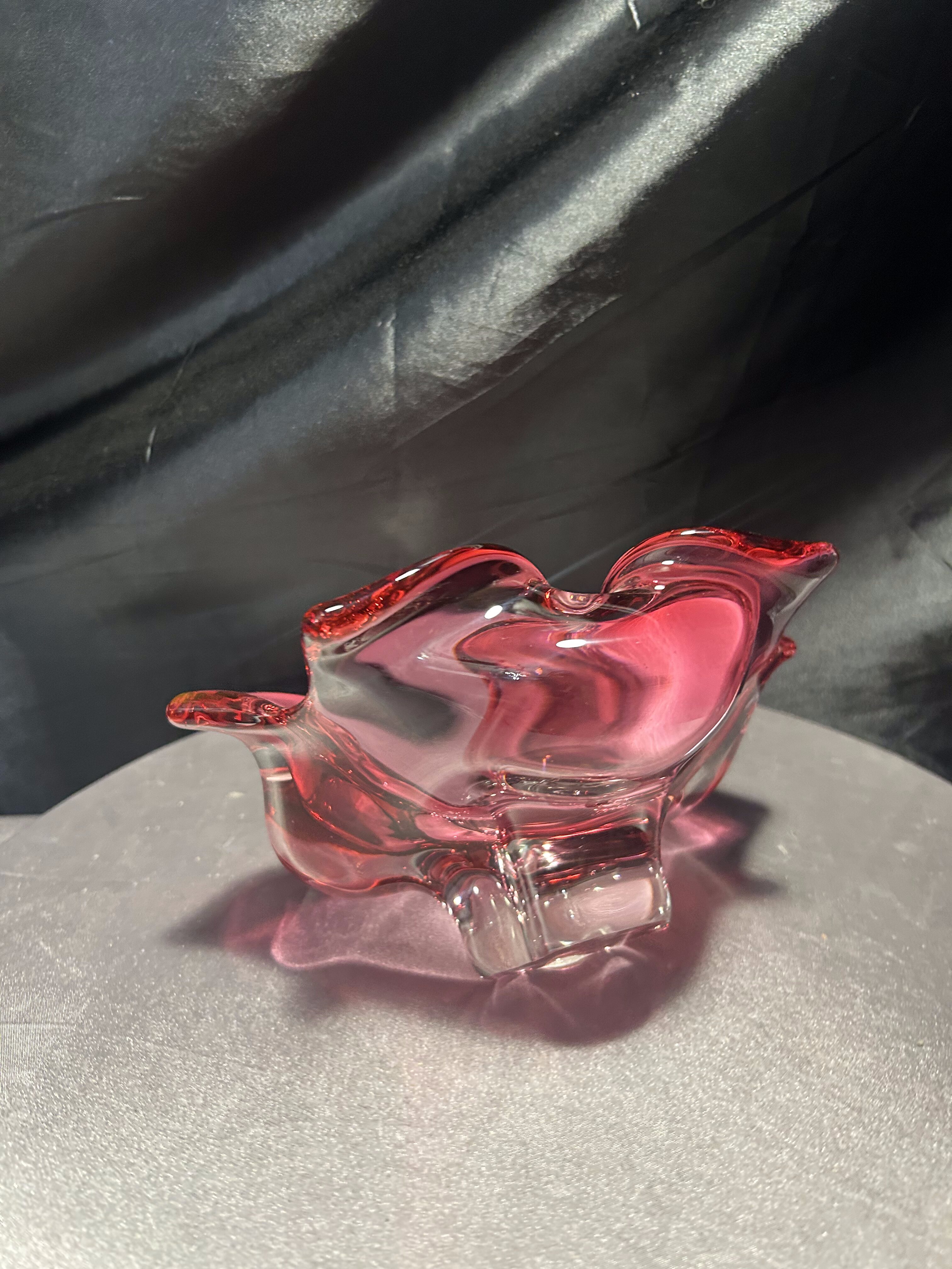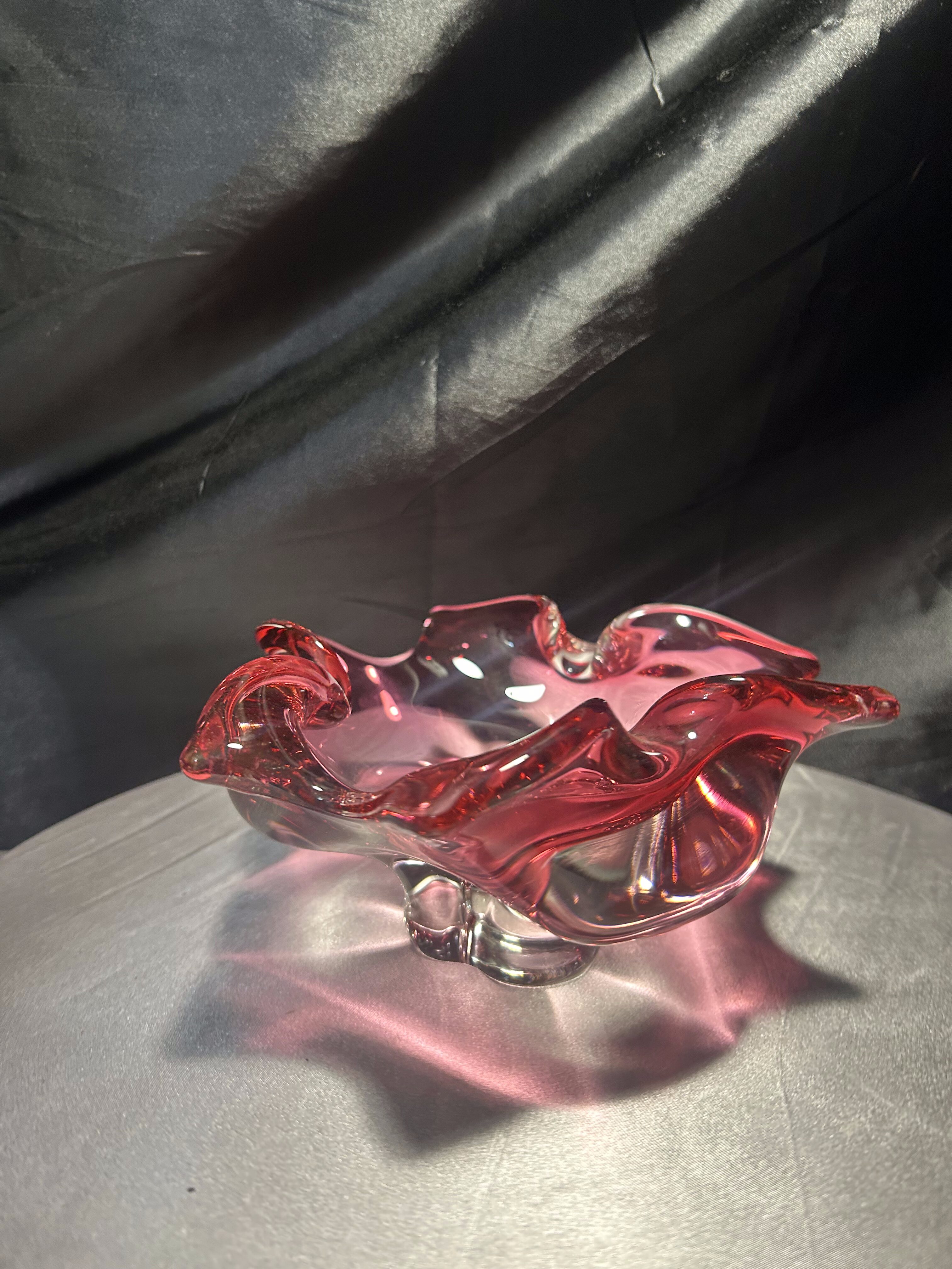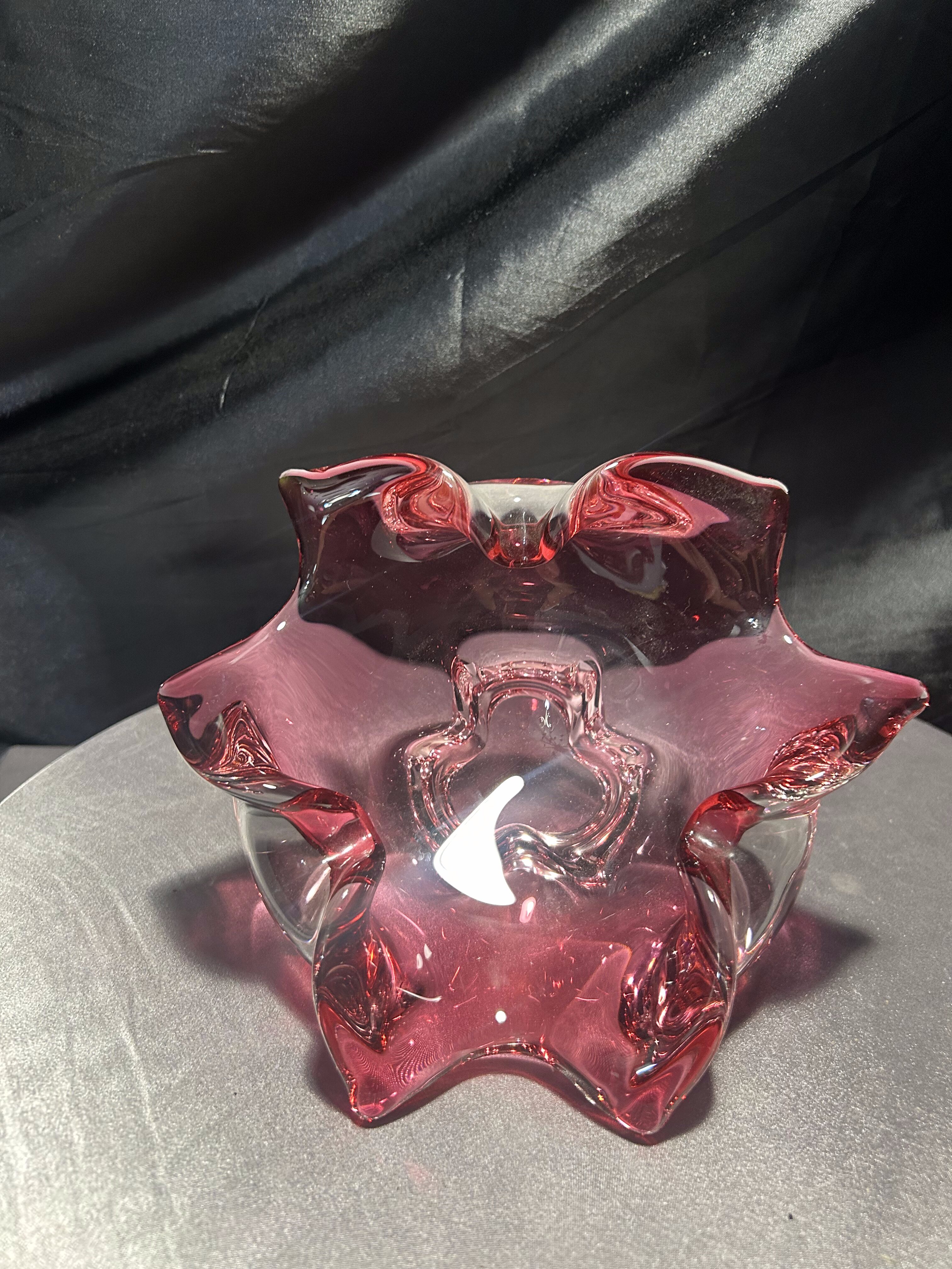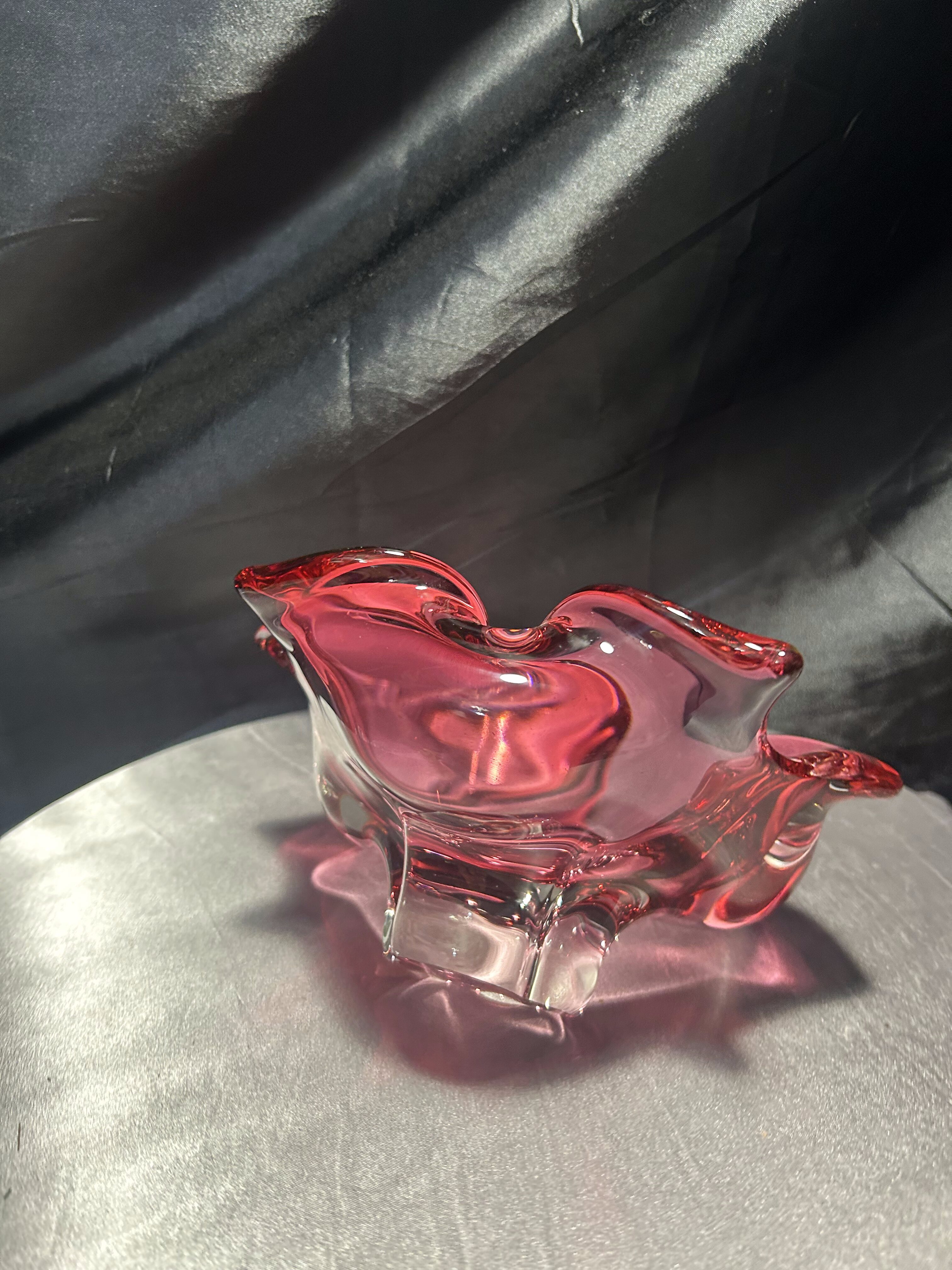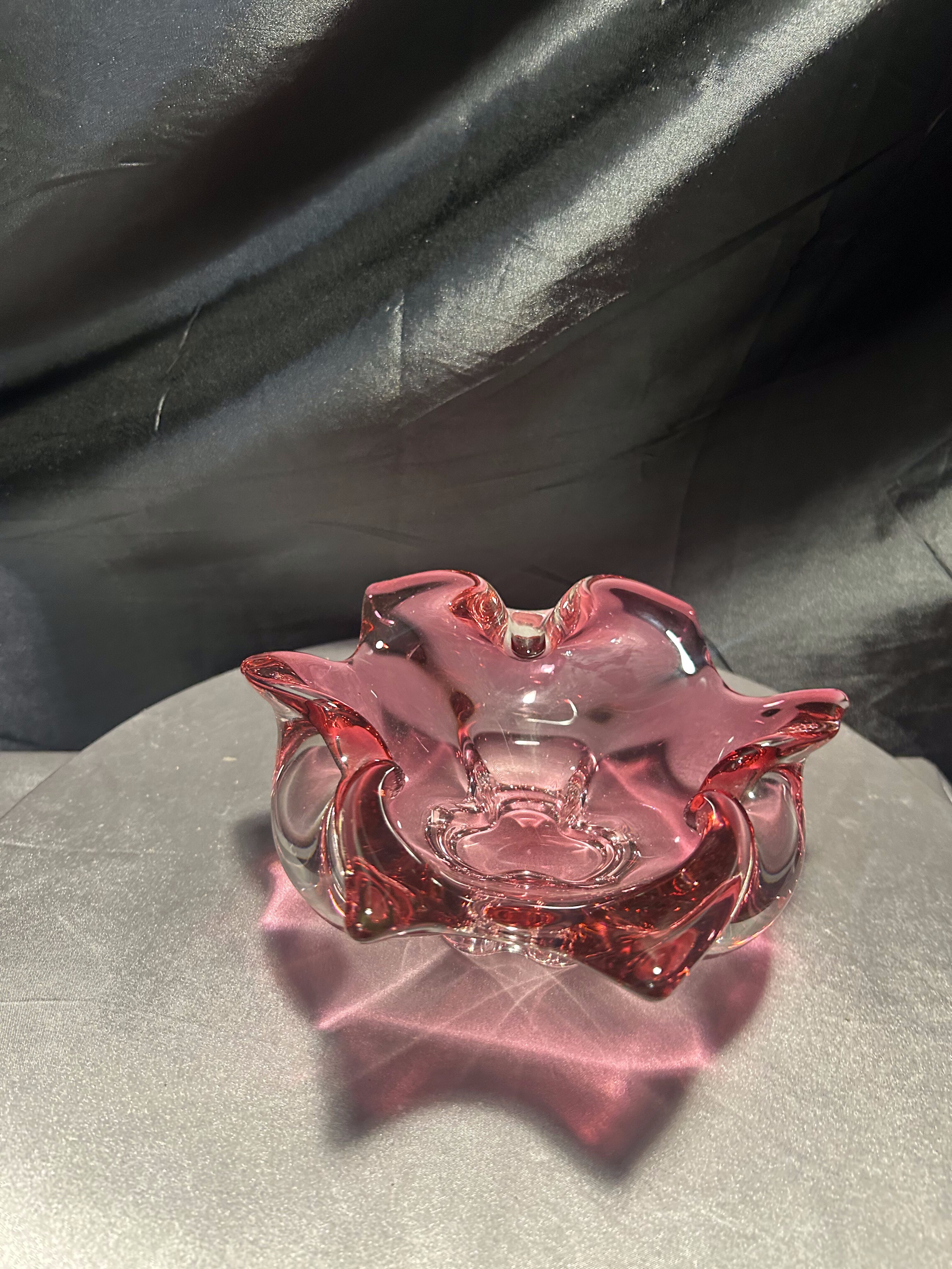 Imponująca misa wykonana ze szkła artystycznego o rzeźbiarskiej, falującej formie i urzekającym różowym kolorze z transparentnym przejściem do bezbarwnego szkła. Projekt przypisywany jest wybitnemu czeskiemu designerowi Józefowi Hospodce, którego twórczość w połowie XX wieku na trwałe wpisała się w kanon europejskiego szkła użytkowego.