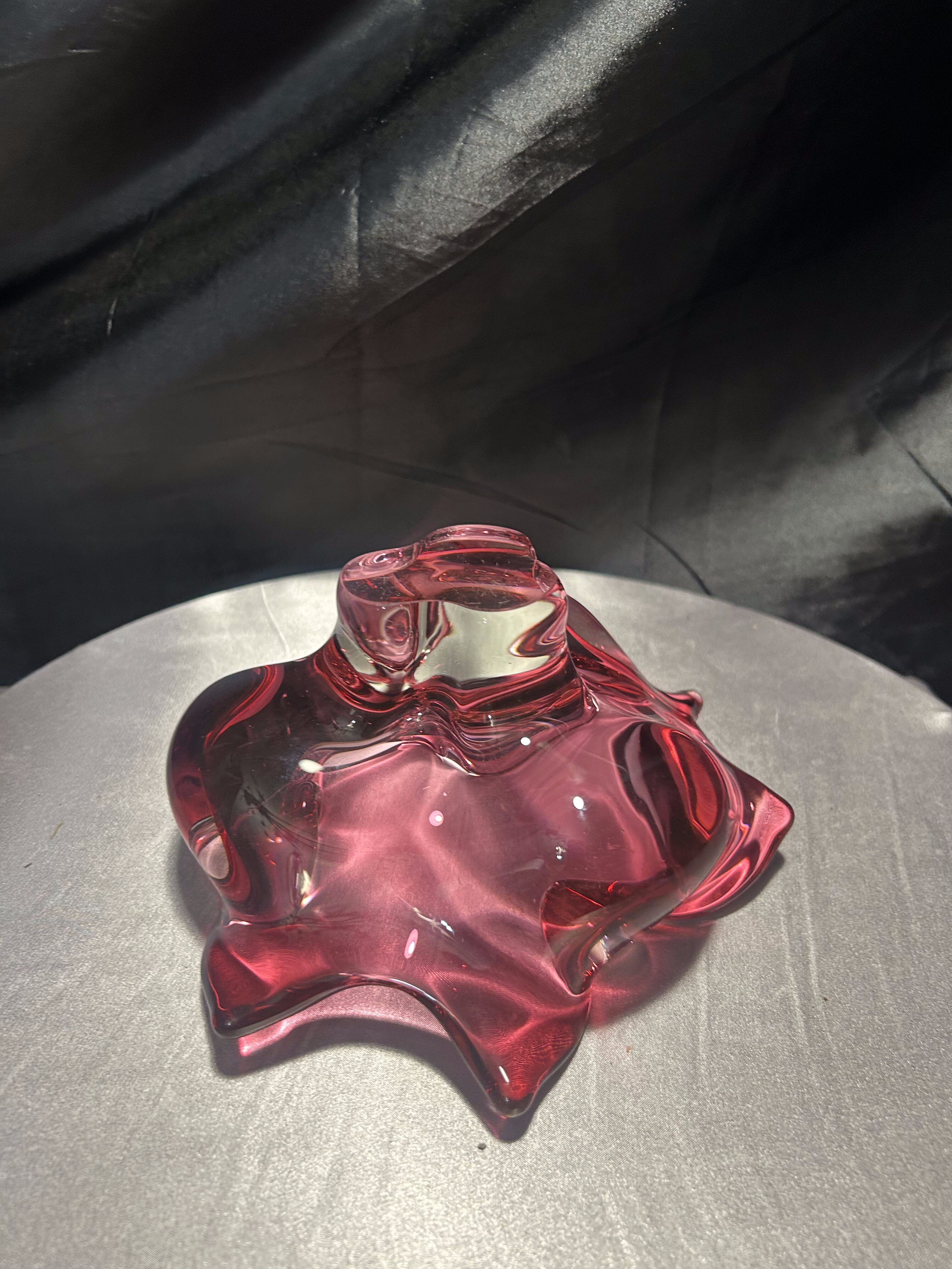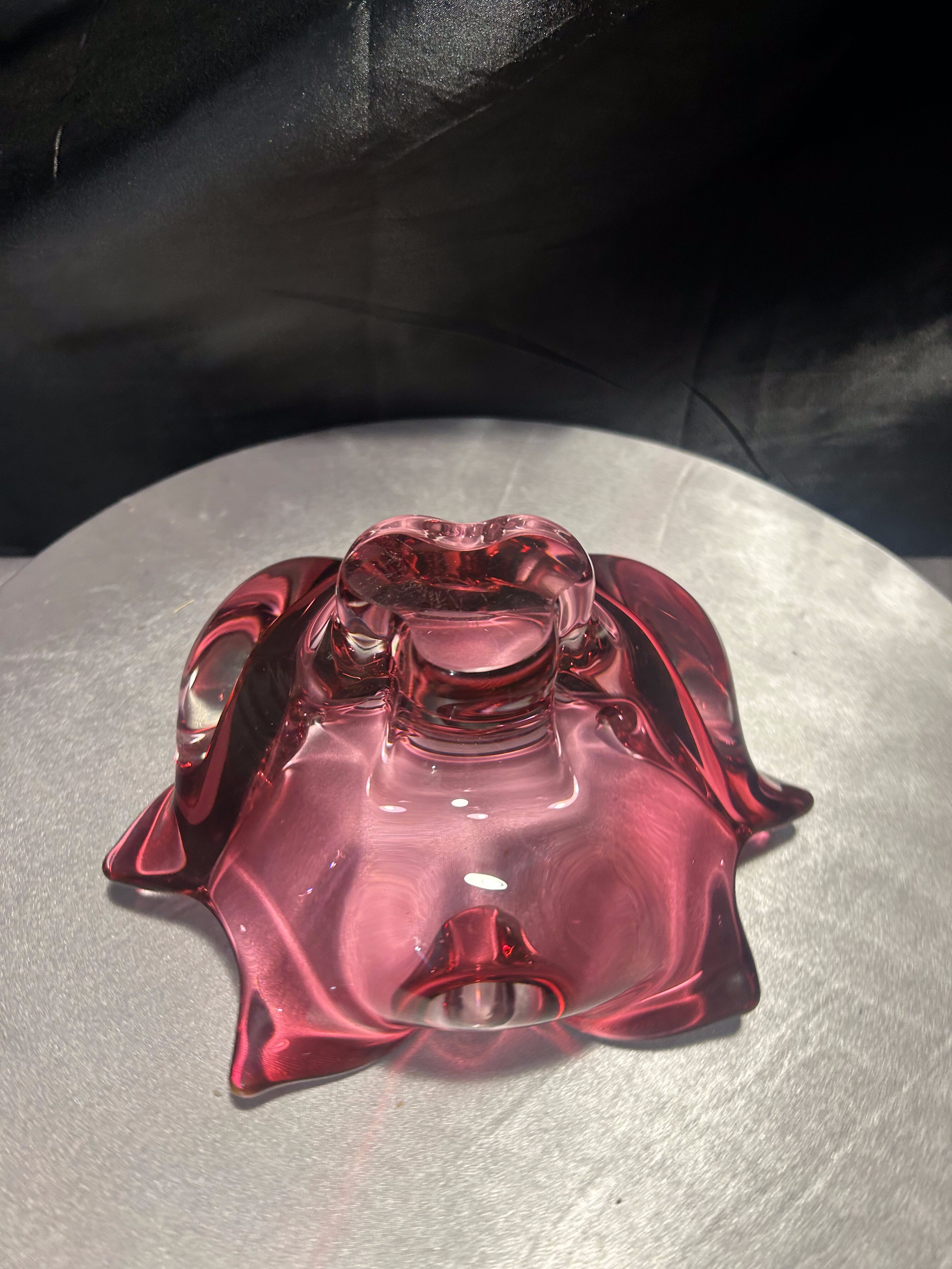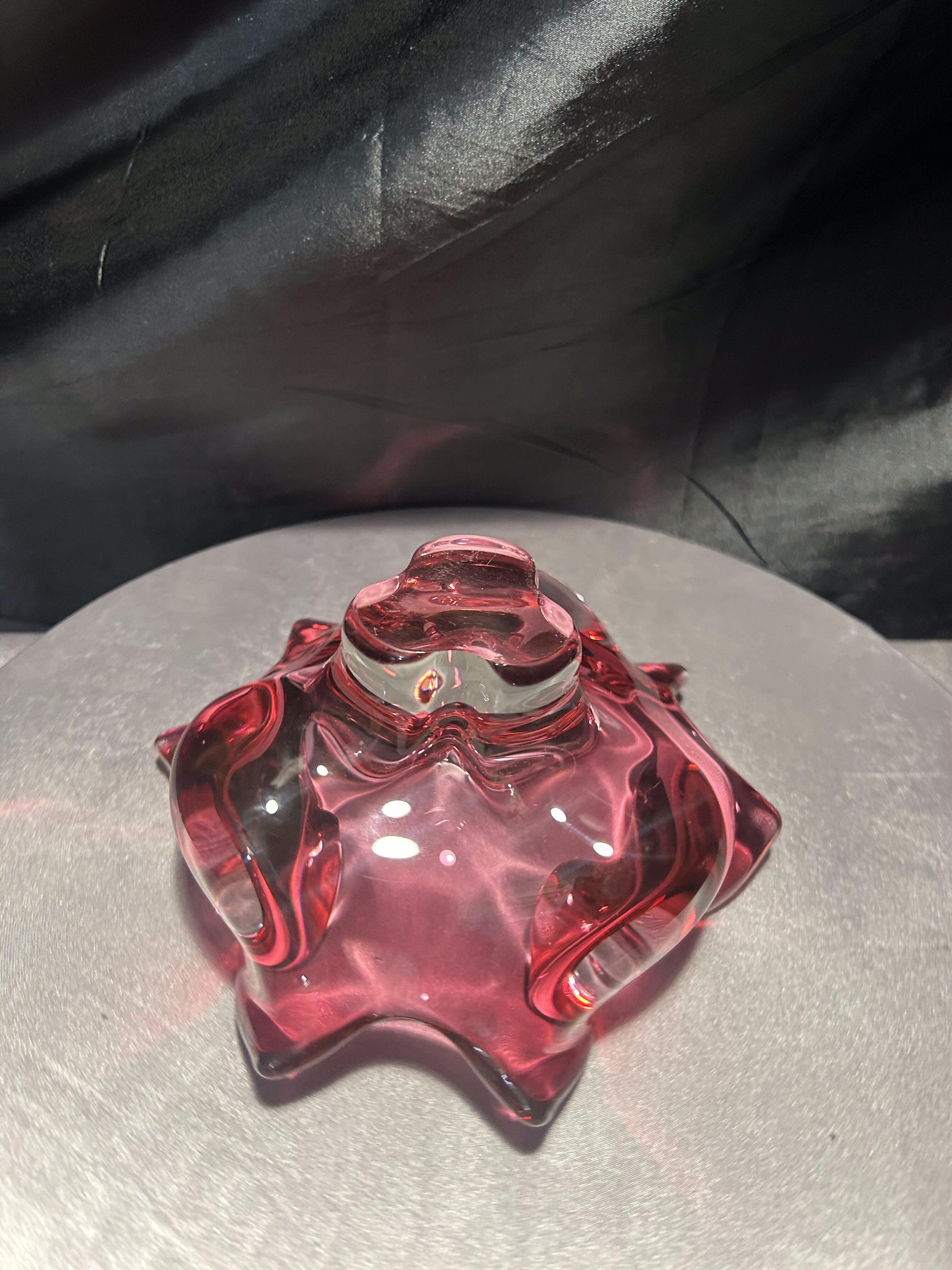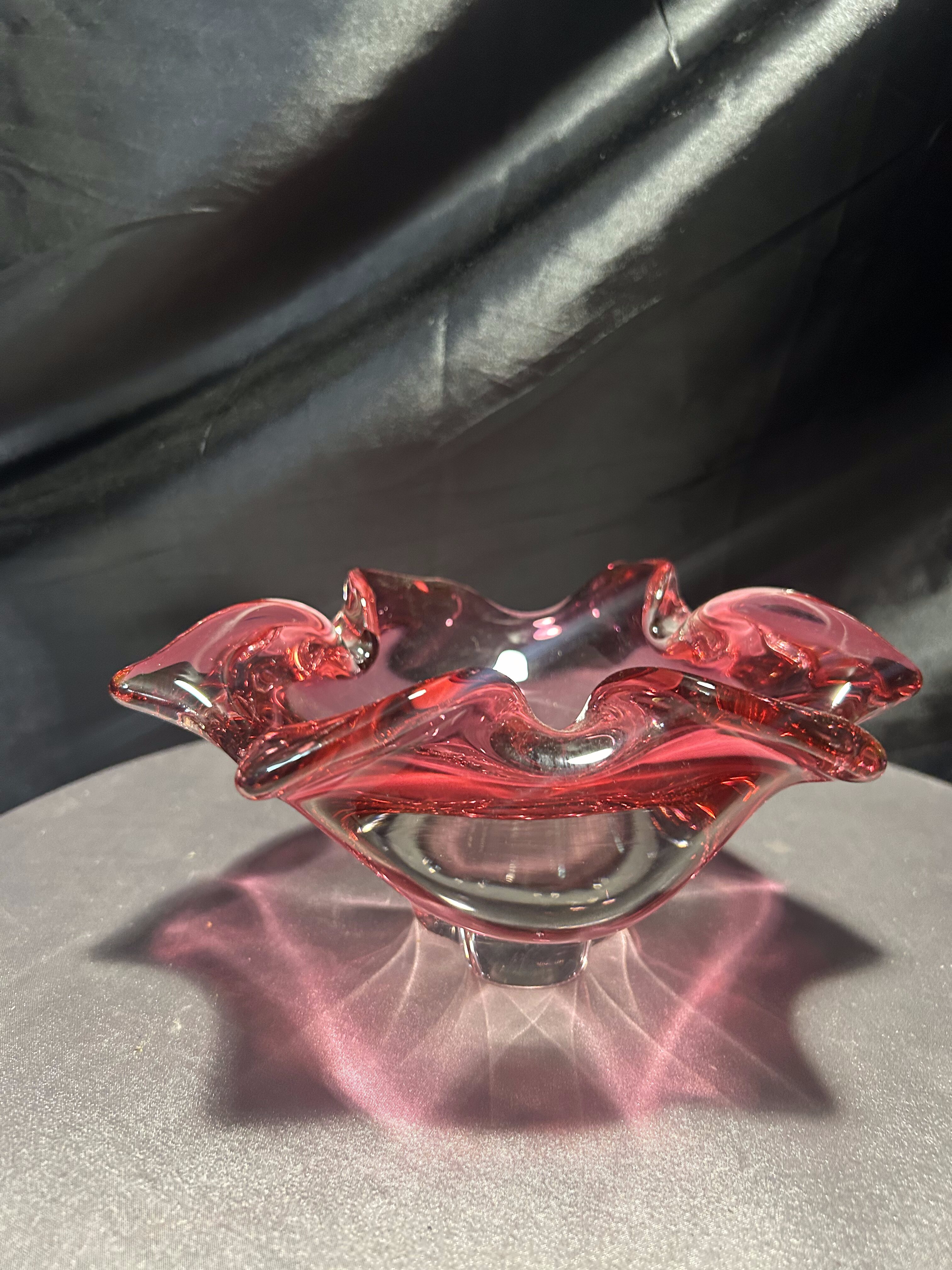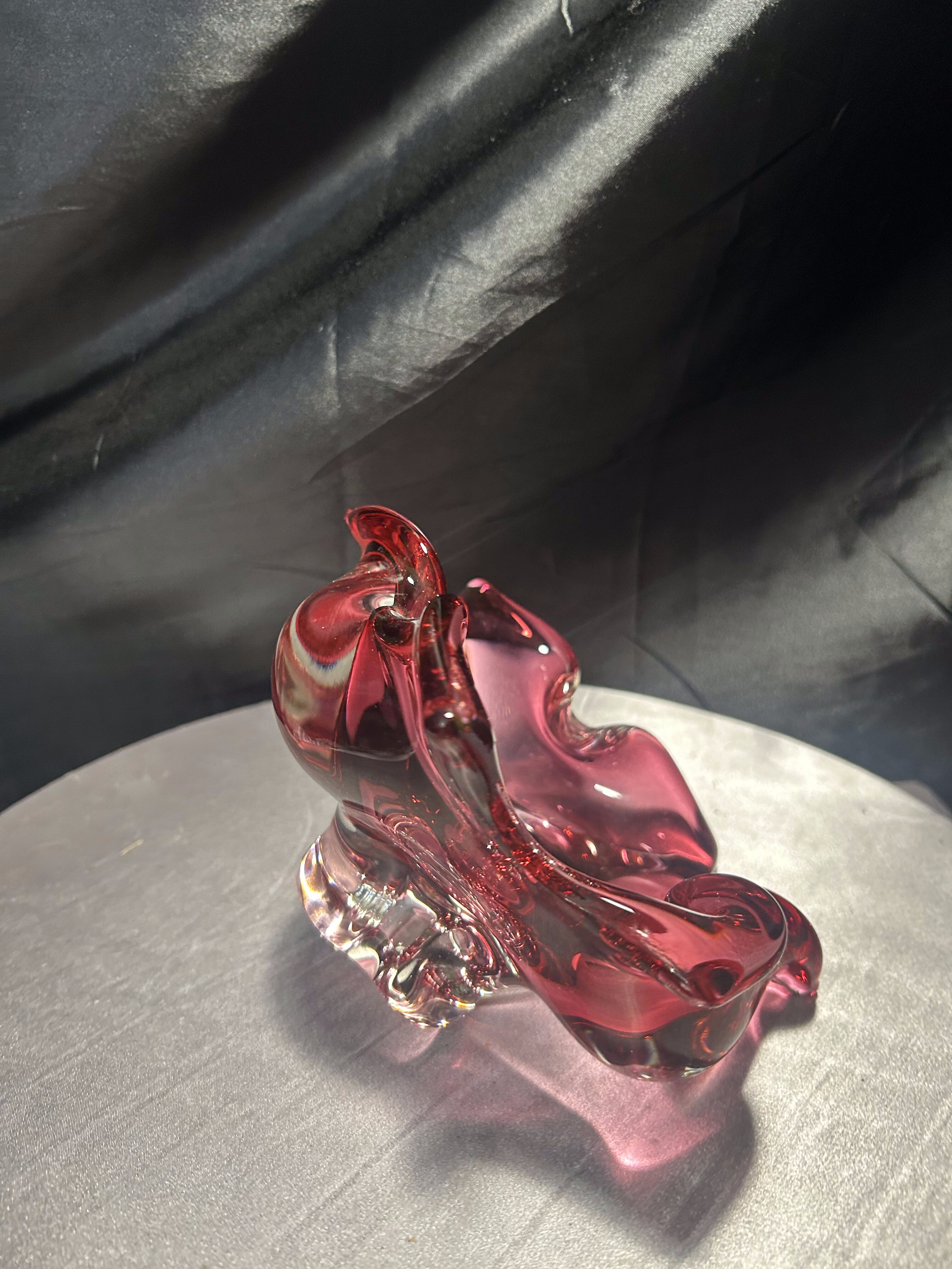 Imponująca misa wykonana ze szkła artystycznego o rzeźbiarskiej, falującej formie i urzekającym różowym kolorze z transparentnym przejściem do bezbarwnego szkła. Projekt przypisywany jest wybitnemu czeskiemu designerowi Józefowi Hospodce, którego twórczość w połowie XX wieku na trwałe wpisała się w kanon europejskiego szkła użytkowego.