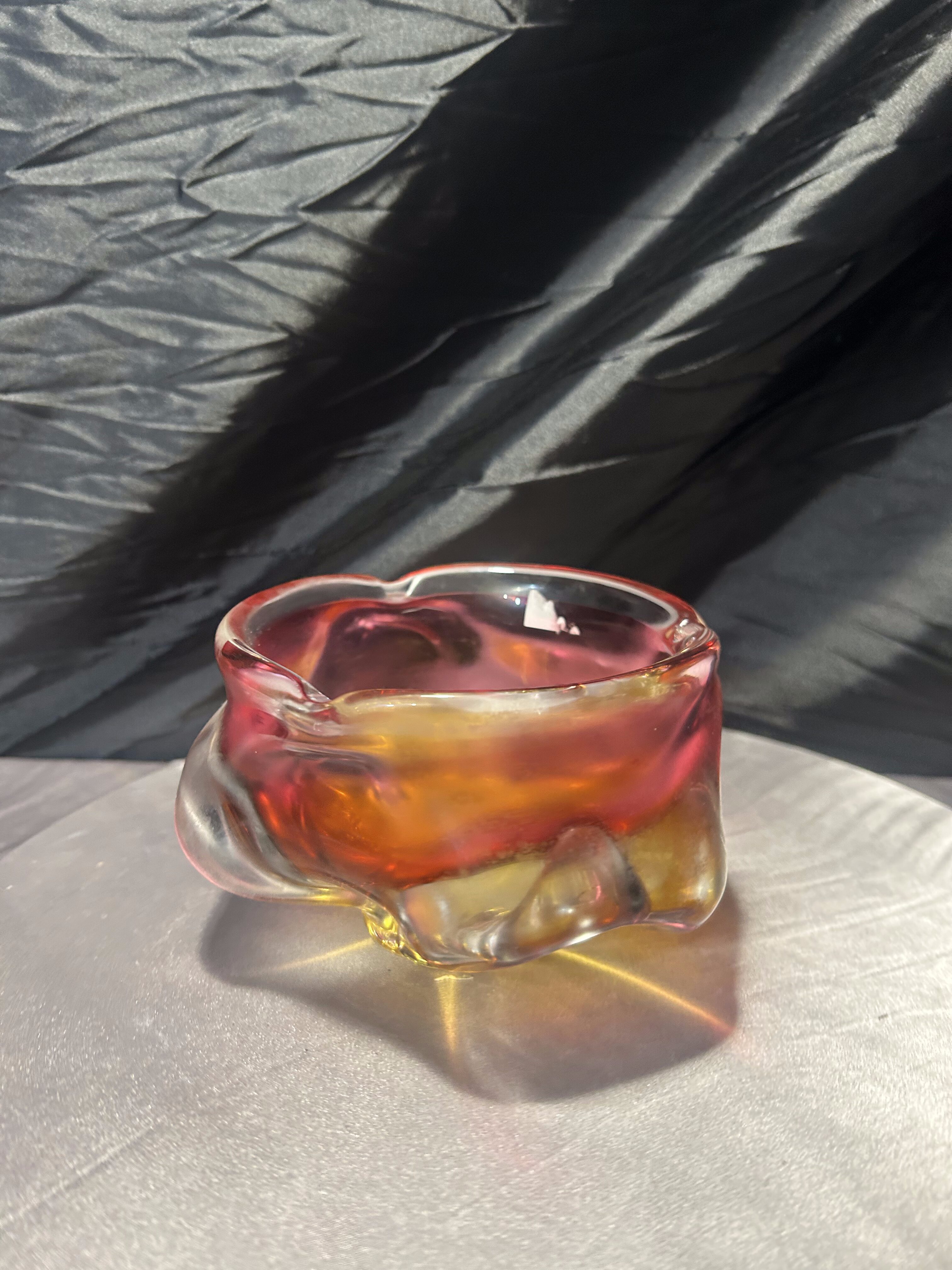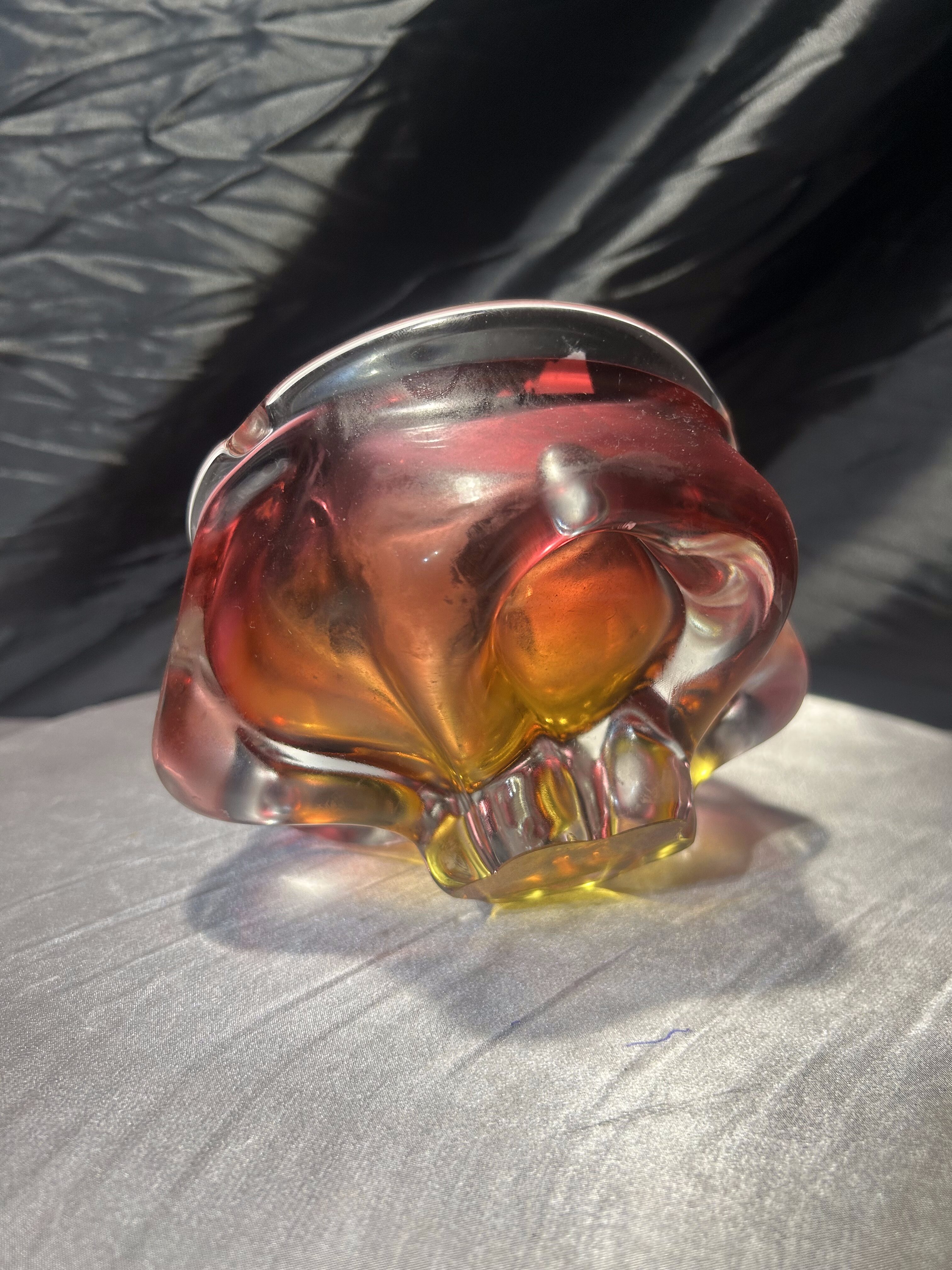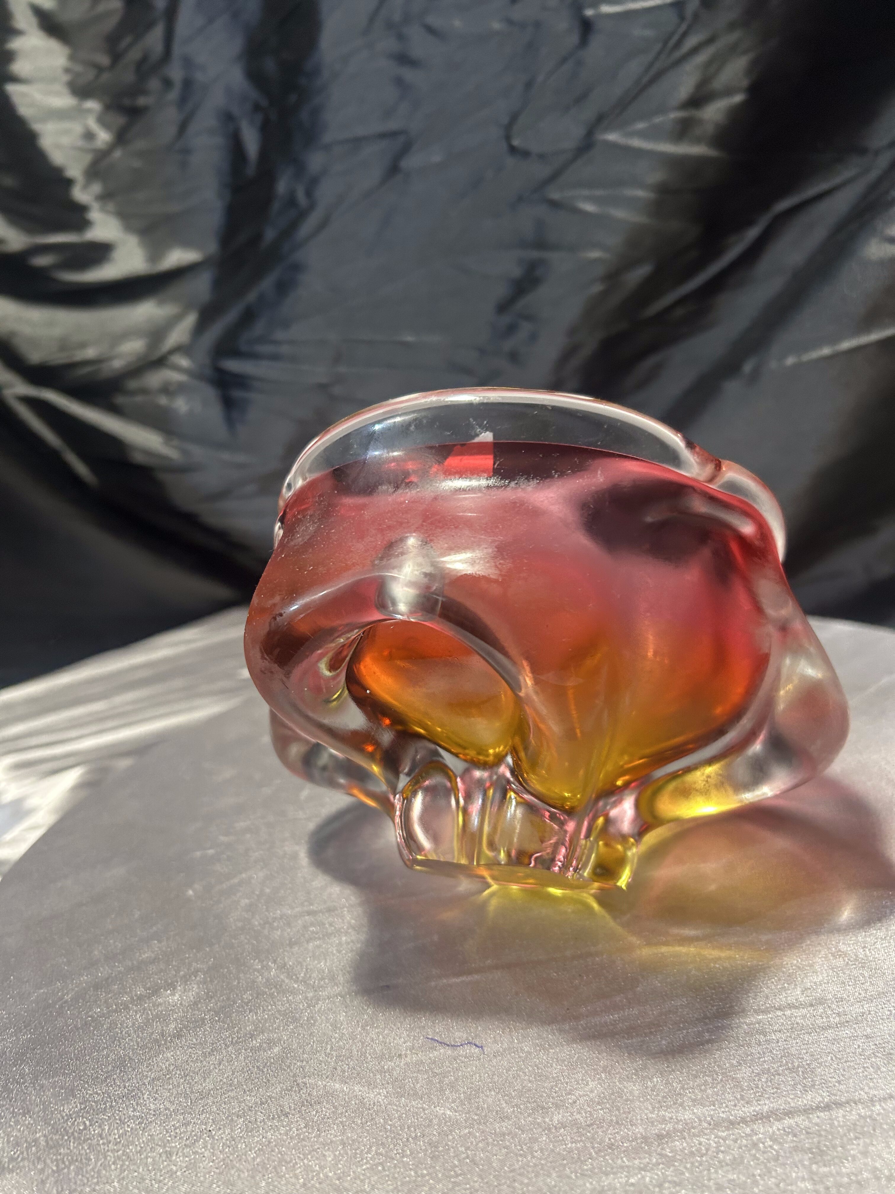 Połączenie intensywnych kolorów – żółci, czerwieni i subtelnych przejść barwnych – podkreśla mistrzostwo pracy z barwioną masą szklaną. Misa zmienia swój wygląd w zależności od kąta padania światła, tworząc spektakularne refleksy i dodając wnętrzu eleganckiego, artystycznego charakteru. To znakomity przykład czeskiego designu z okresu Modernizmu i kolekcjonerski przedmiot o wysokiej wartości dekoracyjnej.