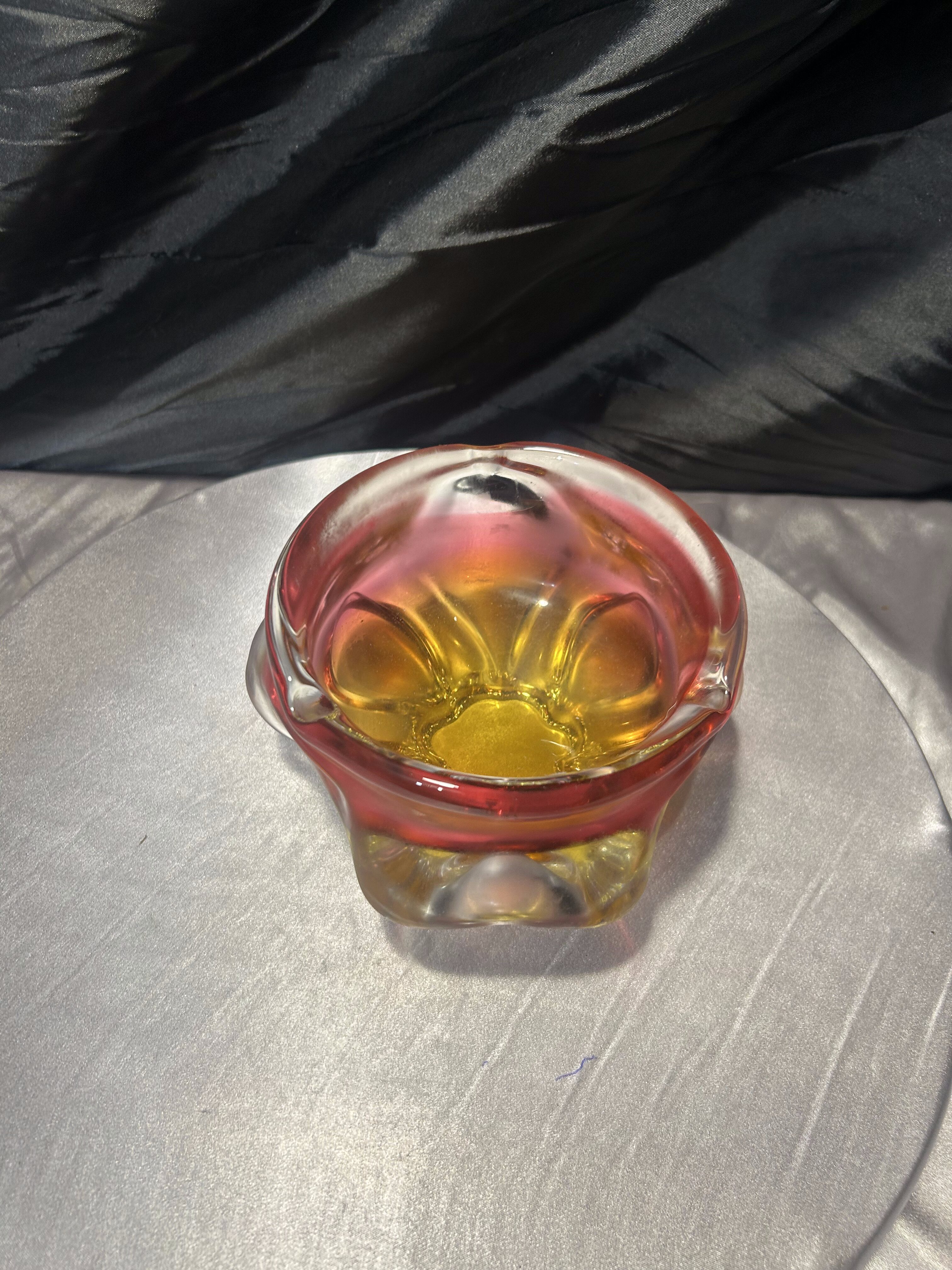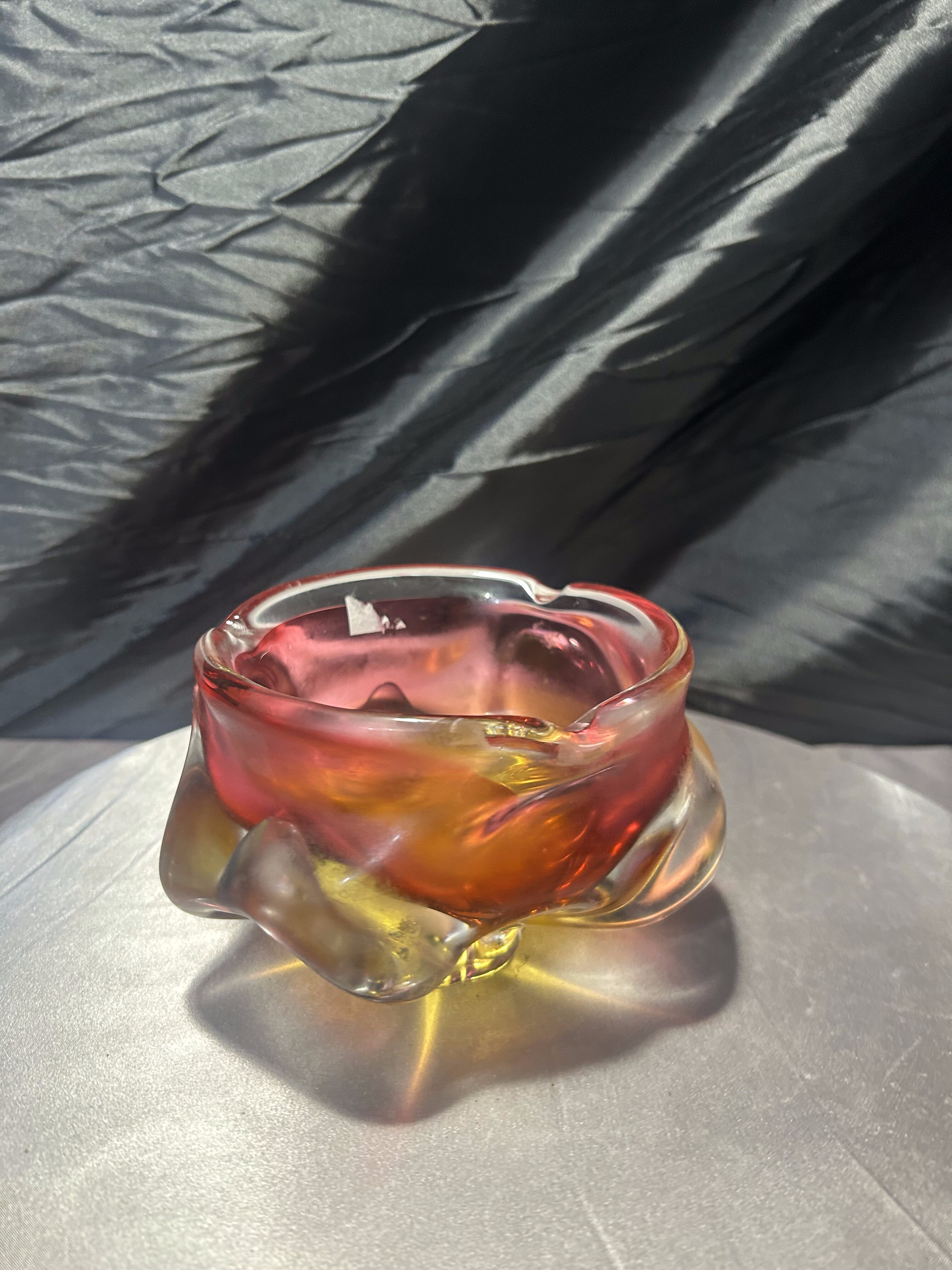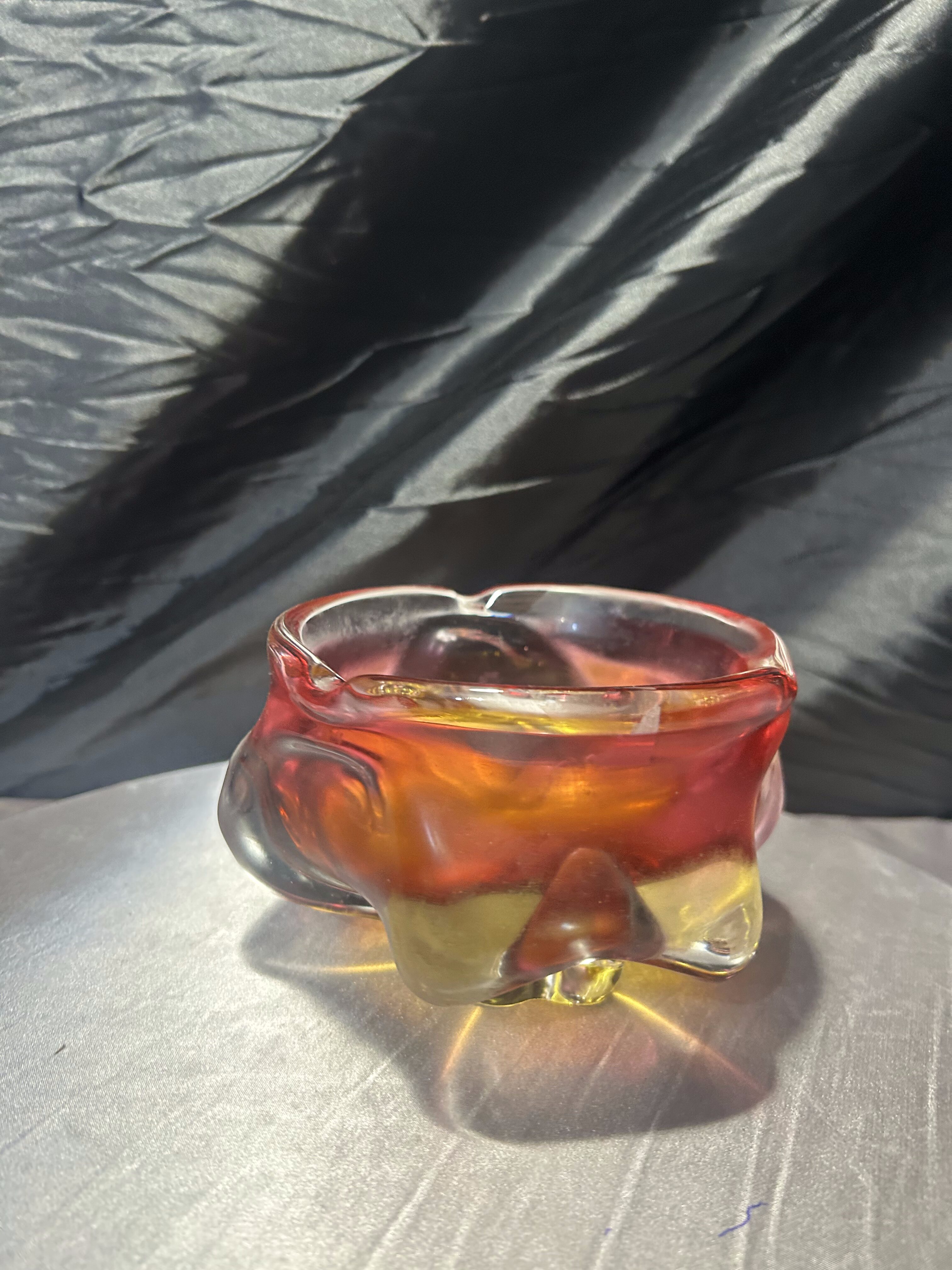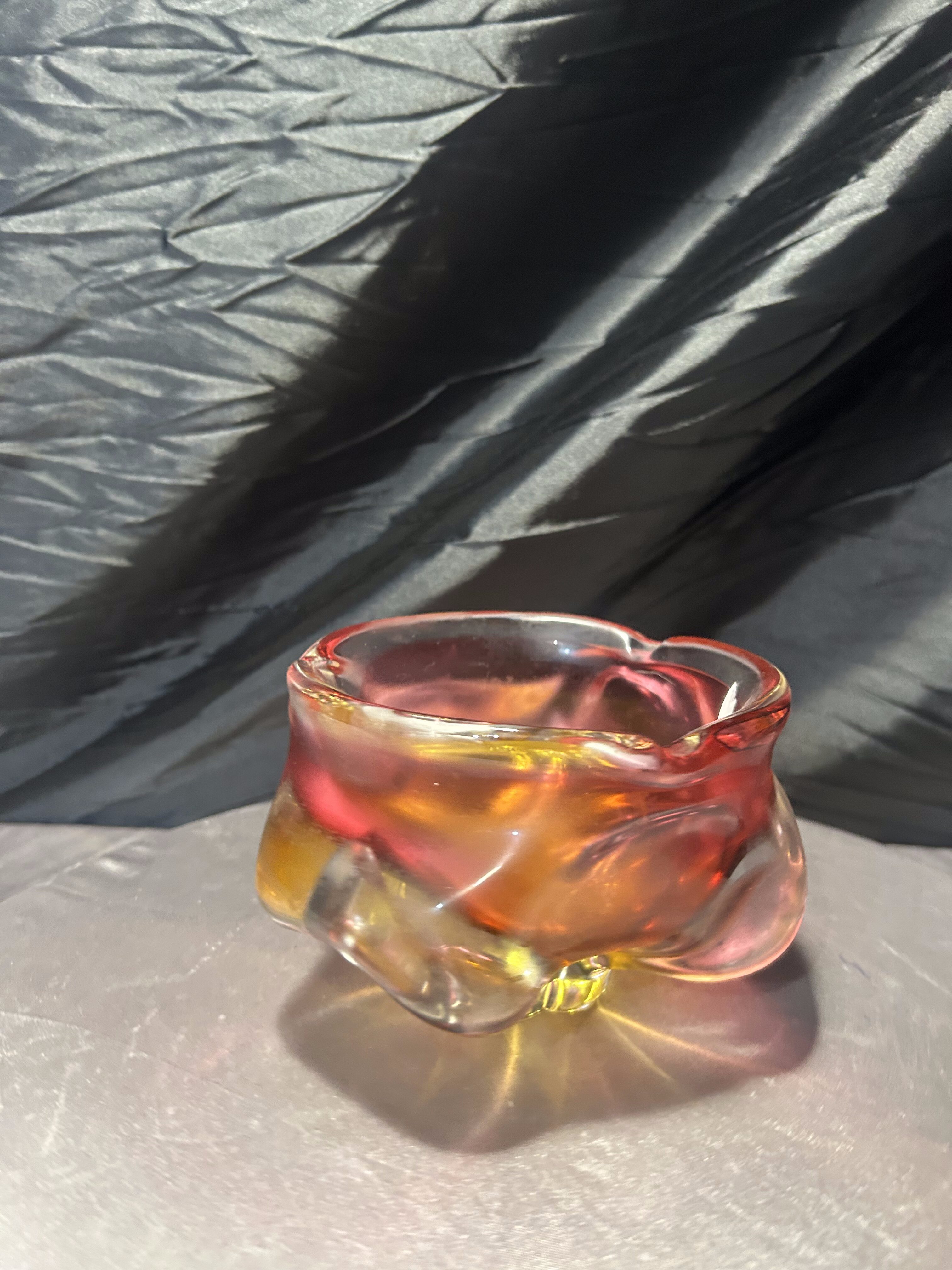 Połączenie intensywnych kolorów – żółci, czerwieni i subtelnych przejść barwnych – podkreśla mistrzostwo pracy z barwioną masą szklaną. Misa zmienia swój wygląd w zależności od kąta padania światła, tworząc spektakularne refleksy i dodając wnętrzu eleganckiego, artystycznego charakteru. To znakomity przykład czeskiego designu z okresu Modernizmu i kolekcjonerski przedmiot o wysokiej wartości dekoracyjnej.