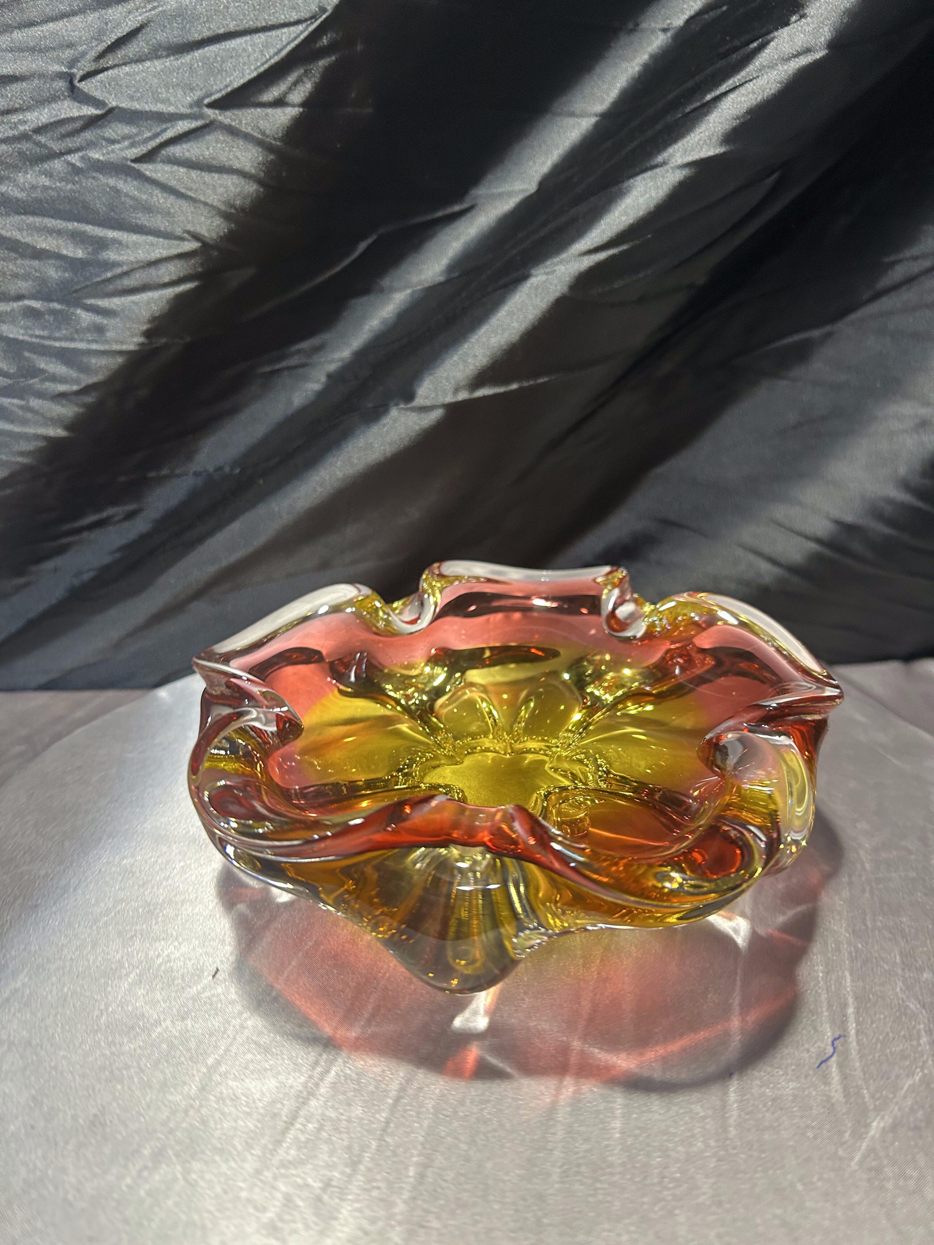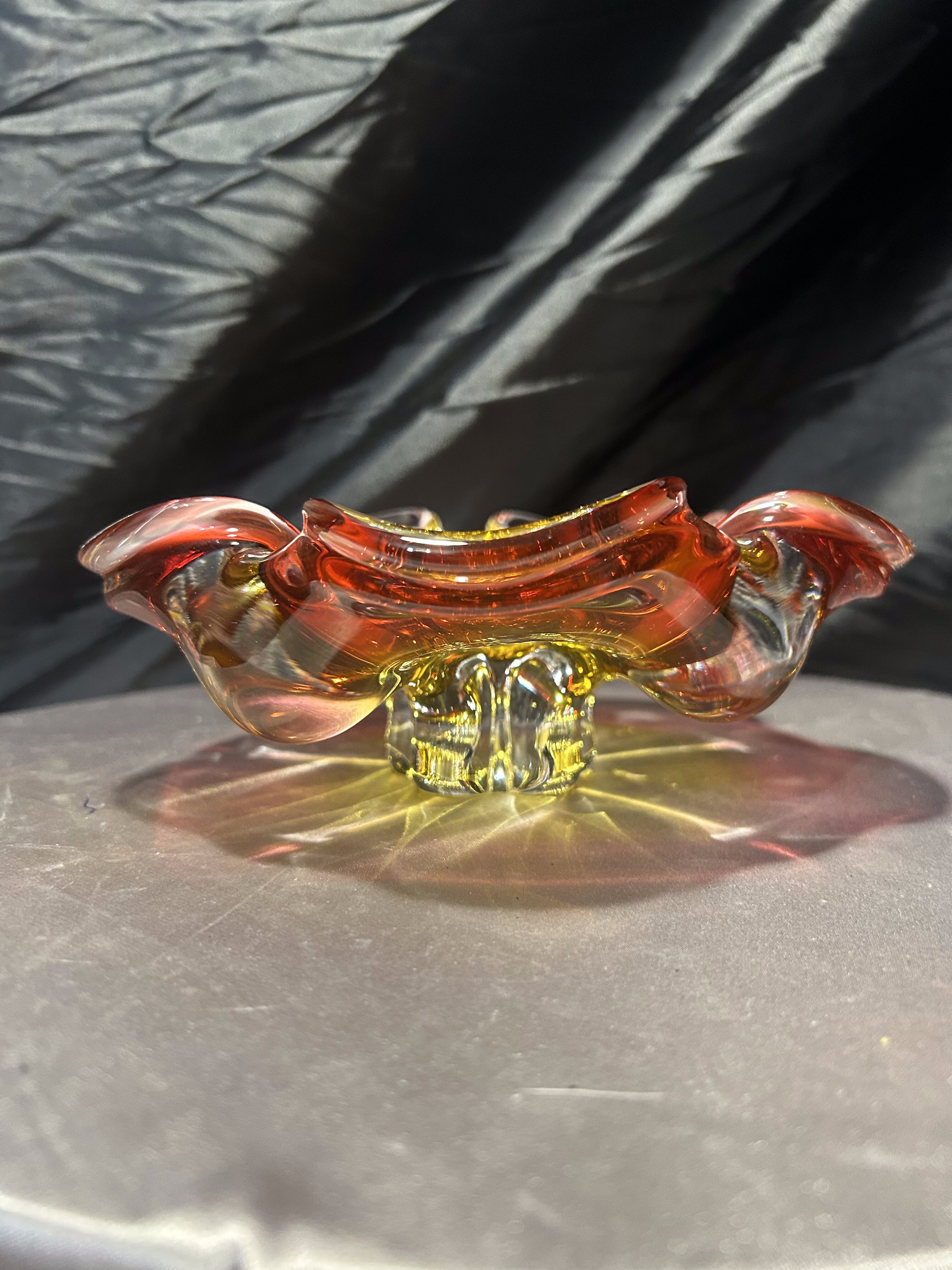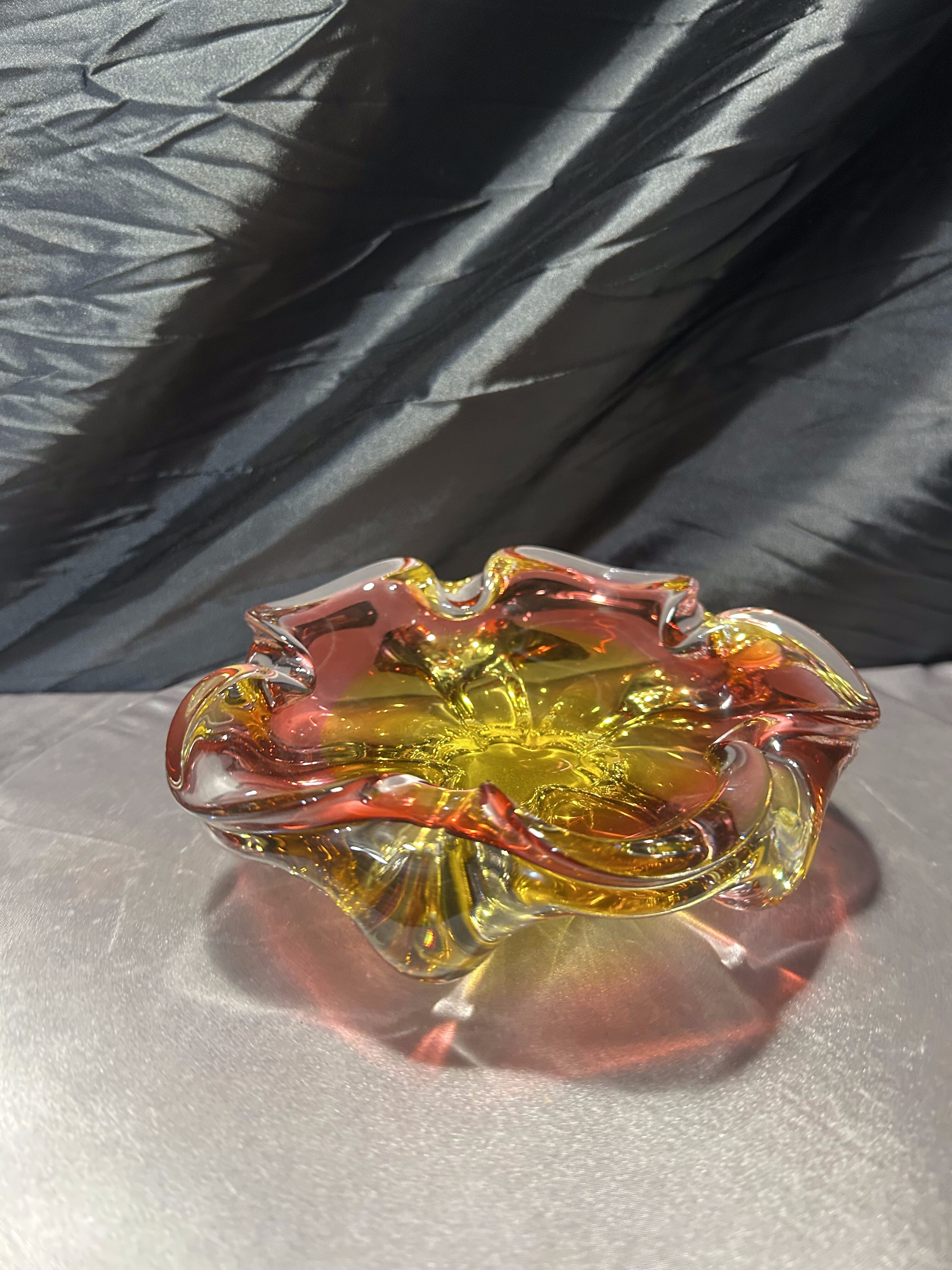 Misa zachwyca intensywną kolorystyką: ciepłe odcienie żółci i czerwieni przenikają przez siebie w masie szkła, tworząc spektakularny efekt świetlny. Każde odbicie światła wydobywa nowe niuanse barwy i strukturę szkła, nadając całości wyjątkowego, kolekcjonerskiego charakteru. Jest to dekoracja nie tylko efektowna, ale również bardzo elegancka – idealna do salonu, jadalni lub jako akcent w witrynie.