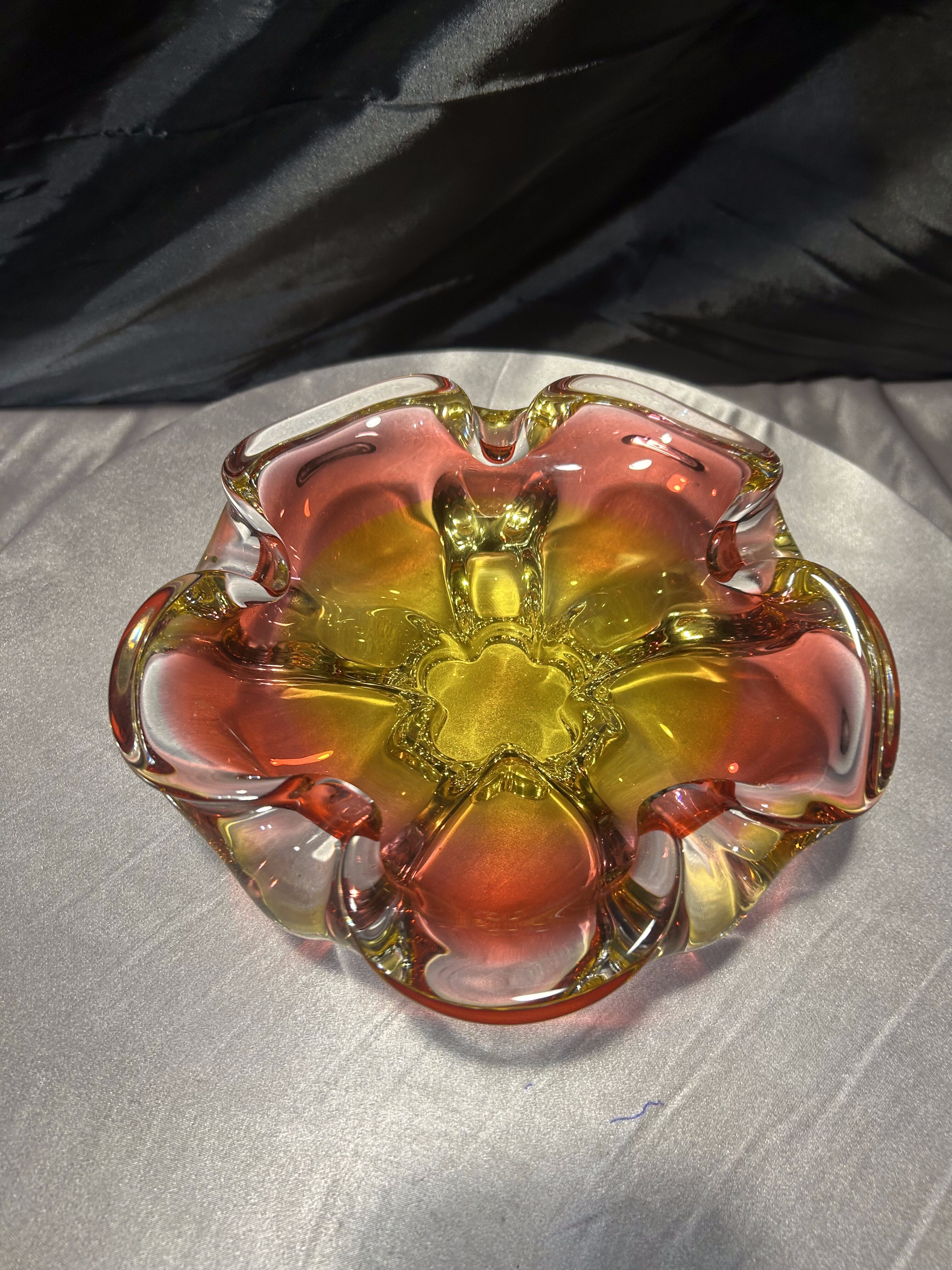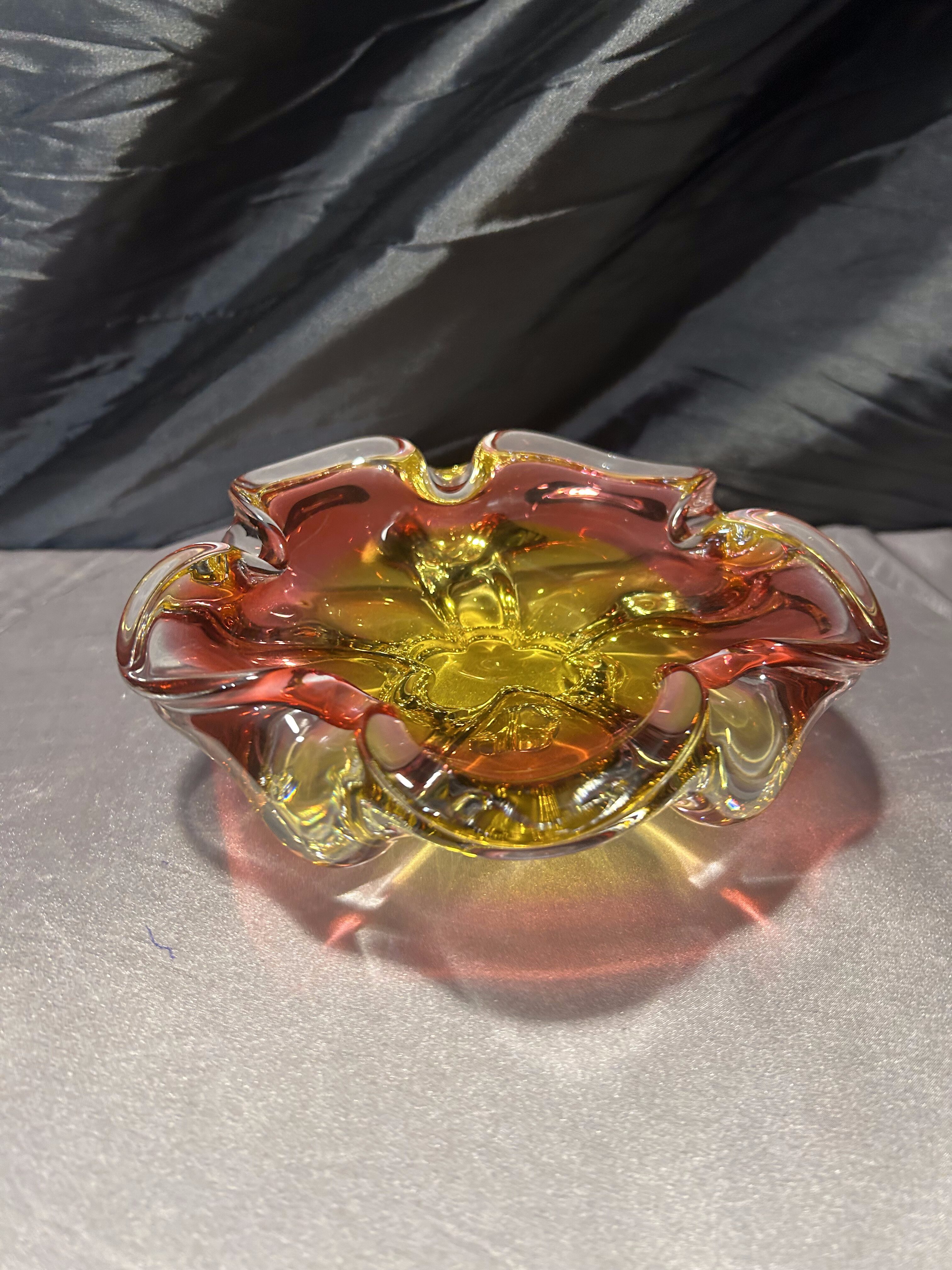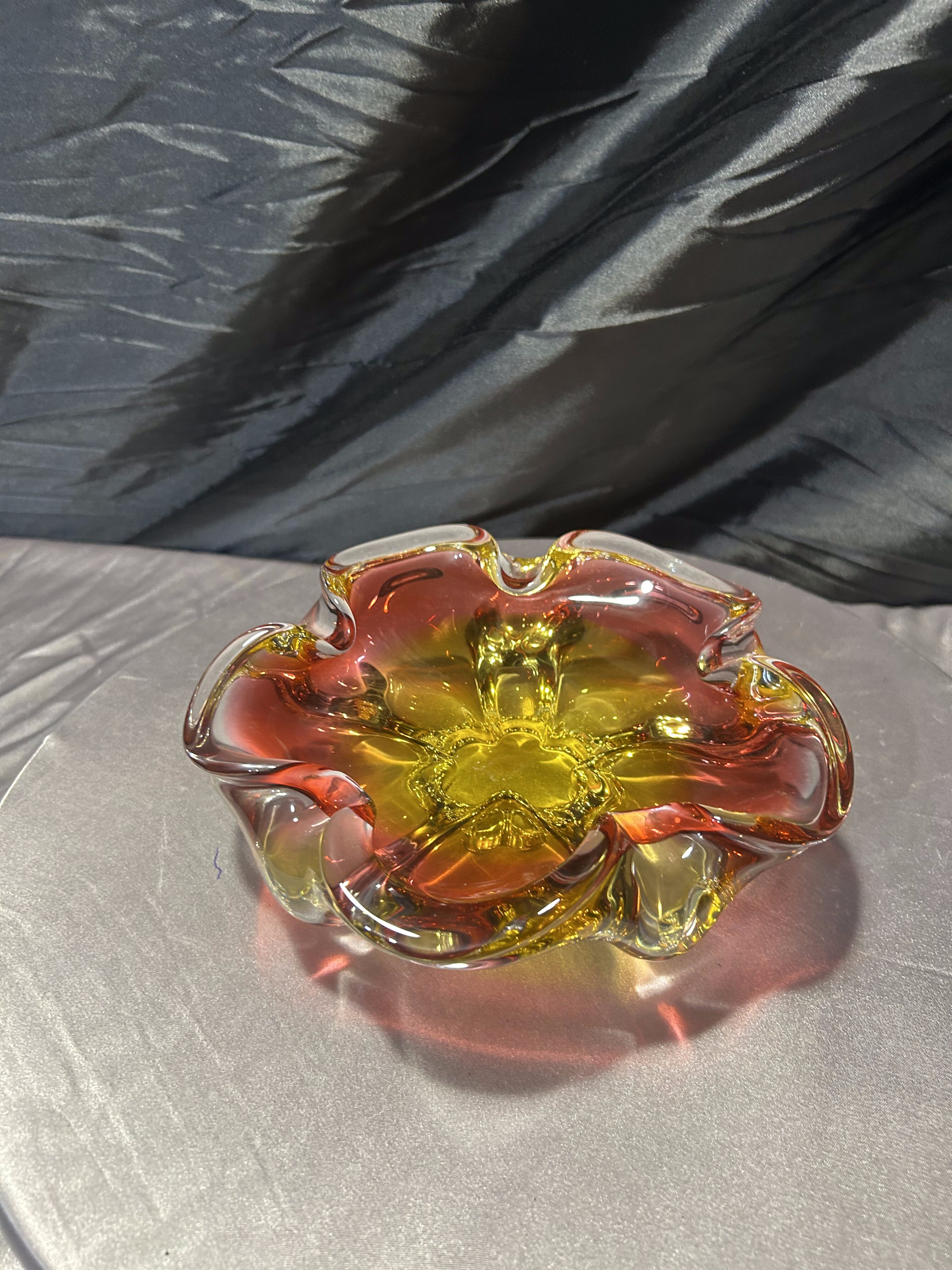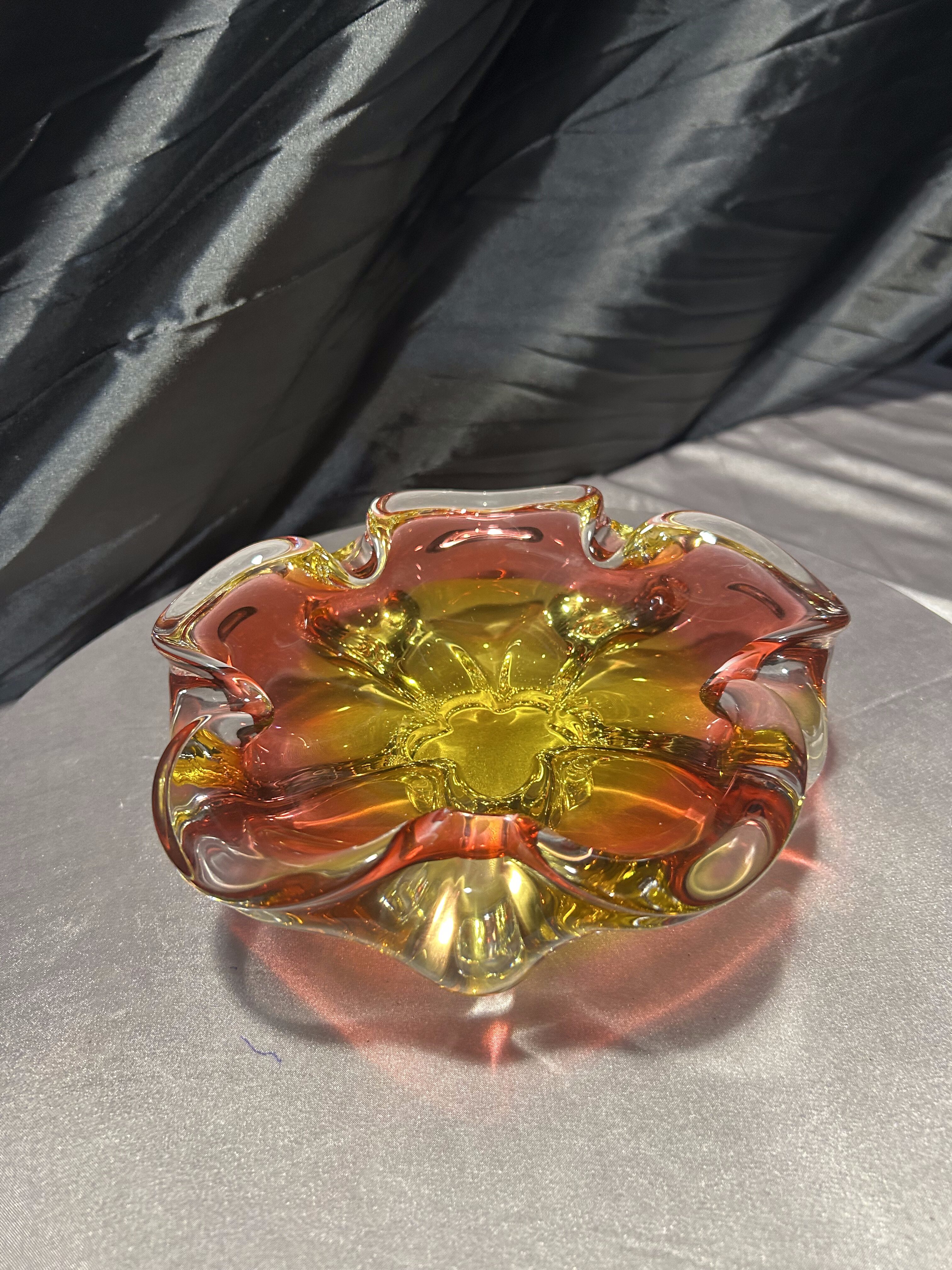 Misa zachwyca intensywną kolorystyką: ciepłe odcienie żółci i czerwieni przenikają przez siebie w masie szkła, tworząc spektakularny efekt świetlny. Każde odbicie światła wydobywa nowe niuanse barwy i strukturę szkła, nadając całości wyjątkowego, kolekcjonerskiego charakteru. Jest to dekoracja nie tylko efektowna, ale również bardzo elegancka – idealna do salonu, jadalni lub jako akcent w witrynie.