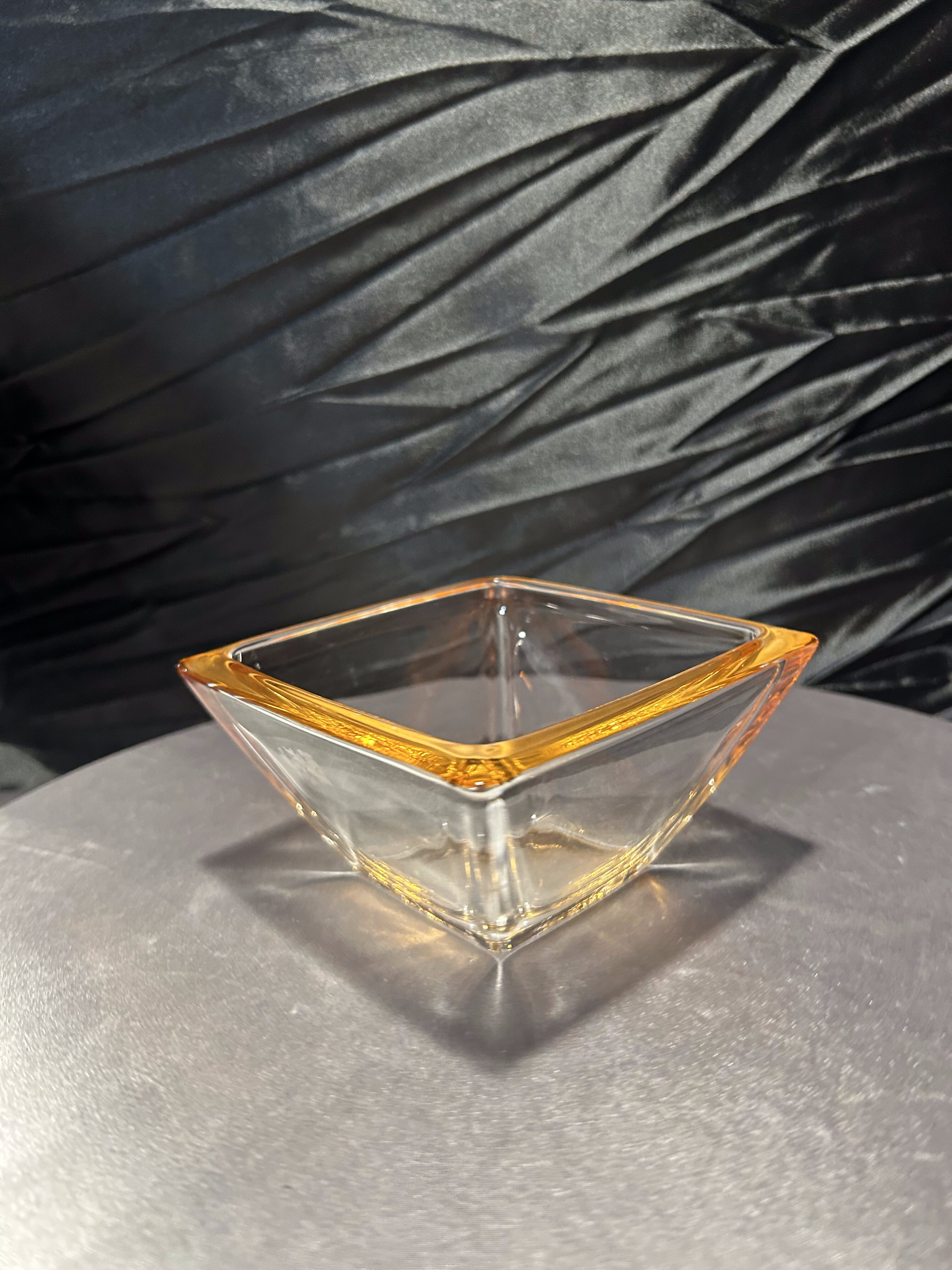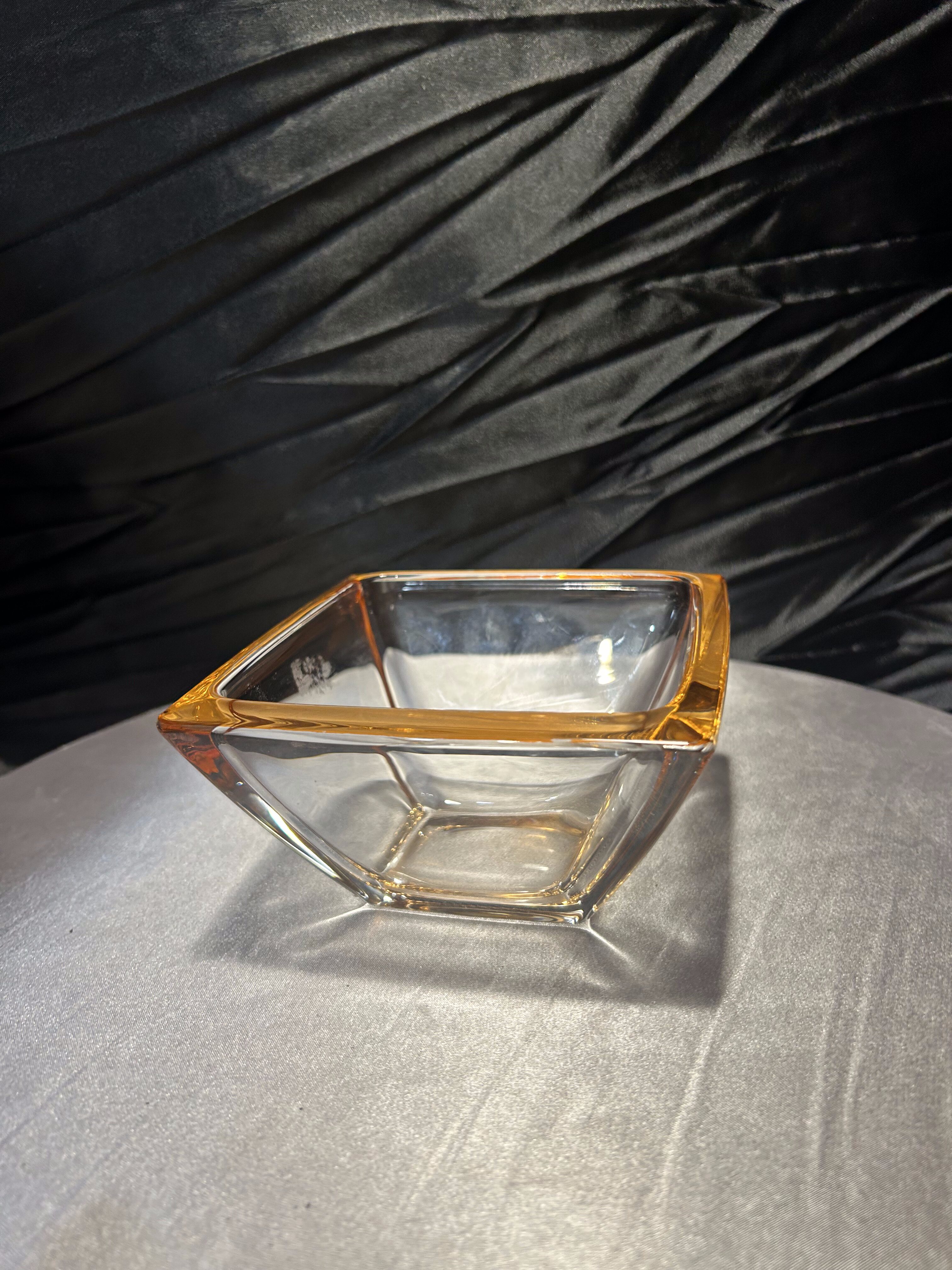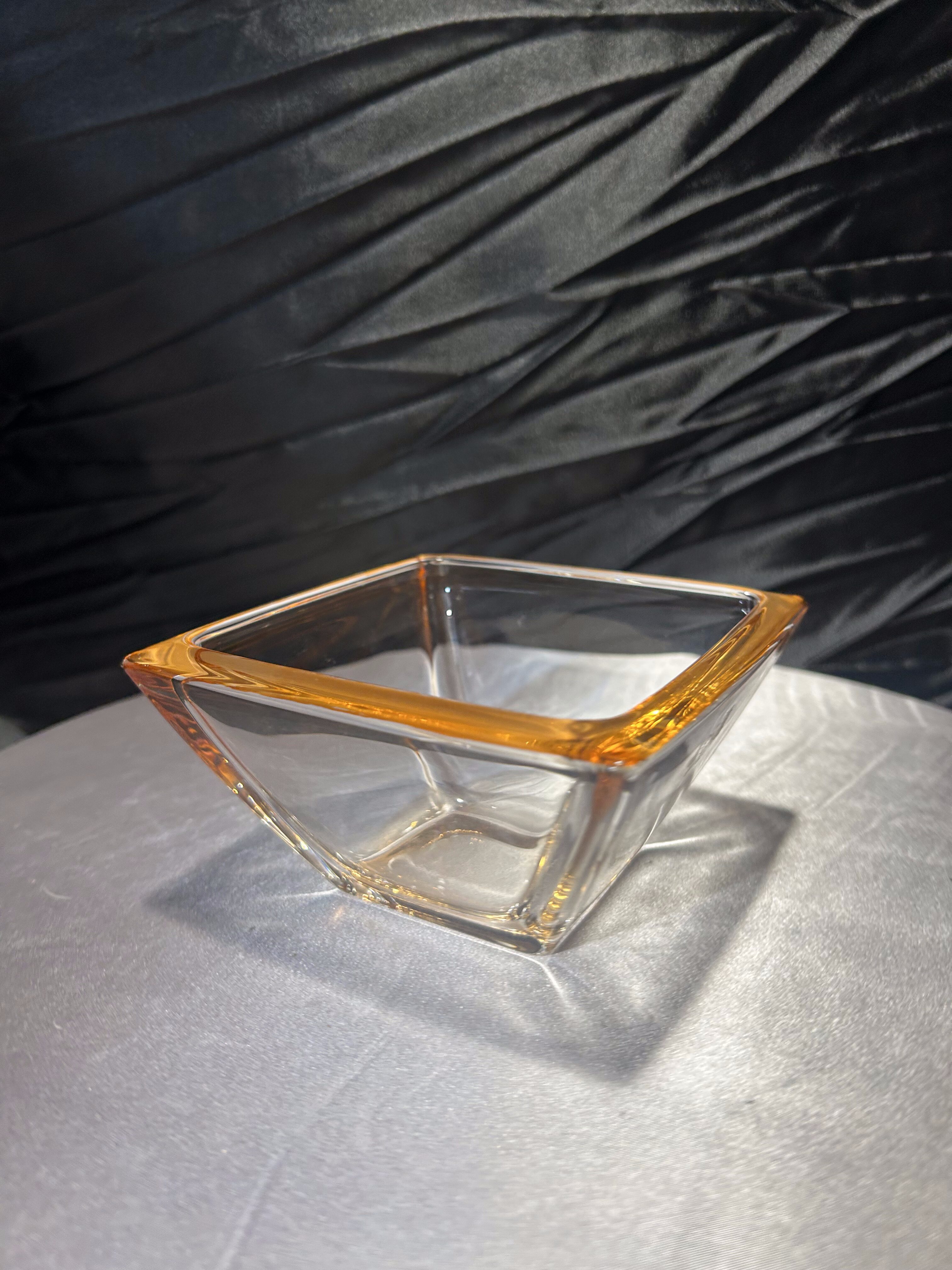Nowoczesna szklana misa o geometrycznej, kwadratowej formie, której boki rozszerzają się ku górze. Przejrzyste szkło z delikatnym pomarańczowym akcentem wzdłuż krawędzi nadaje jej wyjątkowego charakteru i subtelnie ożywia kompozycję. Dzięki prostej, ale efektownej formie, misa doskonale sprawdzi się jako naczynie na owoce, słodycze lub przekąski, a także jako samodzielna ozdoba stołu. Transparentne ścianki pięknie odbijają światło, podkreślając barwny detal.