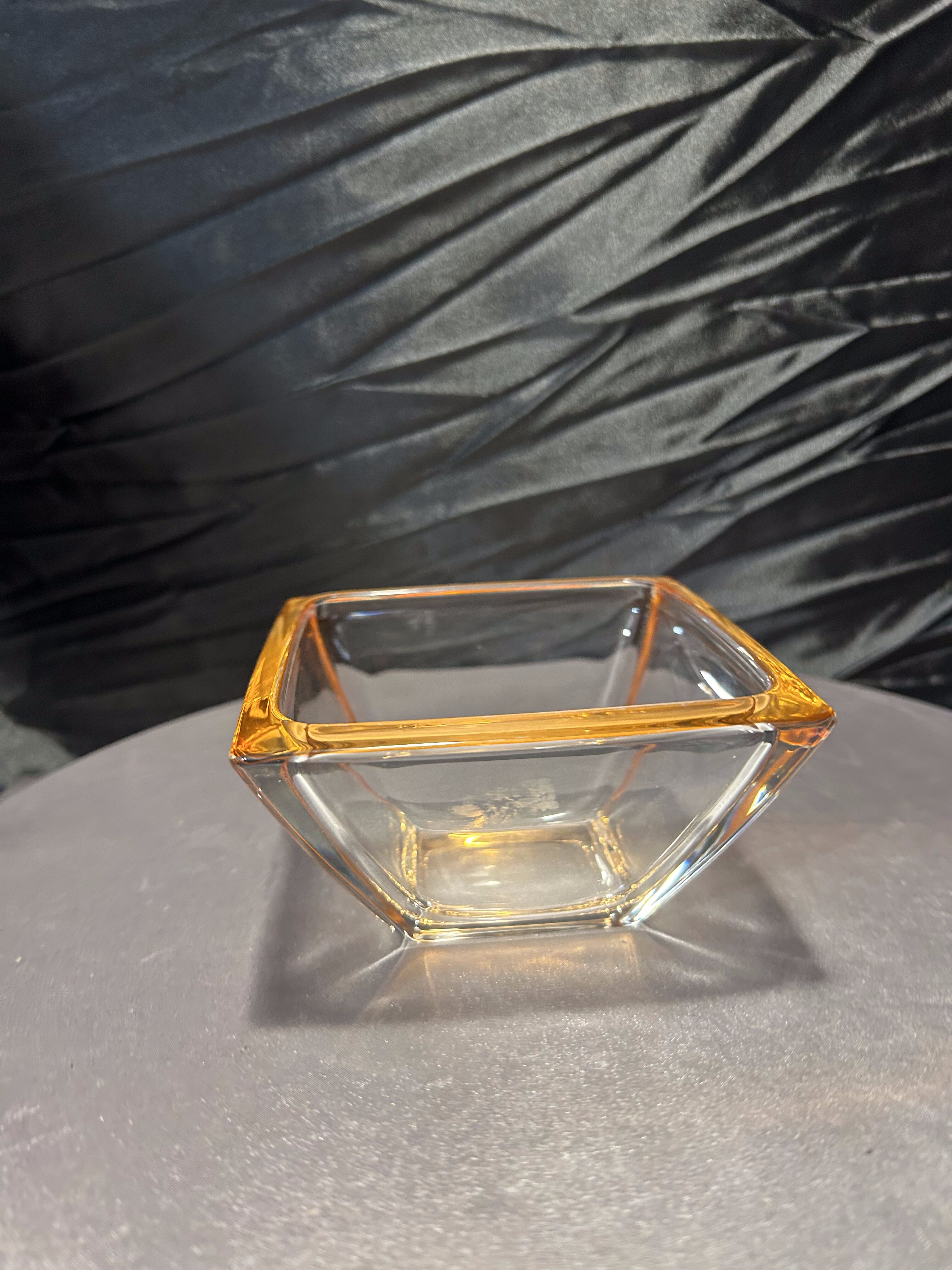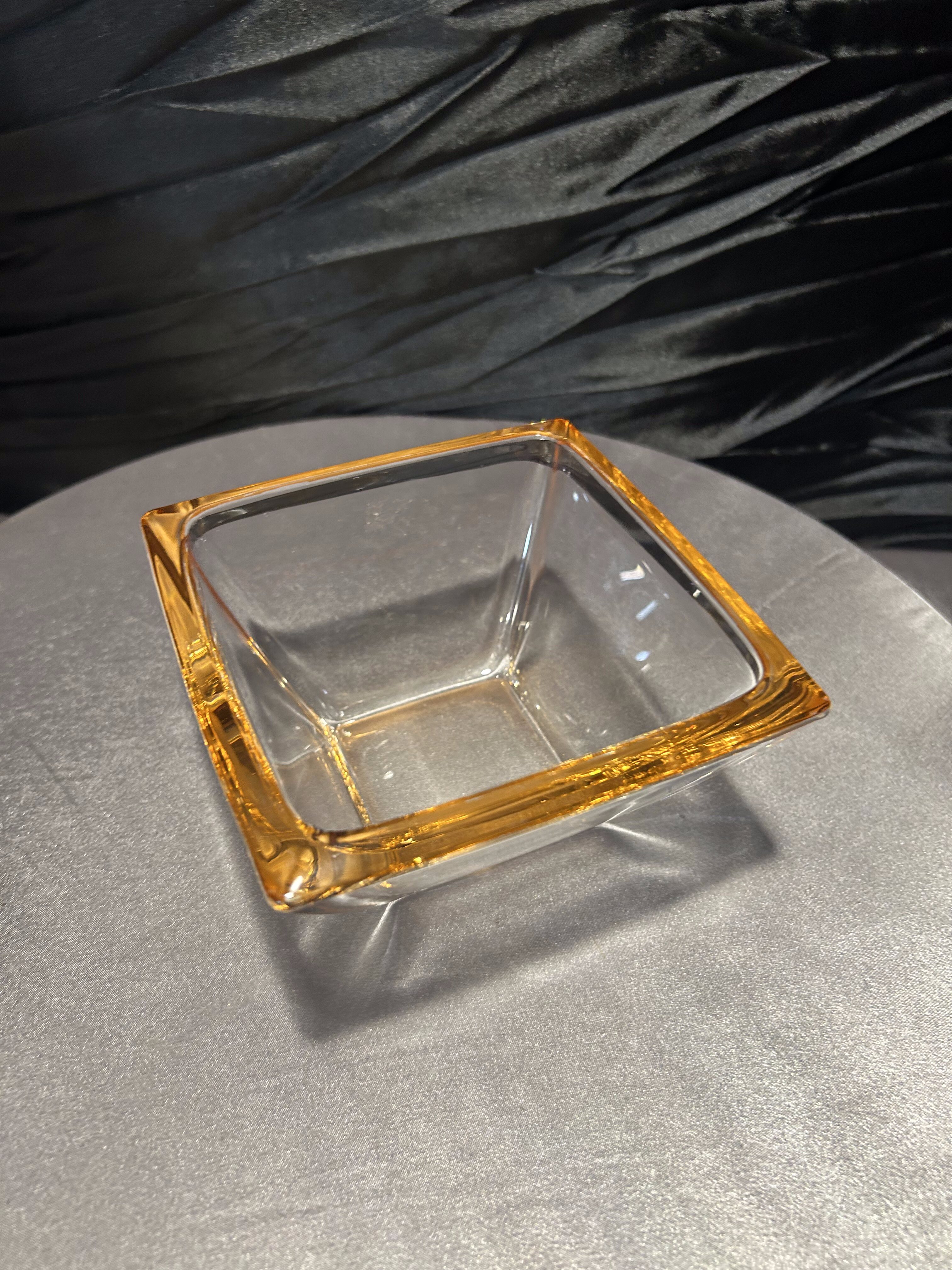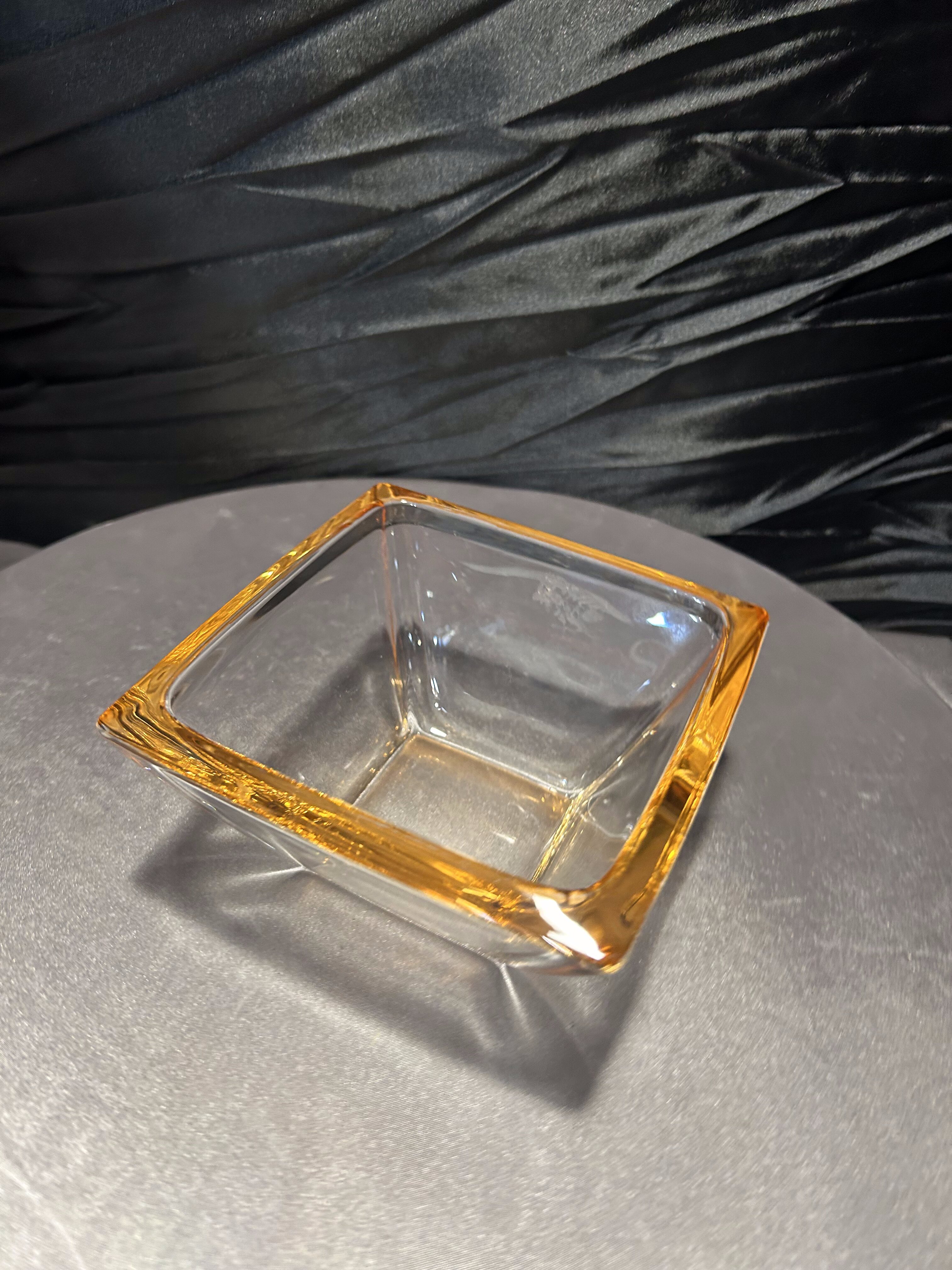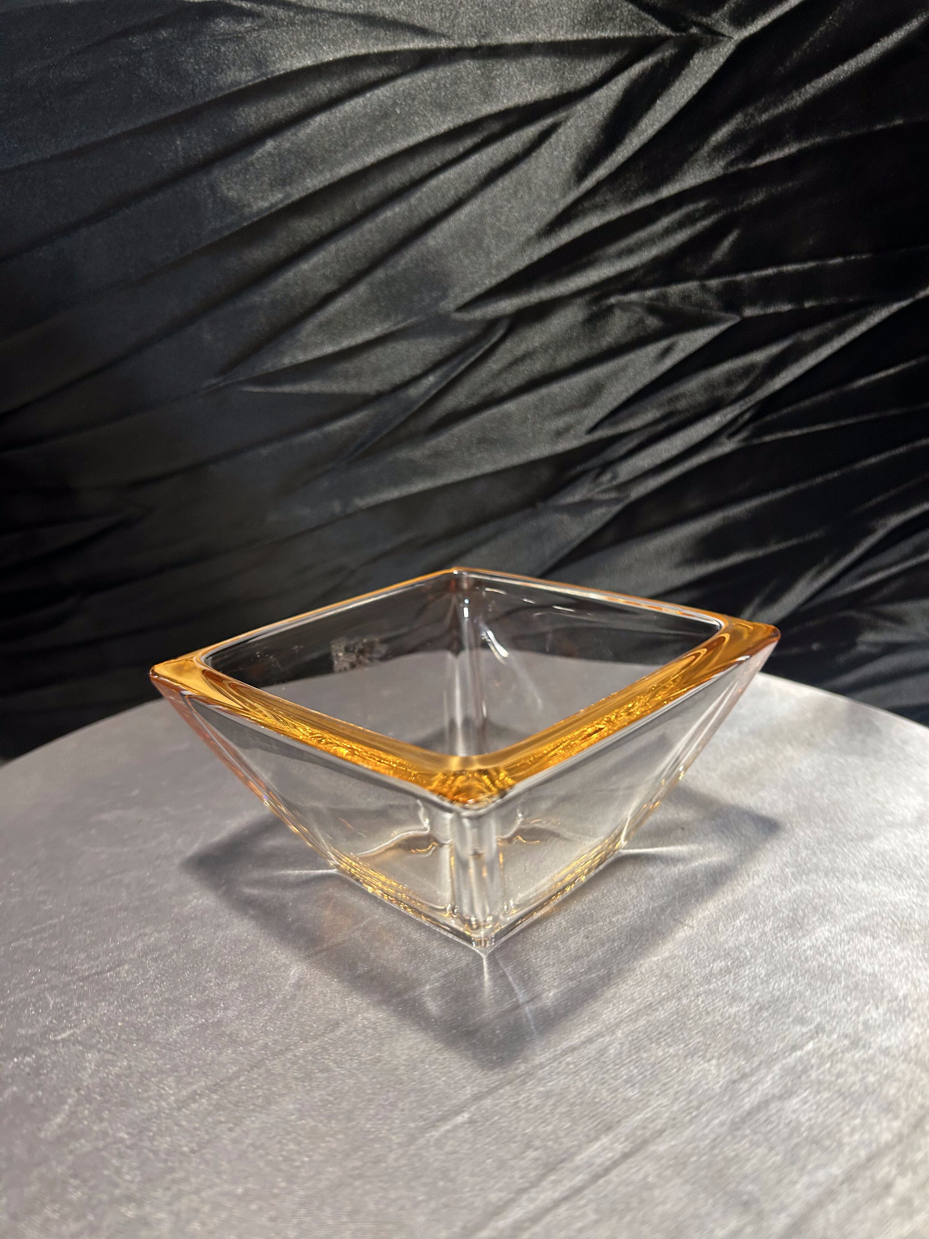 Nowoczesna szklana misa o geometrycznej, kwadratowej formie, której boki rozszerzają się ku górze. Przejrzyste szkło z delikatnym pomarańczowym akcentem wzdłuż krawędzi nadaje jej wyjątkowego charakteru i subtelnie ożywia kompozycję. Dzięki prostej, ale efektownej formie, misa doskonale sprawdzi się jako naczynie na owoce, słodycze lub przekąski, a także jako samodzielna ozdoba stołu. Transparentne ścianki pięknie odbijają światło, podkreślając barwny detal.
