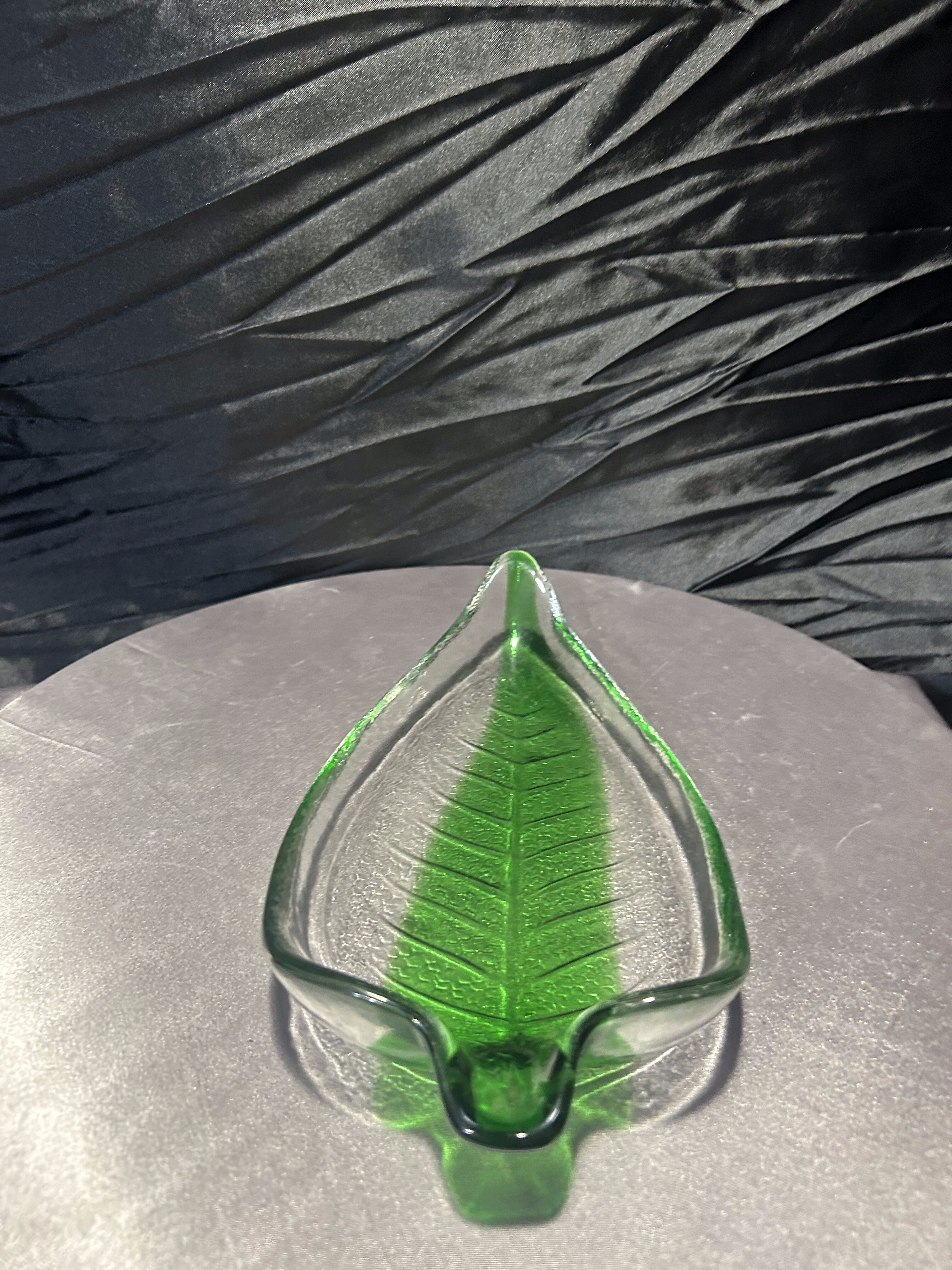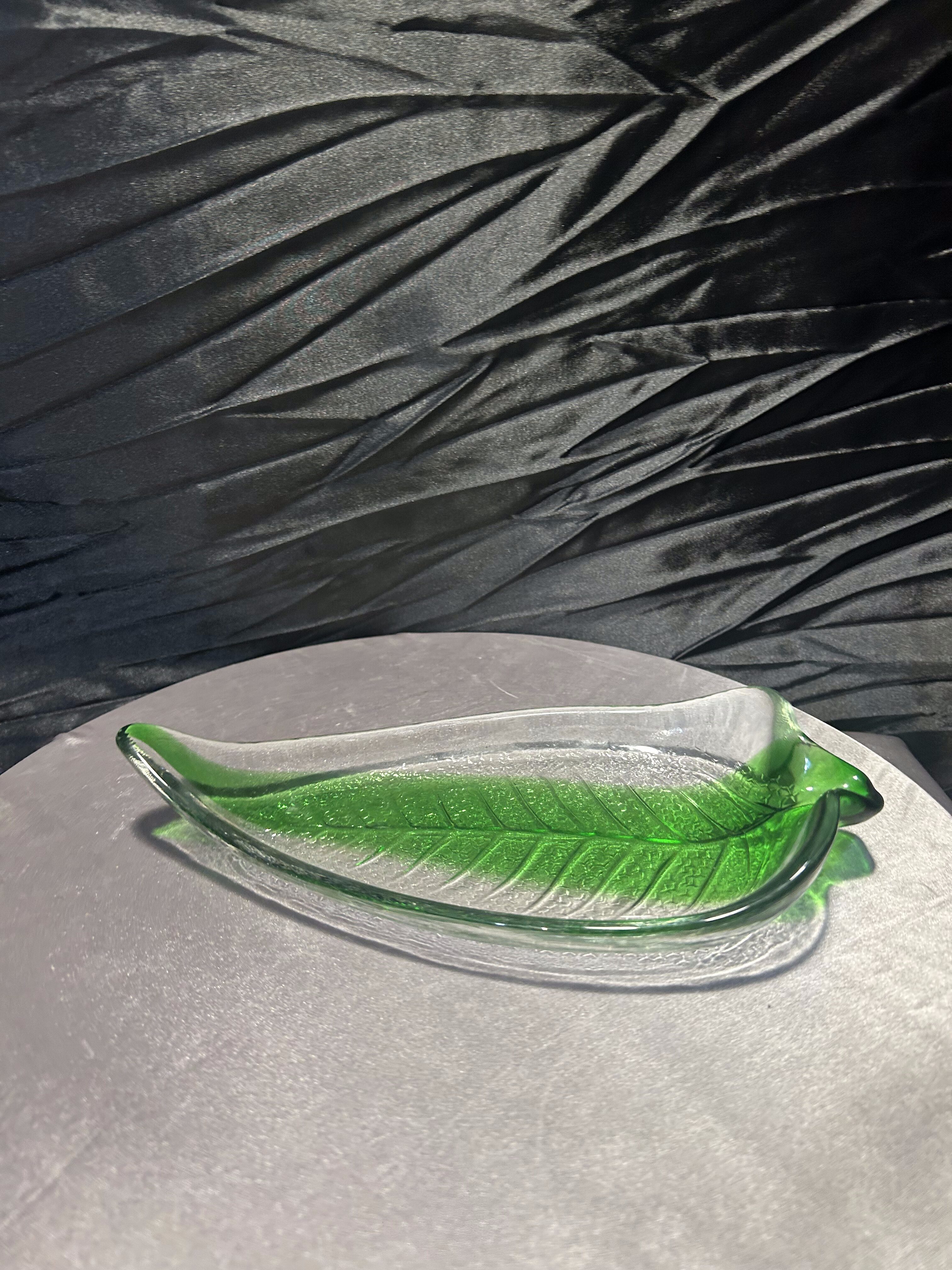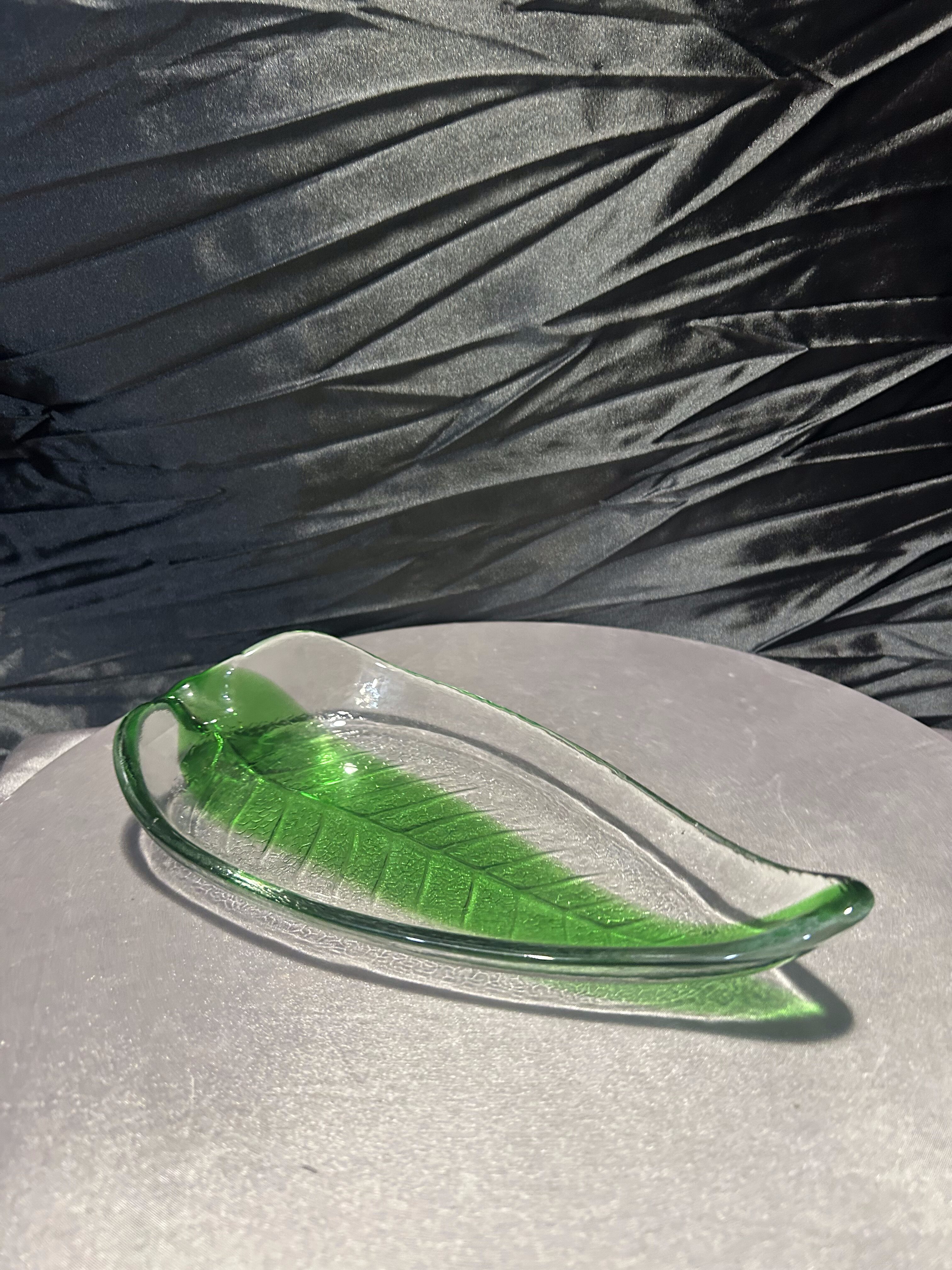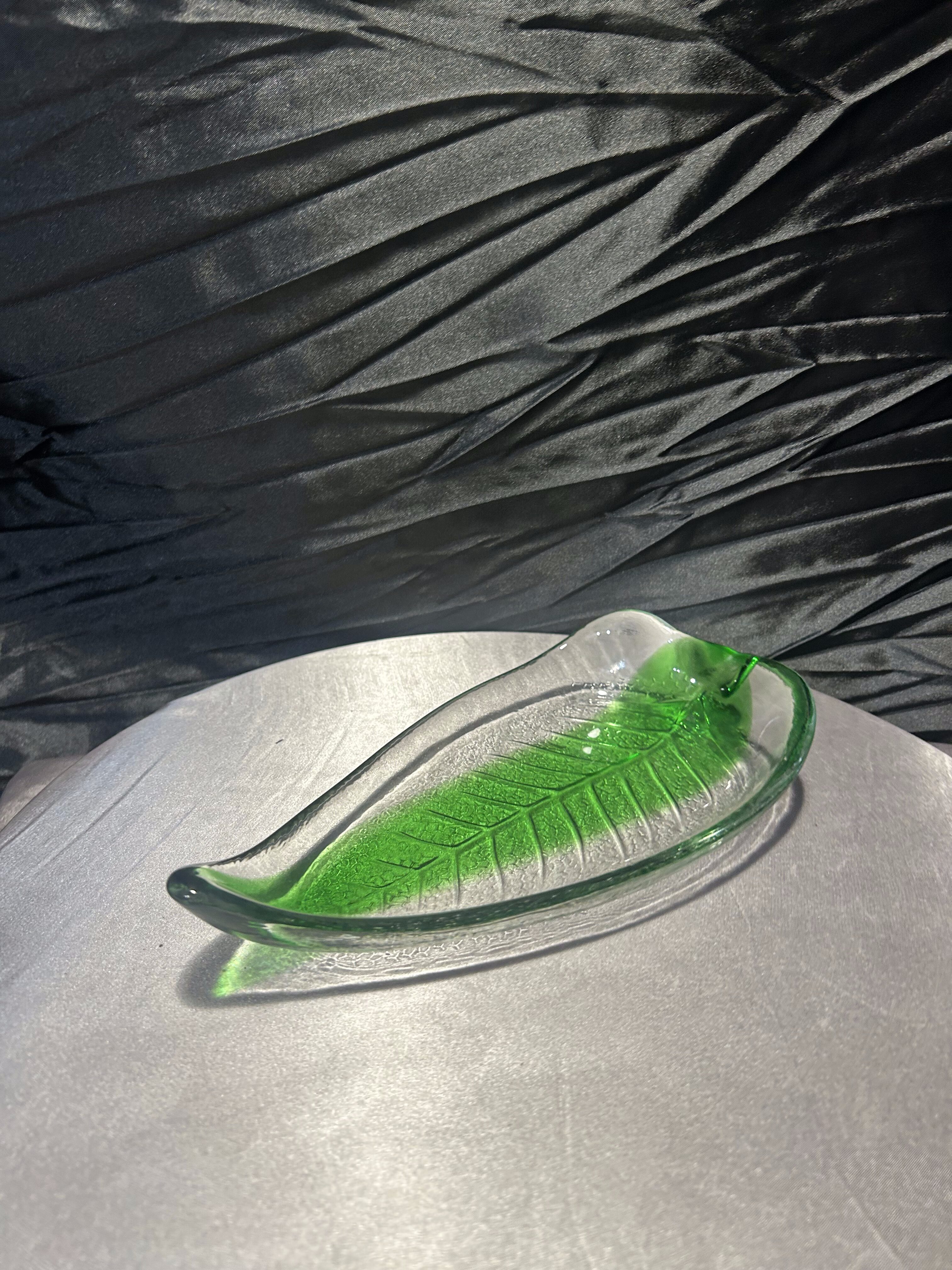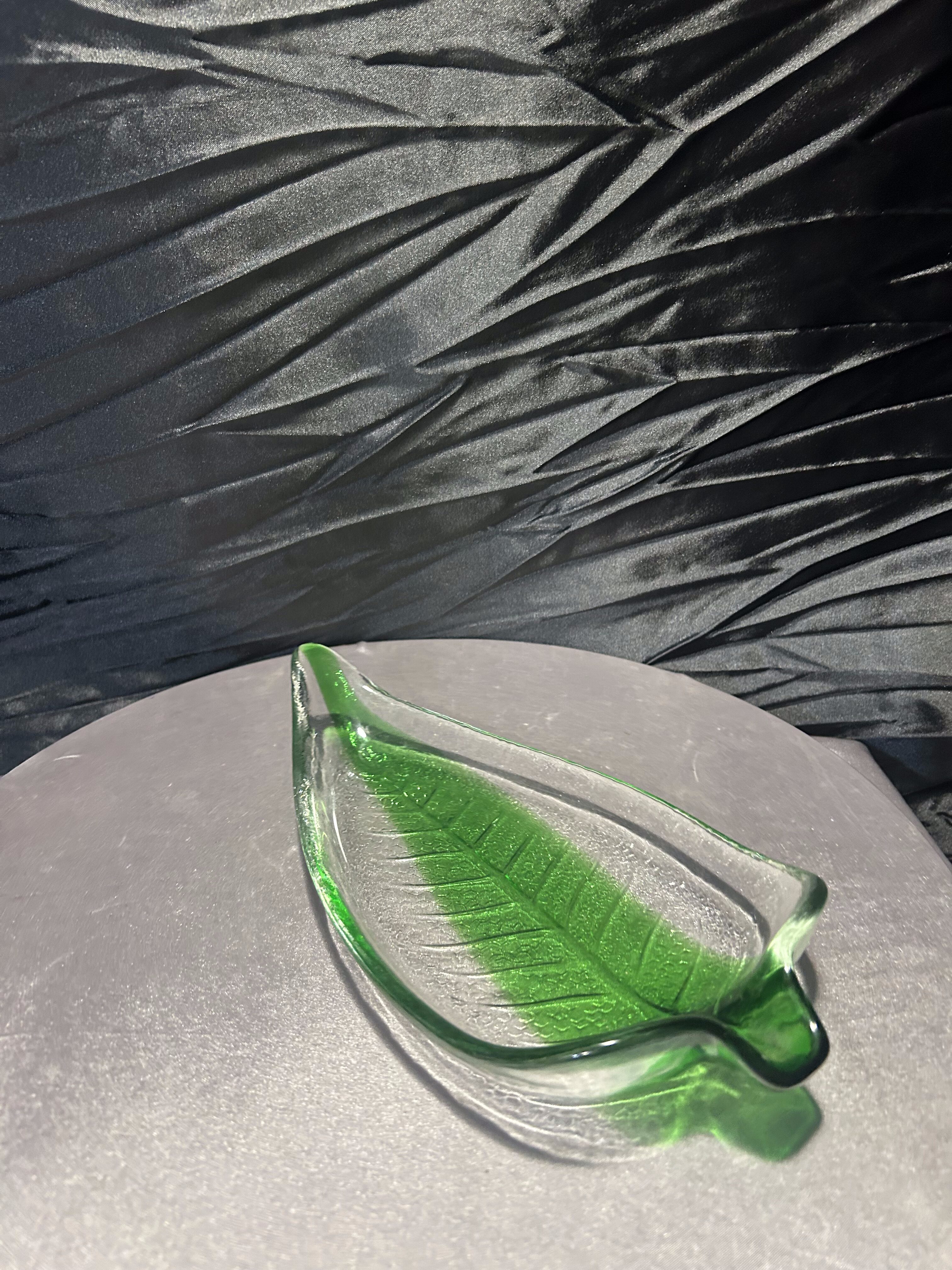 Szklana misa w kształcie liścia z zielonym akcentem – vintage dekoracja