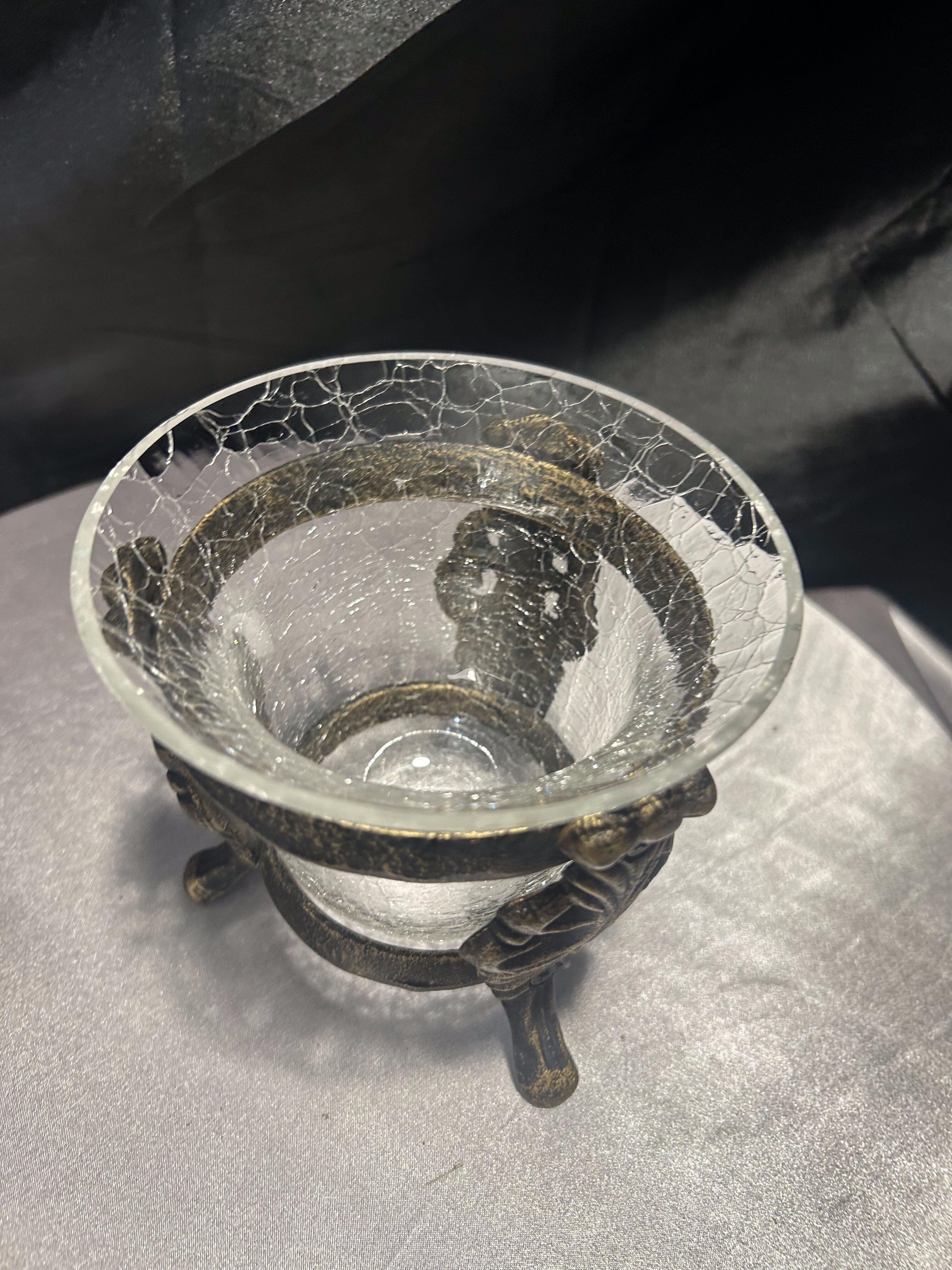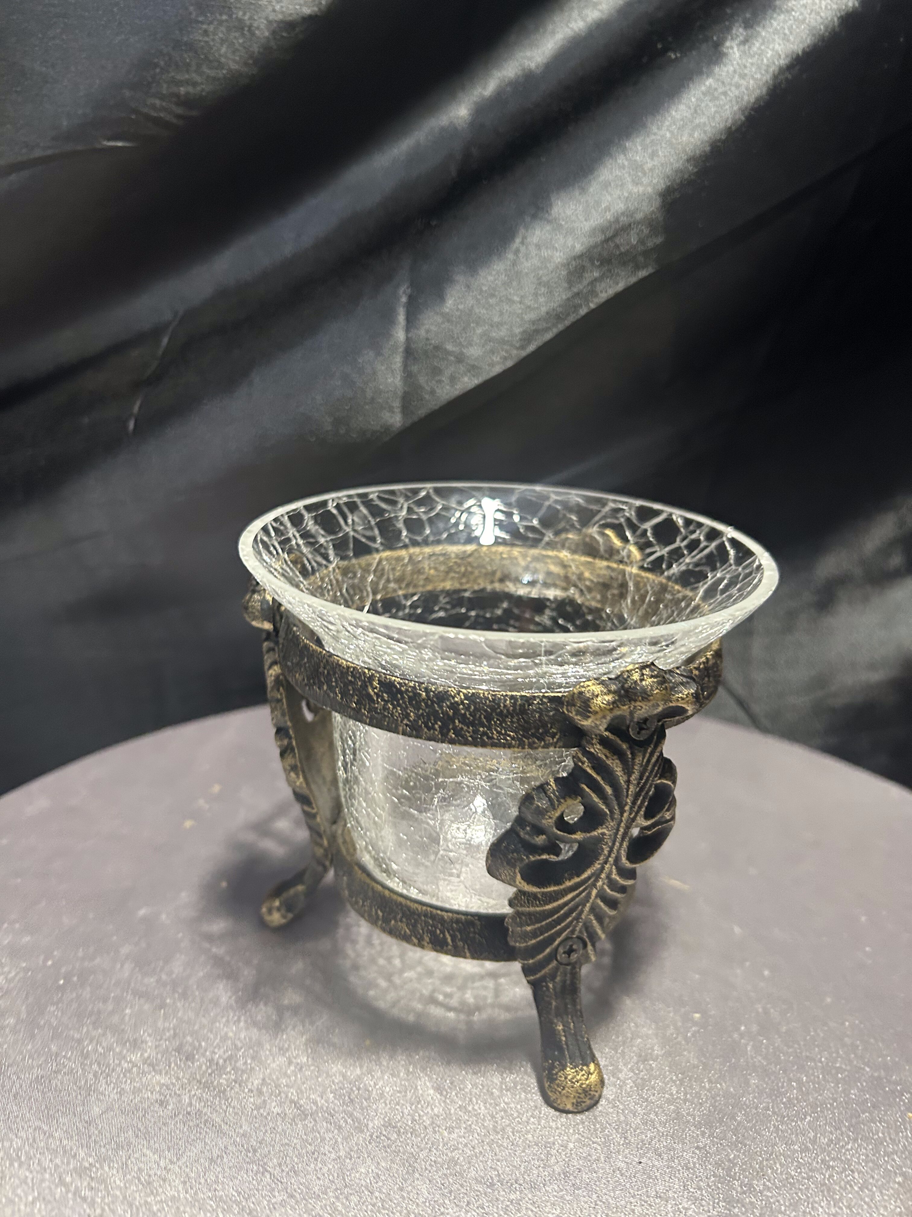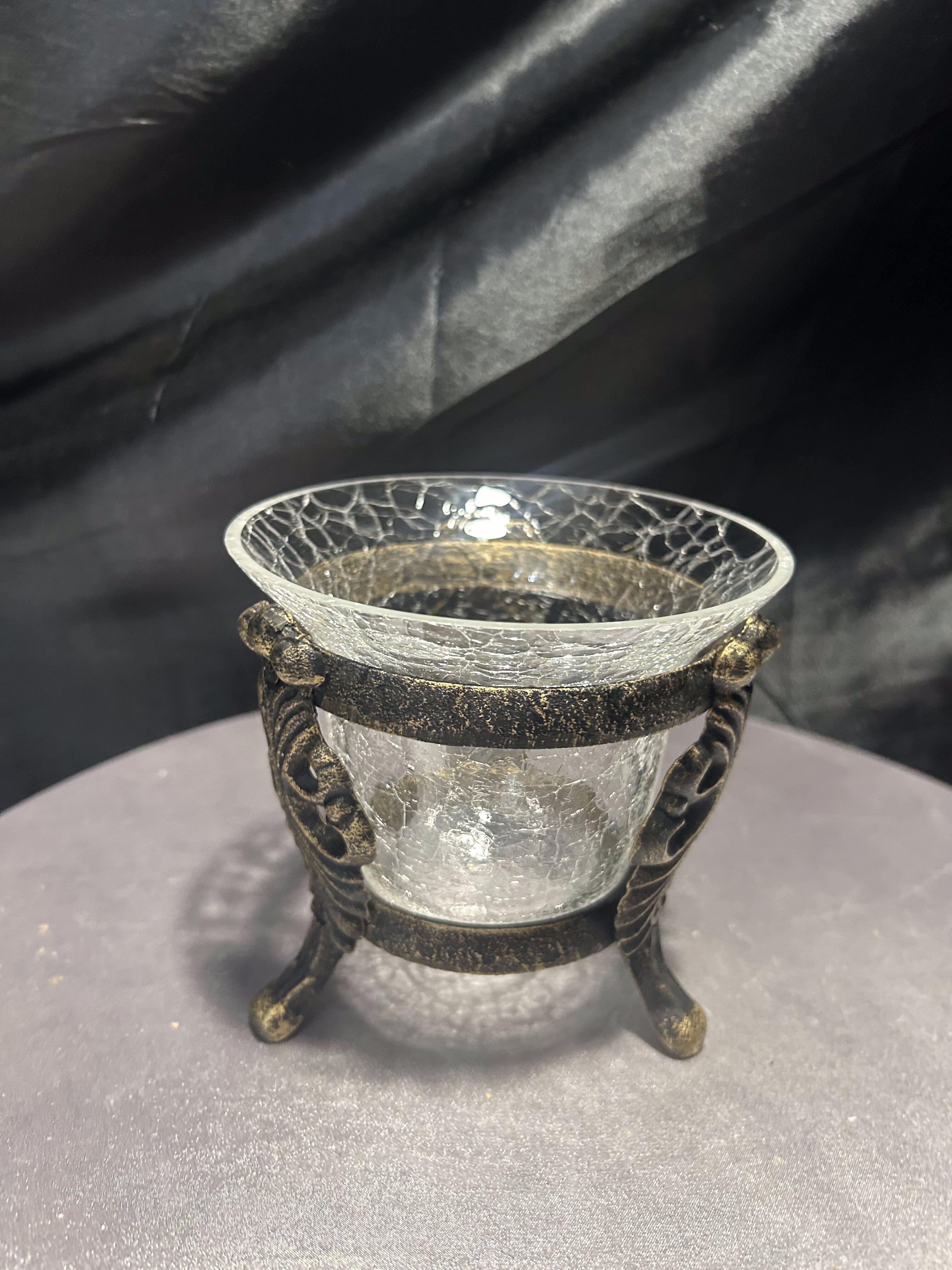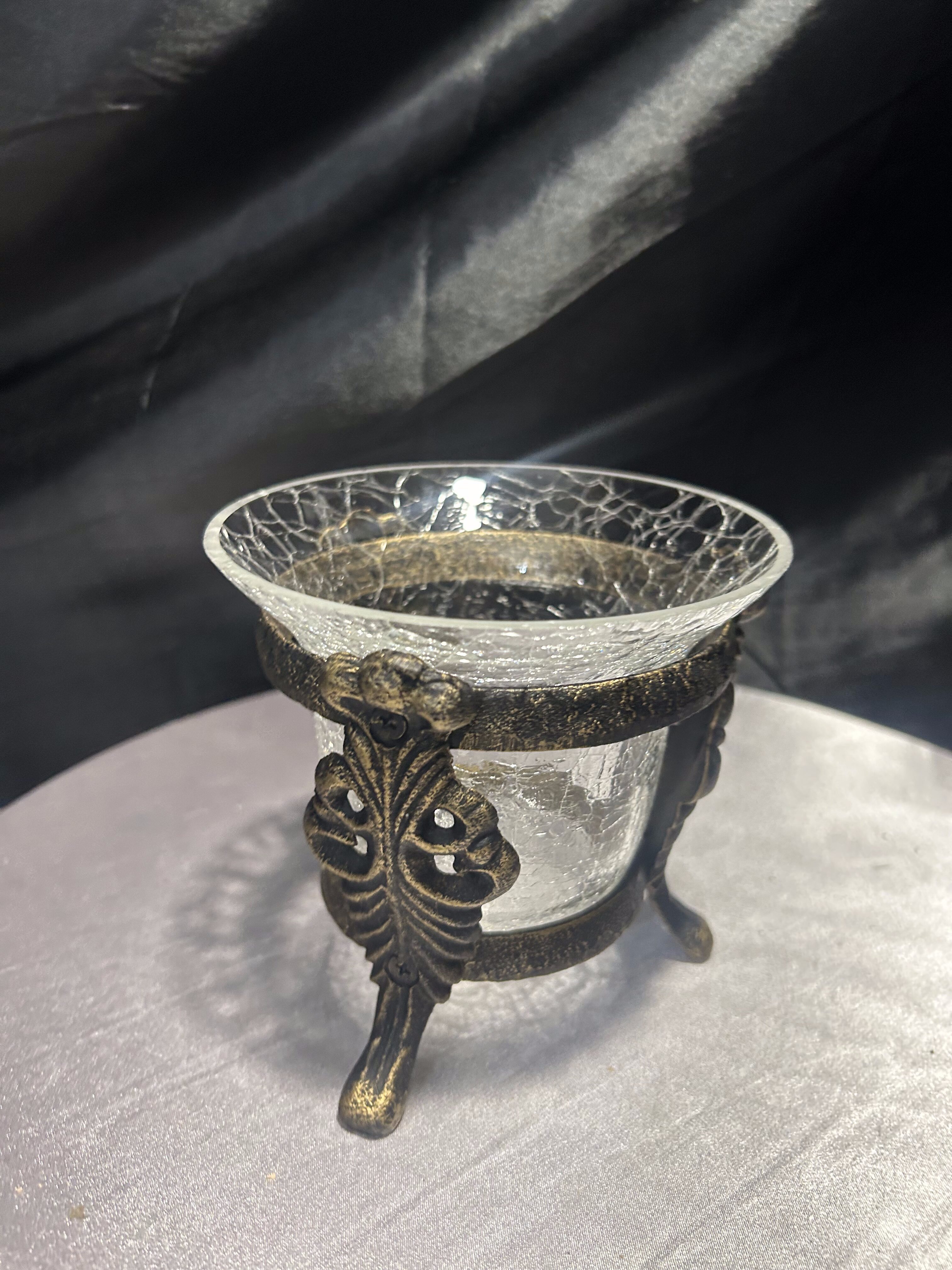 Unikatowa misa dekoracyjna łącząca styl vintage z nutą klasycznej elegancji. Wykonana z popękanego szkła typu „crackle glass”, które przepięknie rozprasza światło. Osadzona w stylizowanym, bogato zdobionym metalowym stelażu o antycznym wykończeniu. Całość przywodzi na myśl dekoracje z epoki secesji i doskonale sprawdzi się jako patera, świecznik lub po prostu nietuzinkowy element wystroju wnętrza.