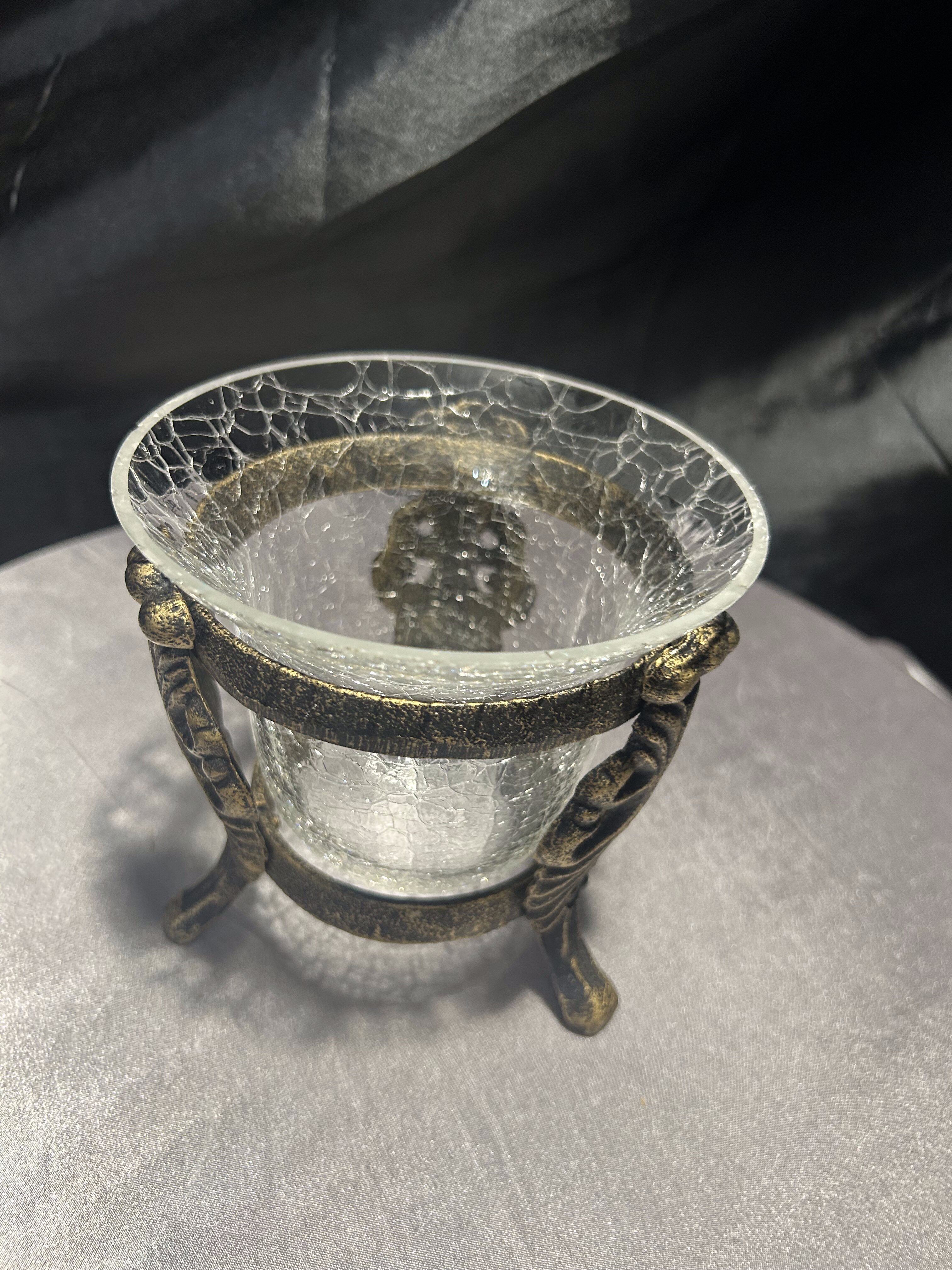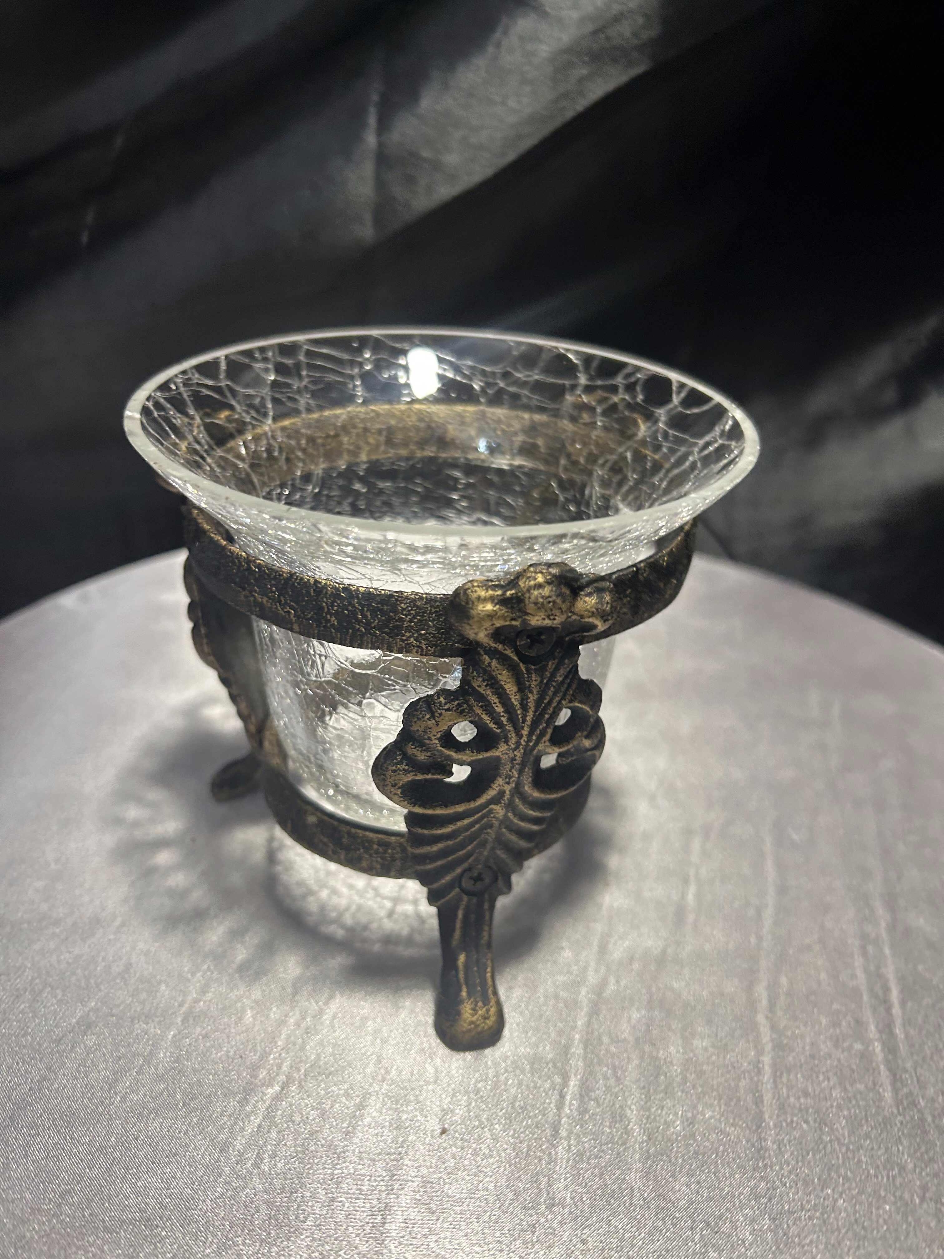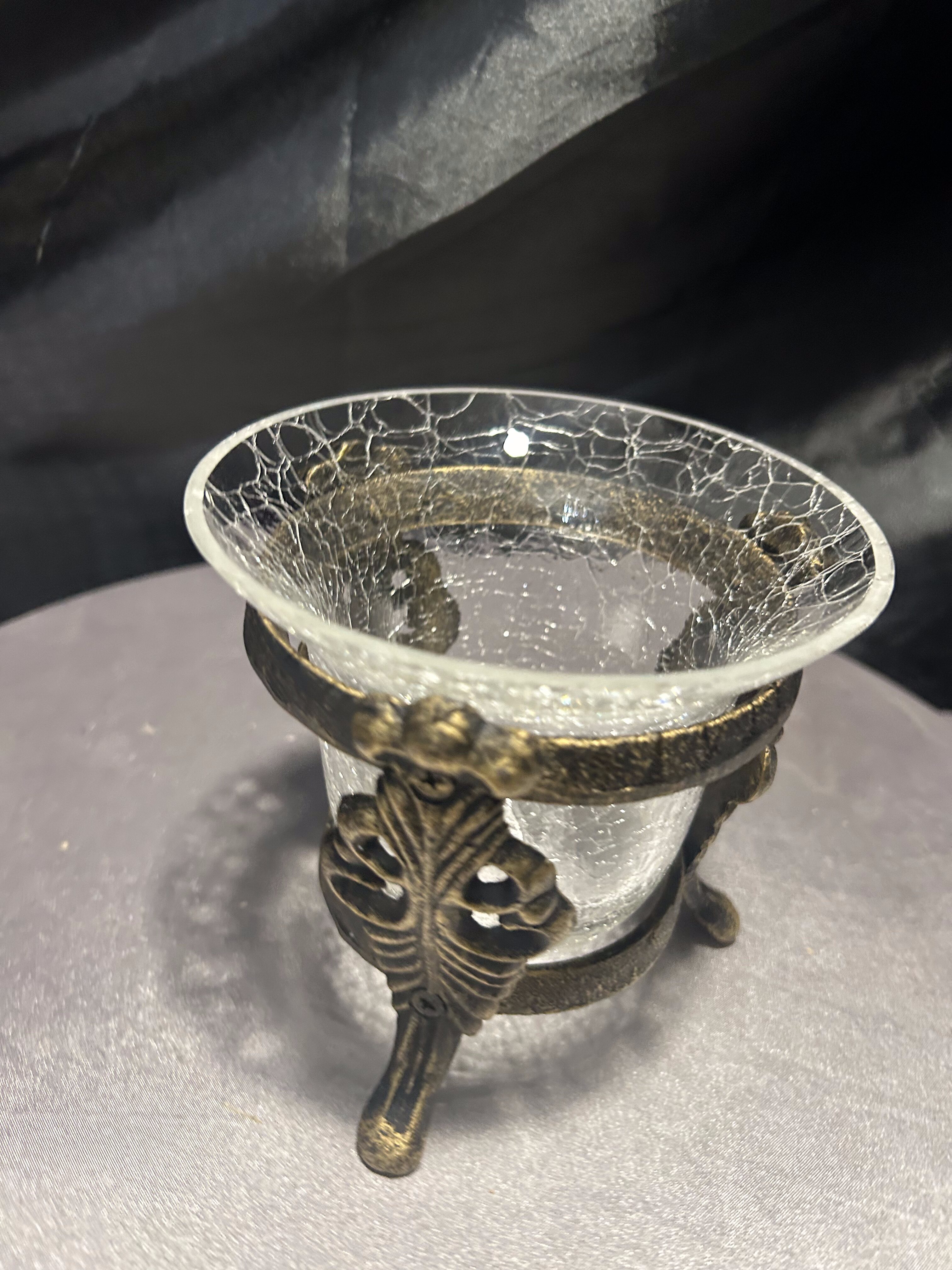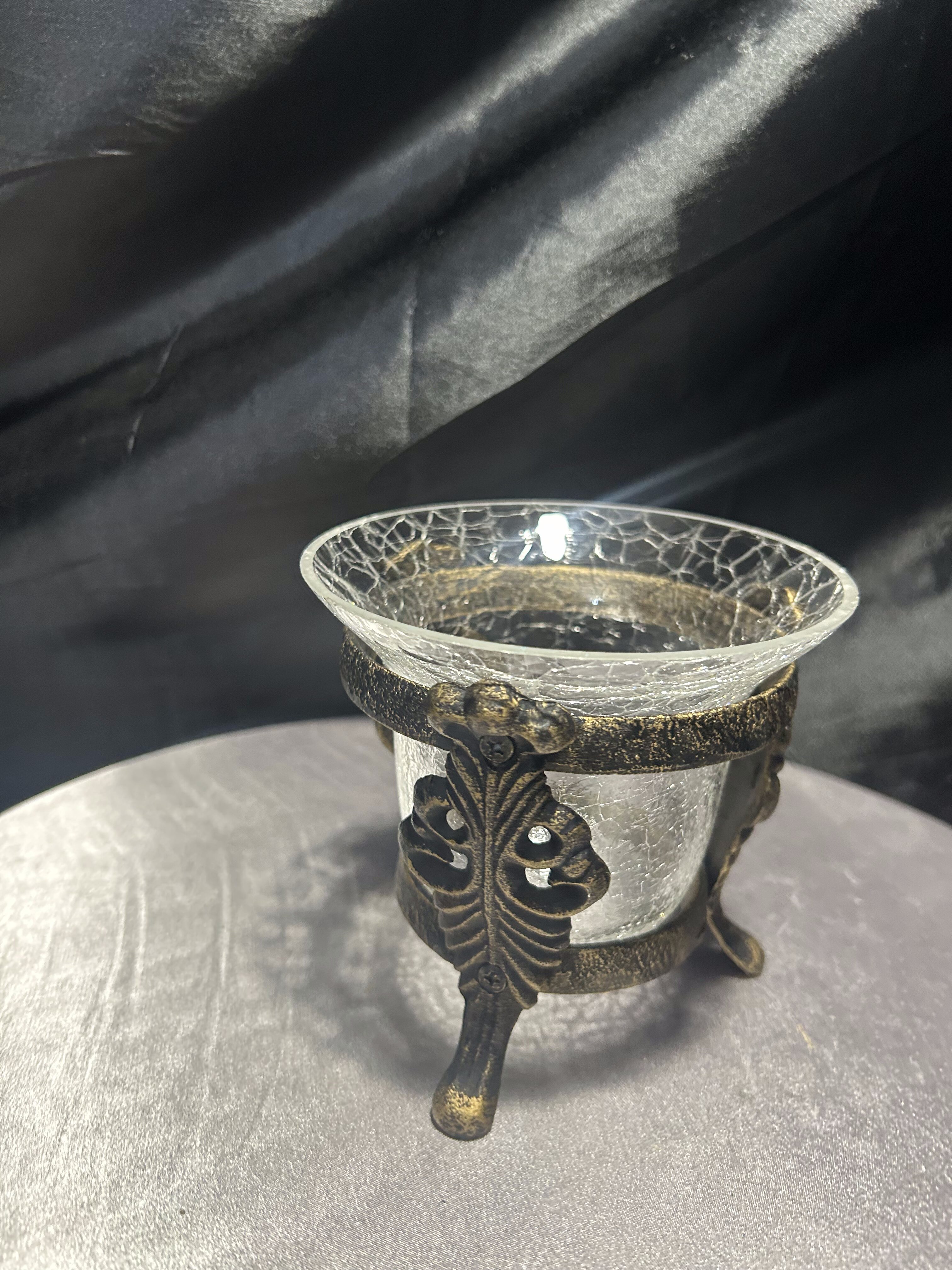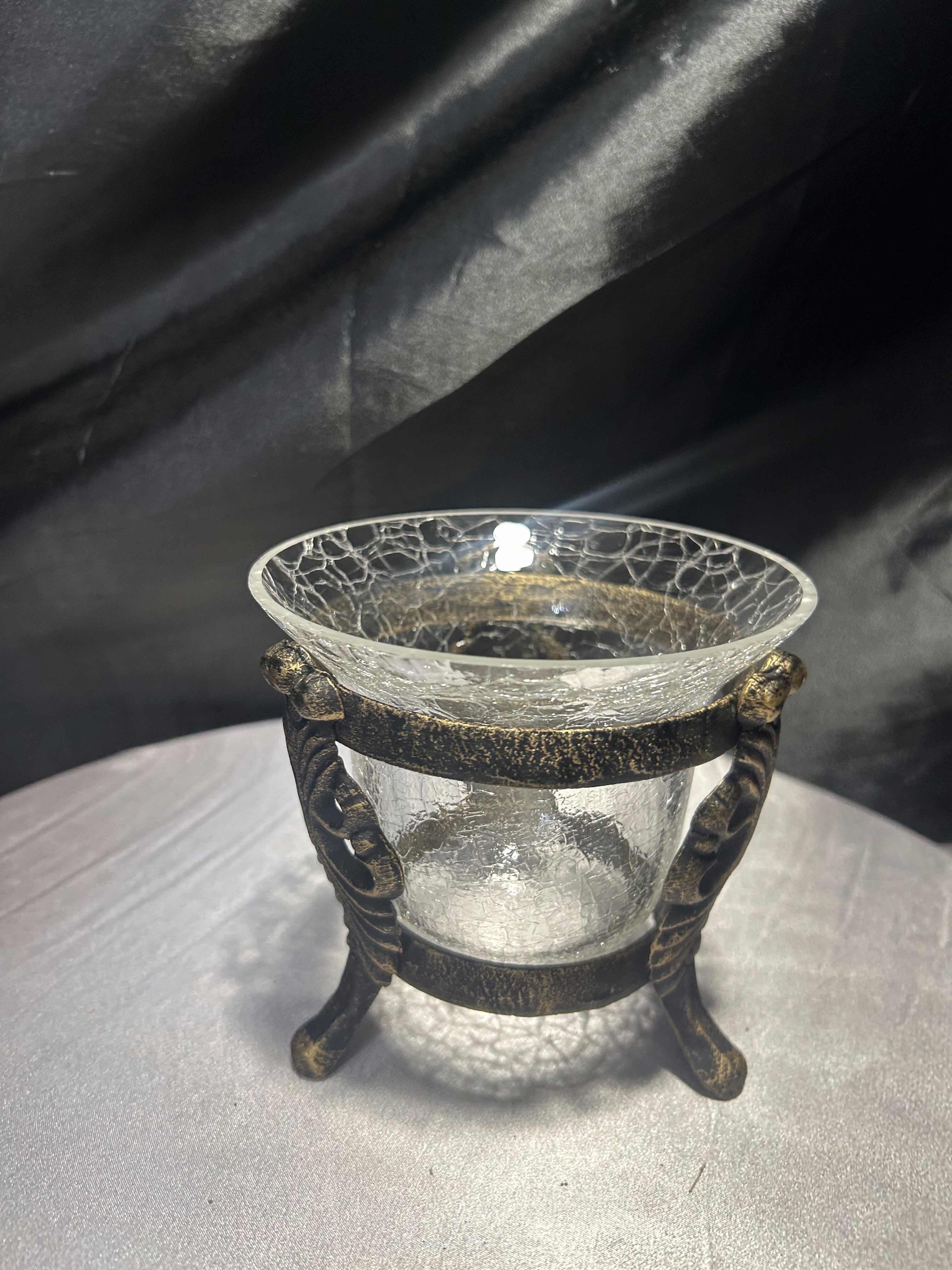 Unikatowa misa dekoracyjna łącząca styl vintage z nutą klasycznej elegancji. Wykonana z popękanego szkła typu „crackle glass”, które przepięknie rozprasza światło. Osadzona w stylizowanym, bogato zdobionym metalowym stelażu o antycznym wykończeniu. Całość przywodzi na myśl dekoracje z epoki secesji i doskonale sprawdzi się jako patera, świecznik lub po prostu nietuzinkowy element wystroju wnętrza.