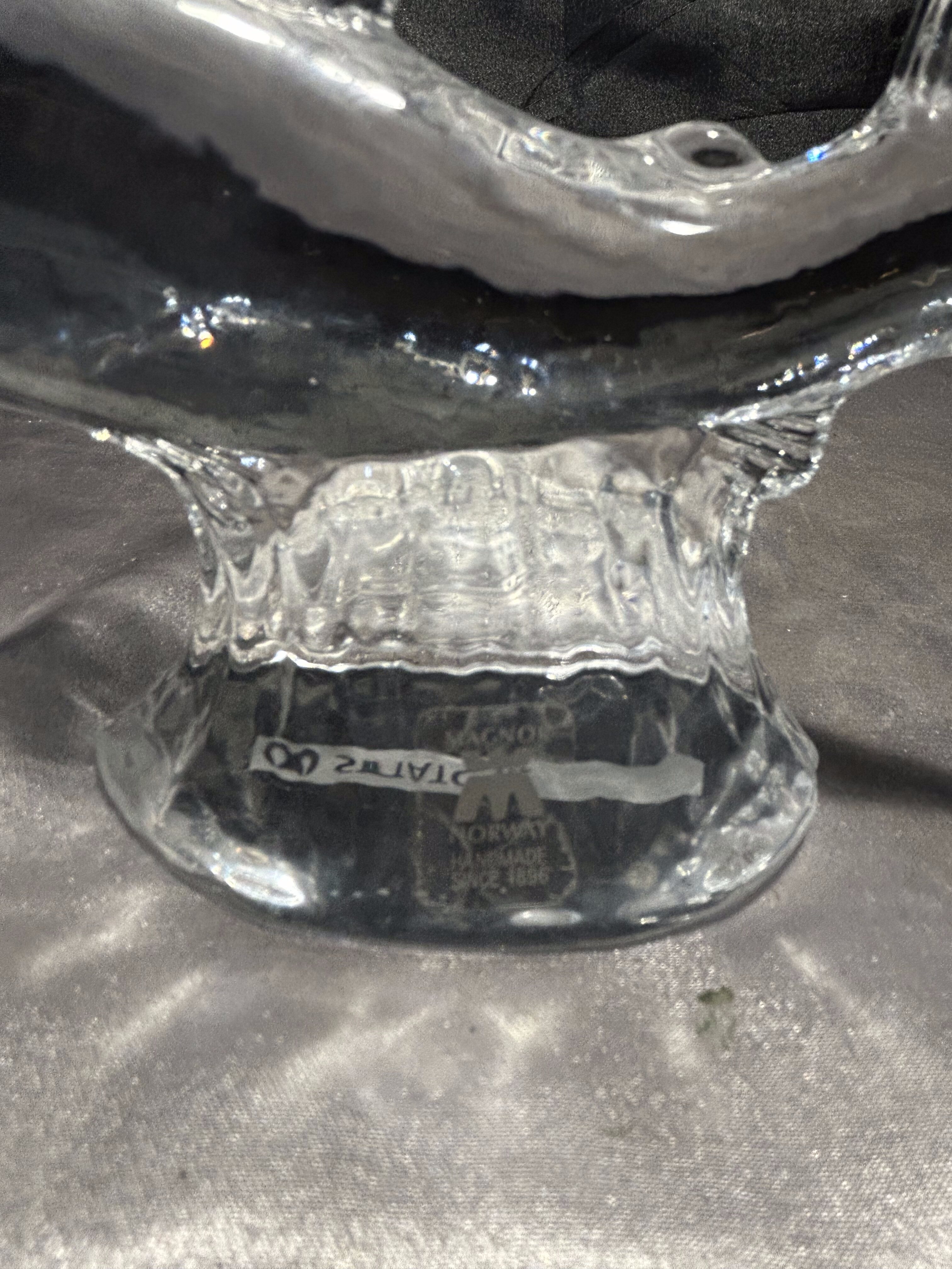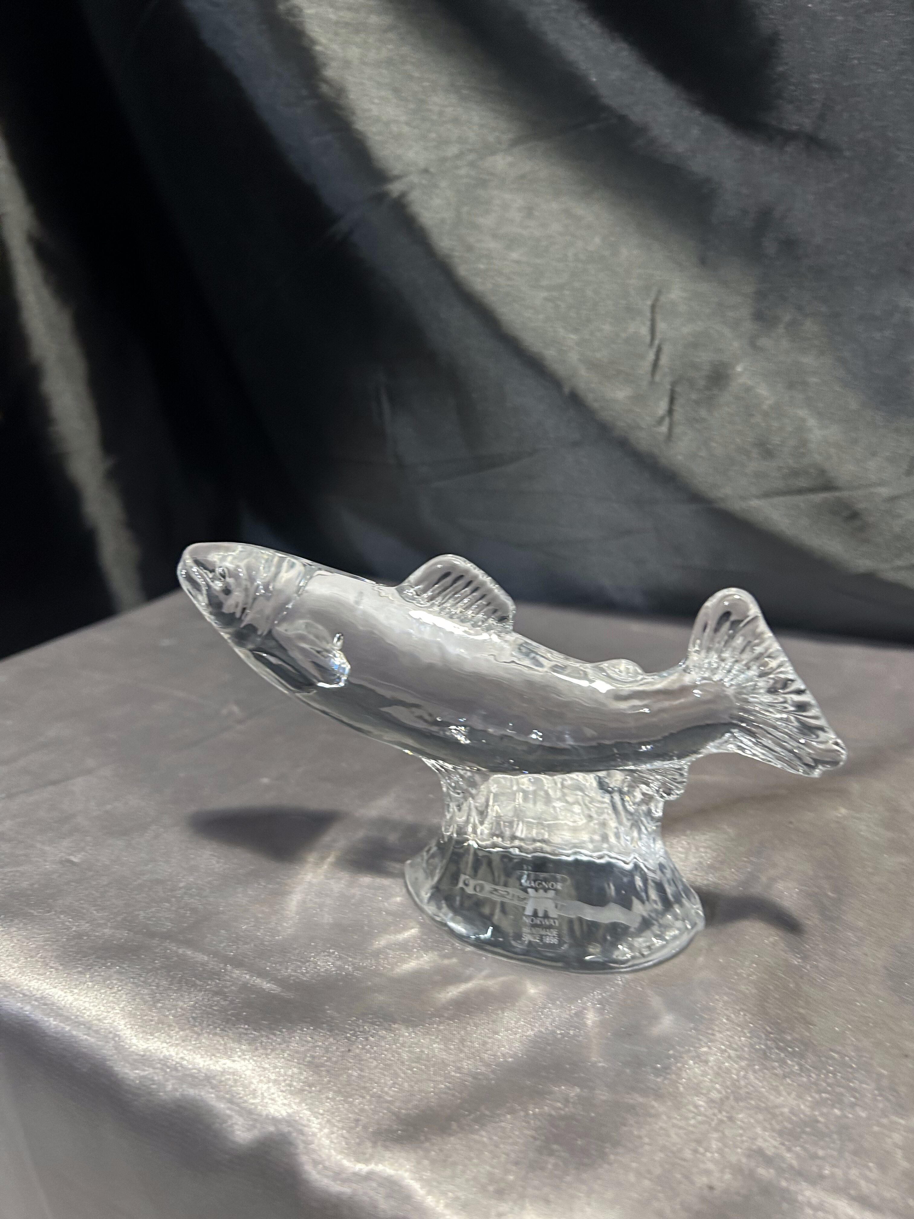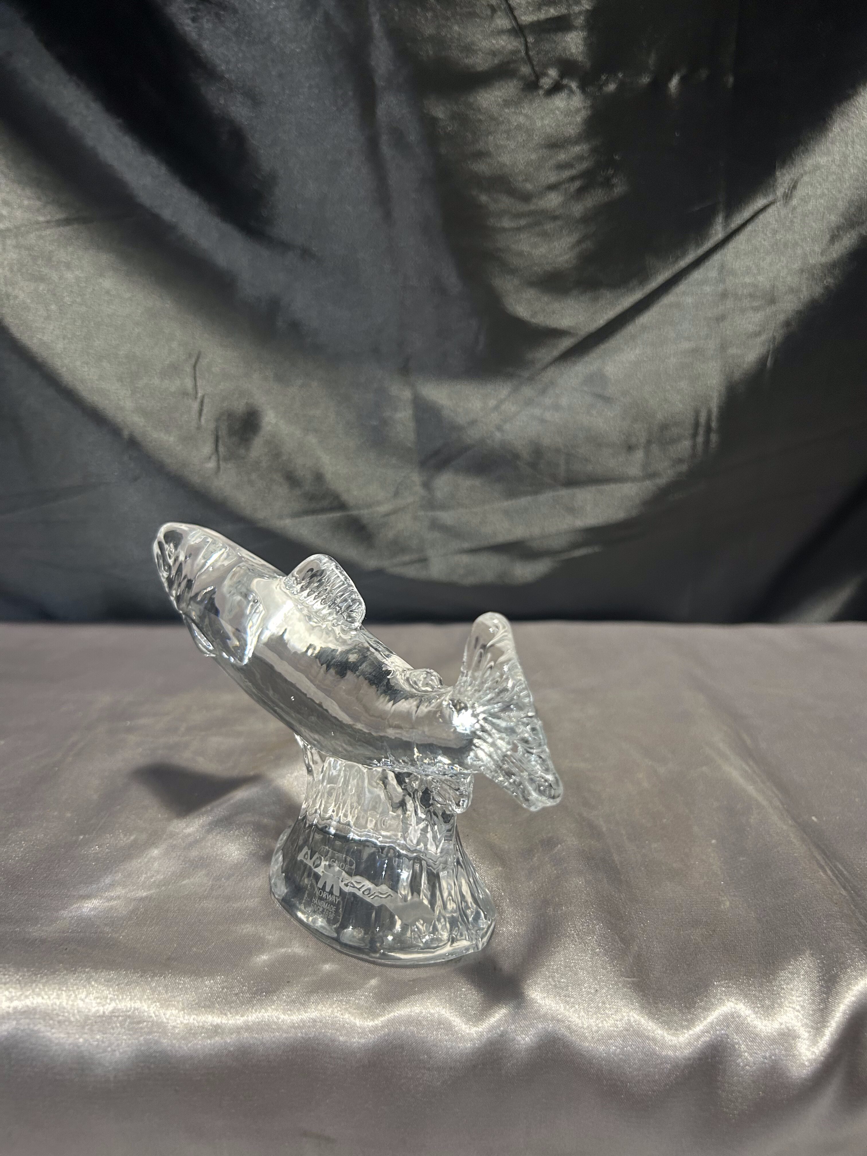 Dekoracyjna figurka ryby wykonana z przeźroczystego szkła artystycznego, osadzona na eleganckim, szklanym postumencie. Produkt sygnowany przez renomowaną norweską hutę szkła MAGNOR NORWAY, a od spodu opatrzony dedykacją dla marki STATOIL, co czyni go wyjątkowym egzemplarzem – prawdopodobnie wręczanym jako prezent firmowy lub pamiątka korporacyjna.