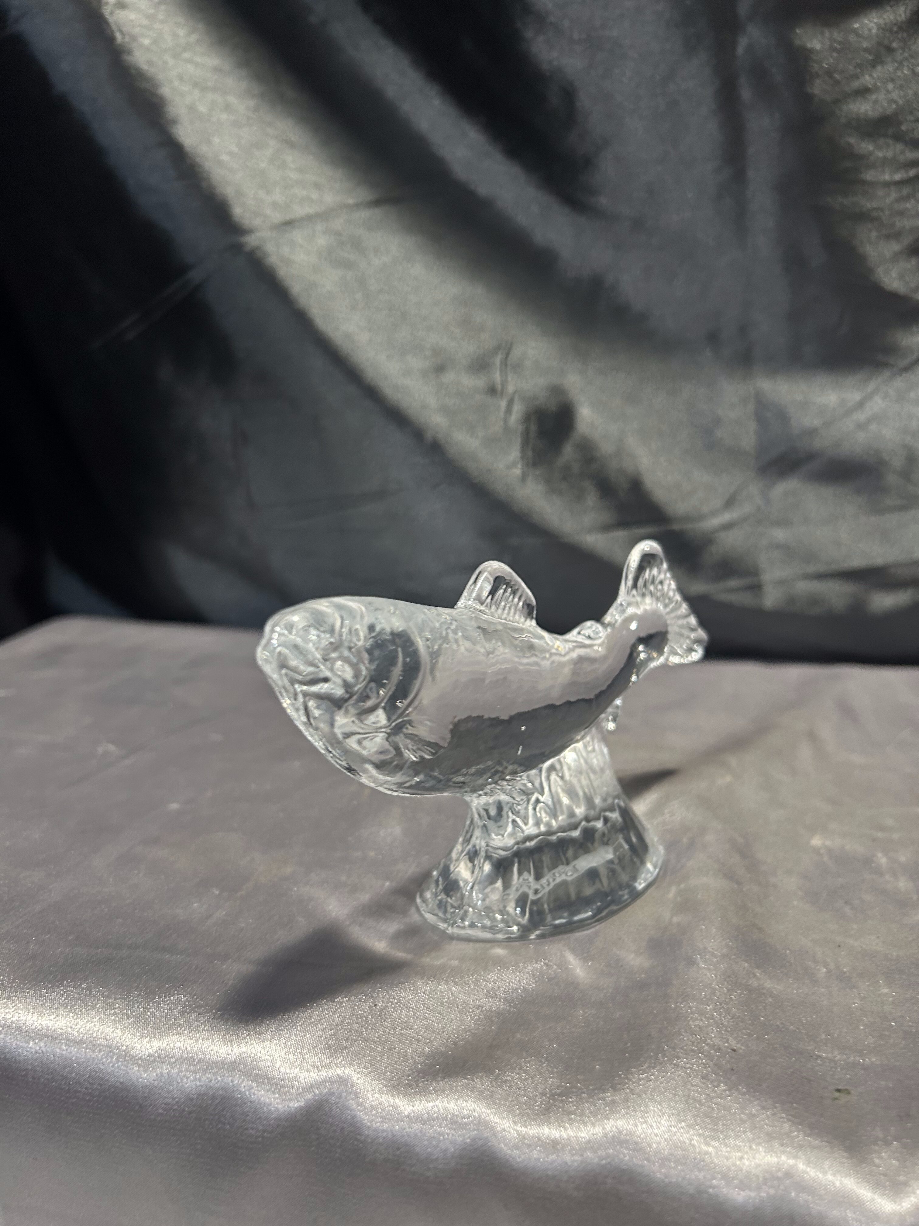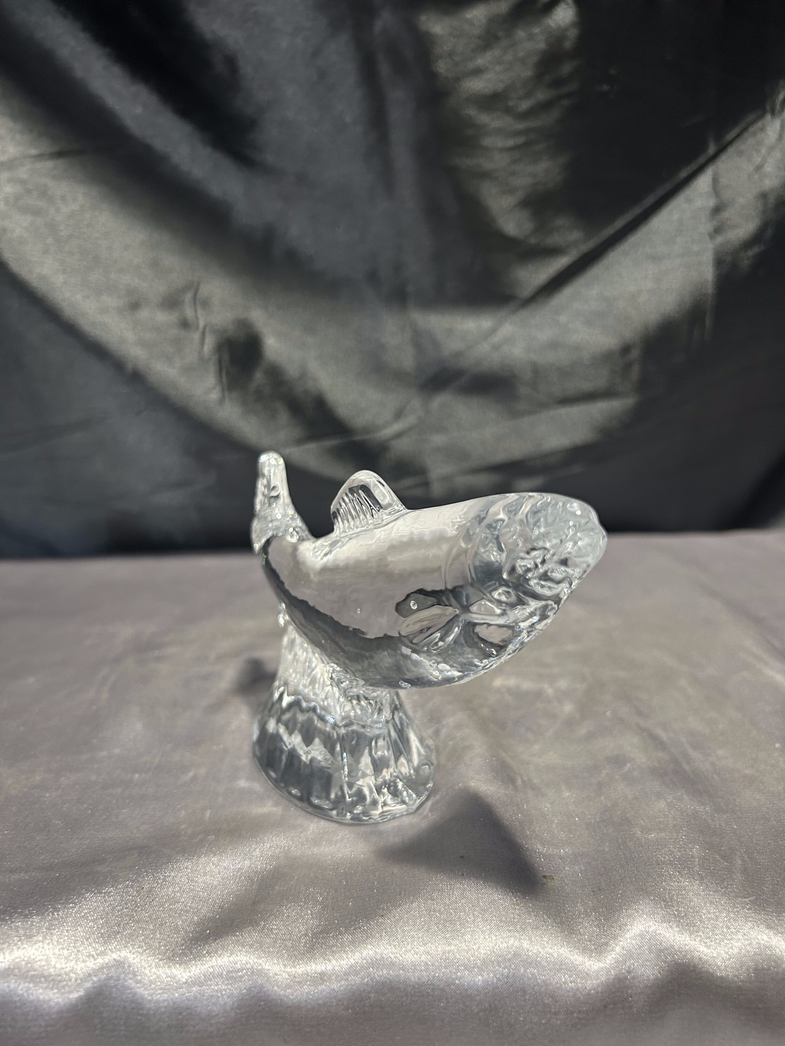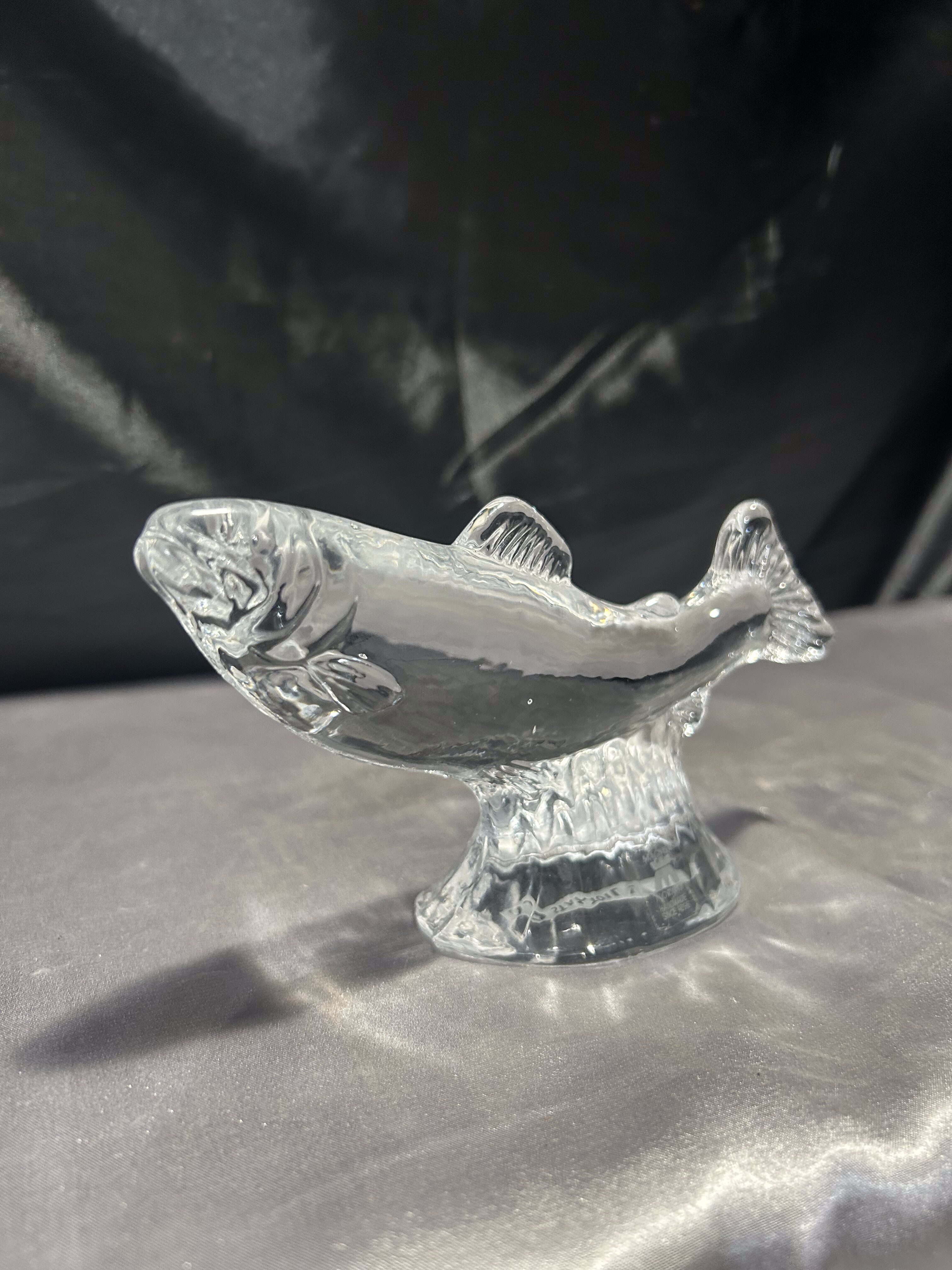 Dekoracyjna figurka ryby wykonana z przeźroczystego szkła artystycznego, osadzona na eleganckim, szklanym postumencie. Produkt sygnowany przez renomowaną norweską hutę szkła MAGNOR NORWAY, a od spodu opatrzony dedykacją dla marki STATOIL, co czyni go wyjątkowym egzemplarzem – prawdopodobnie wręczanym jako prezent firmowy lub pamiątka korporacyjna.