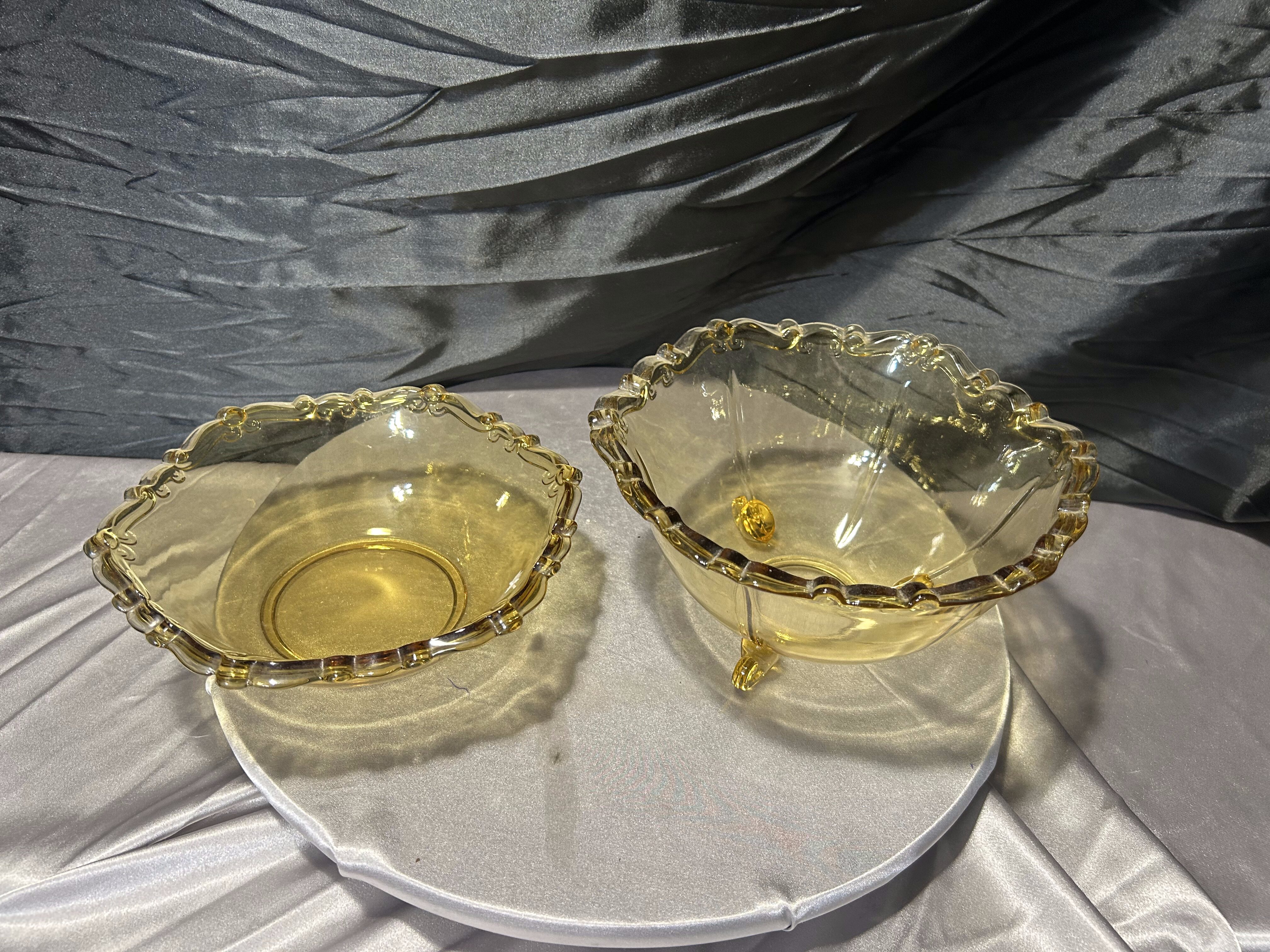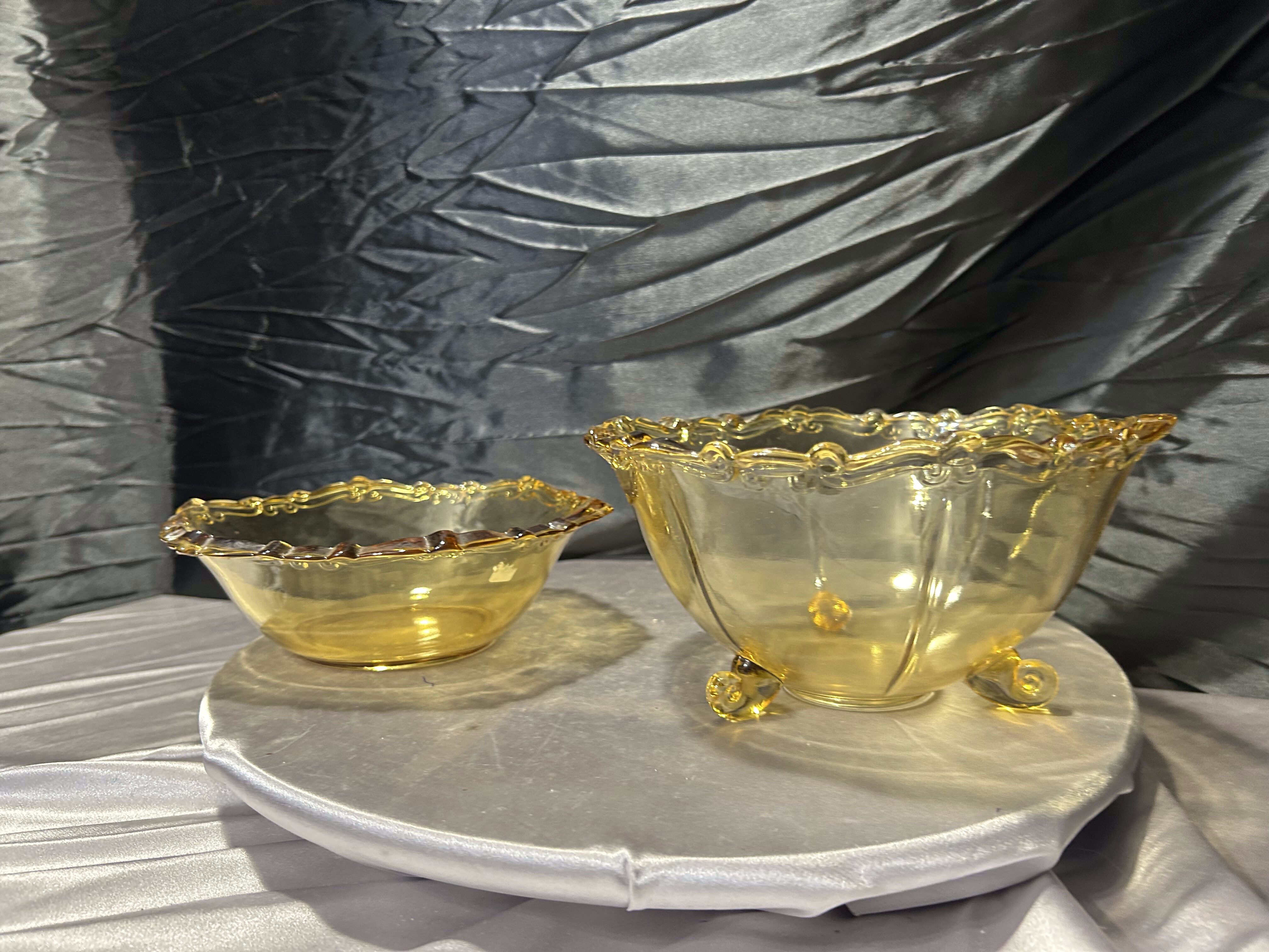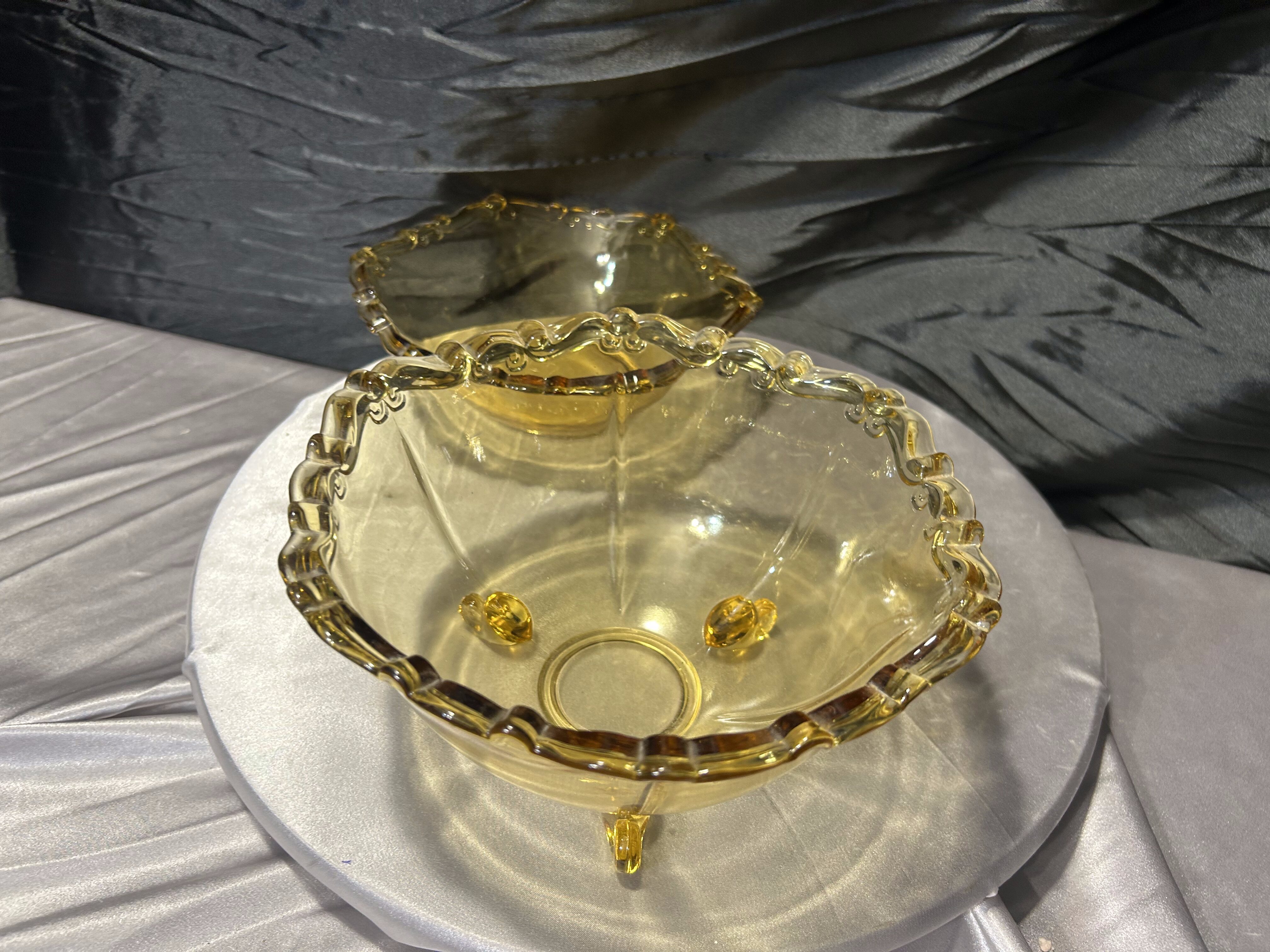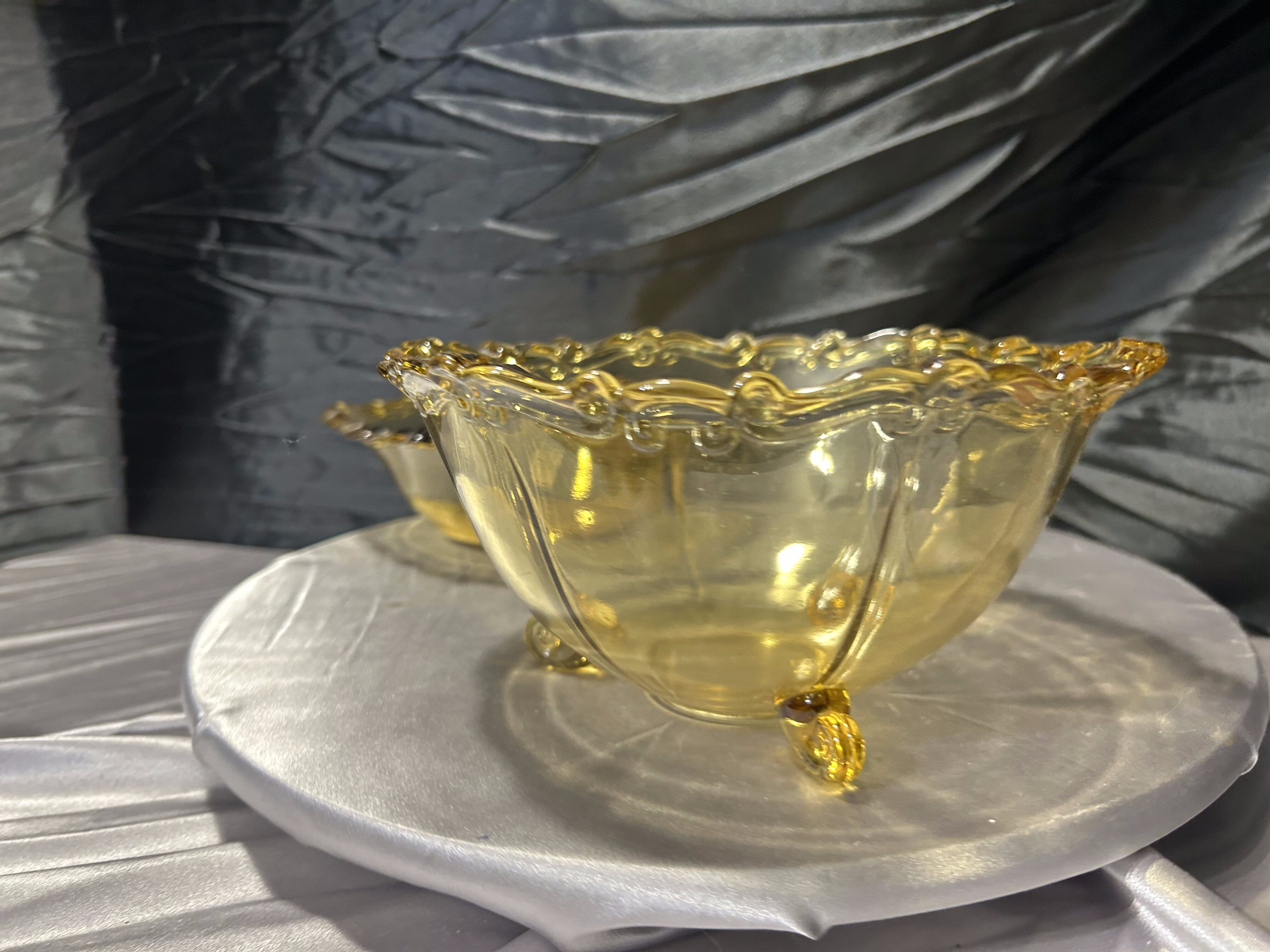 Jedna z misek osadzona jest na ozdobnych nóżkach, dzięki czemu prezentuje się szczególnie efektownie jako element dekoracyjny stołu lub witryny. Transparentne szkło w cytrynowym odcieniu pięknie rozprasza światło i podkreśla strukturę szkła, tworząc elegancki efekt wizualny.