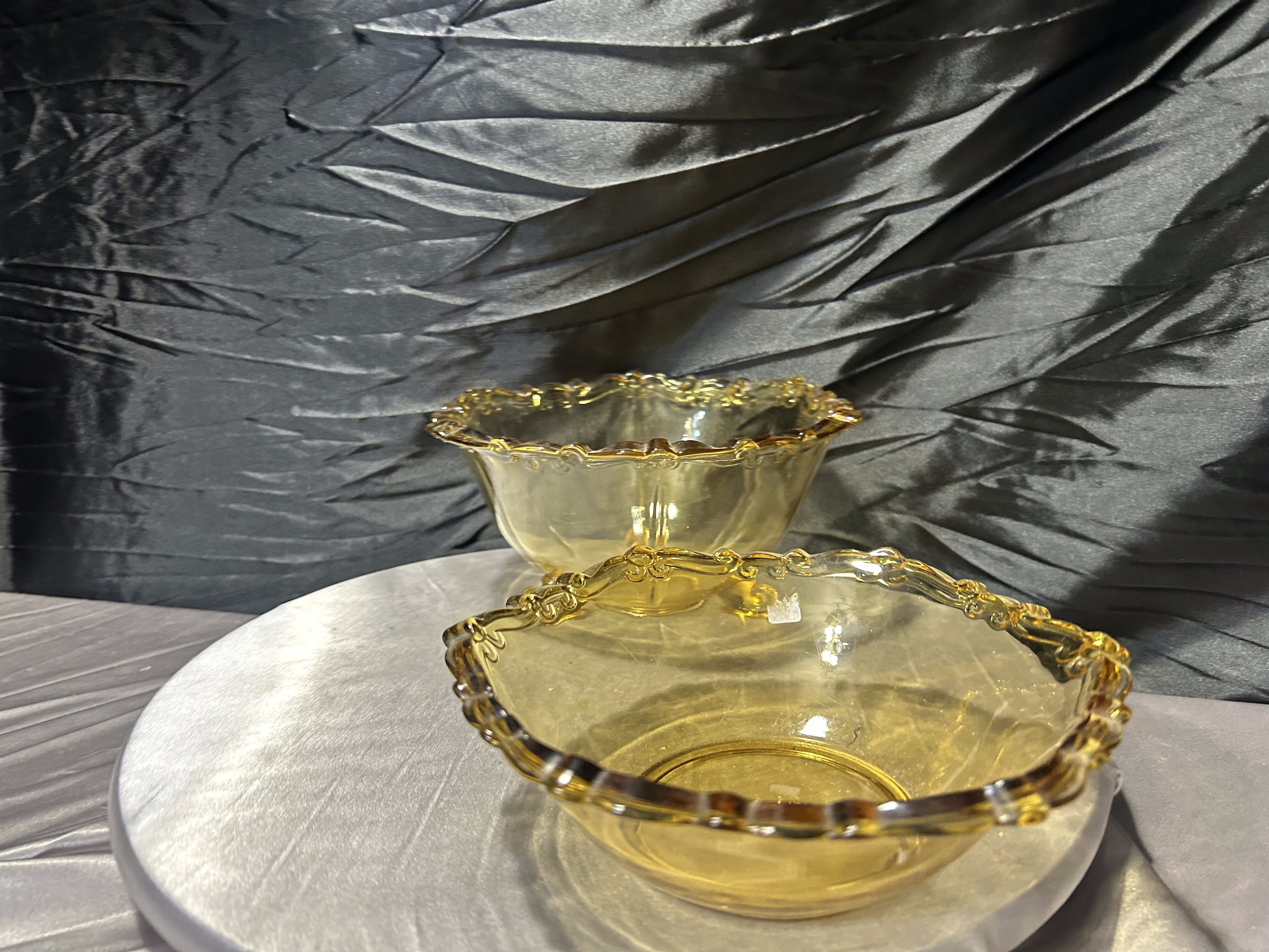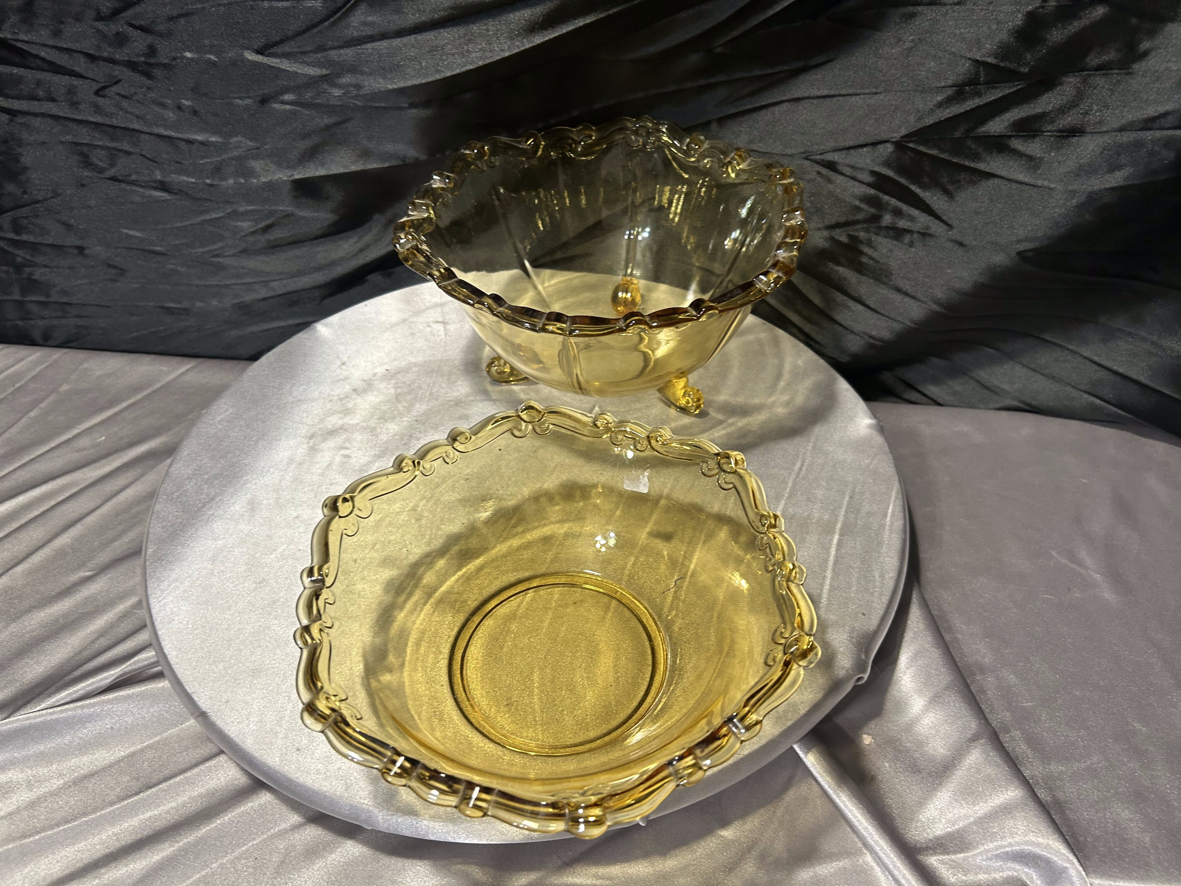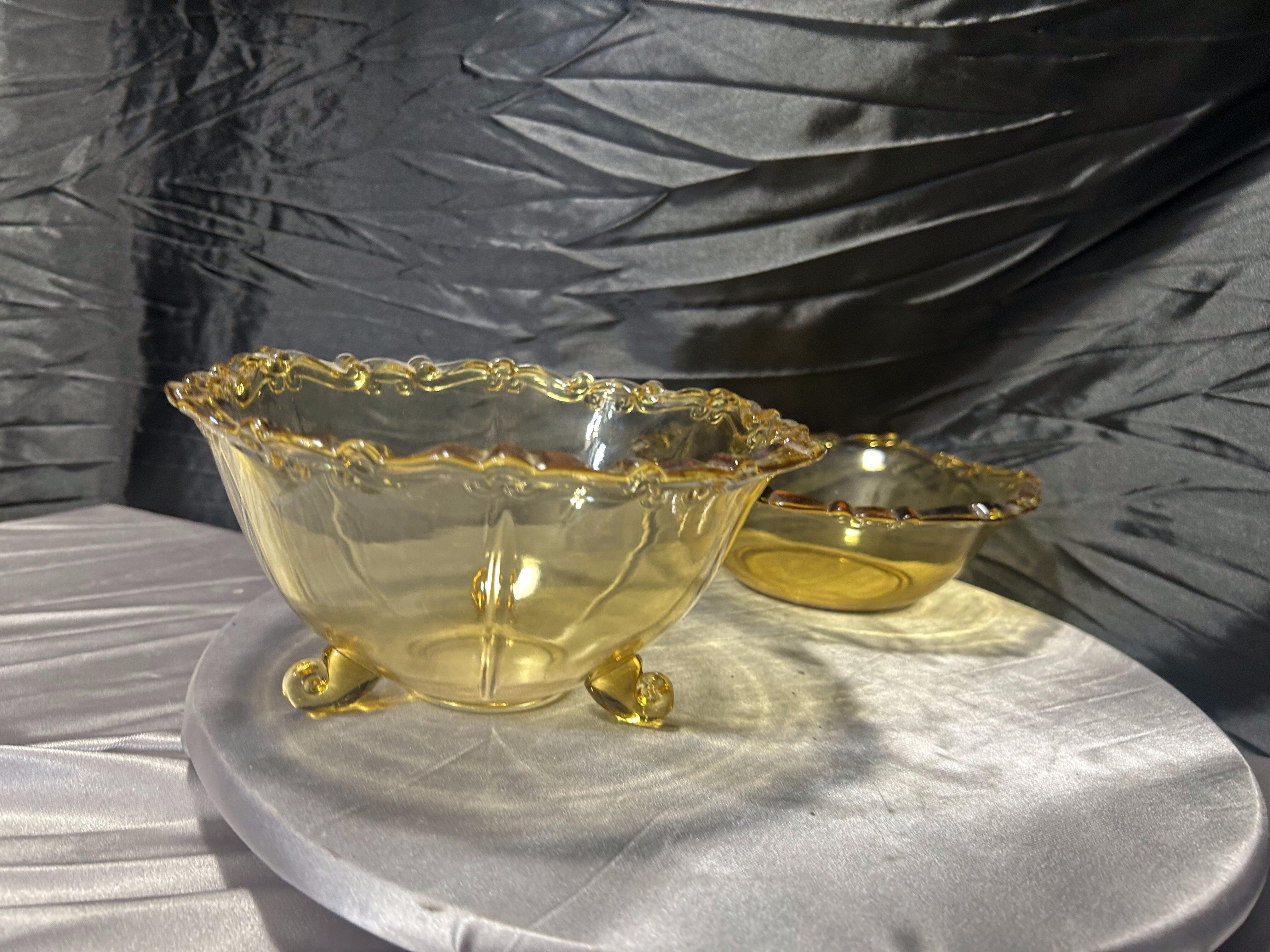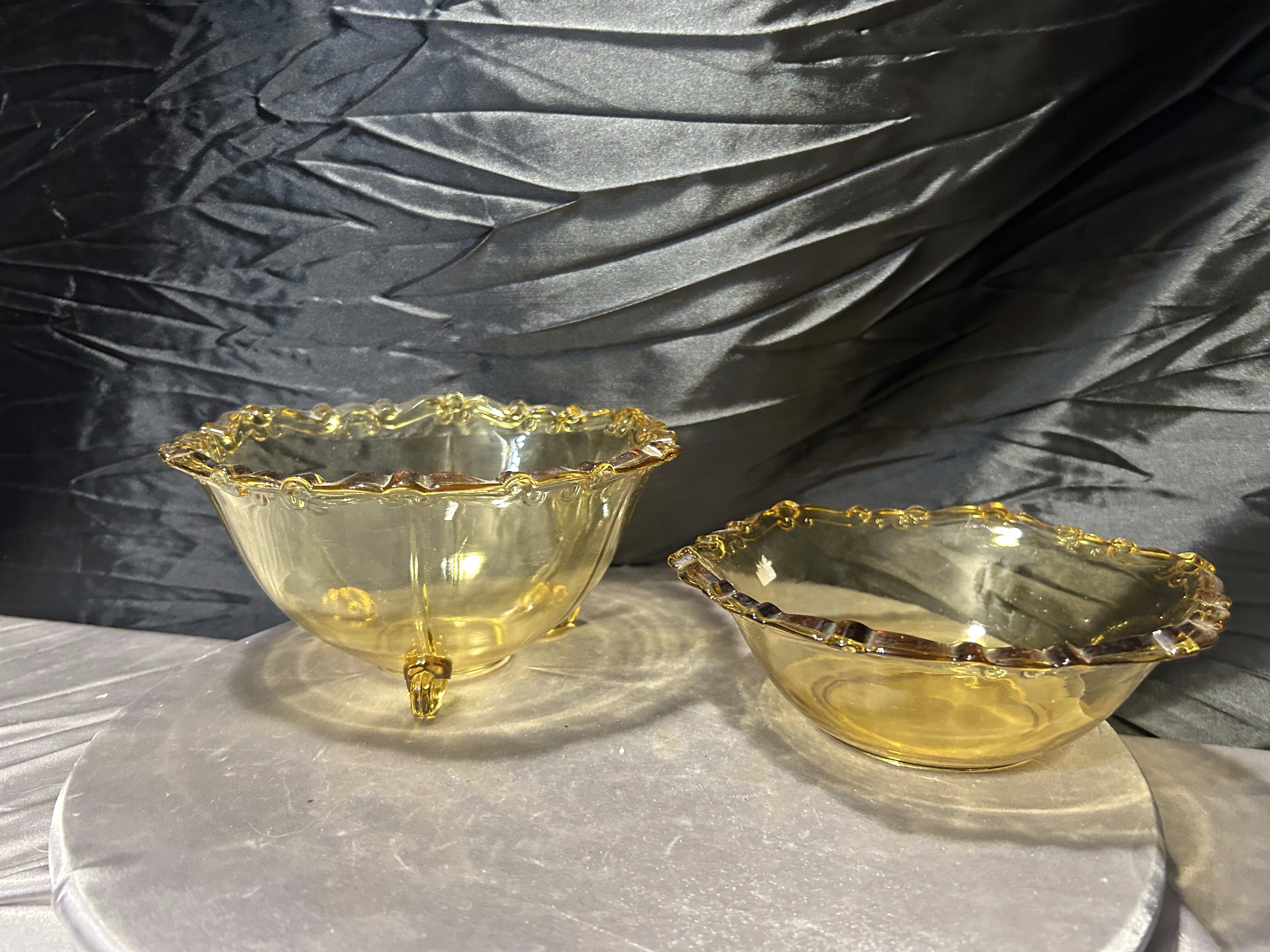Jedna z misek osadzona jest na ozdobnych nóżkach, dzięki czemu prezentuje się szczególnie efektownie jako element dekoracyjny stołu lub witryny. Transparentne szkło w cytrynowym odcieniu pięknie rozprasza światło i podkreśla strukturę szkła, tworząc elegancki efekt wizualny.