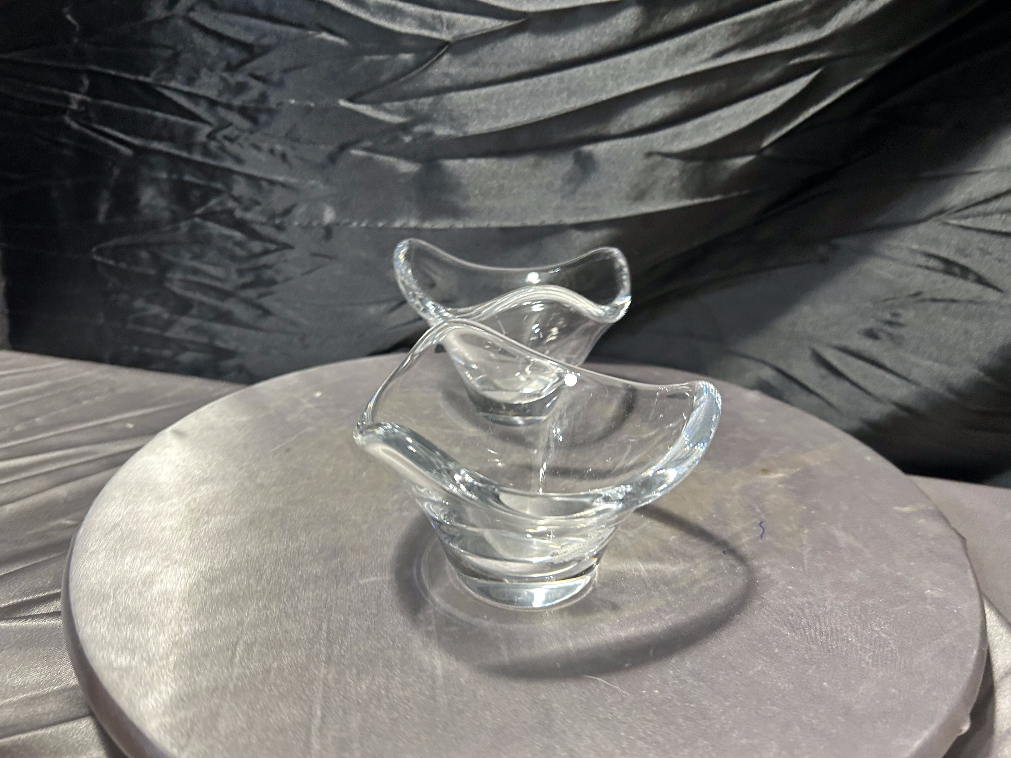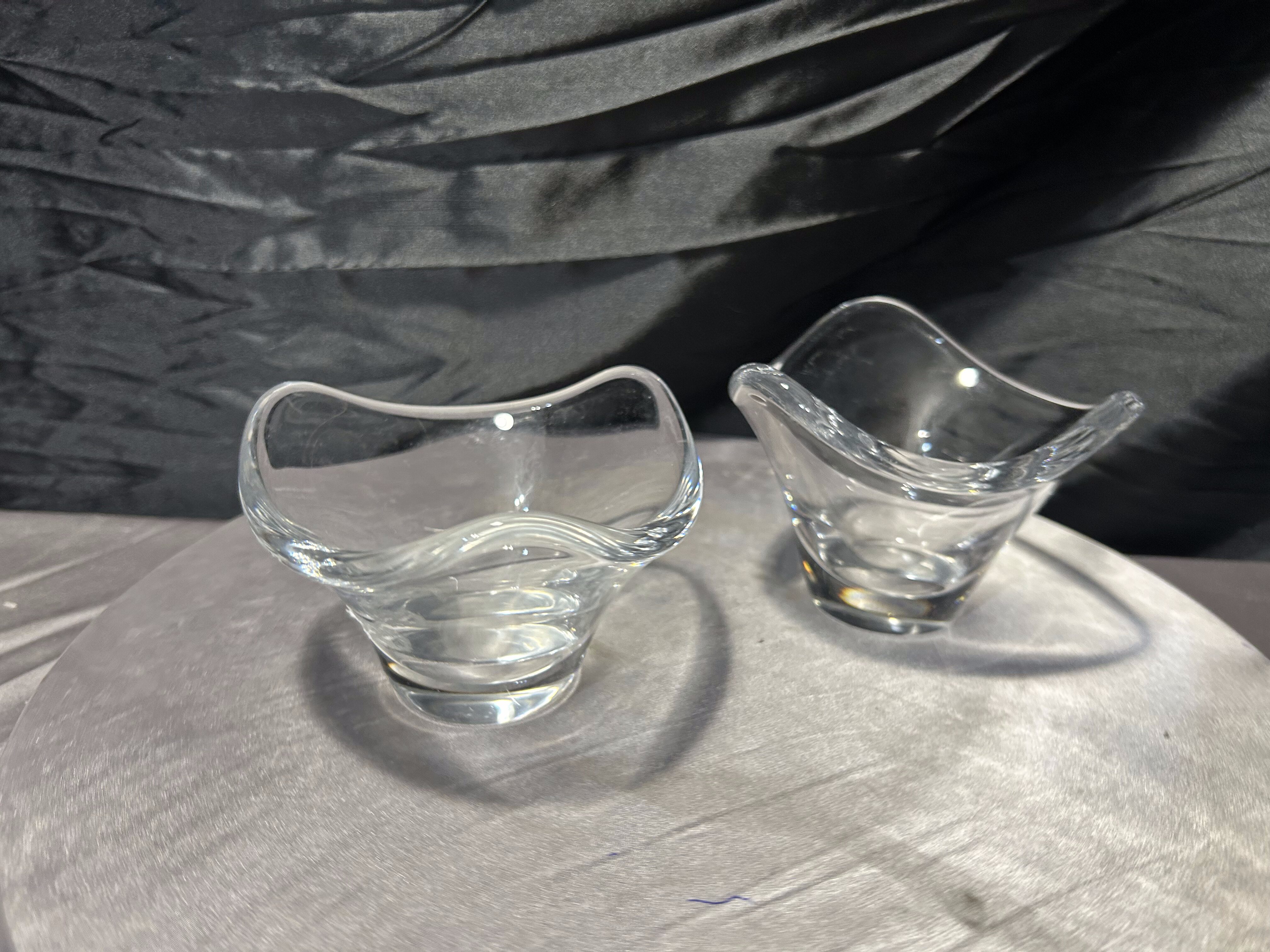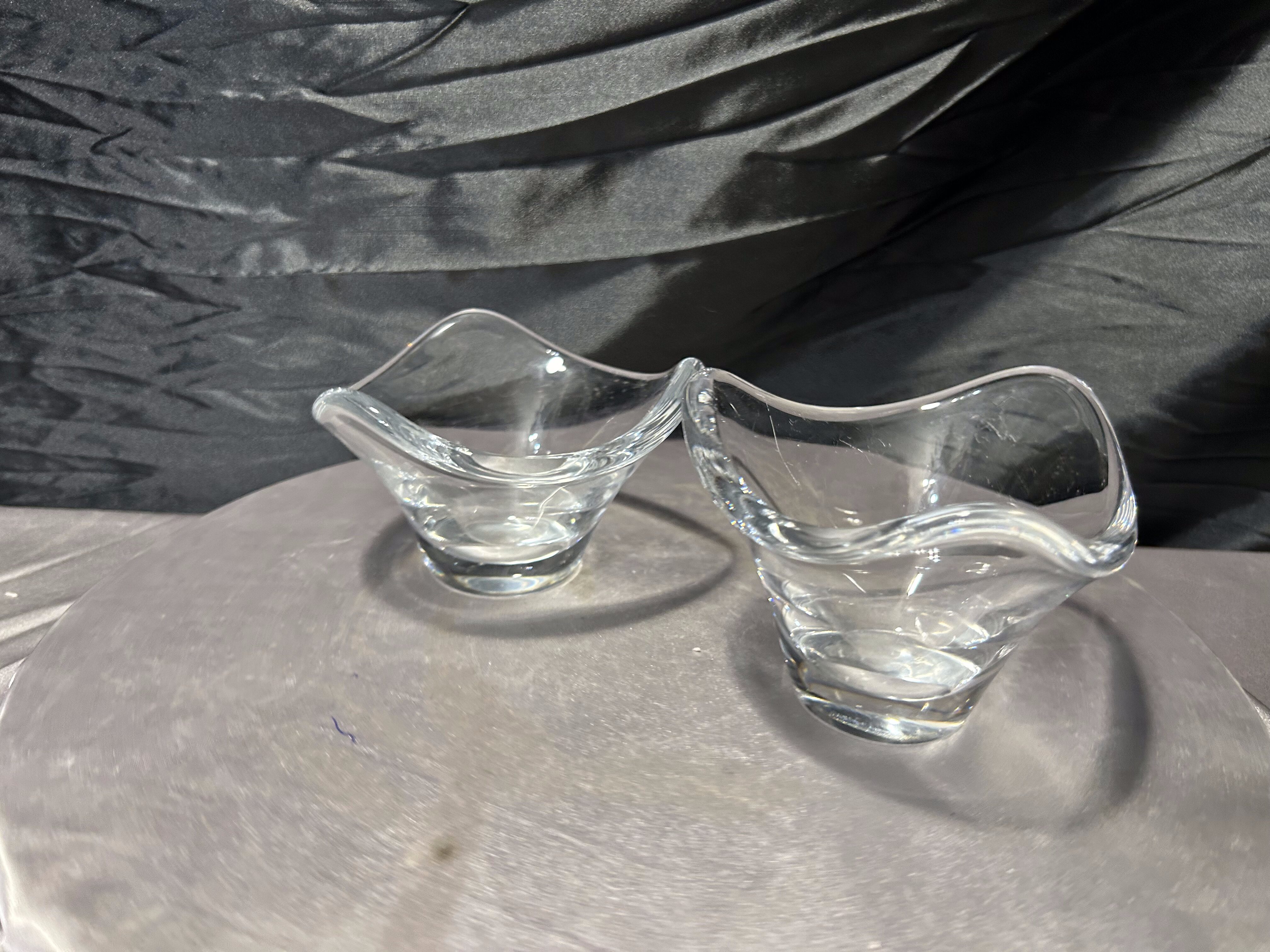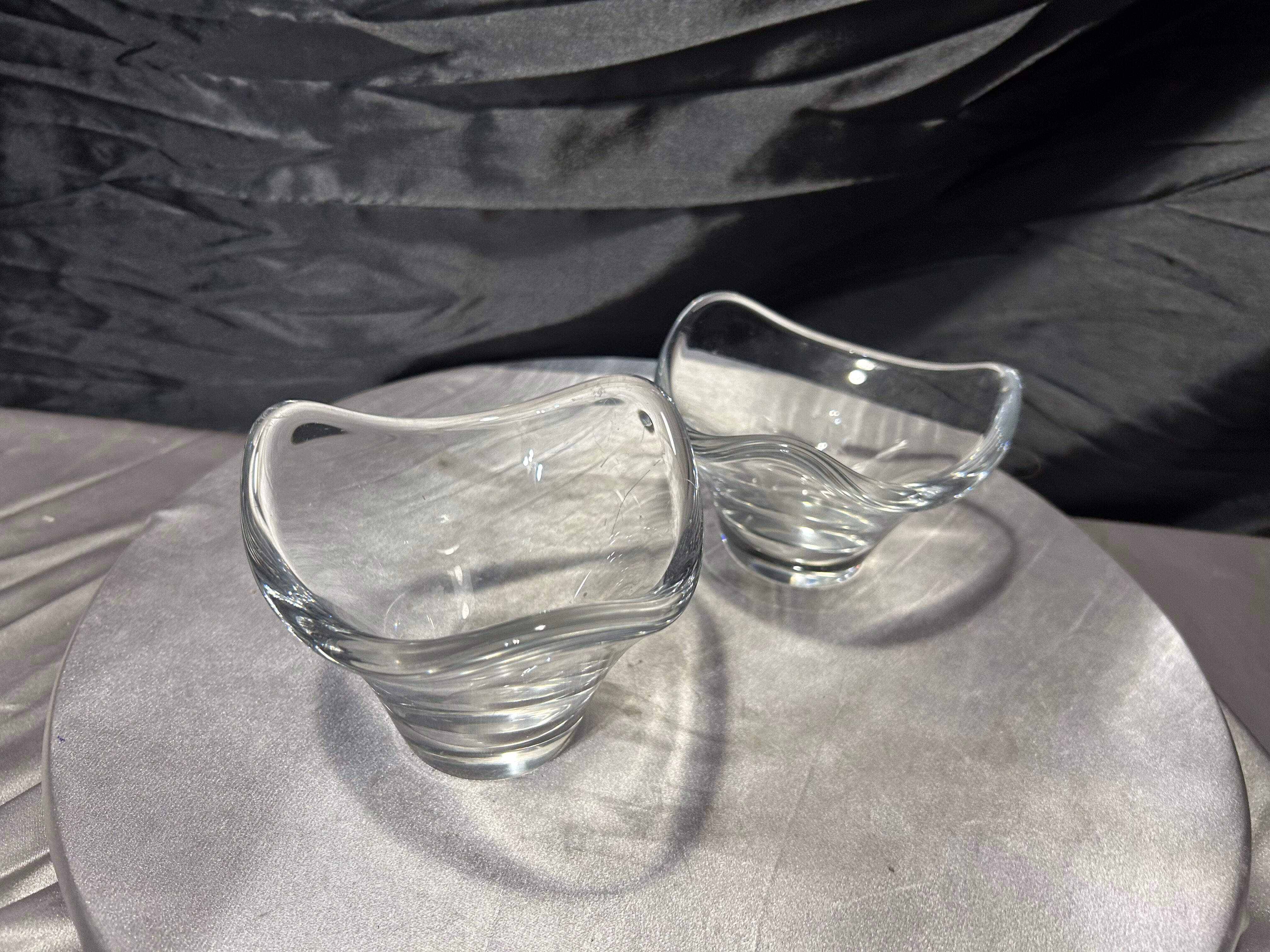 Komplet dwóch dekoracyjnych mis wykonanych ze szkła artystycznego w transparentnym kolorze. Naczynia mają charakterystyczną falującą krawędź oraz nowoczesną, miękką linię, dzięki czemu pięknie załamują światło i prezentują się bardzo efektownie.