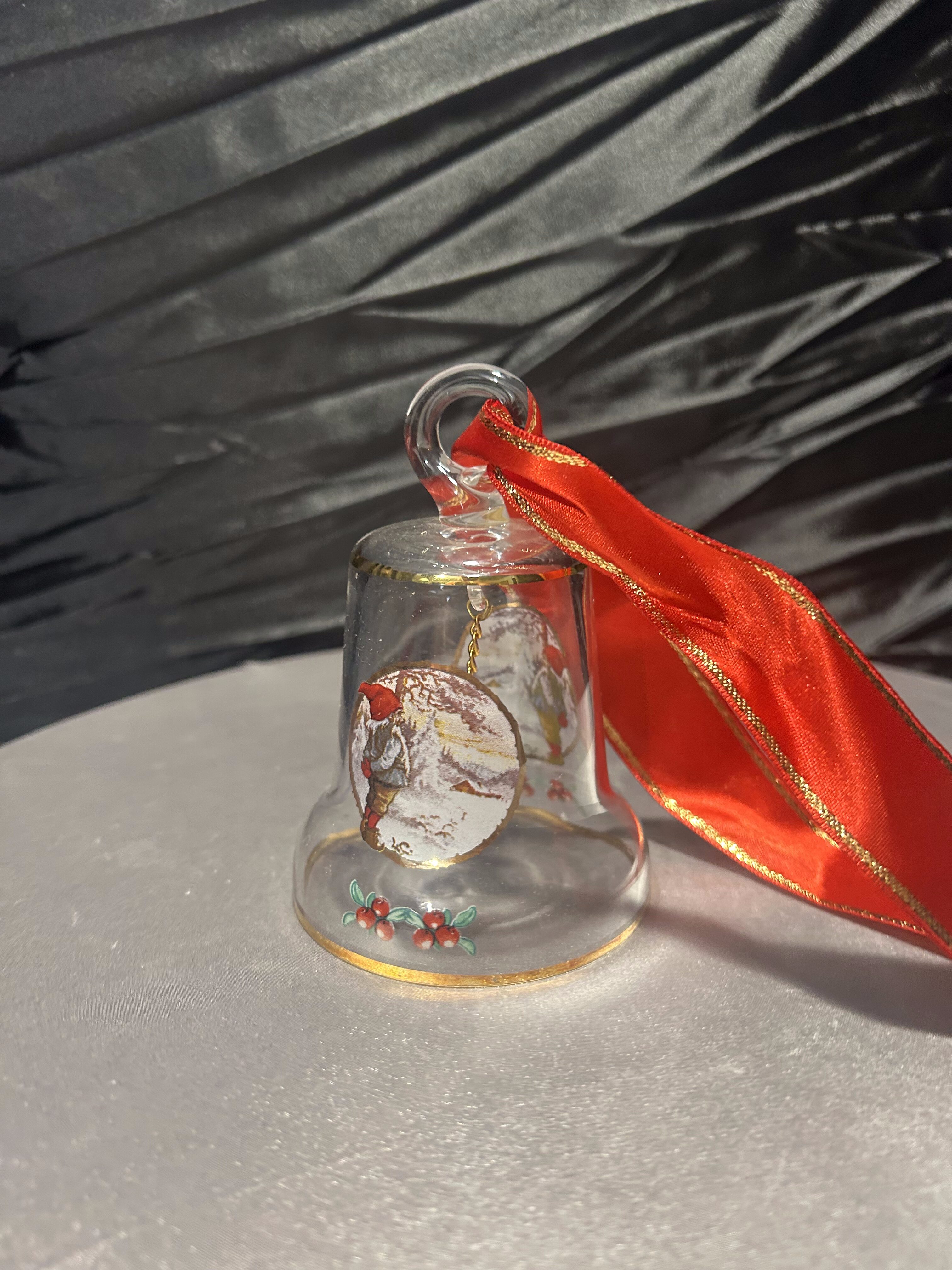 Elegancki szklany dzwonek wyprodukowany przez renomowaną norweską hutę Hadeland. Wykonany ręcznie, ozdobiony malowanym motywem zimowym z czerwonym akcentem oraz klasyczną złotą lamówką. Wewnątrz zawieszona dekoracyjna zawieszka na złotym łańcuszku. Całość dopełnia szeroka czerwona wstążka, dzięki której dzwonek idealnie sprawdzi się jako zawieszka na choinkę lub dekoracja świątecznego stołu.