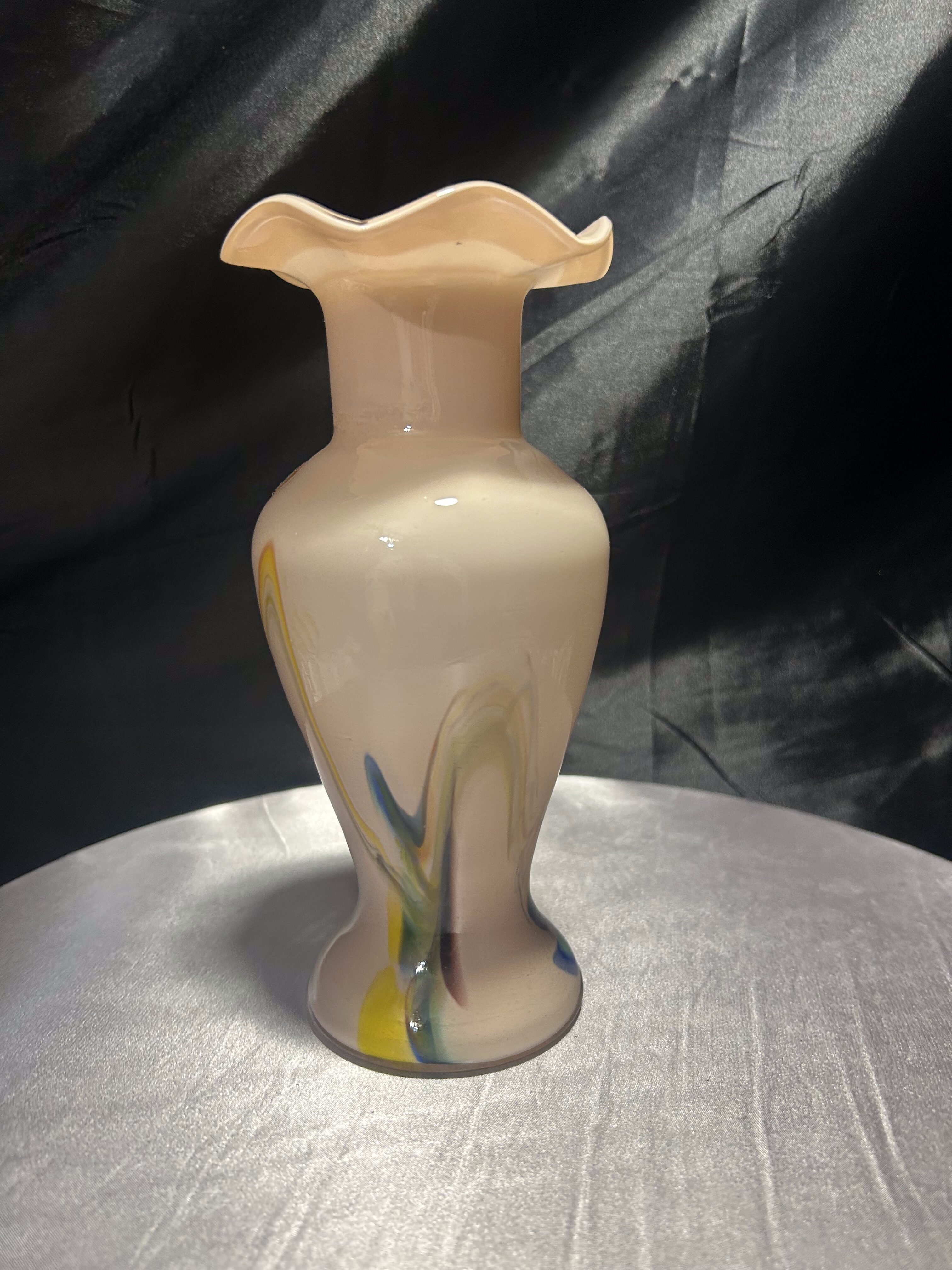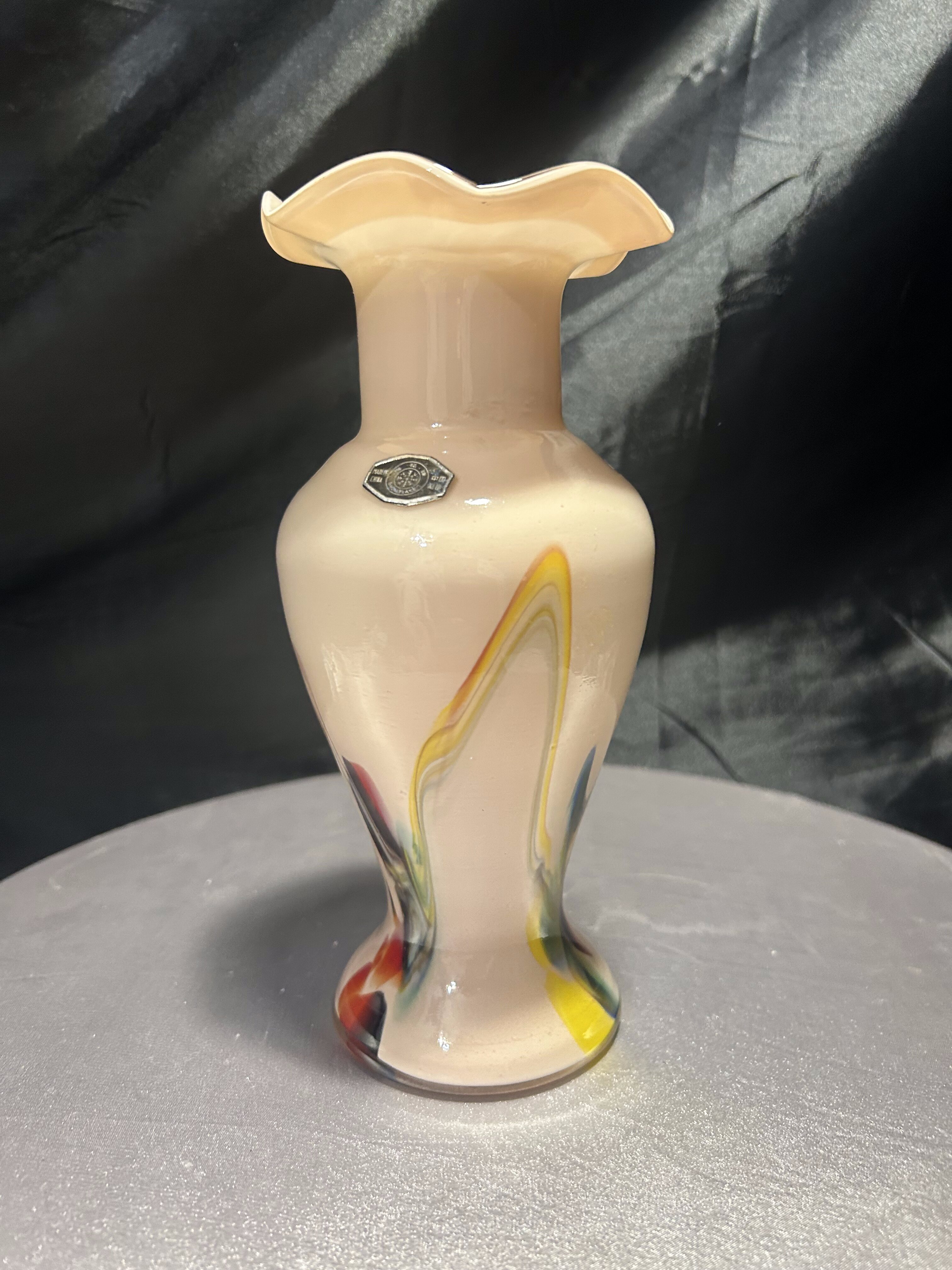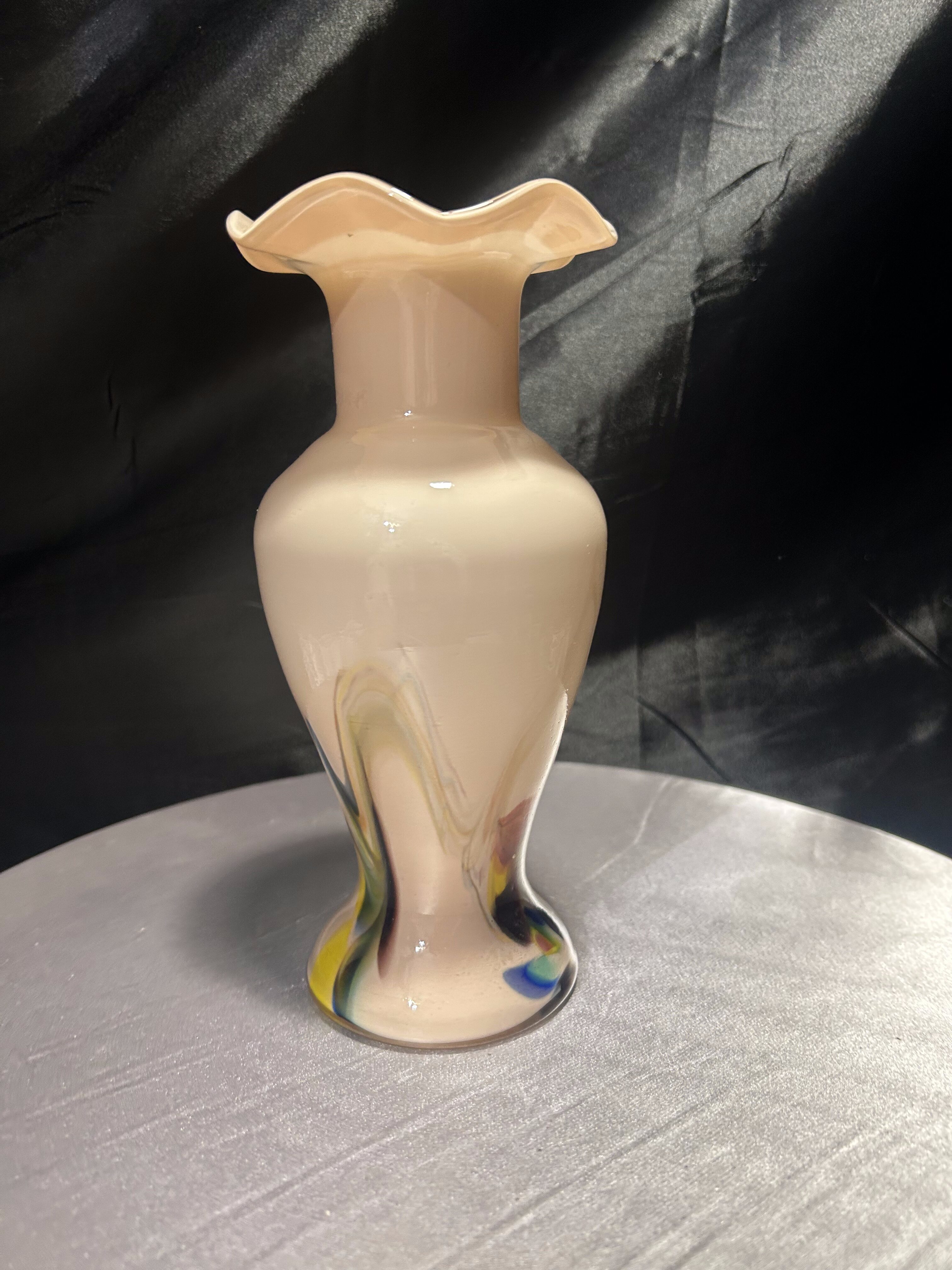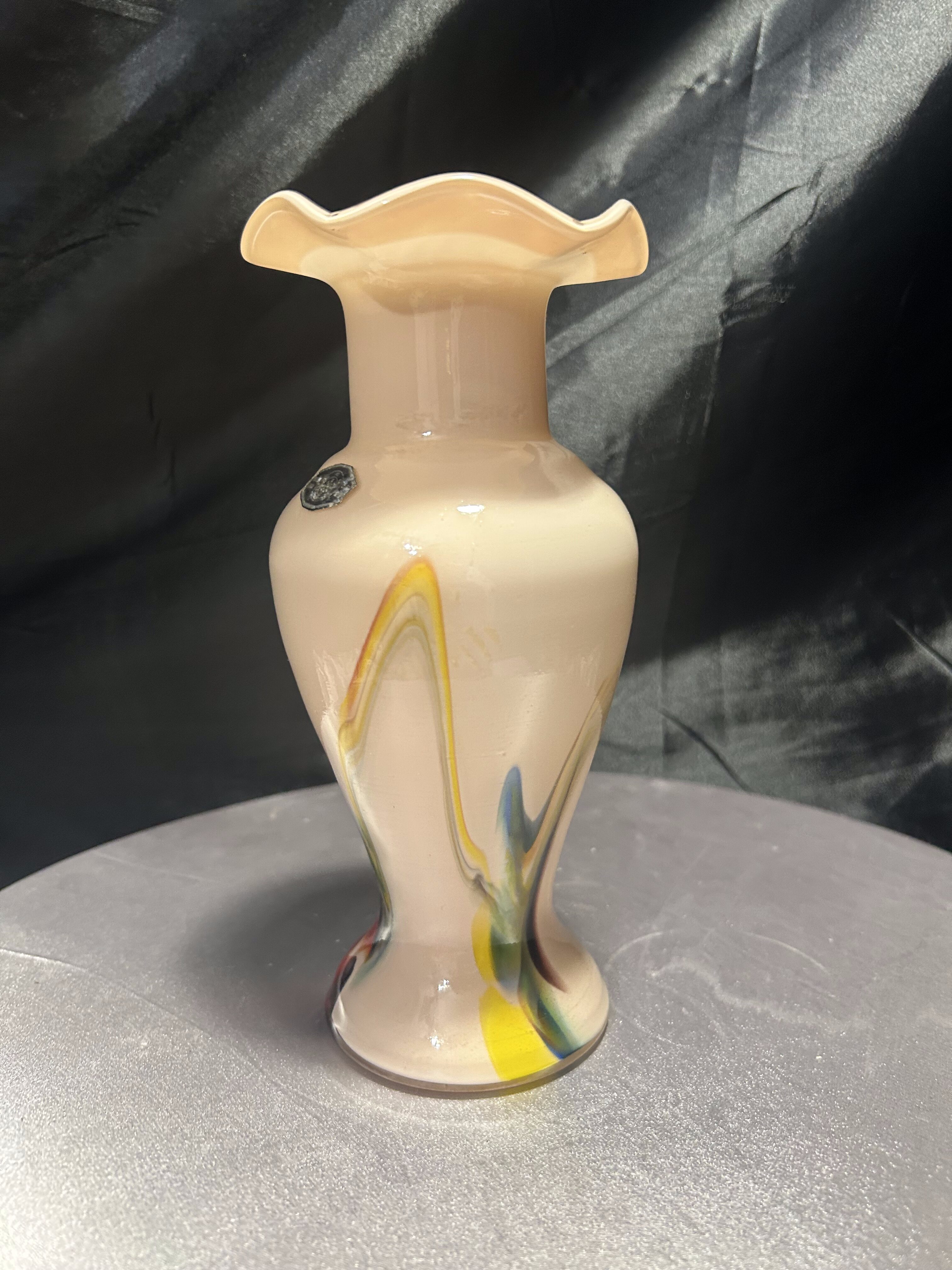 Dekoracyjny flakon wykonany ze szkła artystycznego w stylu współczesnym, oznaczony oryginalną naklejką Snowflakes – Made in China. Wazon zachwyca subtelnym, pastelowym kolorem i dynamicznymi wstęgami barw zatopionych w szkle – odcienie żółci, czerwieni, błękitu i czerni tworzą abstrakcyjny, malarski efekt. Falowana krawędź u góry nadaje całości elegancji i płynności, czyniąc z flakonu niebanalny element dekoracyjny.
