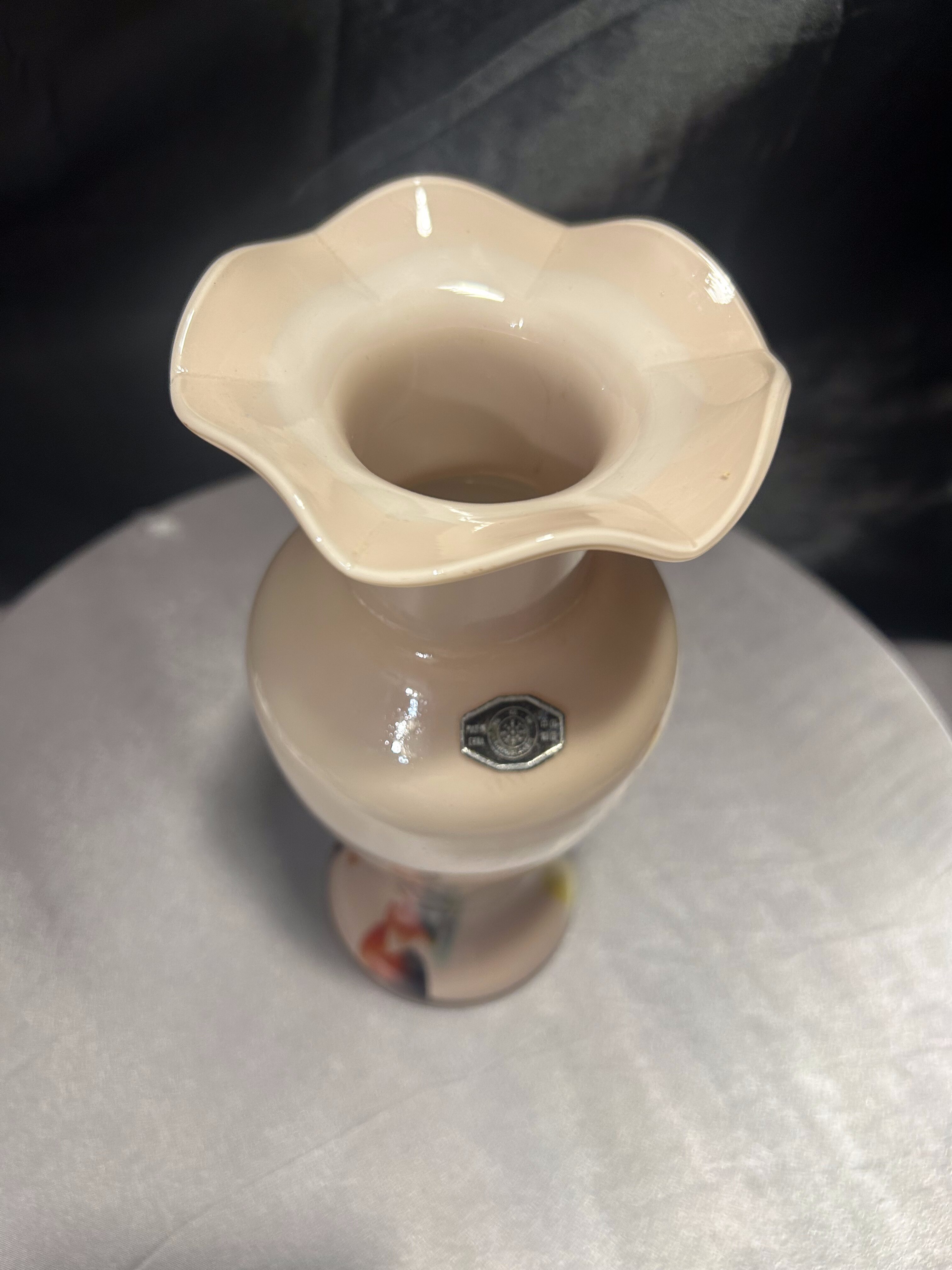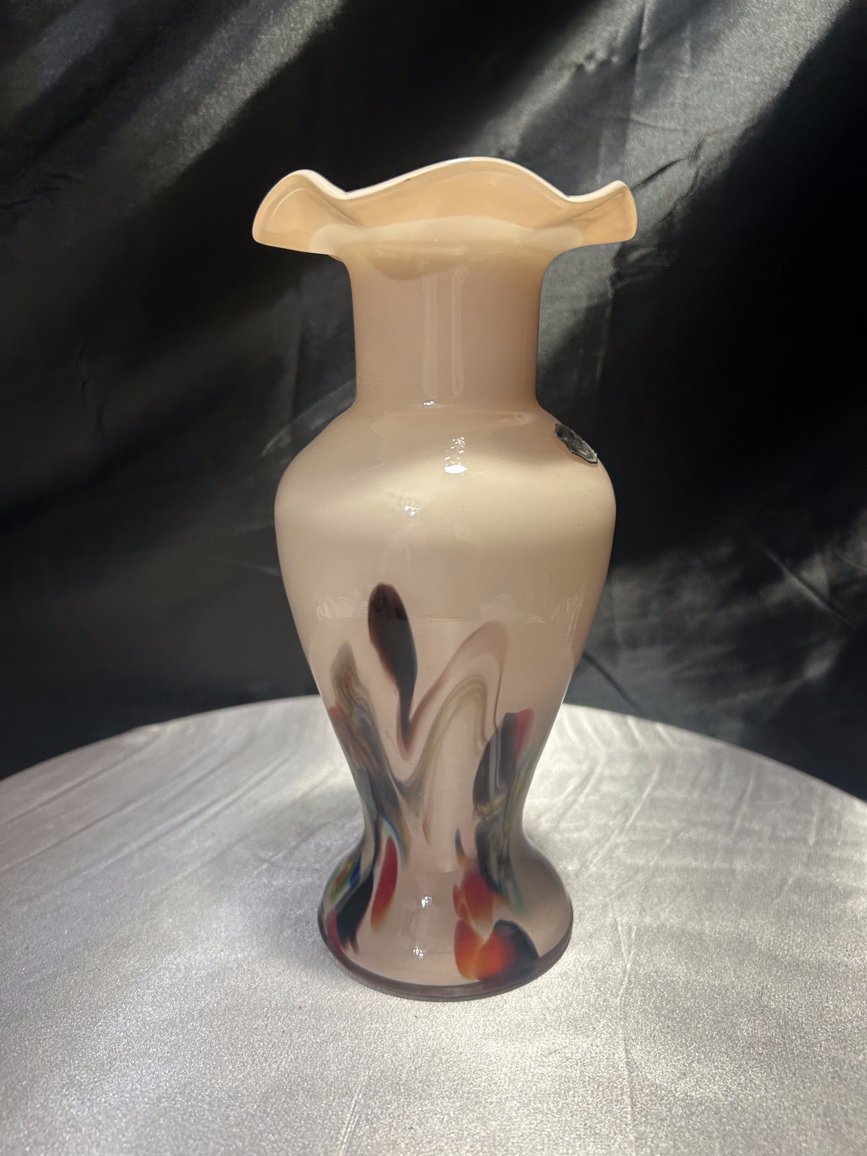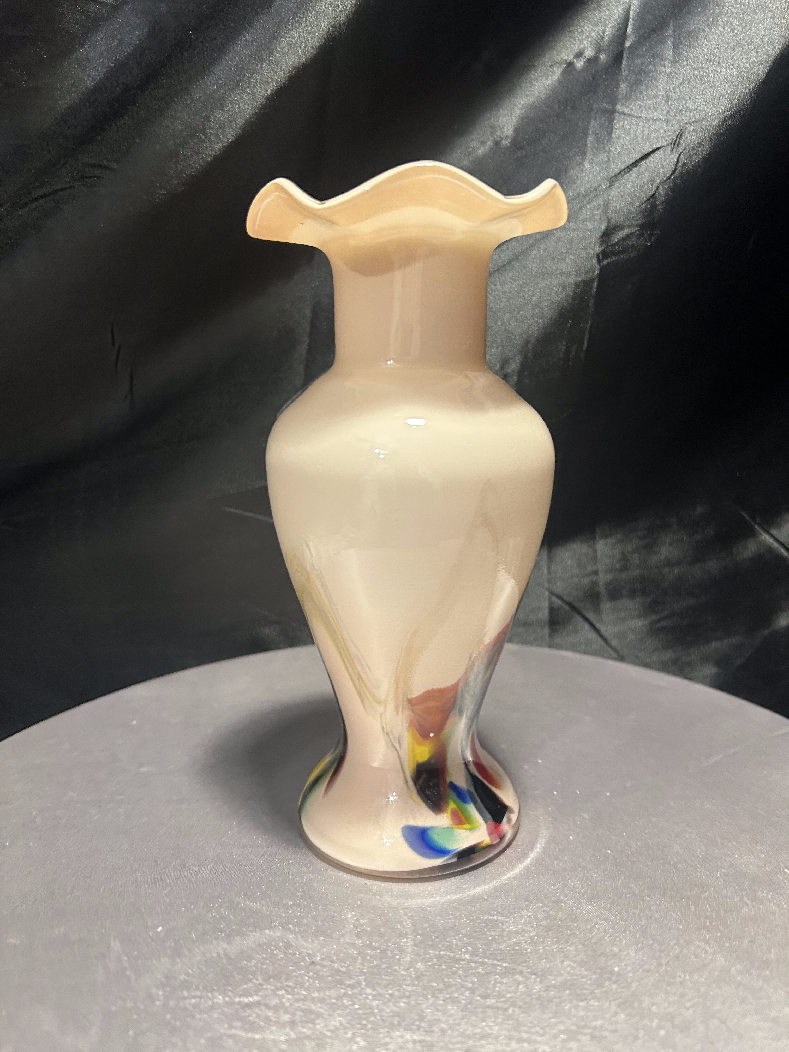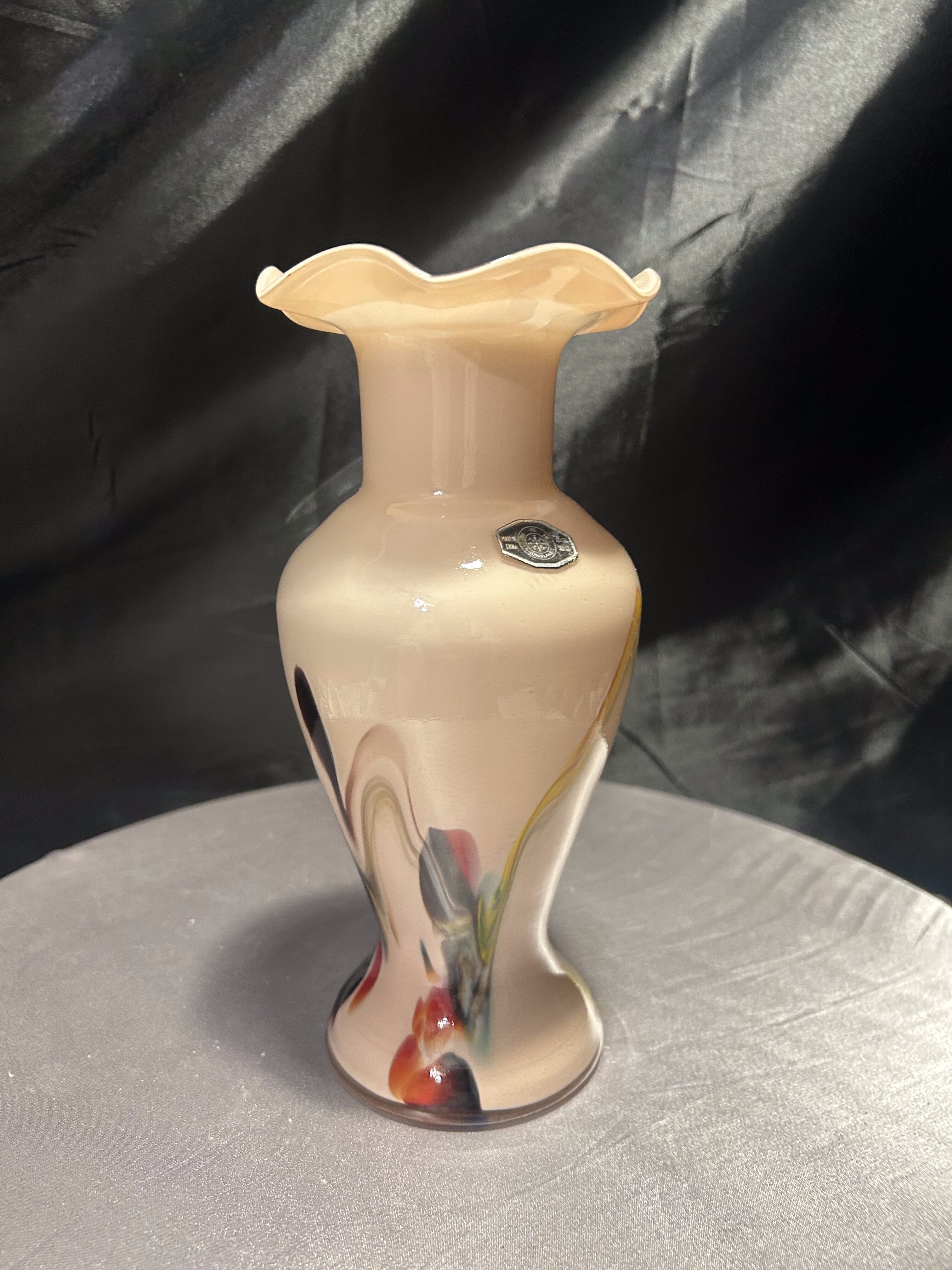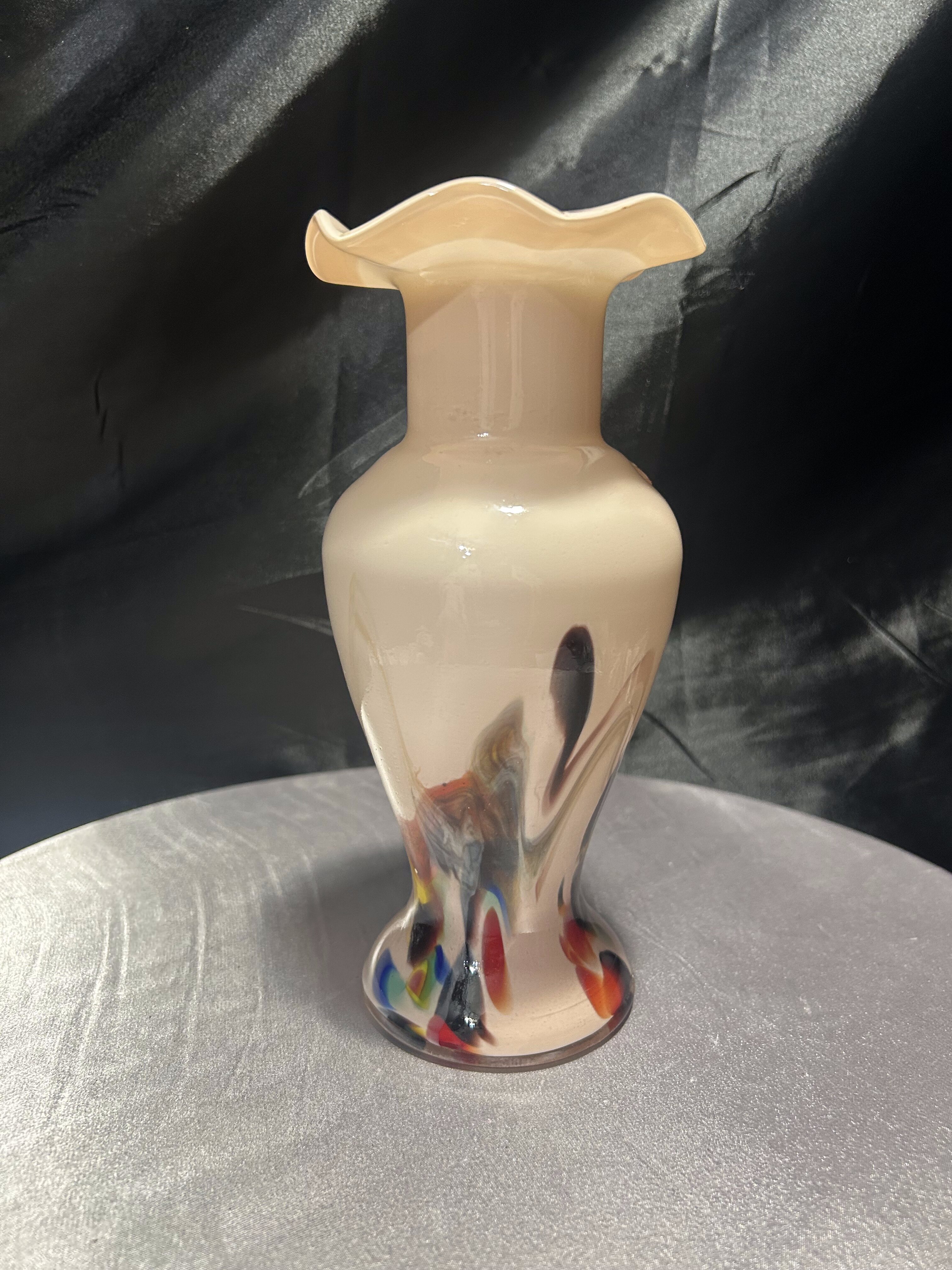 Dekoracyjny flakon wykonany ze szkła artystycznego w stylu współczesnym, oznaczony oryginalną naklejką Snowflakes – Made in China. Wazon zachwyca subtelnym, pastelowym kolorem i dynamicznymi wstęgami barw zatopionych w szkle – odcienie żółci, czerwieni, błękitu i czerni tworzą abstrakcyjny, malarski efekt. Falowana krawędź u góry nadaje całości elegancji i płynności, czyniąc z flakonu niebanalny element dekoracyjny.