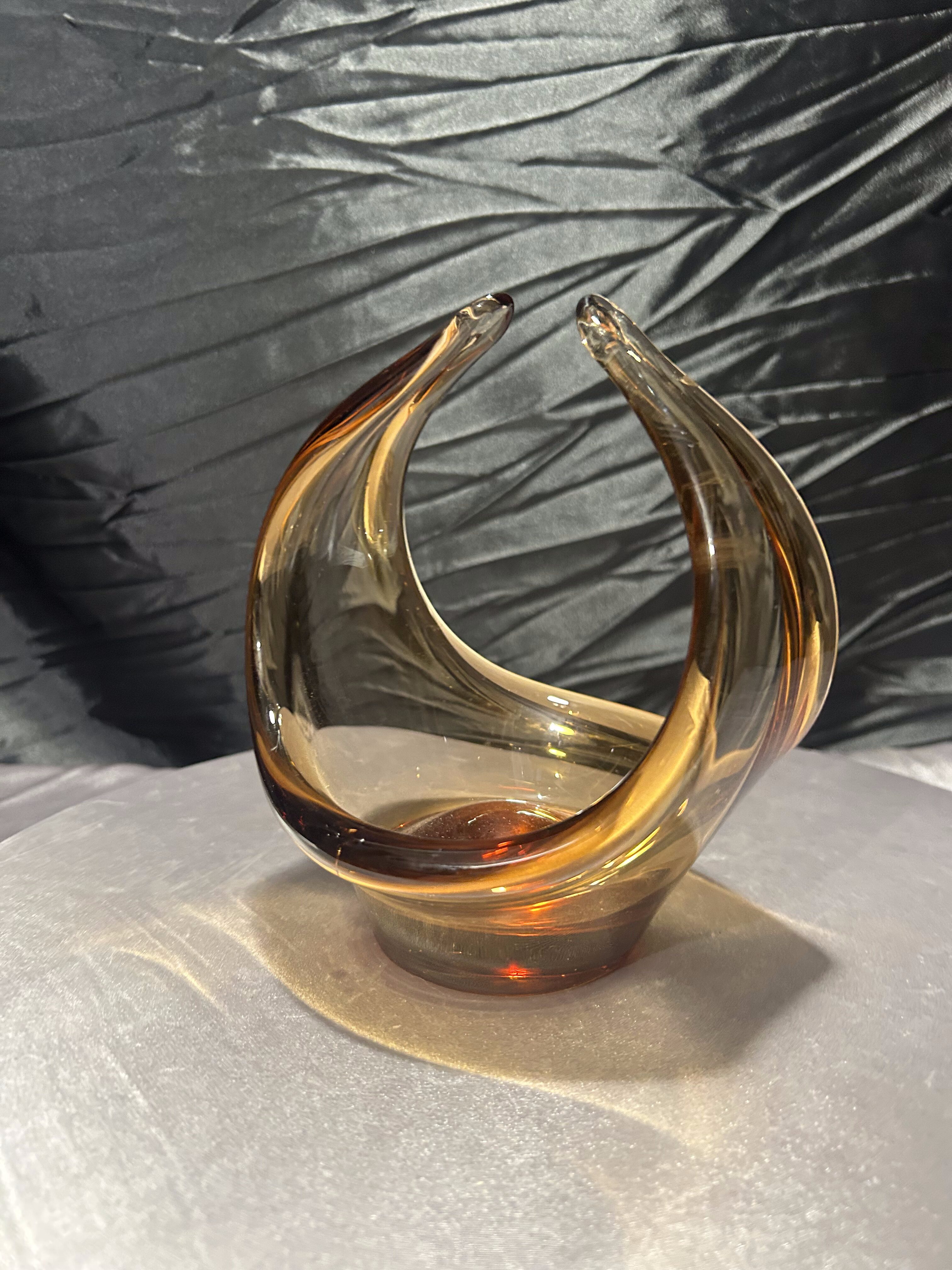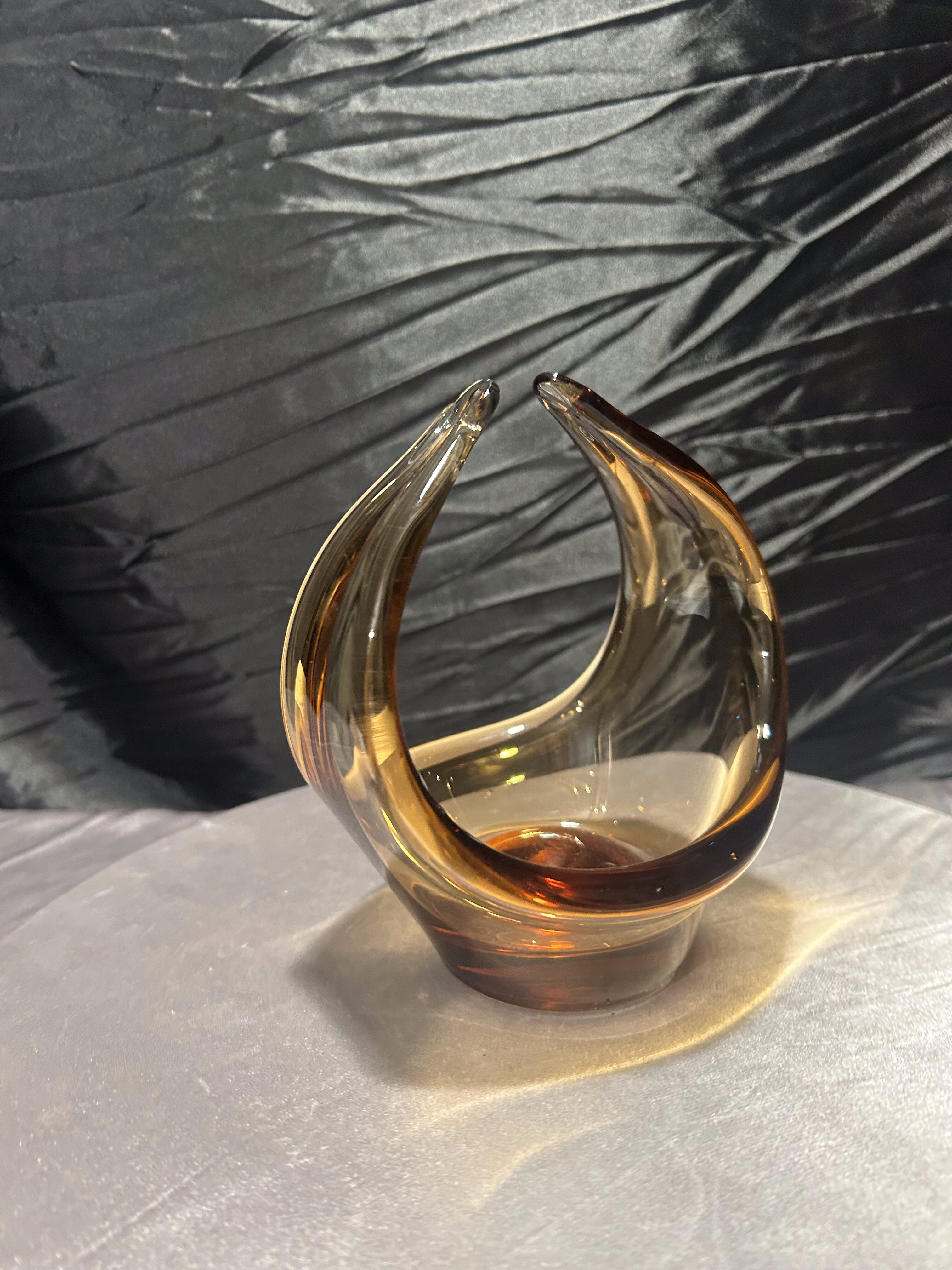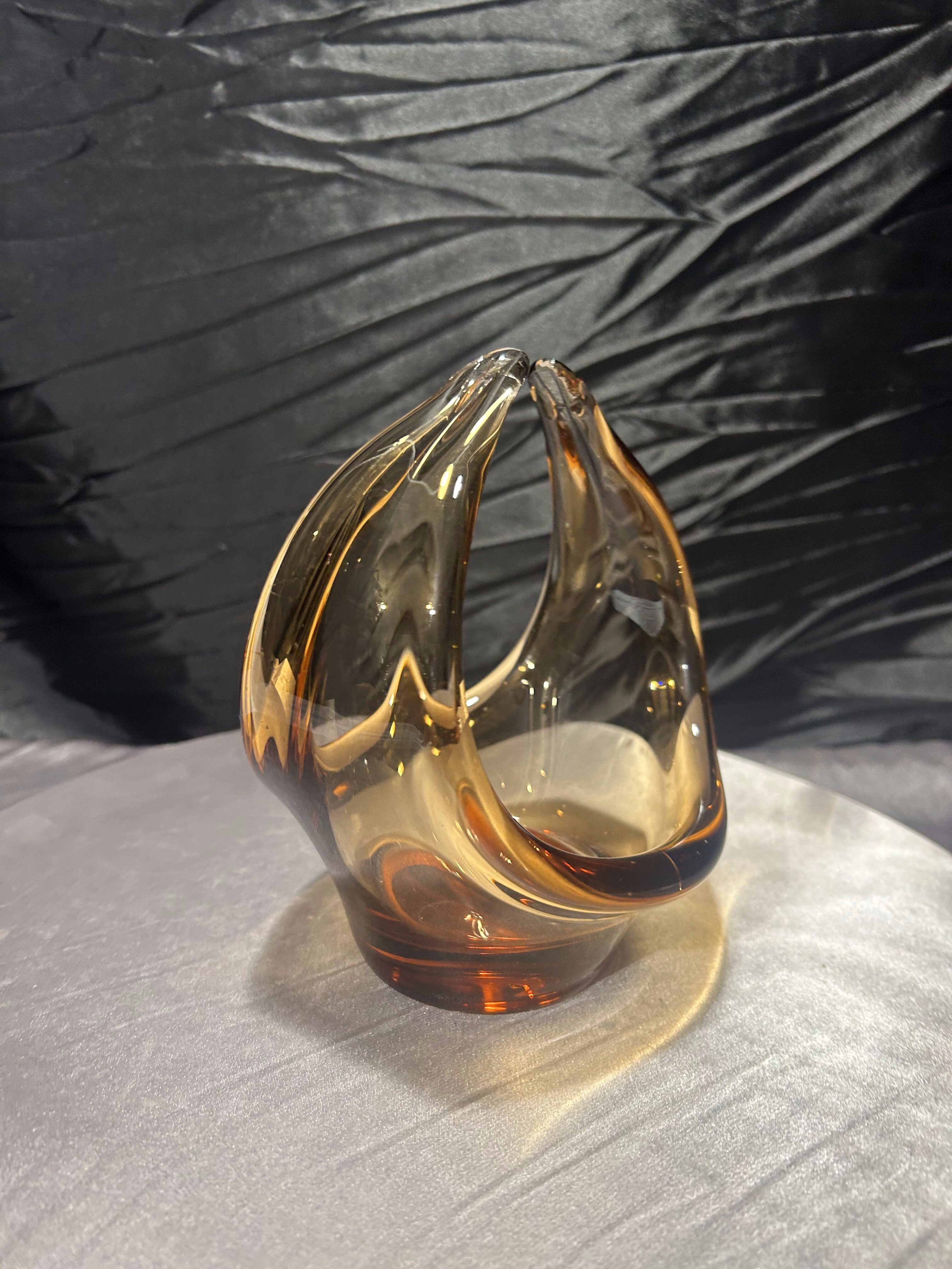 Wyjątkowy koszyczek ze szkła artystycznego o finezyjnej, rzeźbiarskiej formie. Wykonany ręcznie z grubego, transparentnego szkła w ciepłym, brązowym odcieniu z subtelnymi przejściami barw.