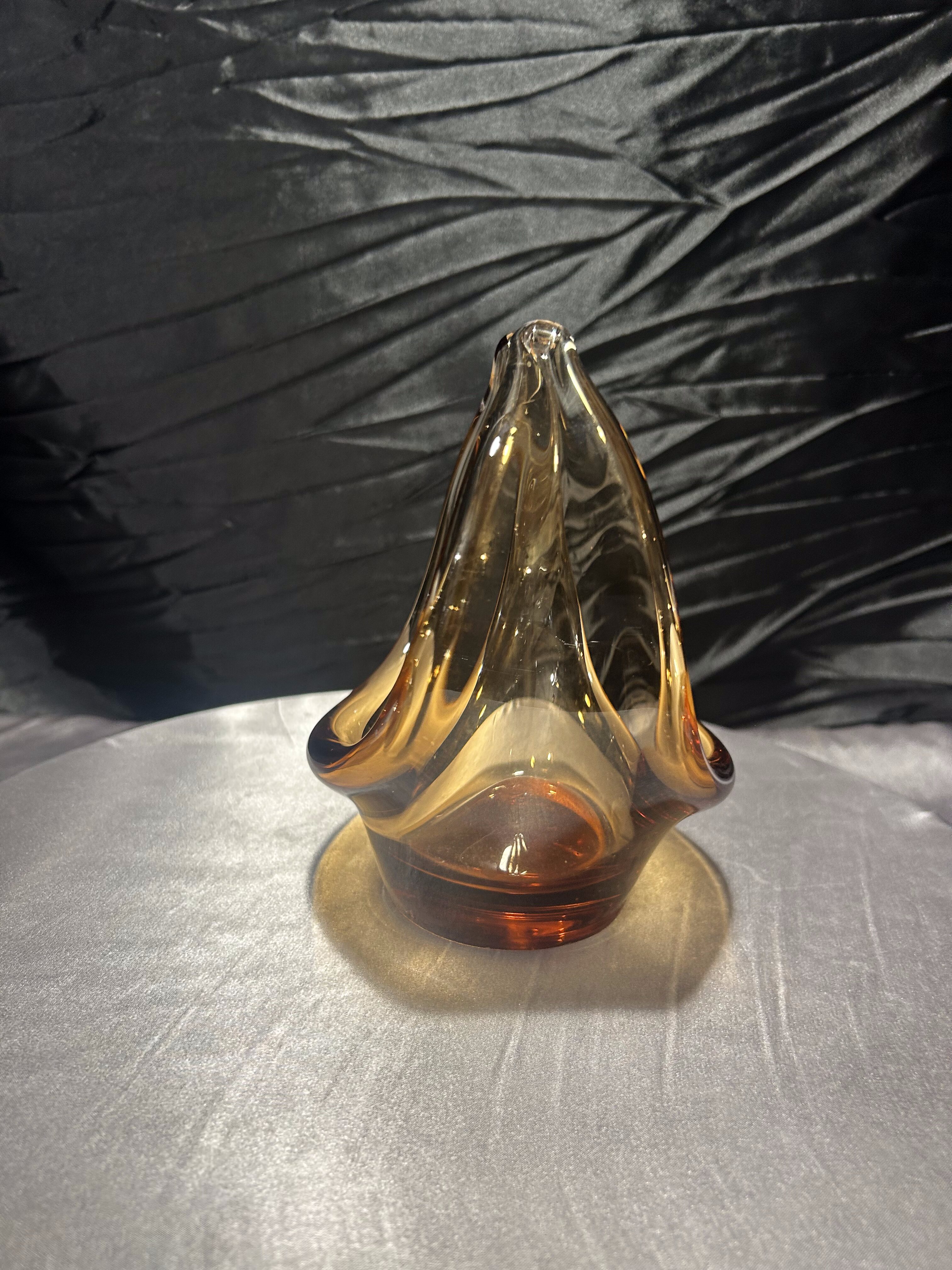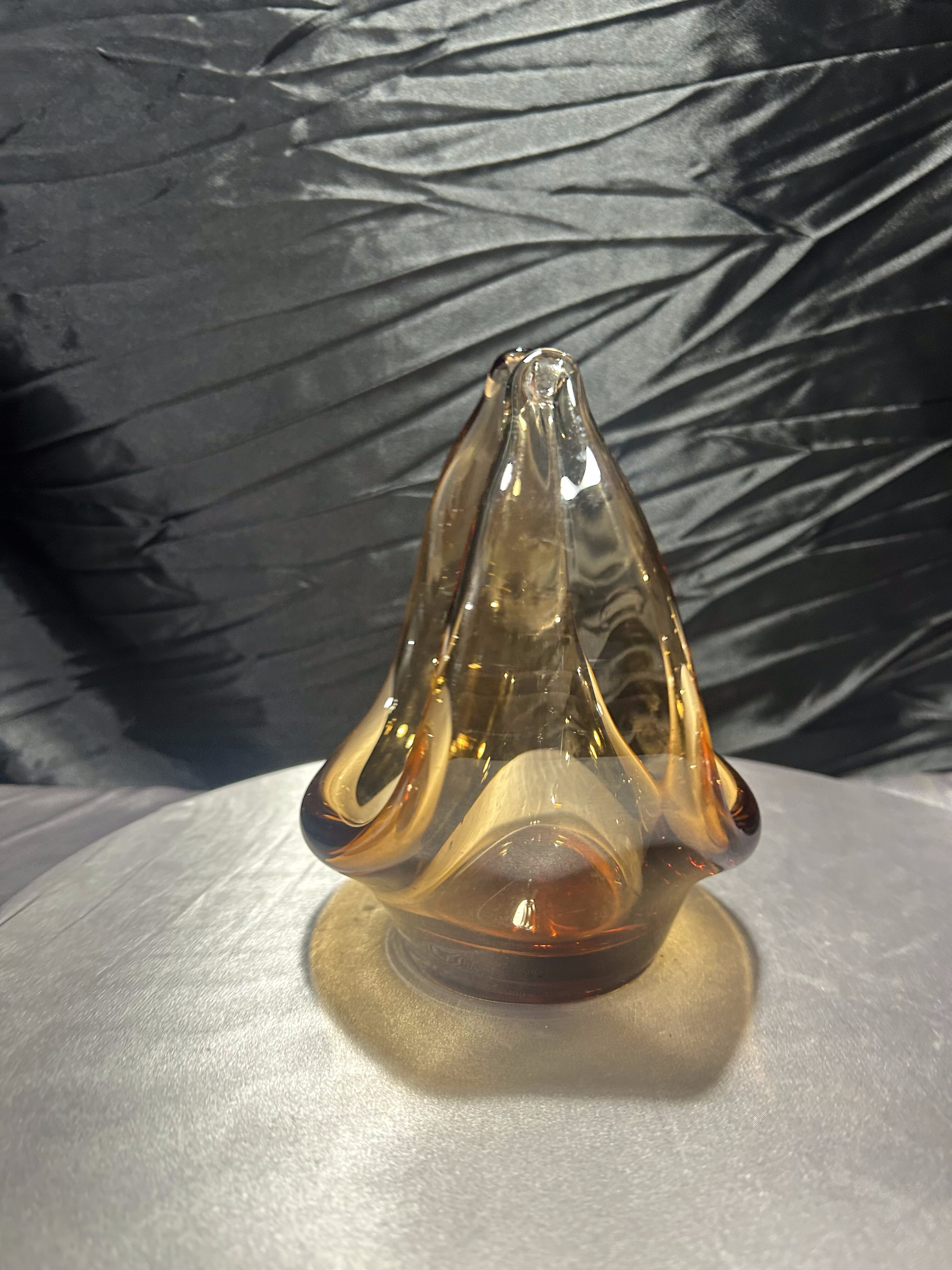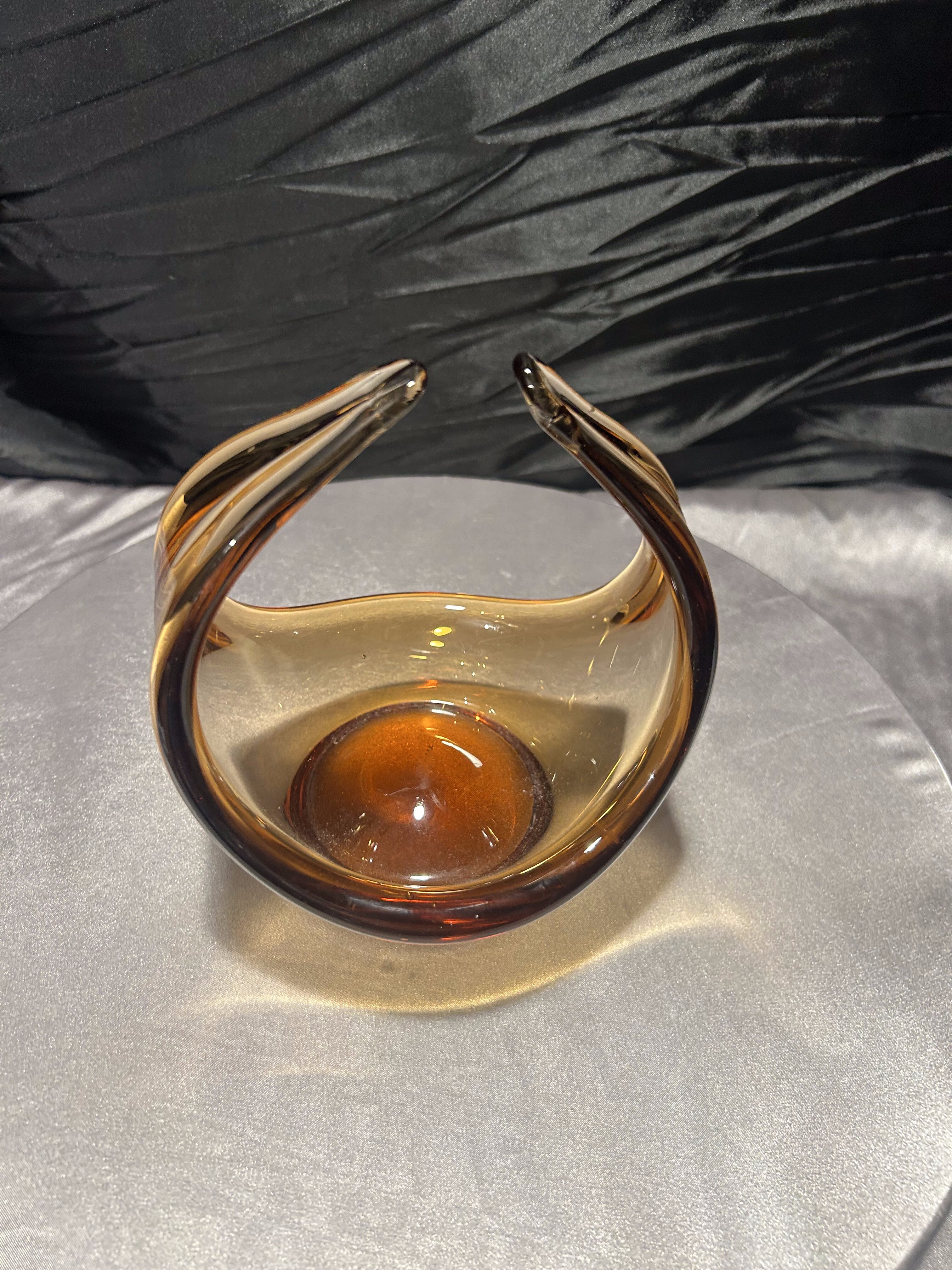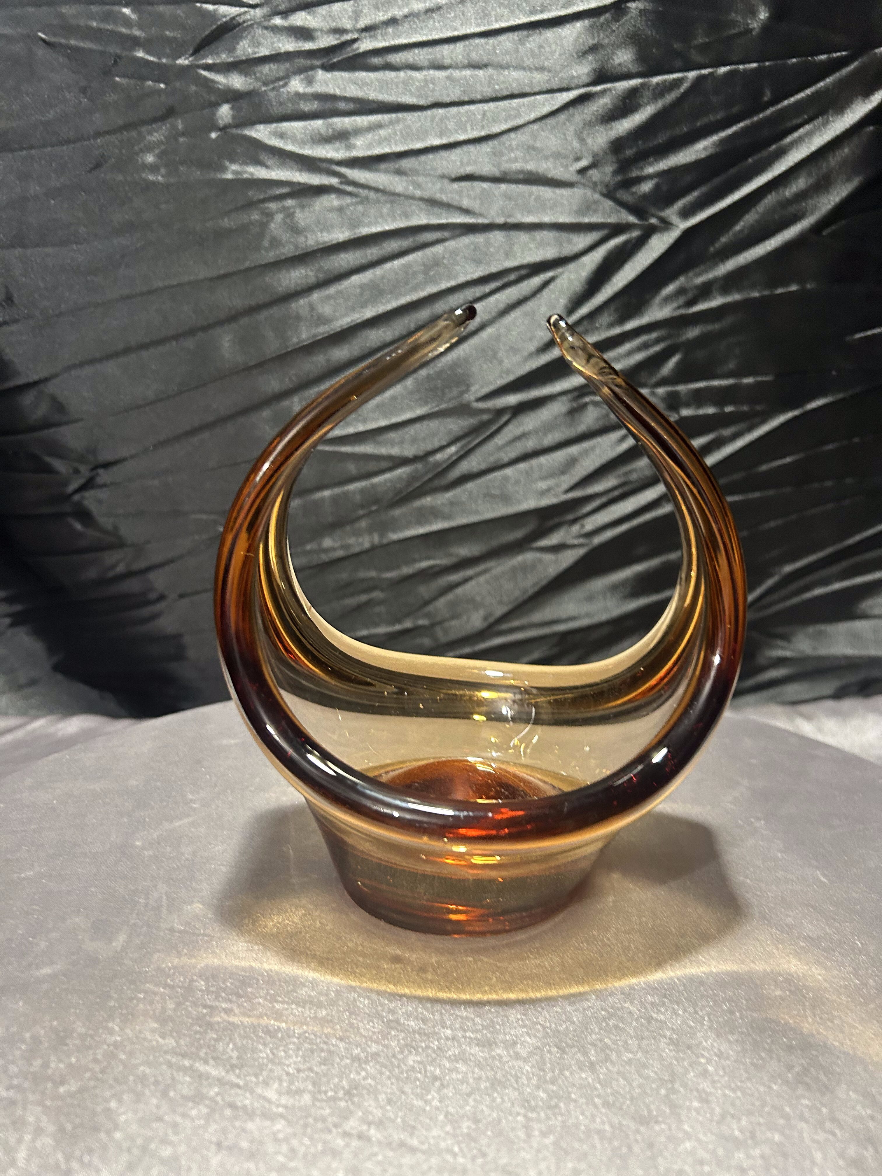 Wyjątkowy koszyczek ze szkła artystycznego o finezyjnej, rzeźbiarskiej formie. Wykonany ręcznie z grubego, transparentnego szkła w ciepłym, brązowym odcieniu z subtelnymi przejściami barw.