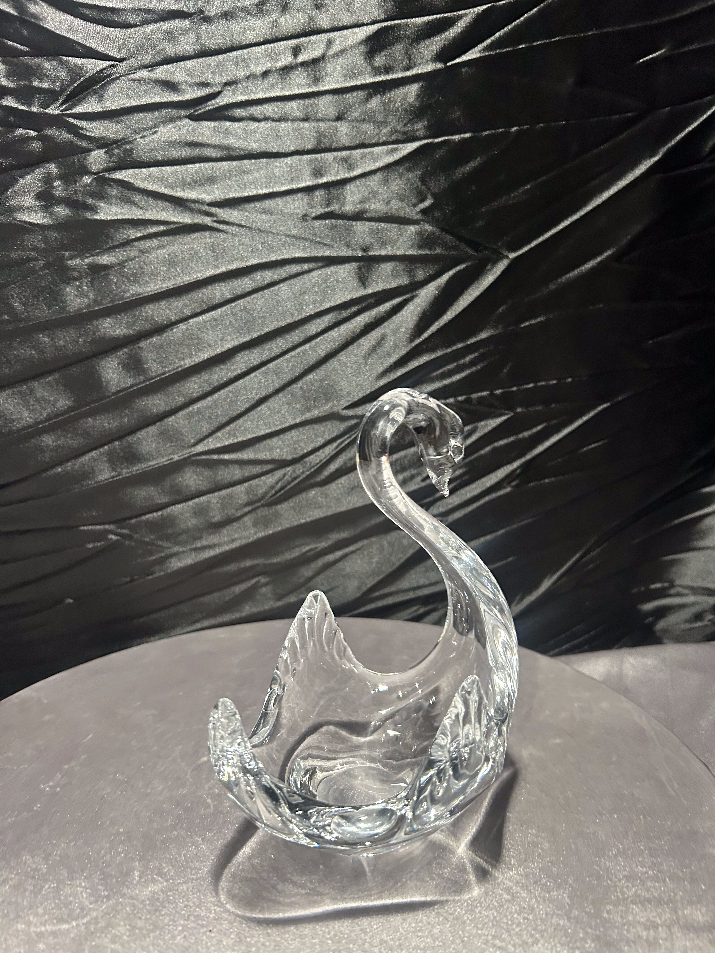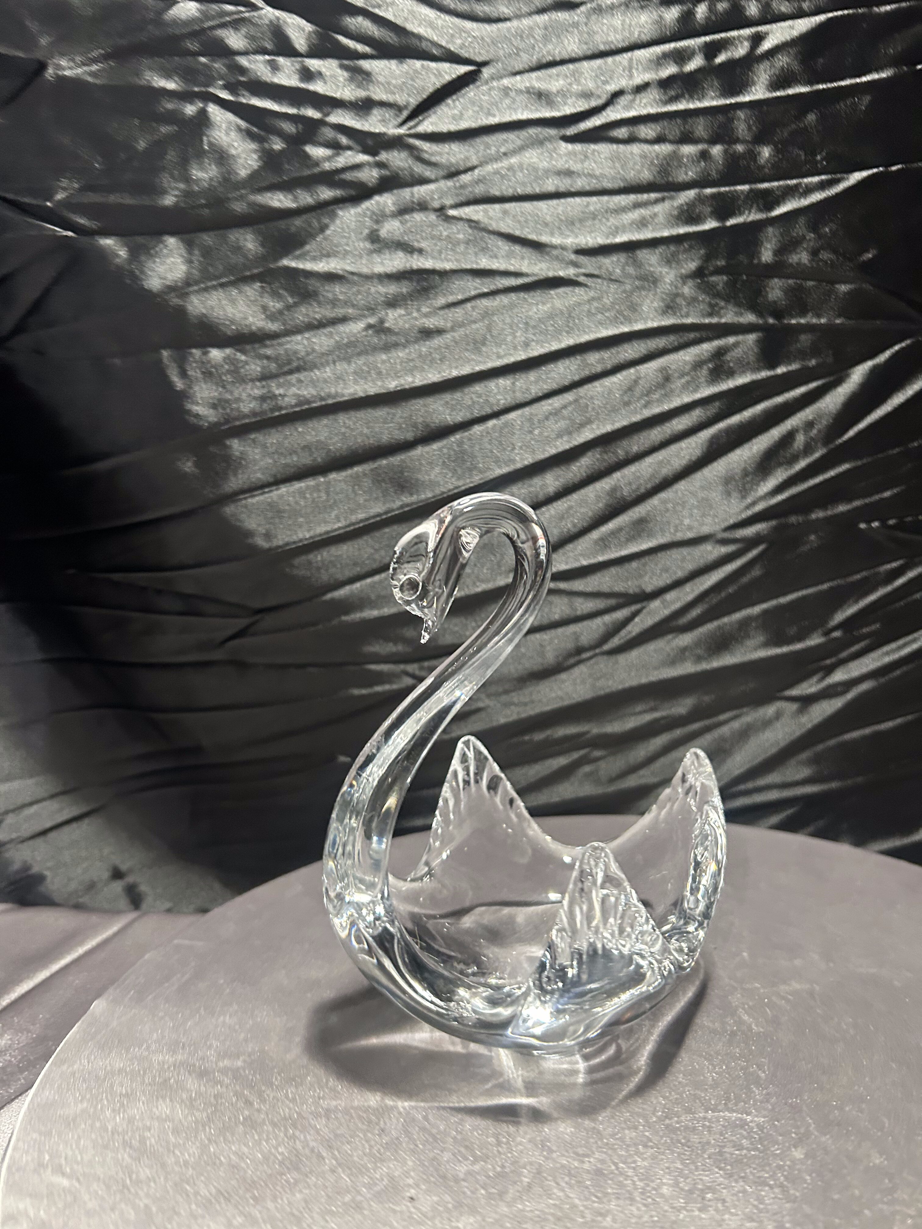 Oferuję wyjątkową misę w formie łabędzia, wykonaną ze szkła artystycznego. Przedmiot pełni jednocześnie funkcję dekoracyjnej figury oraz praktycznej paterki – idealnej na drobne słodycze, owoce czy oryginalny element ozdobny we wnętrzu.