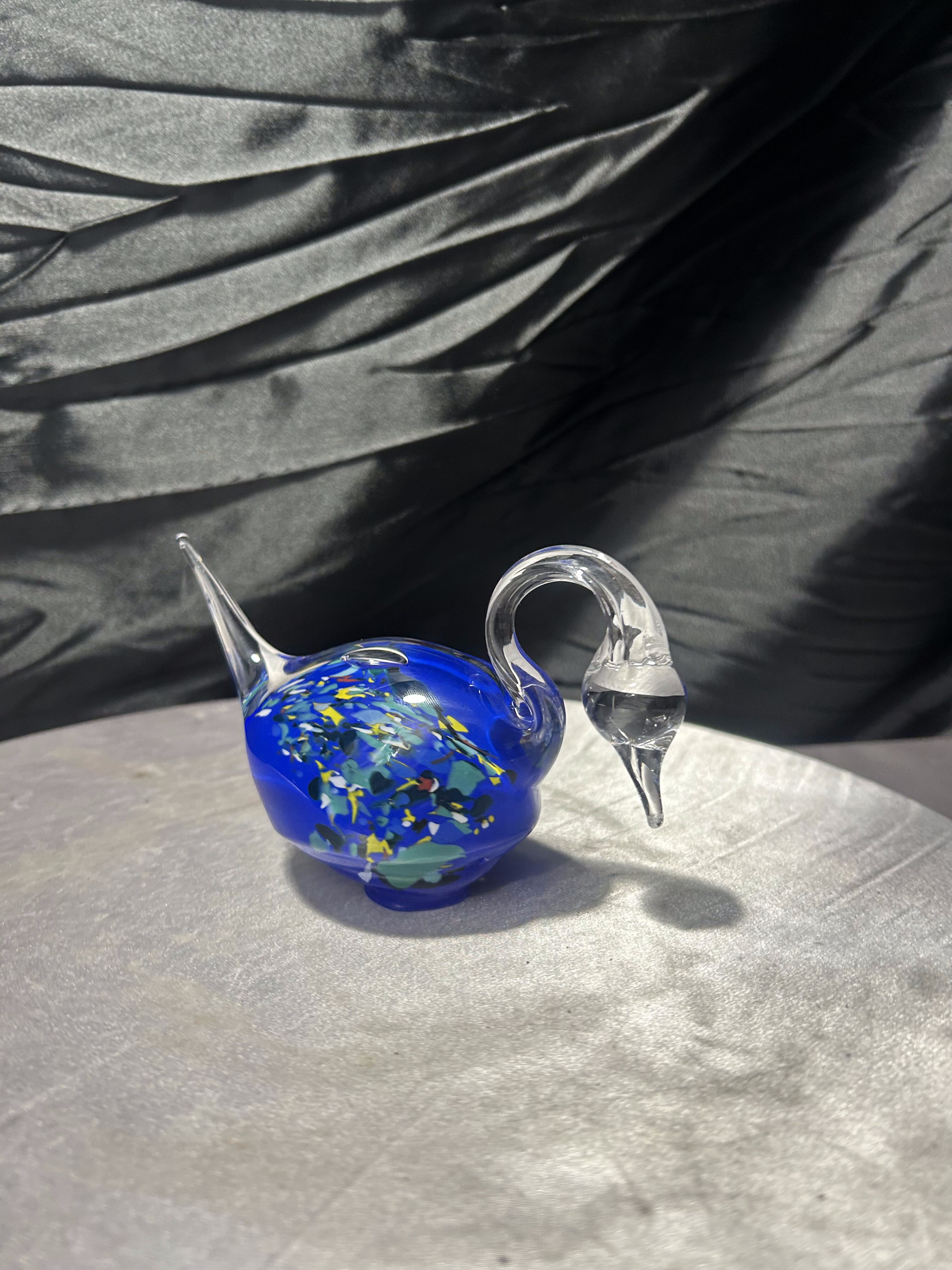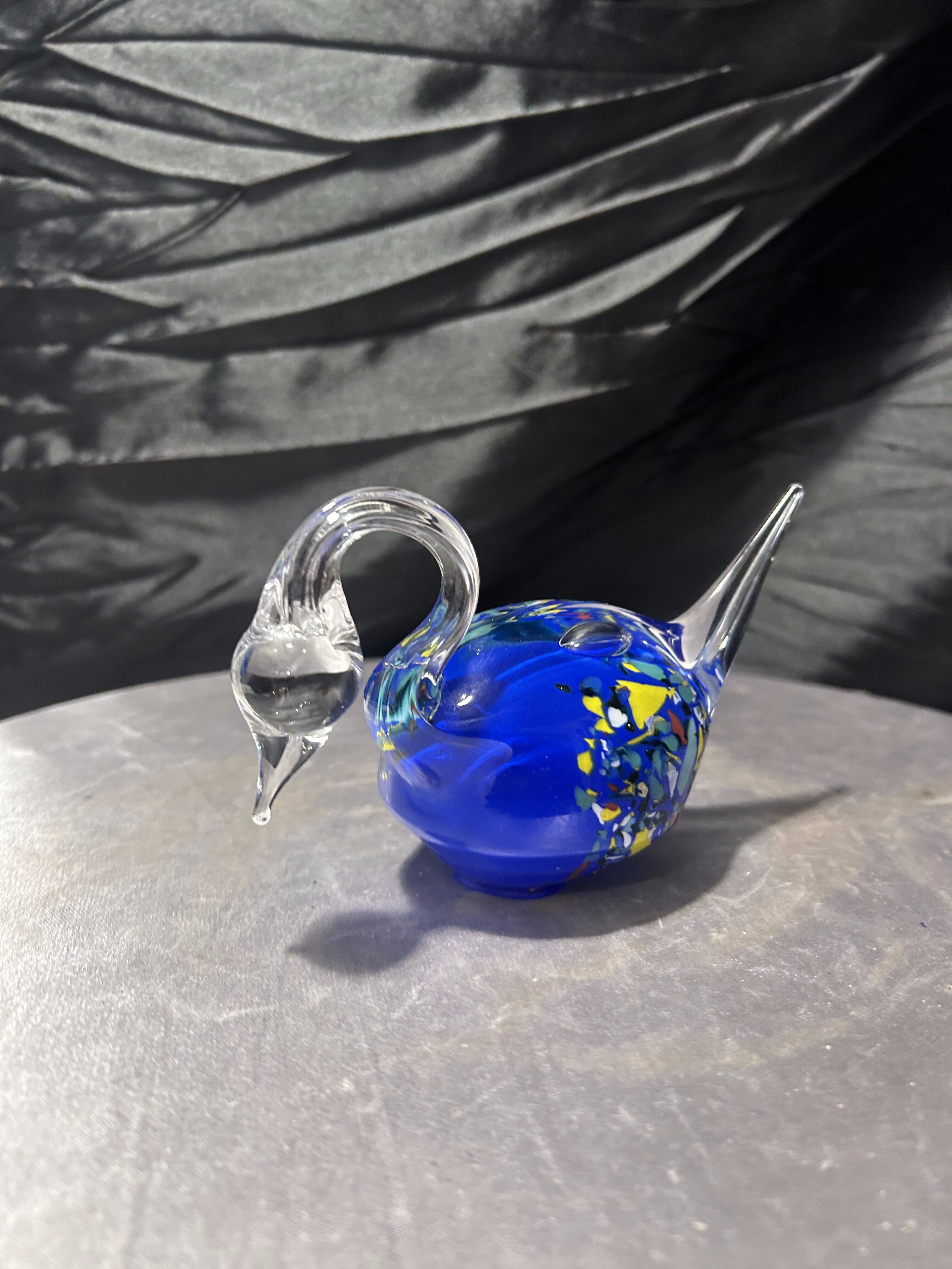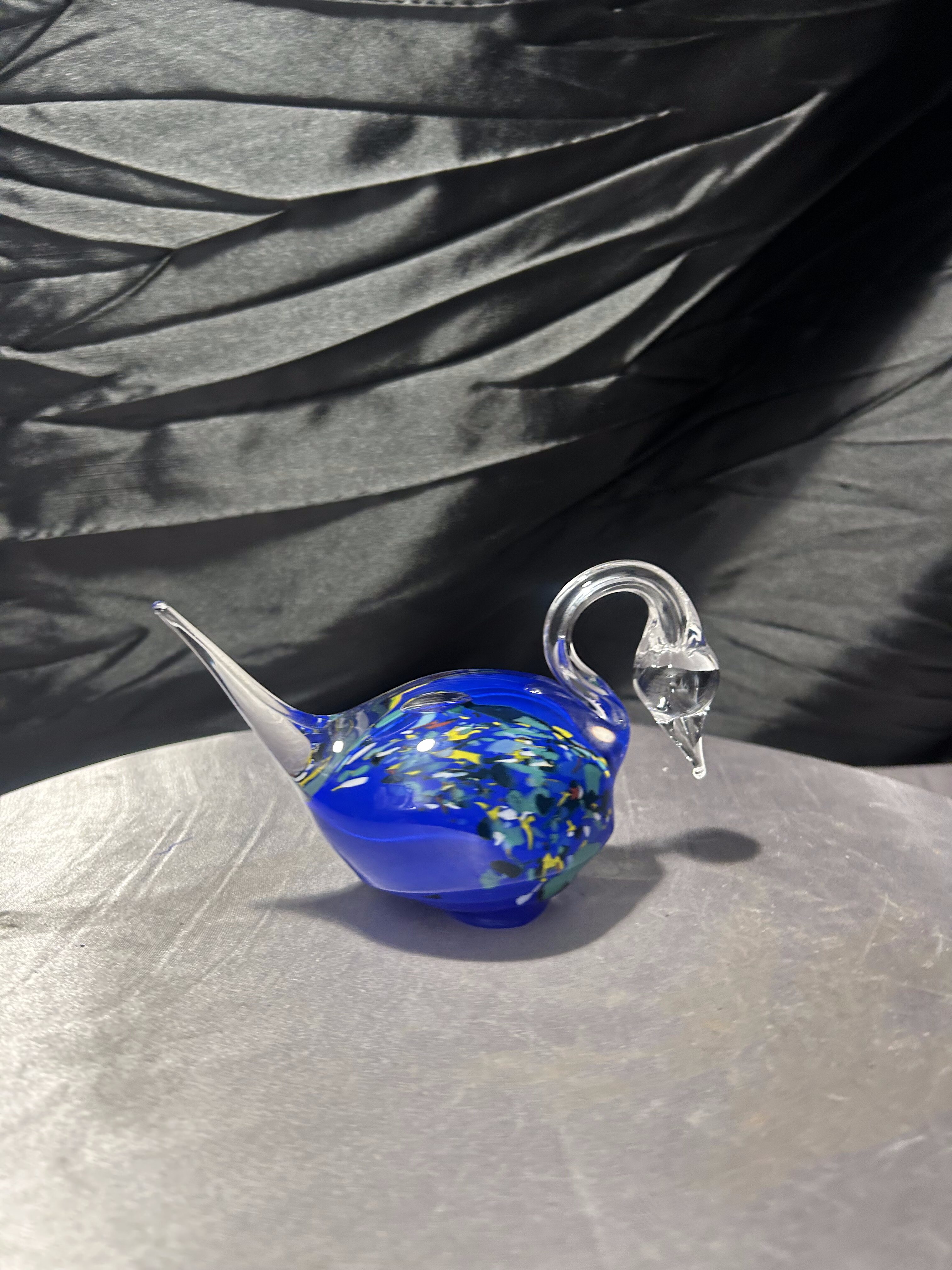 Elegancka figurka łabędzia wykonana ze szkła artystycznego, o wyjątkowej, płynnej linii i efektownej kolorystyce. Intensywnie kobaltowy korpus z wielobarwnymi wtopieniami kontrastuje z przezroczystą, finezyjnie wygiętą szyją i ogonem, tworząc dynamiczną, rzeźbiarską kompozycję.